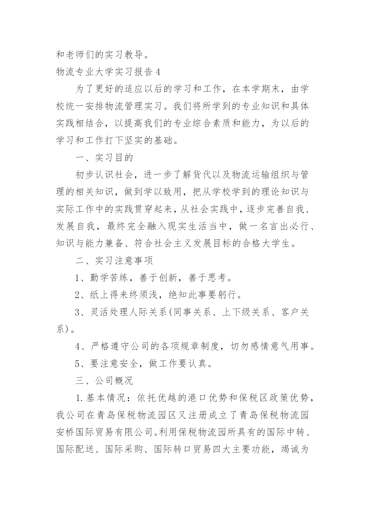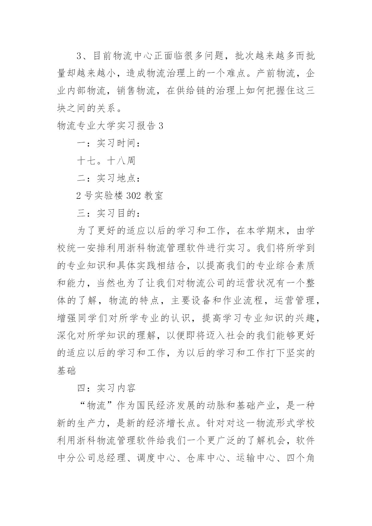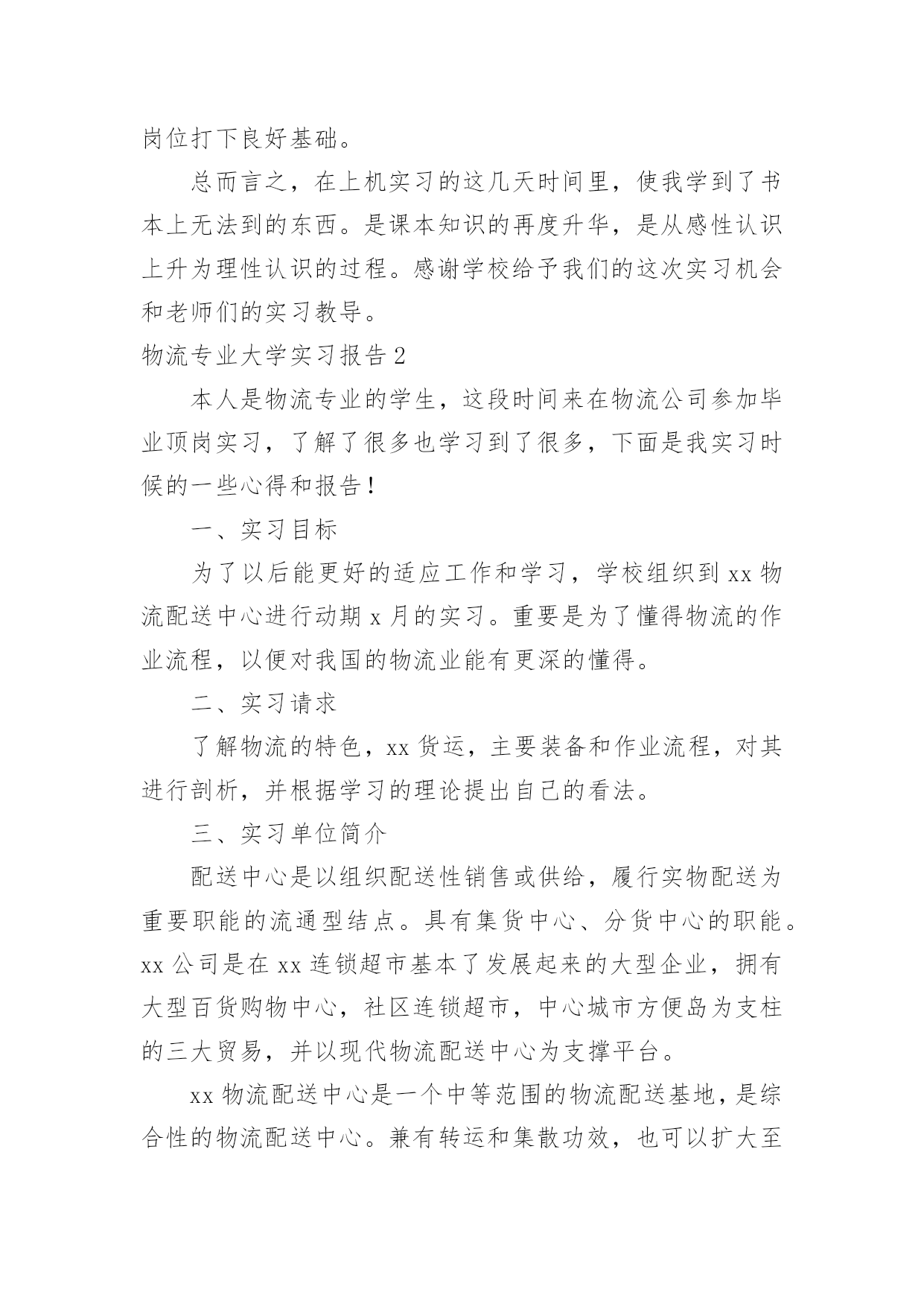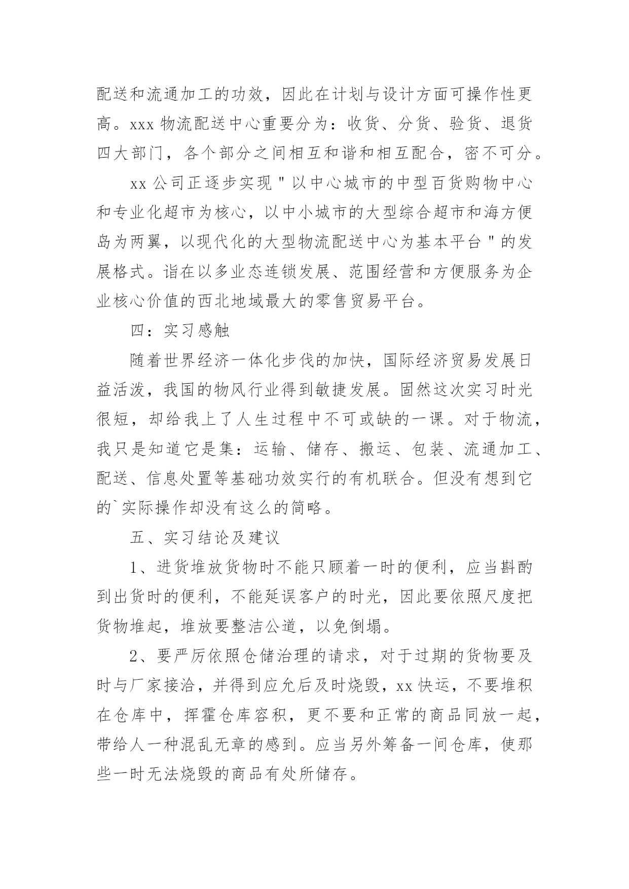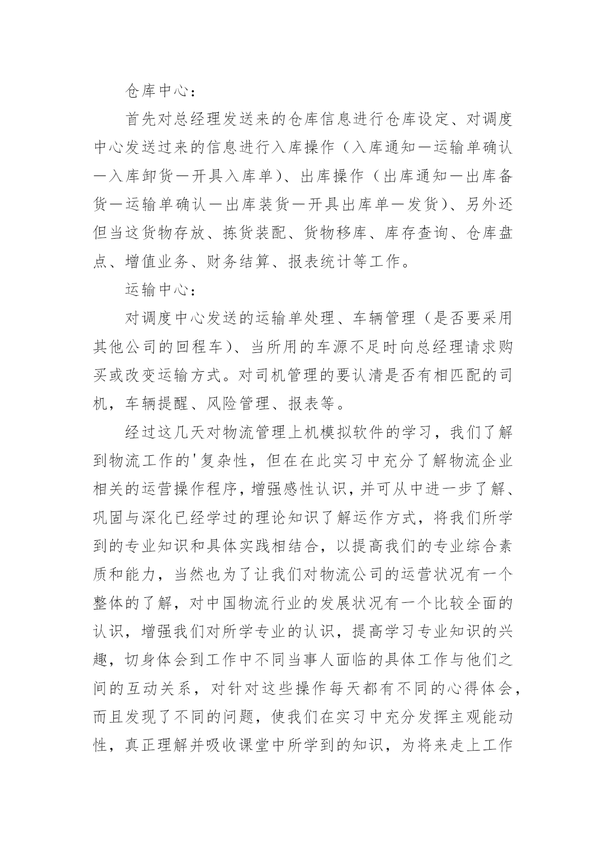 物流专业大学实习报告物流专业大学实习报告在当下这个社会中,报告使用的次数愈发增长,报告包含标题、正文、结尾等。那么什么样的报告才是有效的呢?下面是小编为大家收集的物流专业大学实习报告,欢迎大家借鉴与参考,希望对大家有所帮助。物流专业大学实习报告1为了更好的适应以后的学习和工作,在本学期末,由学校统一安排利用浙科物流管理软件进行实习。我们将所学到的专业知识和具体实践相结合,以提高我们的专业综合素质和能力,当然也为了让我们对物流公司的运营状况有一个整体的了解,物流的特点,主要设备和作业流程,运营管理,增强同学们对所学专业的认识,提高学习专业知识的兴趣,深化对所学知识的理解,以便即将迈入社会的我们能够更好的适应以后的学习和工作,为以后的学习和工作打下坚实的基础。“物流”作为国民经济发展的动脉和基础产业,是一种新的生产力,是新的经济增长点。针对对这一物流形式学校利用浙科物流管理软件给我们一个更广泛的了解机会,软件中分公司总经理、调度中心、仓库中心、运输中心、四个角色来模拟现实的物流公司在一个模拟的市场环境中的实际操作。学生成立物流单位,各单位在同一市场下竞争来完成订单。通过路线优化、运输陪送、仓储规划、危险处理,加强实际业务操作能力。由教师控制和调整市场环境的各种因素来增加各物流公司操作难易度来增强学生实验兴趣,使学生增强市场应变能力,同时也使学生能更好的在实验的过程中与实际所学的物流知识相结合。1、系统基础知识了解:通过对机房里计算机中物流实训上机手册的阅读,基本了解上机模拟实训的步骤,流程,各个只能部门的业务范围与操作。2、业务流程:公司总经理:合同管理、总经理通过系统中合同的招标进行报价,若中标可对合同签订。订单的受理;针对系统发放的订单(托运单,发运单)进行接受或拒绝处理,并把信息发给调度中心,由调度中心对订单进行处理。物流设备管理;首先要租借,自建,购买仓库将信息发于仓库中心进行仓库分配,购买或租借卡车,招聘司机,叉车,搬运工等。还要开通各种运输路线。进行财务管理。调度中心:对总经理发送过来的货运单,托运单进行处理,对货运单进行补货将货源信息发布于仓库中心进行补货,对托运单进行暂存入库或直接生成运输单将信息发送至运输中心,另外调度中心还担有信息查询、风险管理、报表、财务结算等职能。仓库中心:首先对总经理发送来的仓库信息进行仓库设定、对调度中心发送过来的信息进行入库操作(入库通知-运输单确认-入库卸货-开具入库单)、出库操作(出库通知-出库备货-运输单确认-出库装货-开具出库单-发货)、另外还但当这货物存放、拣货装配、货物移库、库存查询、仓库盘点、增值业务、财务结算、报表统计等工作。运输中心:对调度中心发送的运输单处理、车辆管理(是否要采用其他公司的回程车)、当所用的车源不足时向总经理请求购买或改变运输方式。对司机管理的要认清是否有相匹配的司机,车辆提醒、风险管理、报表等。经过这几天对物流管理上机模拟软件的学习,我们了解到物流工作的'复杂性,但在在此实习中充分了解物流企业相关的运营操作程序,增强感性认识,并可从中进一步了解、巩固与深化已经学过的理论知识了解运作方式,将我们所学到的专业知识和具体实践相结合,以提高我们的专业综合素质和能力,当然也为了让我们对物流公司的运营状况有一个整体的了解,对中国物流行业的发展状况有一个比较全面的认识,增强我们对所学专业的认识,提高学习专业知识的兴趣,切身体会到工作中不同当事人面临的具体工作与他们之间的互动关系,对针对这些操作每天都有不同的心得体会,而且发现了不同的问题,使我们在实习中充分发挥主观能动性,真正理解并吸收课堂中所学到的知识,为将来走上工作岗位打下良好基础。总而言之,在上机实习的这几天时间里,使我学到了书本上无法到的东西。是课本知识的再度升华,是从感性认识上升为理性认识的过程。感谢学校给予我们的这次实习机会和老师们的实习教导。物流专业大学实习报告2本人是物流专业的学生,这段时间来在物流公司参加毕业顶岗实习,了解了很多也学习到了很多,下面是我实习时候的一些心得和报告!一、实习目标为了以后能更好的适应工作和学习,学校组织到xx物流配送中心进行动期x月的实习。重要是为了懂得物流的作业流程,以便对我国的物流业能有更深的懂得。二、实习请求了解物流的特色,xx货运,主要装备和作业流程,对其进行剖析,并根据学习的理论提出自己的看法。三、实习单位简介配送中心是以组织配送性销售或供给,履行实物配送为重要职能的流通型结点。具有集货中心、分货中心的职能。xx公司是在xx连锁超市基本了发展起来的大型企业,拥有大型百货购物中心,社区连锁超市,中心城市方便岛为支柱的三大贸易,并以现代物流配送中心为支撑平台。xx物流配送中心是一个中等范围的物流配送基地,是综合性的物流配送中心。兼有转运和集散功效,也可以扩大至