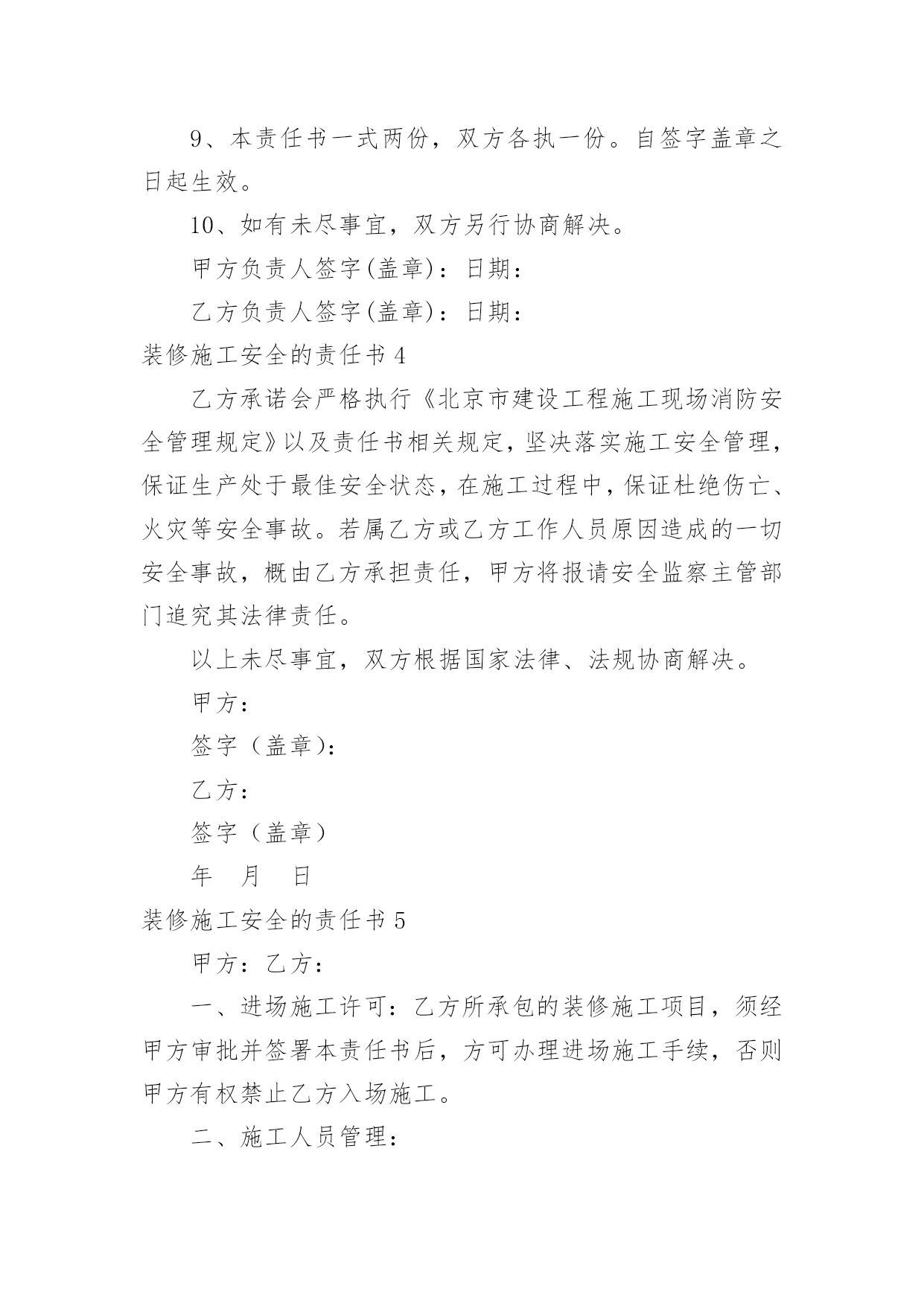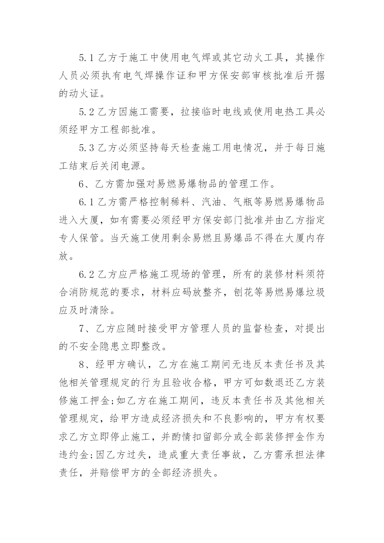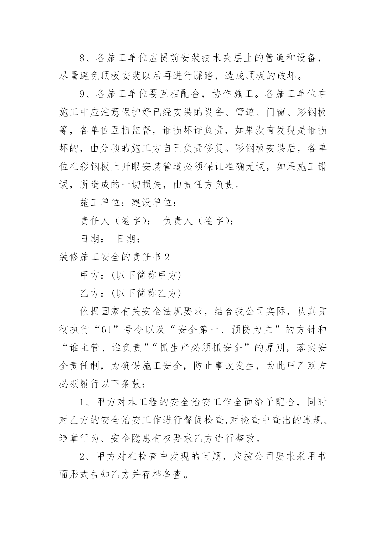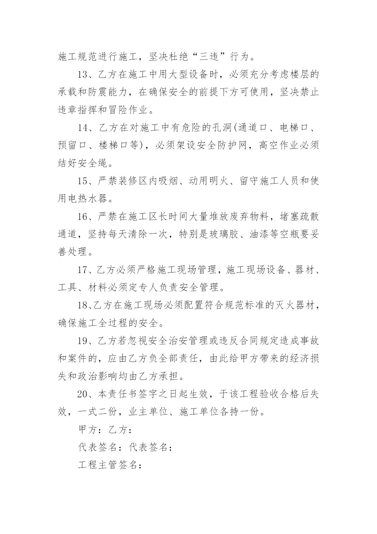 装修施工安全的责任书装修施工安全的责任书在不断进步的社会中,越来越多地方需要用到责任书,责任书是写明责任范围、职责的文书。到底应如何拟定责任书呢?以下是小编帮大家整理的装修施工安全的责任书,希望能够帮助到大家。装修施工安全的责任书1为了搞好新厂房净化装修工程,保证工程的安全顺利、质量优良,特对安全、质量要求进行责任保证:一、文明施工部分:1、施工单位必须遵守国家的法律、法规和本公司的规章制度,服从管理,听从指挥。2、各施工单位在施工前必须进行开始施工申请。要健全项目部组织机构;制定项目规章制度;配备相关的施工技术人员;完善施工组织设计及安全技术措施;做好进场机具、材料准备工作。各方面施工条件具备后,向建设方书面提出开工申请,经审查同意后,方可进行施工。3、施工现场应规范管理,合理设置办公区、生活区、工作区。施工现场的物料要堆放整齐,生活区必须远离净化装修区域,做好文明施工工作。4、施工现场必须按照规定配备项目、技术、安全等施工管理人员。管理人员应常驻施工现场,每月不低于20个工作日,负责施工现场的安全、质量、文明施工等各方面工作。5、特种施工人员必须持证上岗。对于电焊工、电工等施工人员必须要有特种作业上岗证,严禁无证上岗、违章作业。6、施工单位在施工现场用电、动火施工,必须遵守威高《临时用电管理制度》和《动火作业管理制度》。(附《临时用电管理制度》和《动火作业管理制度》)7、应对所有施工人员进行安全教育,提高安全意识,使施工人员懂得安全施工的重要性,从思想上重视安全工作。施工现场应该预防火灾事故、触电事故、高空坠落事故的发生,各单位要把安全工作做到实处,灭火器、保险带以及个人安全防护的安全措施必须到位,防止安全事故的发生。施工单位应为施工人员购买意外伤害保险,保障职工合法权益。如发生意外伤害损失由施工方负责,建设方不负任何责任。8、搞好施工协调工作。在施工时,当一施工方与另一施工方发生冲突时,应立即找建设方代表进行协调,搞好协作,保证工程顺利进行。9、搞好施工现场的文明施工。施工方进入施工现场,首先清理好现场的卫生,做好安全防护措施,方可施工。施工中,施工垃圾、生活垃圾,一定要集中处理,严禁乱扔、乱放,严禁随地大小便。特别是彩板安装及彩板顶棚上,严禁吸烟、小便、乱扔垃圾,如有发现将处1000—5000元的罚款。严禁打架、偷盗等现象的发生,如有发生将移交公安部门处理。各单位要互相监督,做到文明施工。二、技术质量部分:1、按照甲方提供的施工图纸和国家施工技术标准进行施工。施工质量标准按照国家制定的有关施工质量验收规范执行。2、工程施工前必须组织图纸会审,经审核无异议后,方可施工。3、必须做好施工现场的施工技术方案、分部分项验收报告、来料验收报告、安全措施方案、材料的合格证等安全技术资料,确保验收资料齐全。4、在施工现场的各施工单位,必须按照设计要求进行施工,施工所用的材料必须符合合同要求,严禁使用伪劣不合格产品,按照规范保质、保量搞好净化车间的装修。5、各施工单位做出施工进度计划(报甲方备案),使净化装修工程按期完成。6、施工过程中,应按照分部、分项验收施工。风管制作、吊装后,经过甲方测漏验收后方可保温,风管保温后,方可安装彩板顶板。彩板安装放线后,应经甲方确认,方可施工。7、施工过程中如果发现图纸所设计的与现场实际情况不符、不科学、不美观,或者相互有障碍,应及时与甲方沟通,经研究、协商后进行合理变更。变更方案应经建设方签字认可后,方可施工。未经签字,建设方不予认可。8、各施工单位应提前安装技术夹层上的管道和设备,尽量避免顶板安装以后再进行踩踏,造成顶板的破坏。9、各施工单位要互相配合,协作施工。各施工单位在施工中应注意保护好已经安装的设备、管道、门窗、彩钢板等,各单位互相监督,谁损坏谁负责,如果没有发现是谁损坏的,由分项的施工方自己负责修复。彩钢板安装后,各单位在彩钢板上开眼安装管道必须保证准确无误,如果施工错误,所造成的一切损失,由责任方负责。施工单位:建设单位:责任人(签字):负责人(签字):日期:日期:装修施工安全的责任书2甲方:(以下简称甲方)乙方:(以下简称乙方)依据国家有关安全法规要求,结合我公司实际,认真贯彻执行“61”号令以及“安全第一、预防为主”的方针和“谁主管、谁负责”“抓生产必须抓安全”的原则,落实安全责任制,为确保施工安全,防止事故发生,为此甲乙双方必须履行以下条款:1、甲方对本工程的安全治安工作全面给予配合,同时对乙方的安全治安工作进行督促检查,对检查中查出的违规、违章行为、安全隐患有权要求乙方进行整改。2、甲方对在检查中发现的问题,应按公司要求采用书面形式告知乙方并存档备查。3、甲方有权按照有关管理办法对乙方的“三违”行为进行处罚。4、对无视装修工程安全管理的行为,甲方应及时报公司安办。5、乙方必