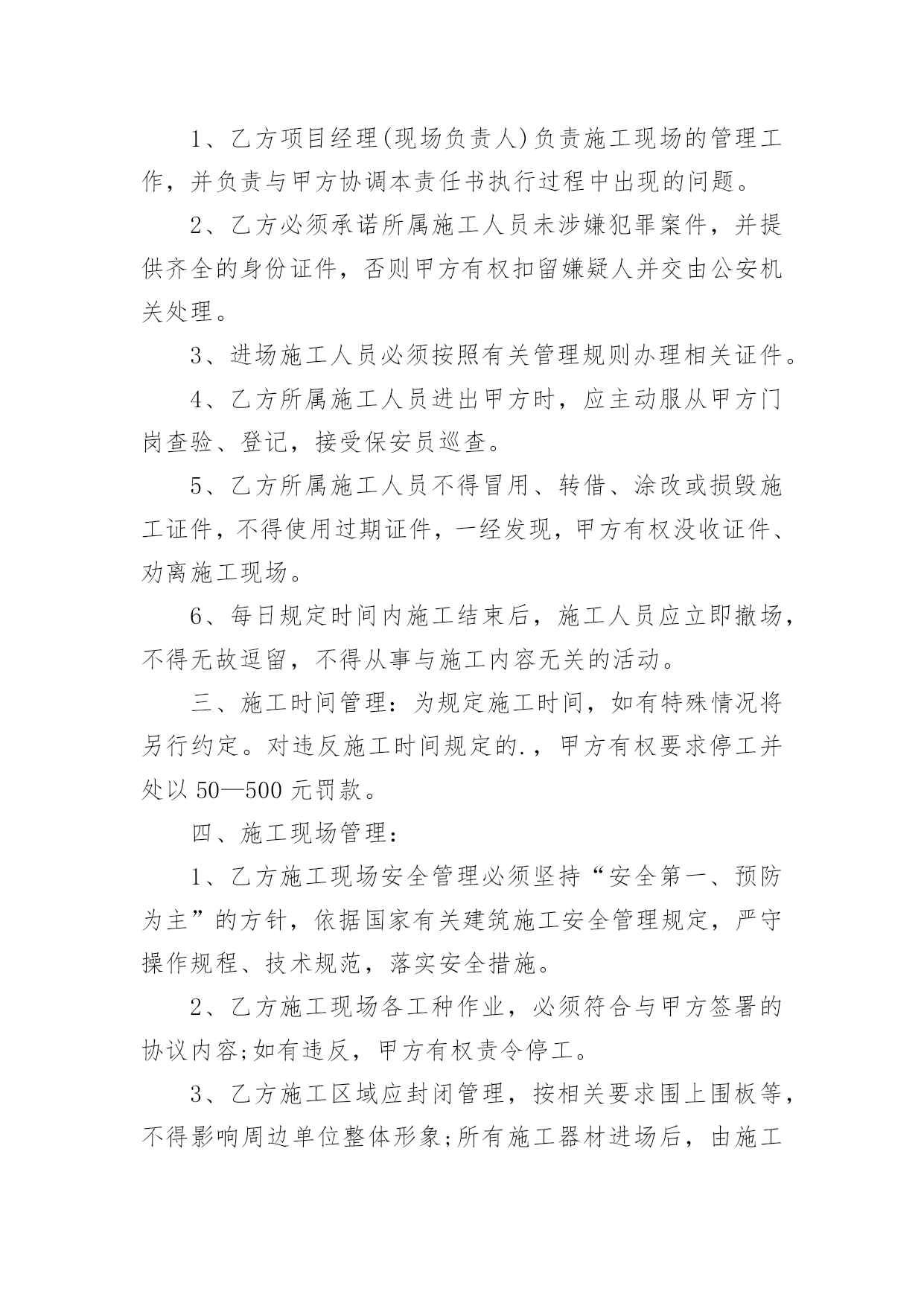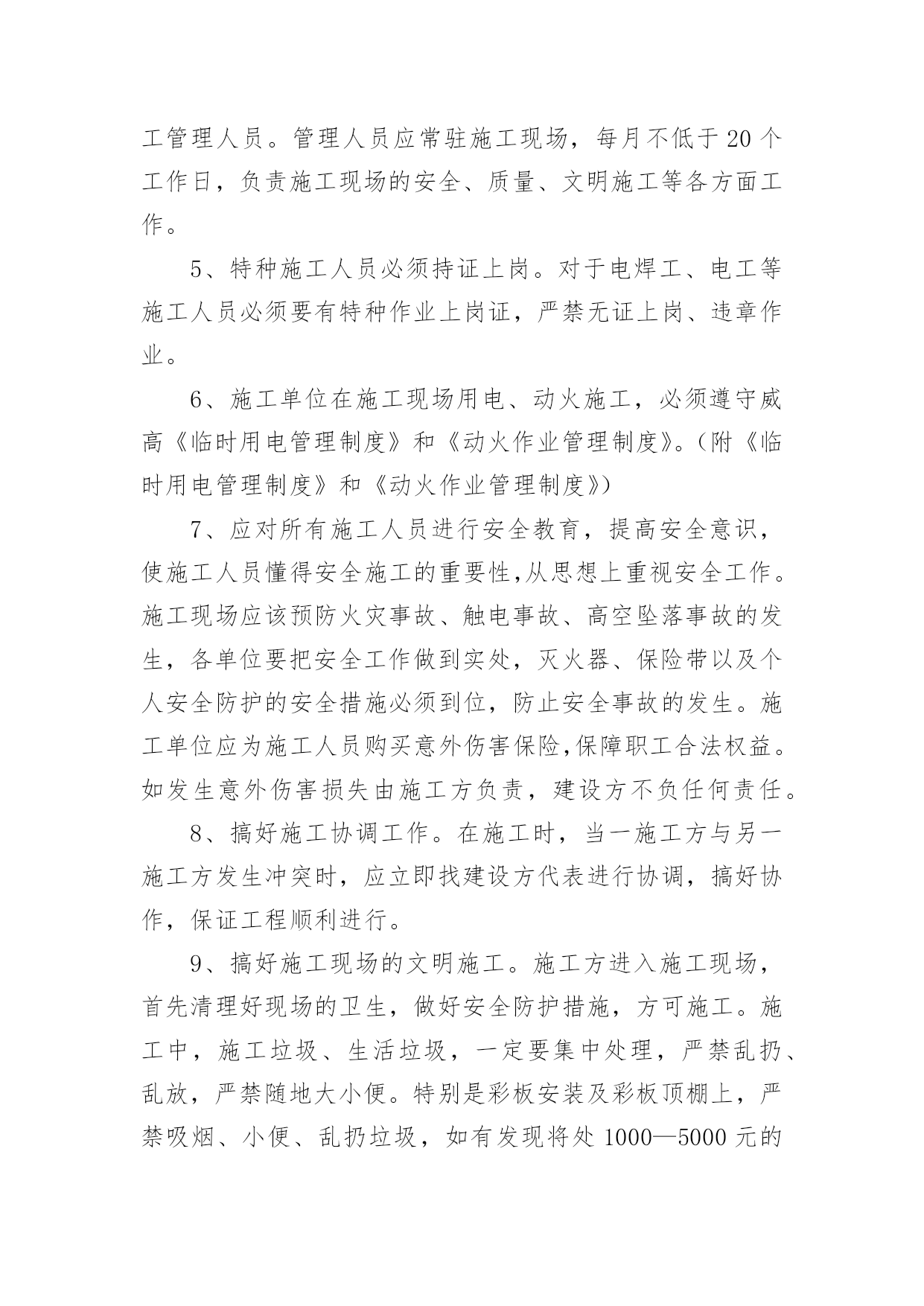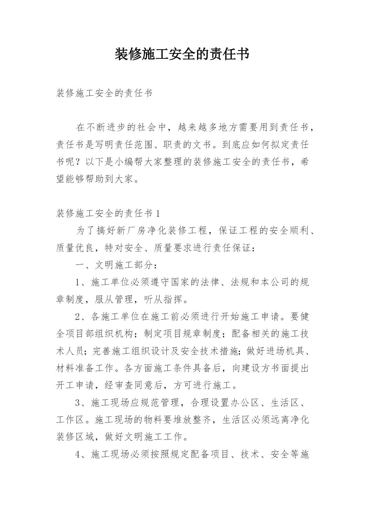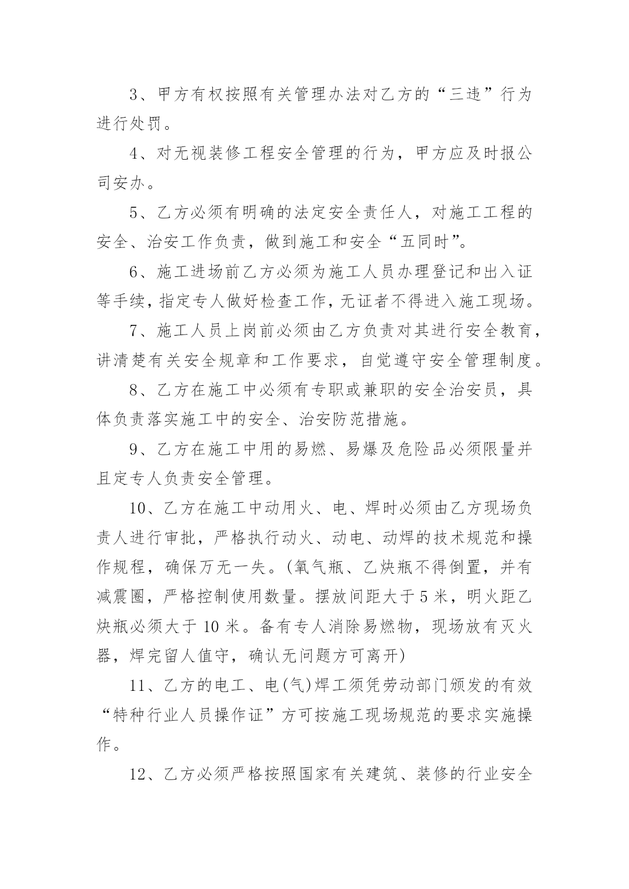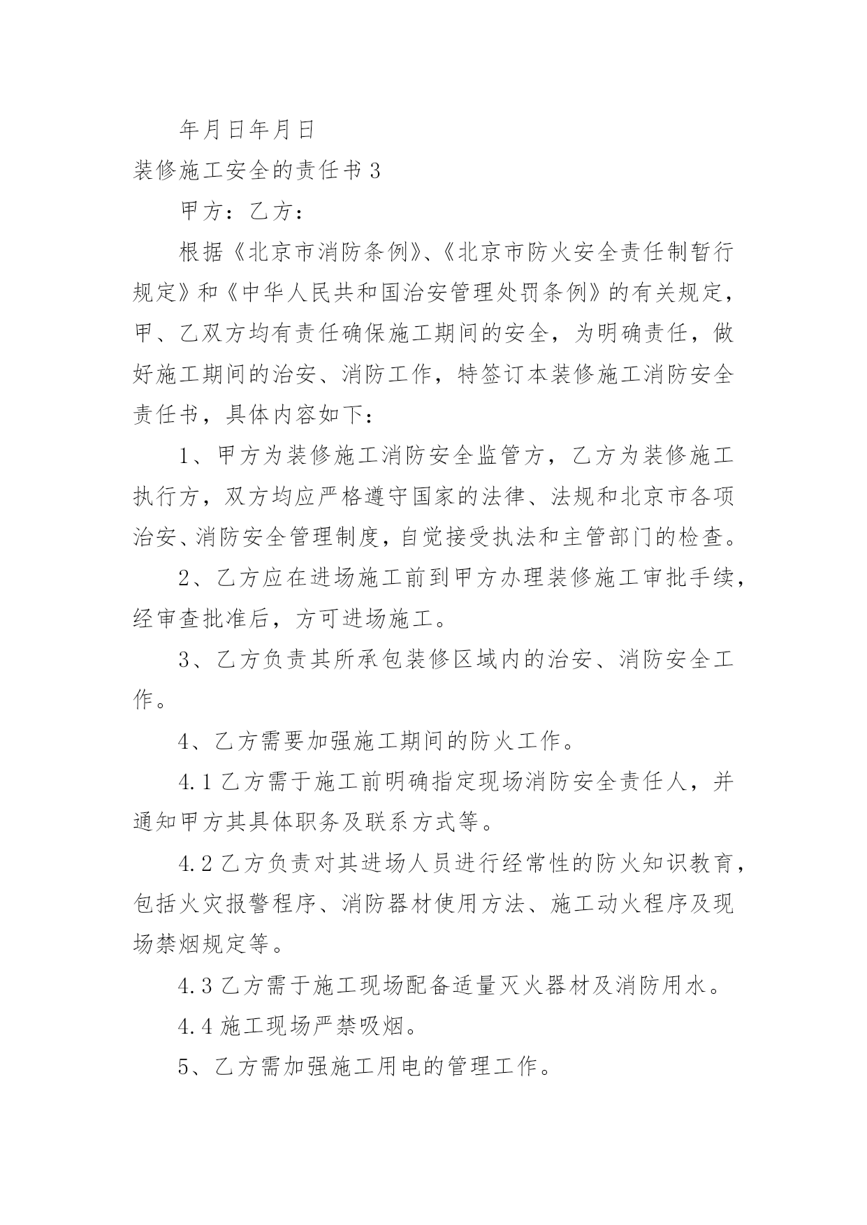装修施工安全的责任书装修施工安全的责任书在不断进步的社会中,越来越多地方需要用到责任书,责任书是写明责任范围、职责的文书。到底应如何拟定责任书呢?以下是小编帮大家整理的装修施工安全的责任书,希望能够帮助到大家。装修施工安全的责任书1为了搞好新厂房净化装修工程,保证工程的安全顺利、质量优良,特对安全、质量要求进行责任保证:一、文明施工部分:1、施工单位必须遵守国家的法律、法规和本公司的规章制度,服从管理,听从指挥。2、各施工单位在施工前必须进行开始施工申请。要健全项目部组织机构;制定项目规章制度;配备相关的施工技术人员;完善施工组织设计及安全技术措施;做好进场机具、材料准备工作。各方面施工条件具备后,向建设方书面提出开工申请,经审查同意后,方可进行施工。3、施工现场应规范管理,合理设置办公区、生活区、工作区。施工现场的物料要堆放整齐,生活区必须远离净化装修区域,做好文明施工工作。4、施工现场必须按照规定配备项目、技术、安全等施工管理人员。管理人员应常驻施工现场,每月不低于20个工作日,负责施工现场的安全、质量、文明施工等各方面工作。5、特种施工人员必须持证上岗。对于电焊工、电工等施工人员必须要有特种作业上岗证,严禁无证上岗、违章作业。6、施工单位在施工现场用电、动火施工,必须遵守威高《临时用电管理制度》和《动火作业管理制度》。(附《临时用电管理制度》和《动火作业管理制度》)7、应对所有施工人员进行安全教育,提高安全意识,使施工人员懂得安全施工的重要性,从思想上重视安全工作。施工现场应该预防火灾事故、触电事故、高空坠落事故的发生,各单位要把安全工作做到实处,灭火器、保险带以及个人安全防护的安全措施必须到位,防止安全事故的发生。施工单位应为施工人员购买意外伤害保险,保障职工合法权益。如发生意外伤害损失由施工方负责,建设方不负任何责任。8、搞好施工协调工作。在施工时,当一施工方与另一施工方发生冲突时,应立即找建设方代表进行协调,搞好协作,保证工程顺利进行。9、搞好施工现场的文明施工。施工方进入施工现场,首先清理好现场的卫生,做好安全防护措施,方可施工。施工中,施工垃圾、生活垃圾,一定要集中处理,严禁乱扔、乱放,严禁随地大小便。特别是彩板安装及彩板顶棚上,严禁吸烟、小便、乱扔垃圾,如有发现将处1000—5000元的罚款。严禁打架、偷盗等现象的发生,如有发生将移交公安部门处理。各单位要互相监督,做到文明施工。二、技术质量部分:1、按照甲方提供的施工图纸和国家施工技术标准进行施工。施工质量标准按照国家制定的有关施工质量验收规范执行。2、工程施工前必须组织图纸会审,经审核无异议后,方可施工。3、必须做好施工现场的施工技术方案、分部分项验收报告、来料验收报告、安全措施方案、材料的合格证等安全技术资料,确保验收资料齐全。4、在施工现场的各施工单位,必须按照设计要求进行施工,施工所用的材料必须符合合同要求,严禁使用伪劣不合格产品,按照规范保质、保量搞好净化车间的装修。5、各施工单位做出施工进度计划(报甲方备案),使净化装修工程按期完成。6、施工过程中,应按照分部、分项验收施工。风管制作、吊装后,经过甲方测漏验收后方可保温,风管保温后,方可安装彩板顶板。彩板安装放线后,应经甲方确认,方可施工。7、施工过程中如果发现图纸所设计的与现场实际情况不符、不科学、不美观,或者相互有障碍,应及时与甲方沟通,经研究、协商后进行合理变更。变更方案应经建设方签字认可后,方可施工。未经签字,建设方不予认可。8、各施工单位应提前安装技术夹层上的管道和设备,尽量避免顶板安装以后再进行踩踏,造成顶板的破坏。9、各施工单位要互相配合,协作施工。各施工单位在施工中应注意保护好已经安装的设备、管道、门窗、彩钢板等,各单位互相监督,谁损坏谁负责,如果没有发现是谁损坏的,由分项的施工方自己负责修复。彩钢板安装后,各单位在彩钢板上开眼安装管道必须保证准确无误,如果施工错误,所造成的一切损失,由责任方负责。施工单位:建设单位:责任人(签字):负责人(签字):日期:日期:装修施工安全的责任书2甲方:(以下简称甲方)乙方:(以下简称乙方)依据国家有关安全法规要求,结合我公司实际,认真贯彻执行“61”号令以及“安全第一、预防为主”的方针和“谁主管、谁负责”“抓生产必须抓安全”的原则,落实安全责任制,为确保施工安全,防止事故发生,为此甲乙双方必须履行以下条款:1、甲方对本工程的安全治安工作全面给予配合,同时对乙方的安全治安工作进行督促检查,对检查中查出的违规、违章行为、安全隐患有权要求乙方进行整改。2、甲方对在检查中发现的问题,应按公司要求采用书面形式告知乙方并存档备查。3、甲方有权按照有关管理办法对乙方的“三违”行为进行处罚。4、对无视装修工程安全管理的行为,甲方应及时报公司安办。5、乙方必