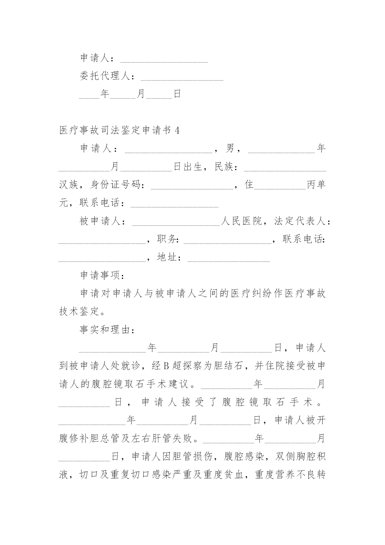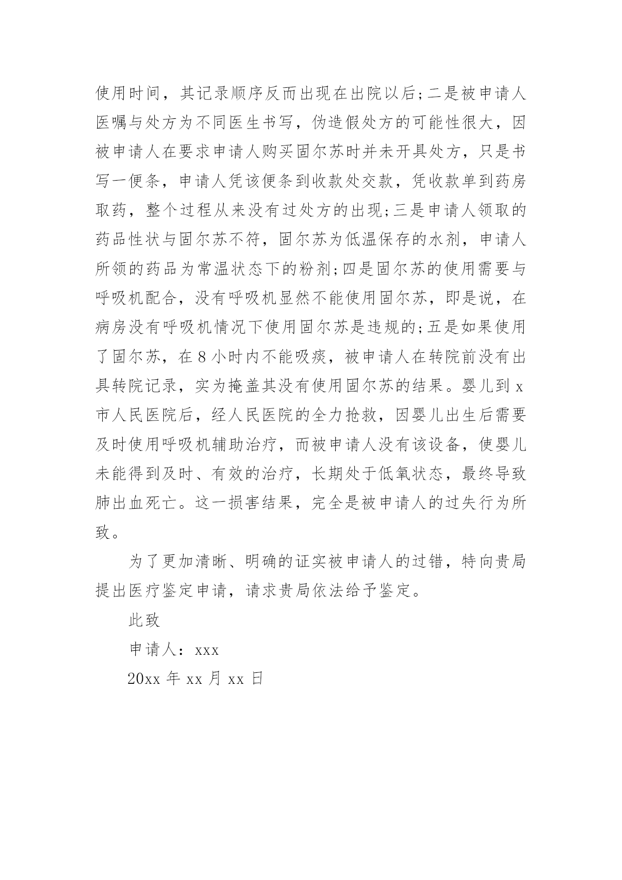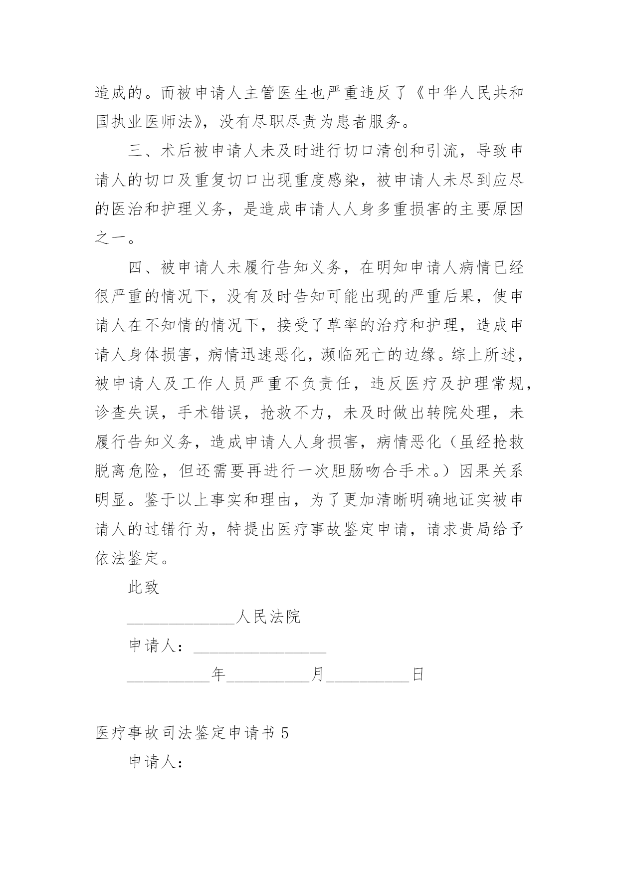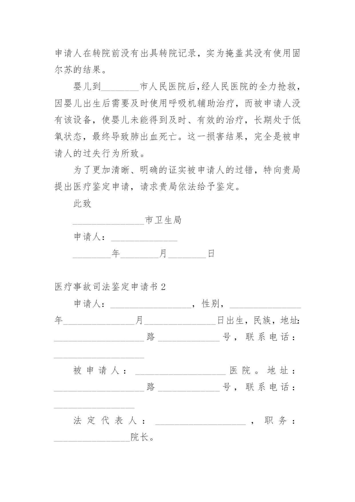 医疗事故司法鉴定申请书医疗事故司法鉴定申请书5篇在社会不断进步的今天,很多场合都离不了申请书,我们在写申请书的时候需要注意问题。那么相关的申请书到底怎么写呢?以下是小编为大家收集的医疗事故司法鉴定申请书,仅供参考,欢迎大家阅读。医疗事故司法鉴定申请书1申请人:______________被申请人:______________法定代表人:______________申请事项:申请对申请人与被申请人之间的医疗纠纷作医疗事故技术鉴定。事实和理由:申请人于________年________月________日入住被申请人妇产科分娩,于________日________时________分接受被申请人施行子宫下段剖宫产术,________时________分顺利产下一男婴,并安全返回病房,婴儿于1时08分转被申请人儿科治疗,转科诊断:1、早产极低体重儿。2、新生儿肺透明膜病。鉴于婴儿肺透明膜病,需要使用机械通气机(呼吸机)进行机械通气治疗,在医护人员告知后,申请人当即签字同意被申请人采取该措施治疗。但因被申请人缺乏充足的治疗设备(其呼吸机正在使用),致使被申请人束手无策,一直没有对婴儿进行呼吸机辅助通气治疗。更甚的是,直至________时________分,被申请人才迟迟告知申请人建议转________市人民医院呼吸机辅助通气治疗。申请人为抢救孩子,使其能及时得到治疗,二话没说,亦当即签字同意转院。可是,直至________时,被申请人才迟迟办理转至_______________市人民医院。市人民医院收治婴儿后,由于被申请人没有出具转院记录,需要重新化验、诊断,确诊病情,至5时,才使用呼吸机治疗。被申请人在婴儿病历中记录使用固尔苏治疗,有诸多疑点:一是固尔苏价格昂贵,被申请人使用固尔苏没有记录使用时间,其记录顺序反而出现在出院以后;二是被申请人医嘱与处方为不同医生书写,伪造假处方的可能性很大,因被申请人在要求申请人购买固尔苏时并未开具处方,只是书写一便条,申请人凭该便条到收款处交款,凭收款单到药房取药,整个过程从来没有过处方的出现;三是申请人领取的药品性状与固尔苏不符,固尔苏为低温保存的水剂,申请人所领的药品为常温状态下的粉剂;四是固尔苏的使用需要与呼吸机配合,没有呼吸机显然不能使用固尔苏,即是说,在病房没有呼吸机情况下使用固尔苏是违规的;五是如果使用了固尔苏,在8小时内不能吸痰,被申请人在转院前没有出具转院记录,实为掩盖其没有使用固尔苏的结果。婴儿到________市人民医院后,经人民医院的全力抢救,因婴儿出生后需要及时使用呼吸机辅助治疗,而被申请人没有该设备,使婴儿未能得到及时、有效的治疗,长期处于低氧状态,最终导致肺出血死亡。这一损害结果,完全是被申请人的过失行为所致。为了更加清晰、明确的证实被申请人的过错,特向贵局提出医疗鉴定申请,请求贵局依法给予鉴定。此致_______________市卫生局申请人:______________________年________月________日医疗事故司法鉴定申请书2申请人:_________________,性别,_______________年_______________月_______________日出生,民族,地址:___________________路_____________号,联系电话:___________________被申请人:___________________医院。地址:___________________路_____________号,联系电话:_________________法定代表人:___________________,职务:________________院长。申请事项1、申请法院委托鉴定机构对_____________医院对_____________患者的诊疗行为进行医疗事故司法鉴定。2、_____________医院对_____________患者的诊疗过错行为与_____________患者的死亡是否有因果关系进行鉴定3、_____________医院对_____________患者的诊疗过错行为与_____________患者的死亡后果如果有因果关系,对其参与度进行鉴定。事实和理由申请人诉_____________医院医疗损害赔偿一案,_______________人民法院已经立案。为查明事实,明确责任,现申请人依法申请法院委托鉴定机构对_____________医院的诊疗行为进行医疗过错司法鉴定,请法院依法核准。此致_______________人民法院申请人:________________________________年_______________月_______________日医疗事故司法鉴定申请书3申请人:___