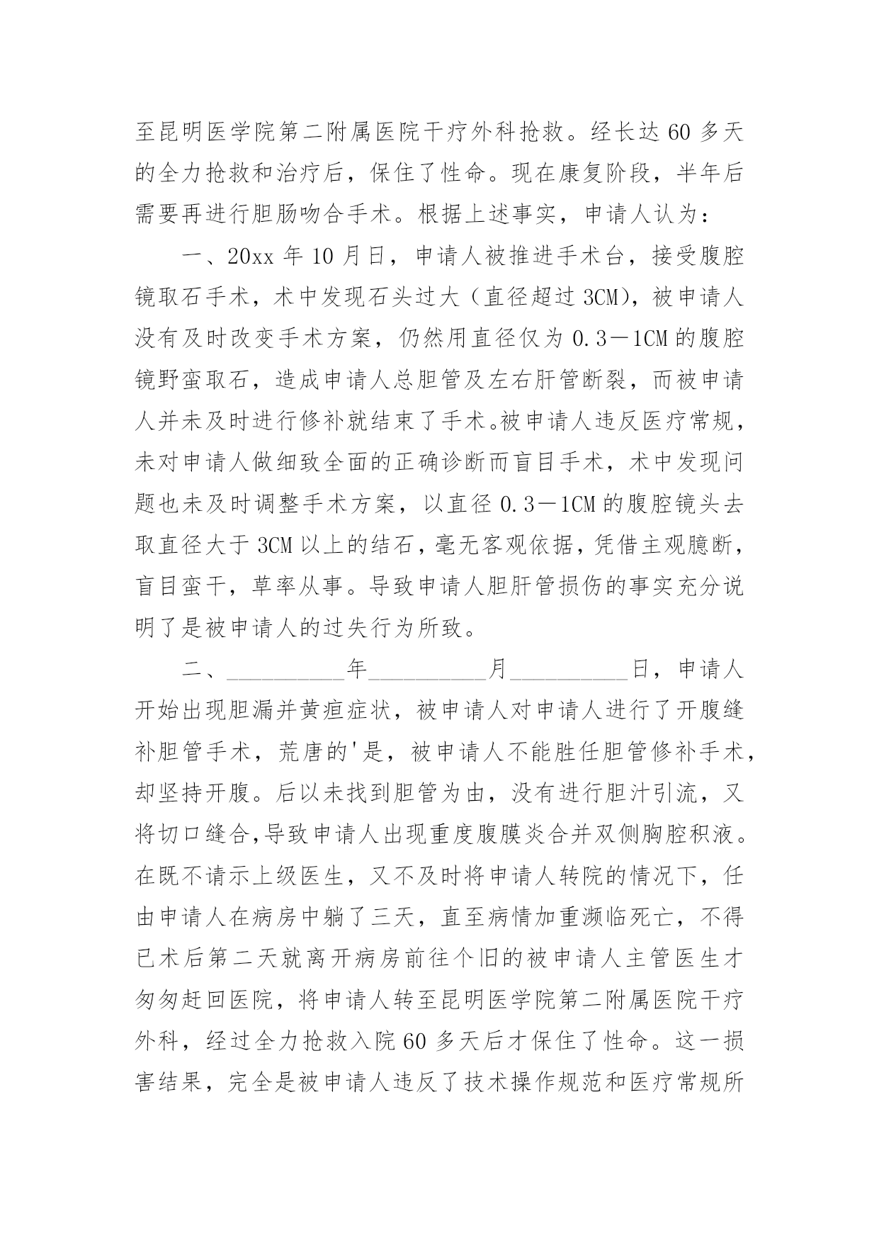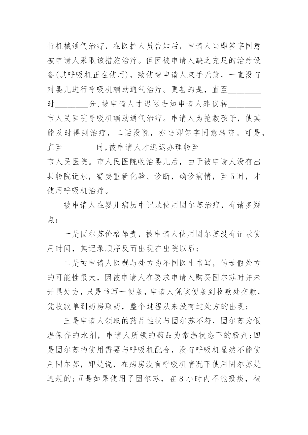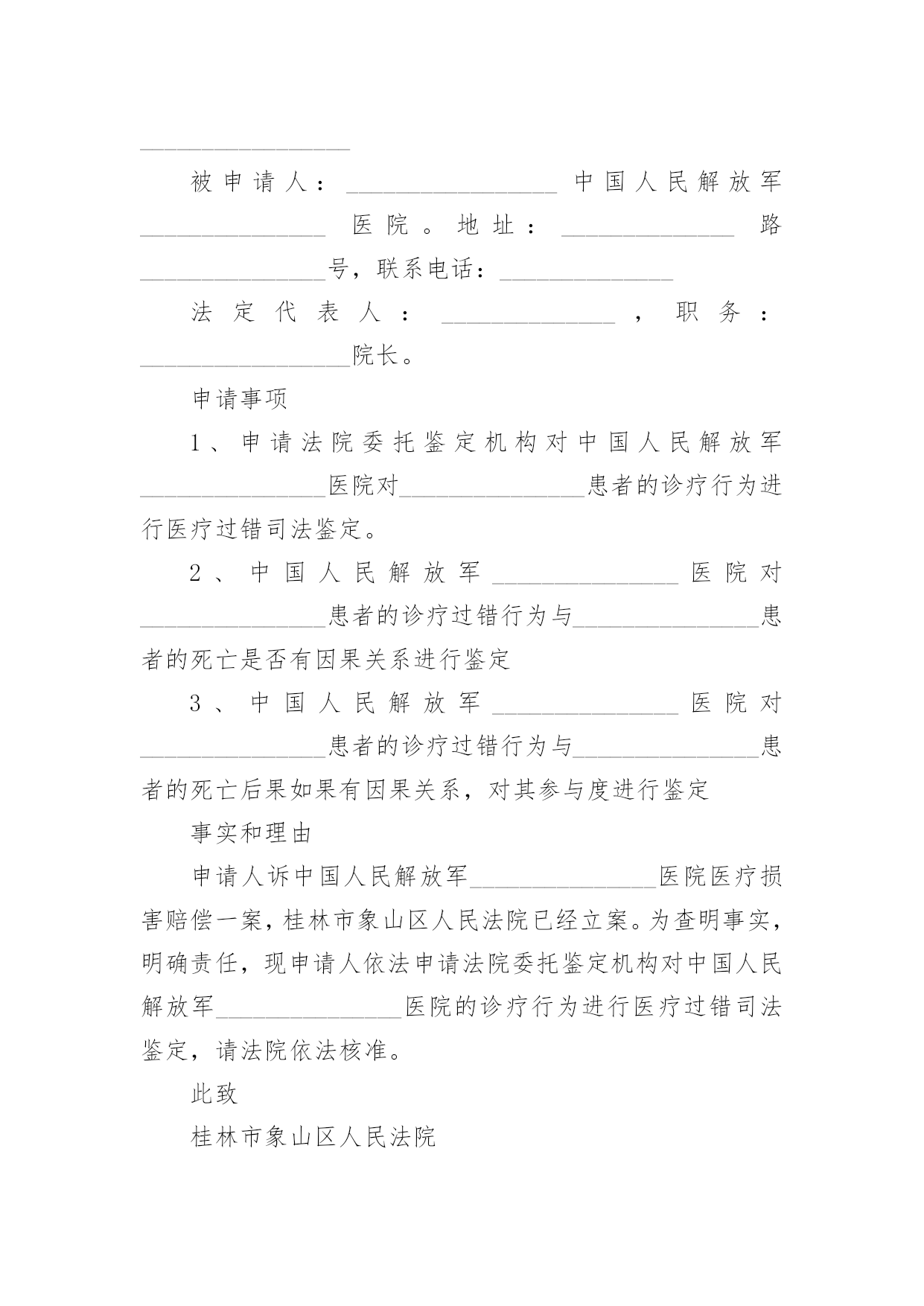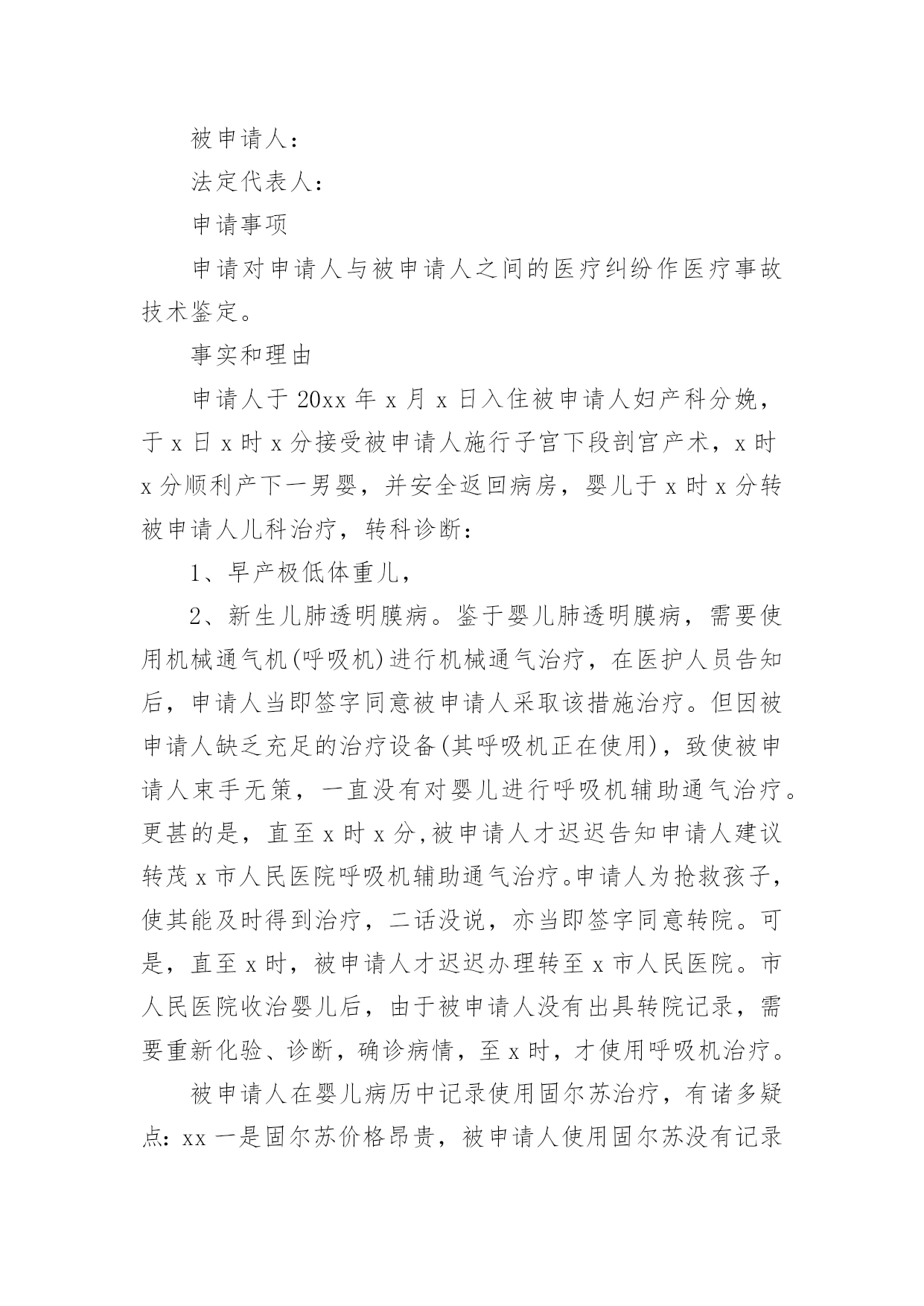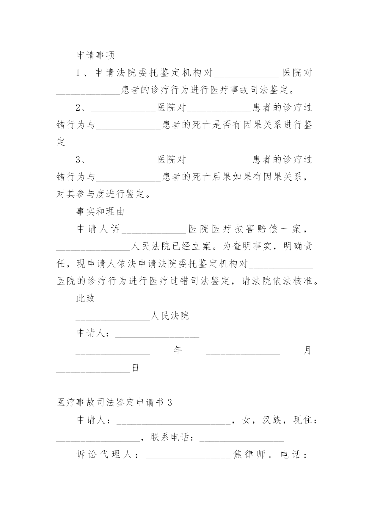 医疗事故司法鉴定申请书医疗事故司法鉴定申请书5篇在社会不断进步的今天,很多场合都离不了申请书,我们在写申请书的时候需要注意问题。那么相关的申请书到底怎么写呢?以下是小编为大家收集的医疗事故司法鉴定申请书,仅供参考,欢迎大家阅读。医疗事故司法鉴定申请书1申请人:______________被申请人:______________法定代表人:______________申请事项:申请对申请人与被申请人之间的医疗纠纷作医疗事故技术鉴定。事实和理由:申请人于________年________月________日入住被申请人妇产科分娩,于________日________时________分接受被申请人施行子宫下段剖宫产术,________时________分顺利产下一男婴,并安全返回病房,婴儿于1时08分转被申请人儿科治疗,转科诊断:1、早产极低体重儿。2、新生儿肺透明膜病。鉴于婴儿肺透明膜病,需要使用机械通气机(呼吸机)进行机械通气治疗,在医护人员告知后,申请人当即签字同意被申请人采取该措施治疗。但因被申请人缺乏充足的治疗设备(其呼吸机正在使用),致使被申请人束手无策,一直没有对婴儿进行呼吸机辅助通气治疗。更甚的是,直至________时________分,被申请人才迟迟告知申请人建议转________市人民医院呼吸机辅助通气治疗。申请人为抢救孩子,使其能及时得到治疗,二话没说,亦当即签字同意转院。可是,直至________时,被申请人才迟迟办理转至_______________市人民医院。市人民医院收治婴儿后,由于被申请人没有出具转院记录,需要重新化验、诊断,确诊病情,至5时,才使用呼吸机治疗。被申请人在婴儿病历中记录使用固尔苏治疗,有诸多疑点:一是固尔苏价格昂贵,被申请人使用固尔苏没有记录使用时间,其记录顺序反而出现在出院以后;二是被申请人医嘱与处方为不同医生书写,伪造假处方的可能性很大,因被申请人在要求申请人购买固尔苏时并未开具处方,只是书写一便条,申请人凭该便条到收款处交款,凭收款单到药房取药,整个过程从来没有过处方的出现;三是申请人领取的药品性状与固尔苏不符,固尔苏为低温保存的水剂,申请人所领的药品为常温状态下的粉剂;四是固尔苏的使用需要与呼吸机配合,没有呼吸机显然不能使用固尔苏,即是说,在病房没有呼吸机情况下使用固尔苏是违规的;五是如果使用了固尔苏,在8小时内不能吸痰,被申请人在转院前没有出具转院记录,实为掩盖其没有使用固尔苏的结果。婴儿到________市人民医院后,经人民医院的全力抢救,因婴儿出生后需要及时使用呼吸机辅助治疗,而被申请人没有该设备,使婴儿未能得到及时、有效的治疗,长期处于低氧状态,最终导致肺出血死亡。这一损害结果,完全是被申请人的过失行为所致。为了更加清晰、明确的证实被申请人的过错,特向贵局提出医疗鉴定申请,请求贵局依法给予鉴定。此致_______________市卫生局申请人:______________________年________月________日医疗事故司法鉴定申请书2申请人:_________________,性别,_______________年_______________月_______________日出生,民族,地址:___________________路_____________号,联系电话:___________________被申请人:___________________医院。地址:___________________路_____________号,联系电话:_________________法定代表人:___________________,职务:________________院长。申请事项1、申请法院委托鉴定机构对_____________医院对_____________患者的诊疗行为进行医疗事故司法鉴定。2、_____________医院对_____________患者的诊疗过错行为与_____________患者的死亡是否有因果关系进行鉴定3、_____________医院对_____________患者的诊疗过错行为与_____________患者的死亡后果如果有因果关系,对其参与度进行鉴定。事实和理由申请人诉_____________医院医疗损害赔偿一案,_______________人民法院已经立案。为查明事实,明确责任,现申请人依法申请法院委托鉴定机构对_____________医院的诊疗行为进行医疗过错司法鉴定,请法院依法核准。此致_______________人民法院申请人:________________________________年_______________月_______________日医疗事故司法鉴定申请书3申请人:___