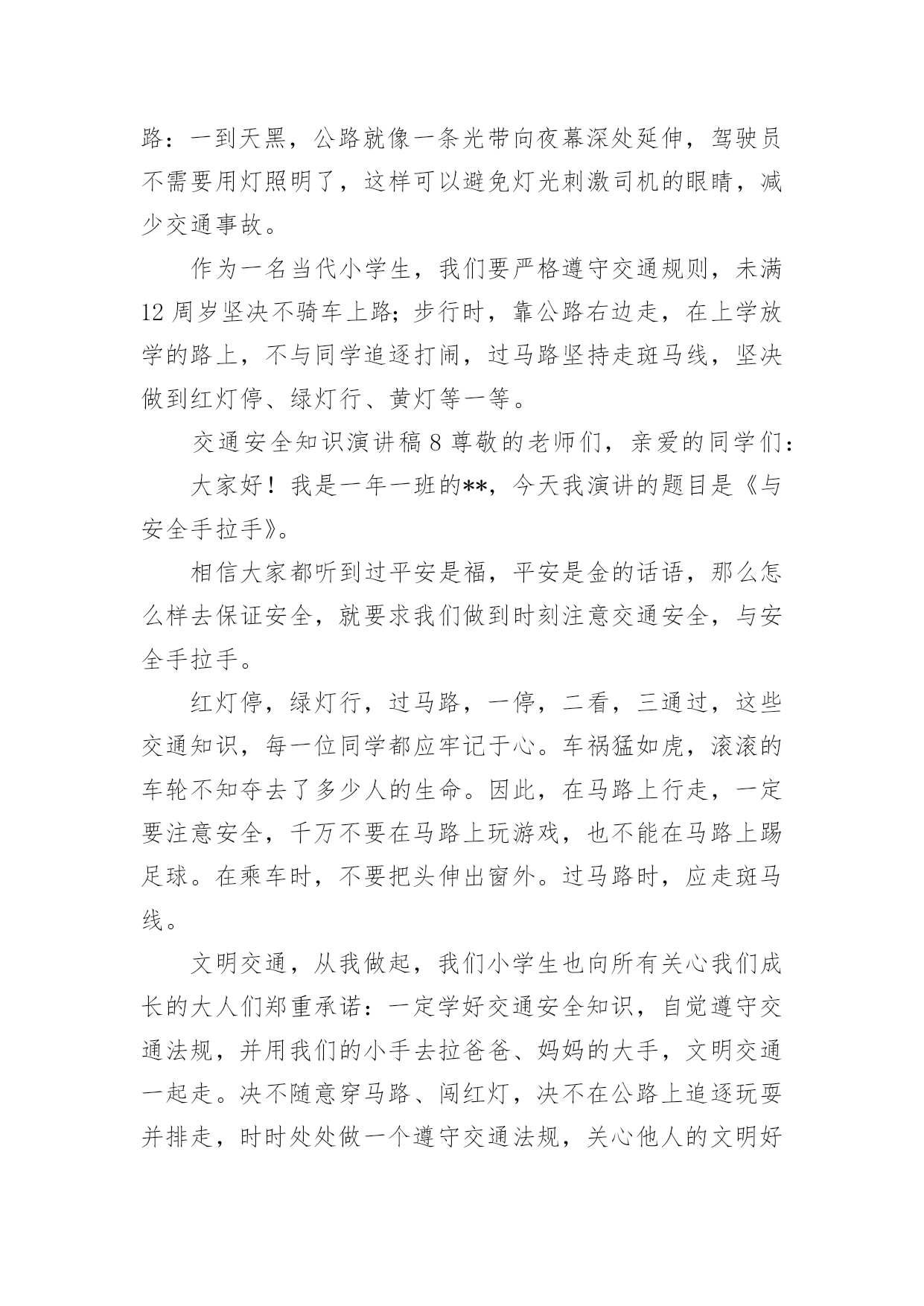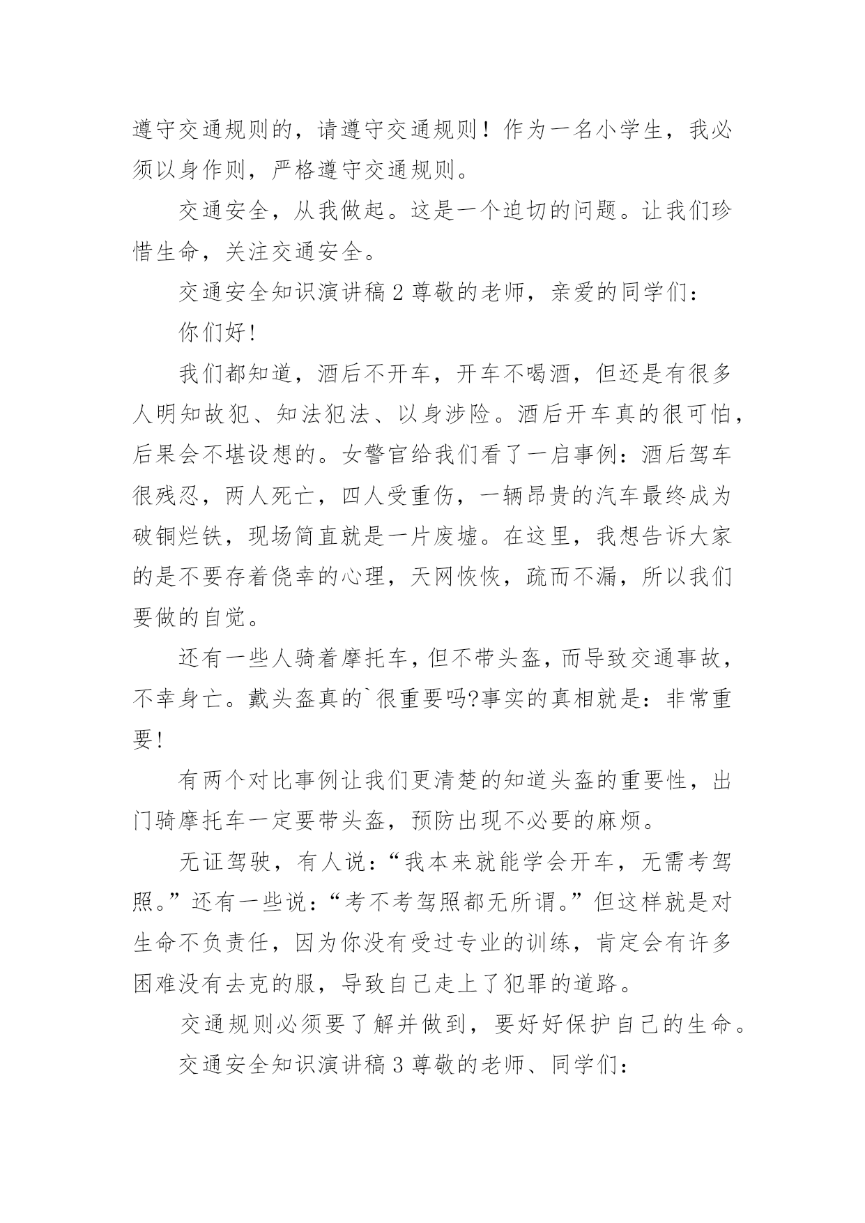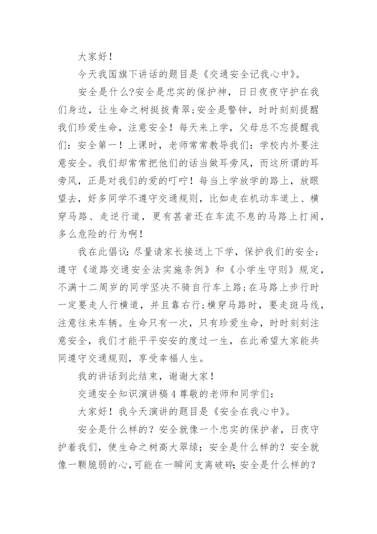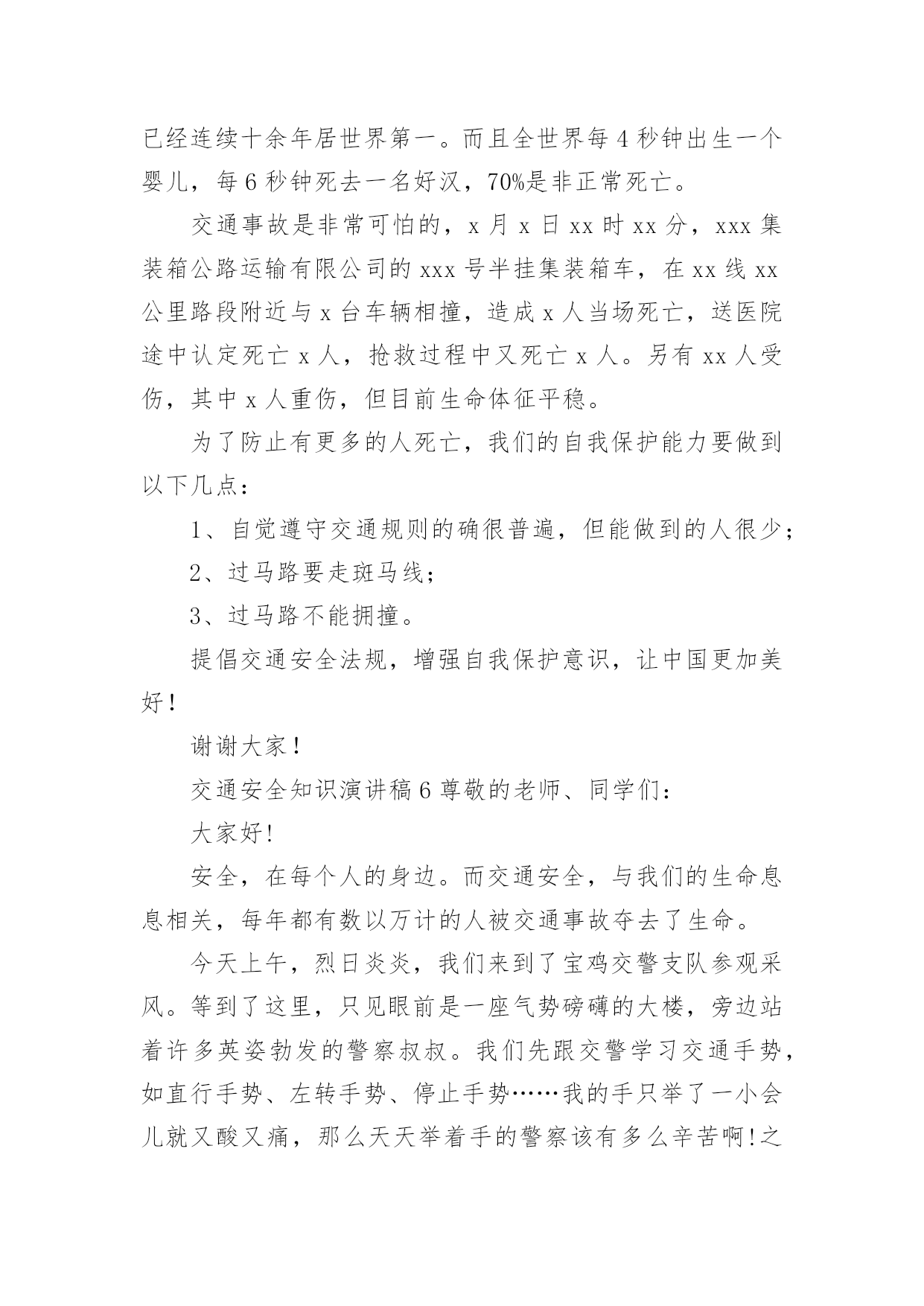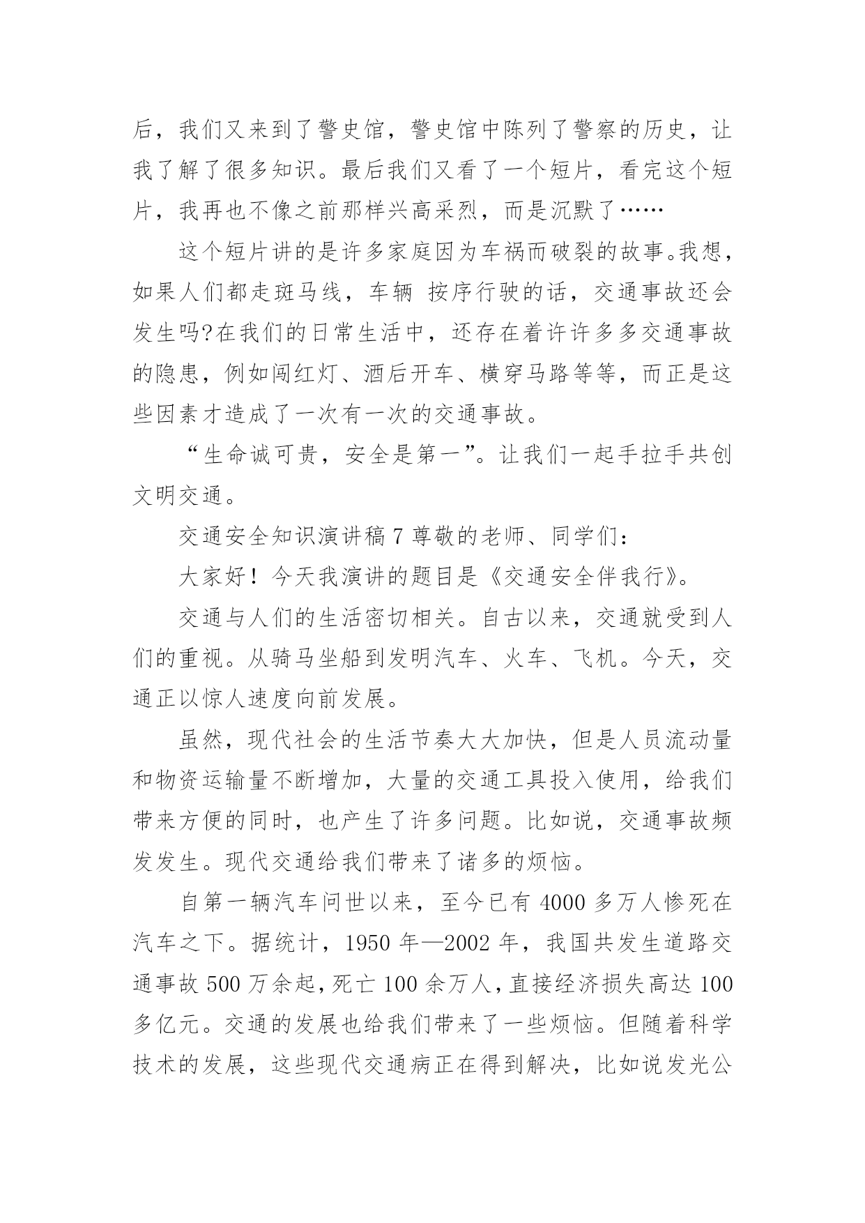 交通安全知识演讲稿交通安全知识演讲稿400字(精选8篇)使用正确的写作思路书写演讲稿会更加事半功倍。在现实社会中,演讲稿在演讲中起到的作用越来越大,在写之前,可以先参考范文,下面是小编收集整理的交通安全知识演讲稿400字(精选8篇),欢迎阅读,希望大家能够喜欢。交通安全知识演讲稿1尊敬的老师、亲爱的同学们:大家好!在现代社会,我们的生活离不开交通,交通安全也是一个不容忽视的问题,必须言出必行,从我做起。然而,有些人不注意交通安全。你有没有想过,一点点的疏忽,可能会让你后悔一辈子?记得有一次,我从学校走回家的路上,突然听到不远处有“嘘——”的紧急刹车声和撞车声。听说一辆校车和一辆转弯的车相撞,车头撞上了校车尾部,校车的油漆被撞掉了,有的变形了,车的大灯也下来了。当时我的心猛地一抖,心想:校车上那么多学生有多危险!如果司机反应稍微慢一点,含苞待放的小花车可能还没开就被车祸撞死了。一想到这我就吓出一身冷汗。这时候双方业主吵起来了,我也靠近了一点。听说车主身上有股难闻的酒味,显然喝了不少酒。这时,交警也赶到现场处理交通事故。那些酒驾的人,不要让自己的生命徘徊在生死线上;不遵守交通规则的,请遵守交通规则!作为一名小学生,我必须以身作则,严格遵守交通规则。交通安全,从我做起。这是一个迫切的问题。让我们珍惜生命,关注交通安全。交通安全知识演讲稿2尊敬的老师,亲爱的同学们:你们好!我们都知道,酒后不开车,开车不喝酒,但还是有很多人明知故犯、知法犯法、以身涉险。酒后开车真的很可怕,后果会不堪设想的。女警官给我们看了一启事例:酒后驾车很残忍,两人死亡,四人受重伤,一辆昂贵的汽车最终成为破铜烂铁,现场简直就是一片废墟。在这里,我想告诉大家的是不要存着侥幸的心理,天网恢恢,疏而不漏,所以我们要做的自觉。还有一些人骑着摩托车,但不带头盔,而导致交通事故,不幸身亡。戴头盔真的`很重要吗?事实的真相就是:非常重要!有两个对比事例让我们更清楚的知道头盔的重要性,出门骑摩托车一定要带头盔,预防出现不必要的麻烦。无证驾驶,有人说:“我本来就能学会开车,无需考驾照。”还有一些说:“考不考驾照都无所谓。”但这样就是对生命不负责任,因为你没有受过专业的训练,肯定会有许多困难没有去克的服,导致自己走上了犯罪的道路。交通规则必须要了解并做到,要好好保护自己的生命。交通安全知识演讲稿3尊敬的老师、同学们:大家好!今天我国旗下讲话的题目是《交通安全记我心中》。安全是什么?安全是忠实的保护神,日日夜夜守护在我们身边,让生命之树挺拔青翠;安全是警钟,时时刻刻提醒我们珍爱生命,注意安全!每天来上学,父母总不忘提醒我们:安全第一!上课时,老师常常教导我们:学校内外要注意安全。我们却常常把他们的话当做耳旁风,而这所谓的耳旁风,正是对我们的爱的叮咛!每当上学放学的路上,放眼望去,好多同学不遵守交通规则,比如走在机动车道上、横穿马路、走逆行道,更有甚者还在车流不息的马路上打闹,多么危险的行为啊!我在此倡议:尽量请家长接送上下学,保护我们的安全;遵守《道路交通安全法实施条例》和《小学生守则》规定,不满十二周岁的同学坚决不骑自行车上路;在马路上步行时一定要走人行横道,并且靠右行;横穿马路时,要走斑马线,注意往来车辆。生命只有一次,只有珍爱生命,时时刻刻注意安全,我们才能平平安安的度过一生,在此希望大家能共同遵守交通规则,享受幸福人生。我的讲话到此结束,谢谢大家!交通安全知识演讲稿4尊敬的老师和同学们:大家好!我今天演讲的题目是《安全在我心中》。安全是什么样的?安全就像一个忠实的保护者,日夜守护着我们,使生命之树高大翠绿;安全是什么样的?安全就像一颗脆弱的心,可能在一瞬间支离破碎;安全是什么样的?安全就像一个警钟,时刻提醒我们珍惜生命,注意安全。每天上学,父母总是提醒我们:安全第一,学习第二;在课堂上,老师经常教我们注意学校内外的安全。我们常常对他们的话充耳不闻,而这所谓的充耳不闻,就是在提醒我们的爱!在往返学校的路上环顾四周,许多学生不遵守交通规则,比如在高速公路上行走、过马路、走反方向的路,甚至在车流不息的路上追逐打闹。多么危险的行为。人的生命是脆弱的,不小心就可能发生危险。所以我在这里提出:上学路上和放学后,一定要走人行道,向右走;过马路时,走斑马线,注意交通;禁止在路上追逐打闹。希望大家都能遵守,共同珍惜我们的安全!安全似乎离我们很远,又似乎离我们很近,远到天边,近在咫尺。安全在哪里?是的,安全在我们自己心里。人生只有一次。只有珍惜生命,时刻关注安全,才能过上平静的生活。我的发言到此结束,谢谢!交通安全知识演讲稿5尊敬的同学们:大家好,我是四班的陈王怡,今天我演讲的主题是交通安全伴我行。在日常生活中大家也经常说要注意安全,可谁做到了呢?据x月x日《xx晚报》报道,交通事故已成为“世界