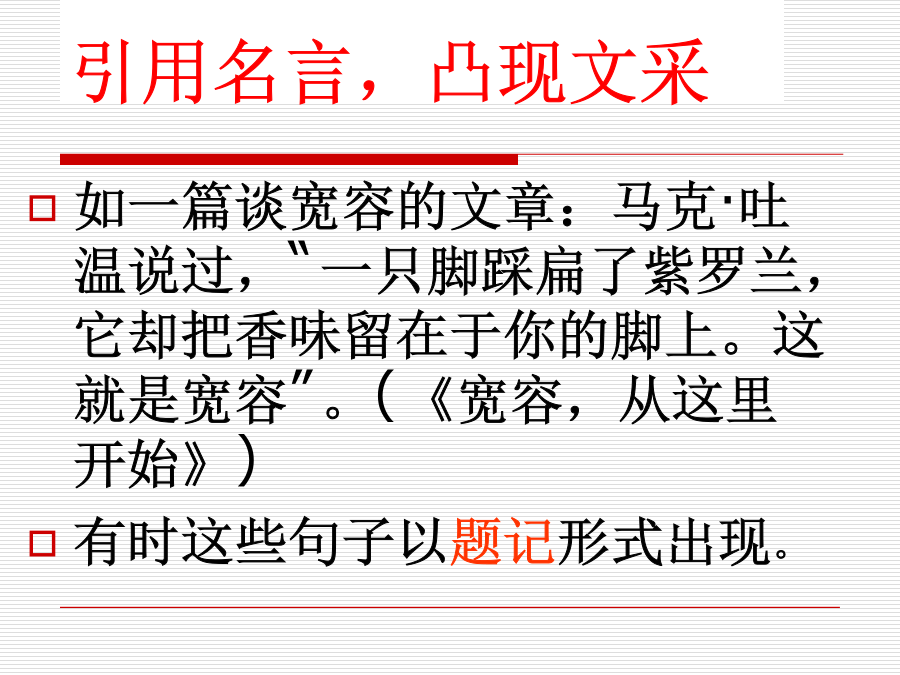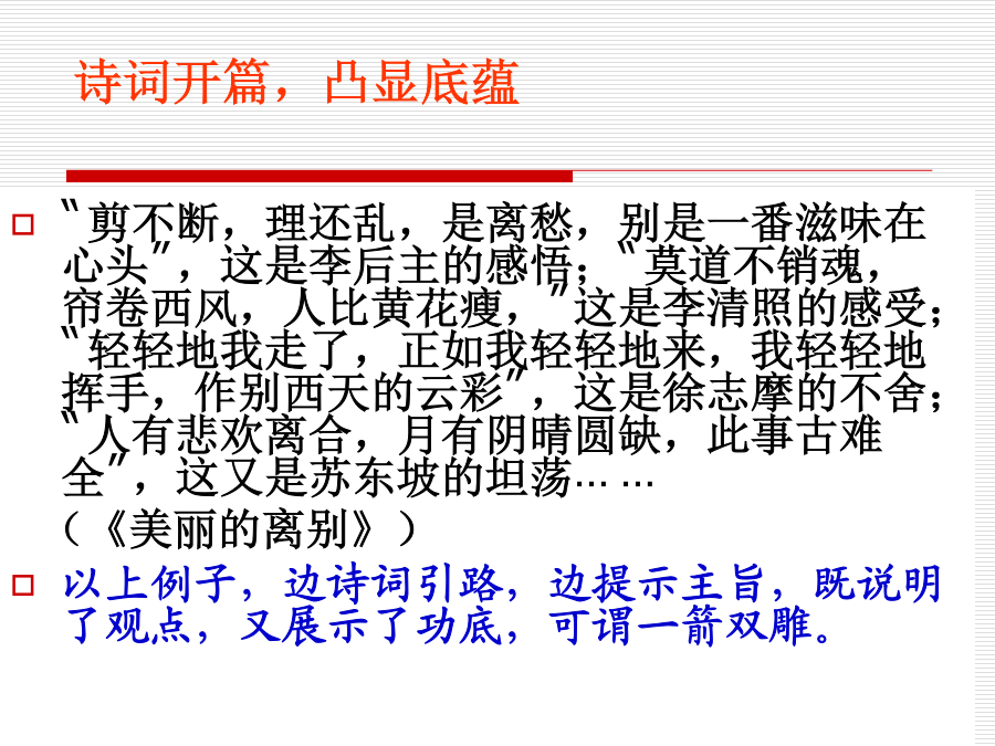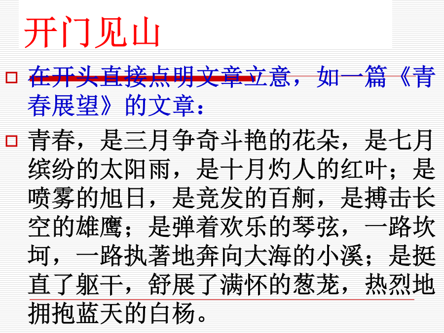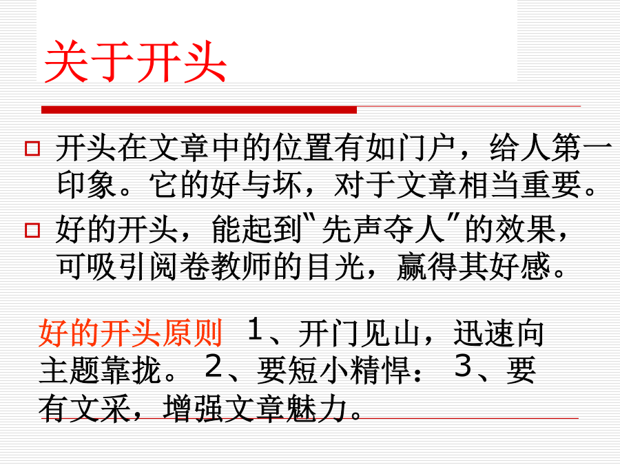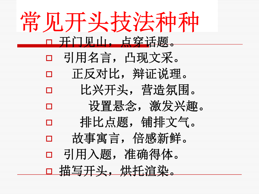 2010高考作文开头结尾技法关于开头常见开头技法种种开门见山引文入题,典雅厚重引用名言,凸现文采诗词开篇,凸显底蕴排比入题,先声夺人运用修辞格开篇,营造一种氛围,引人入胜.警句突现,启迪入题整散交错,灵巧入题细腻描绘,形象入题对话开篇,引人入胜事例开篇,简洁铺陈对称开篇,整齐明快梯式开头,突出视觉抒情开篇,拨动读者心弦,烘托渲染气氛,引出所叙说的人和事。设置疑问,引起读者注意,急于卒读。开头:“坐在窗边细细地品着一盏龙井,漫不经心地翻着一打报刊,感觉生活是如此美丽。无意间翻到一篇令人触目惊心的报道:一名中学生跳楼自杀未遂,高位截瘫……”结尾:“轮椅上的孩子,愿你已经找到了你生命的出口,找到了一个关于生命满意的答案,愿你生命能够更精彩!”世上无难事!朋友们:只要你我都能够拥有坚忍不屈的品格,再大的困难也只是一时的“纸老虎”。让我们共同记住奥斯丁的这句话吧:坚强不屈的品格是每个人都应当去奋力追求的。(《坚韧--我追求的品格》)……妈妈,我不知道如何安慰您啊,为什么您一想起外公就满脸泪花。假如记忆可以移植,妈妈,把我的记忆移植给您吧,我的记忆里不仅有欢声笑语,还有感动和幸福。把我的记忆移植给您,抹去您眼中的泪花,让您重现昔日的芳华!《妈妈,把我的记忆移植给您吧》付出,不一定有回报;然而,没有付出,绝没有回报。伸出援助的手,挽起来,是一个天,撑起来,就是高大的“人”字!朱熹说:问渠哪得清如许,为有源头活水来。无源之水绝不会清,让我们记住这句话吧!