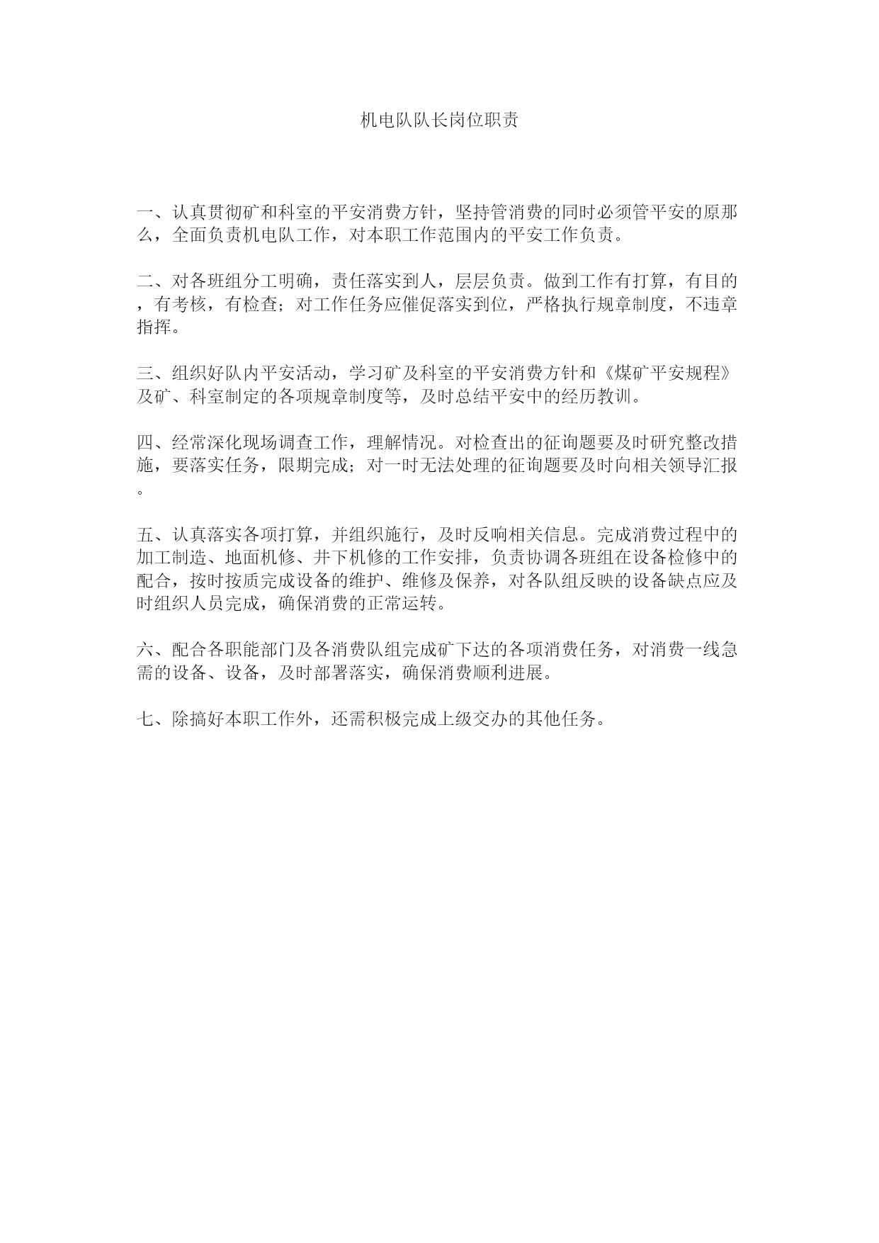 机电队队长岗位职责一、认真贯彻矿和科室的平安消费方针,坚持管消费的同时必须管平安的原那么,全面负责机电队工作,对本职工作范围内的平安工作负责。二、对各班组分工明确,责任落实到人,层层负责。做到工作有打算,有目的,有考核,有检查;对工作任务应催促落实到位,严格执行规章制度,不违章指挥。三、组织好队内平安活动,学习矿及科室的平安消费方针和《煤矿平安规程》及矿、科室制定的各项规章制度等,及时总结平安中的经历教训。四、经常深化现场调查工作,理解情况。对检查出的征询题要及时研究整改措施,要落实任务,限期完成;对一时无法处理的征询题要及时向相关领导汇报。五、认真落实各项打算,并组织施行,及时反响相关信息。完成消费过程中的加工制造、地面机修、井下机修的工作安排,负责协调各班组在设备检修中的配合,按时按质完成设备的维护、维修及保养,对各队组反映的设备缺点应及时组织人员完成,确保消费的正常运转。六、配合各职能部门及各消费队组完成矿下达的各项消费任务,对消费一线急需的设备、设备,及时部署落实,确保消费顺利进展。七、除搞好本职工作外,还需积极完成上级交办的其他任务。