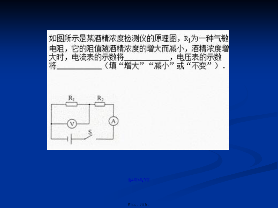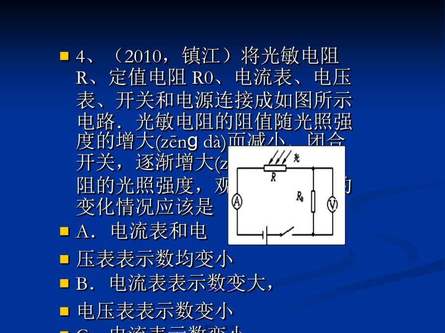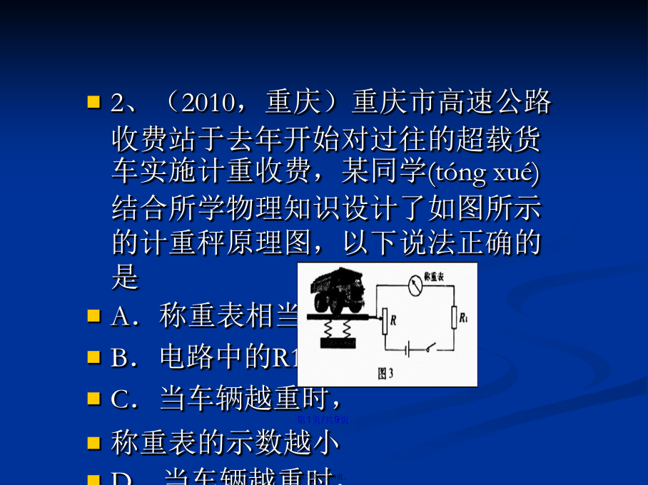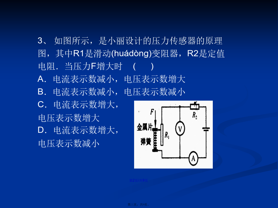 会计学2、(2010,重庆)重庆市高速公路收费站于去年开始对过往的超载货车实施计重收费,某同学(tóngxué)结合所学物理知识设计了如图所示的计重秤原理图,以下说法正确的是A.称重表相当于一个电压表B.电路中的R1是没有作用的C.当车辆越重时,称重表的示数越小D.当车辆越重时,称重表的示数越大3、如图所示,是小丽设计的压力传感器的原理图,其中R1是滑动(huádòng)变阻器,R2是定值电阻.当压力F增大时()A.电流表示数减小,电压表示数增大B.电流表示数减小,电压表示数减小C.电流表示数增大,电压表示数增大D.电流表示数增大,电压表示数减小4、(2010,镇江)将光敏电阻R、定值电阻R0、电流表、电压表、开关和电源连接成如图所示电路.光敏电阻的阻值随光照强度的增大(zēnɡdà)而减小.闭合开关,逐渐增大(zēnɡdà)光敏电阻的光照强度,观察电表示数的变化情况应该是A.电流表和电压表表示数均变小B.电流表表示数变大,电压表表示数变小C.电流表示数变小,电压表表示数变大D.电流表和电压表表示数均变大