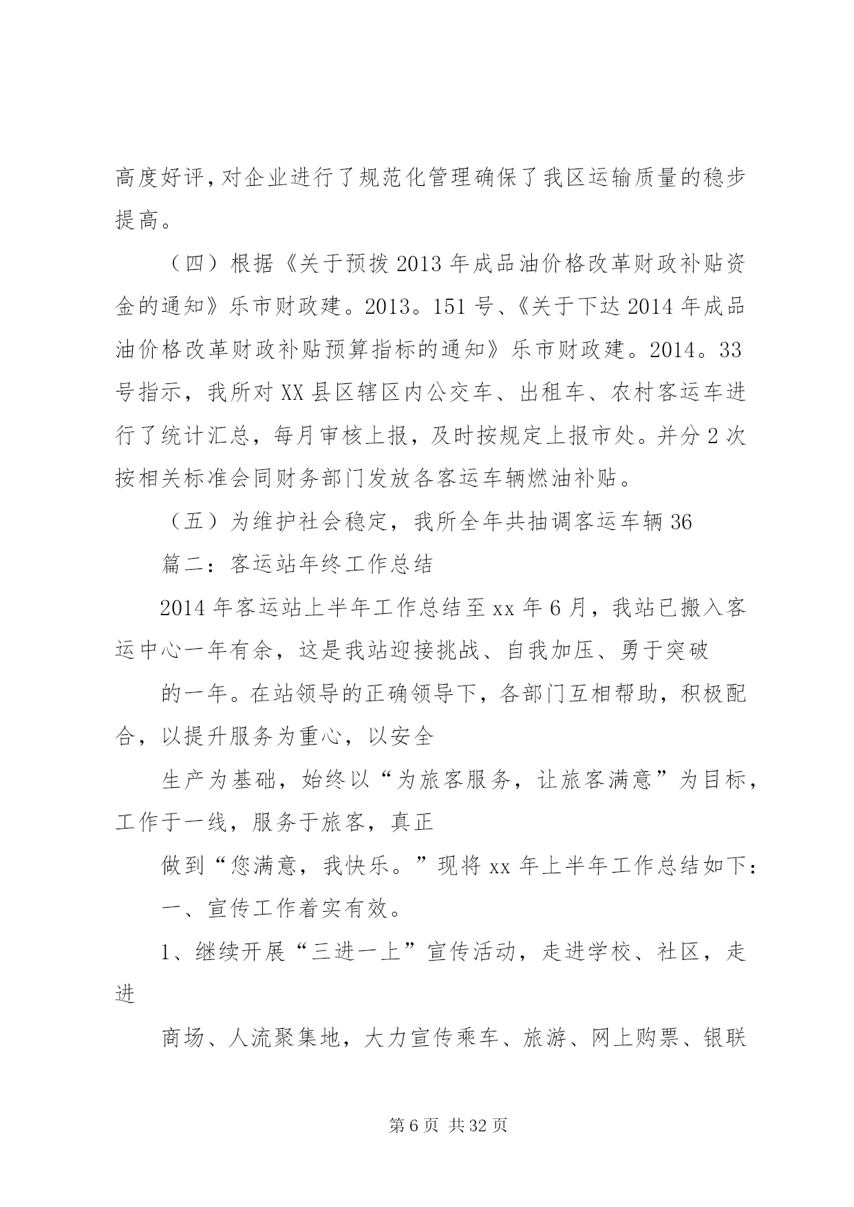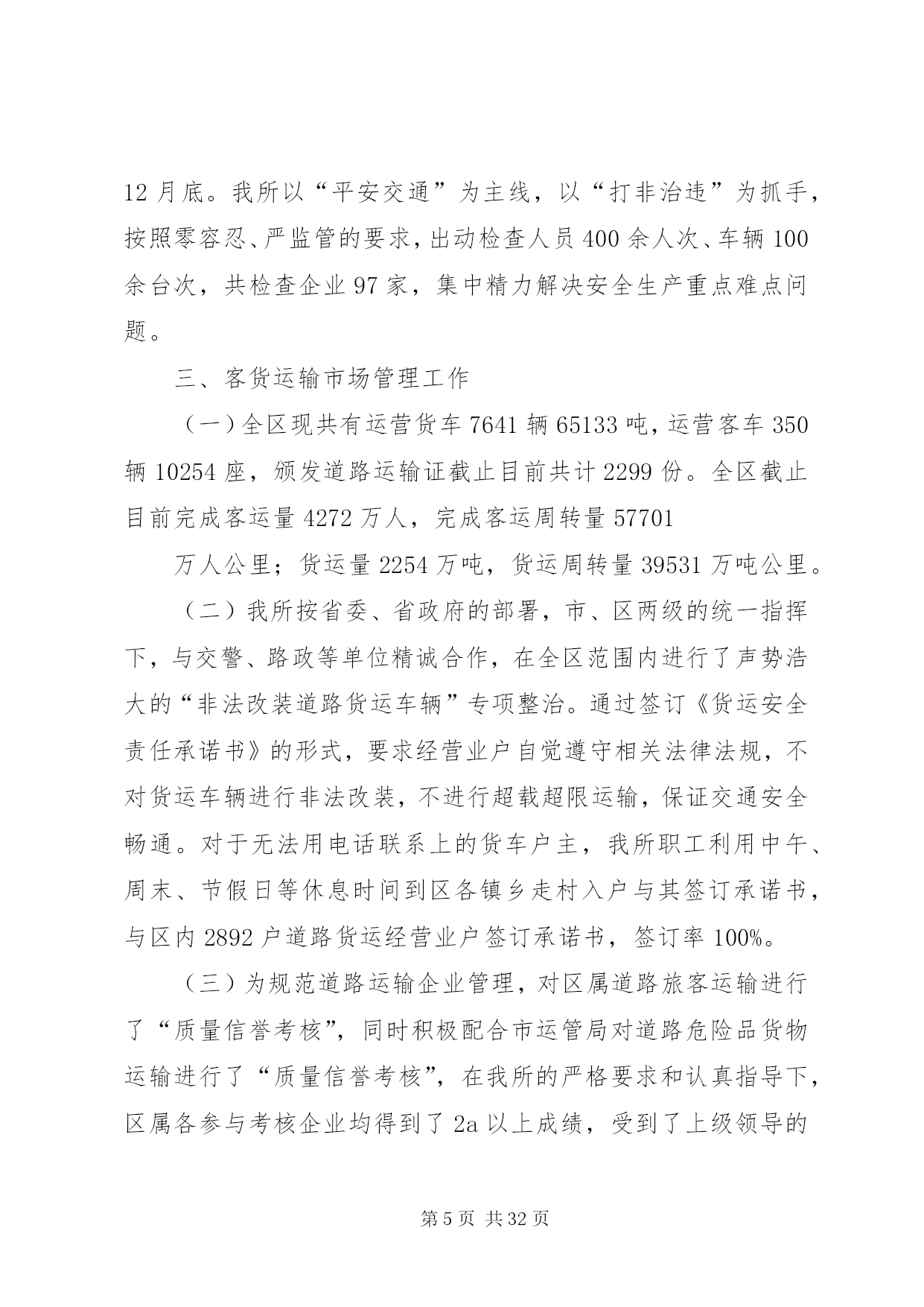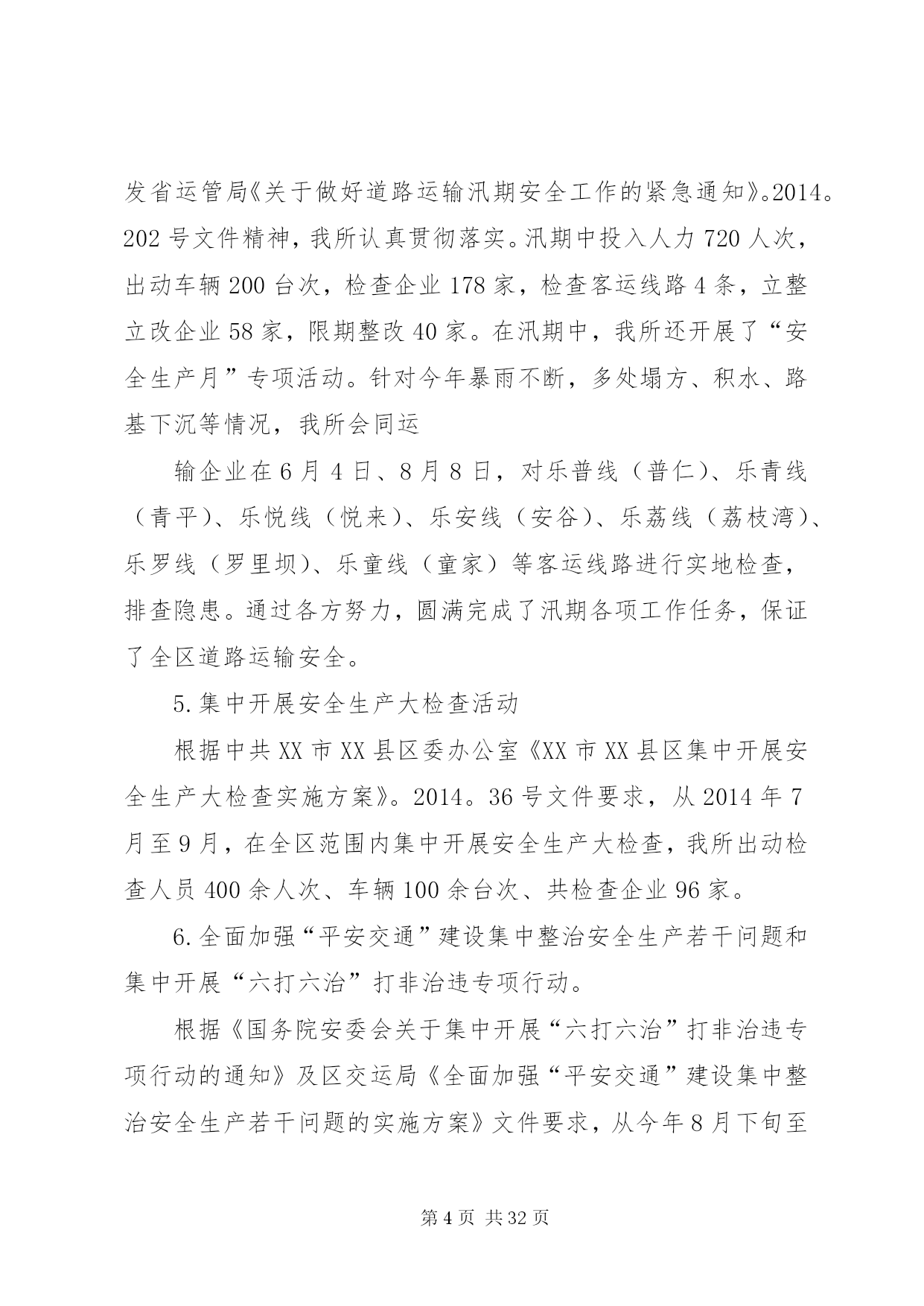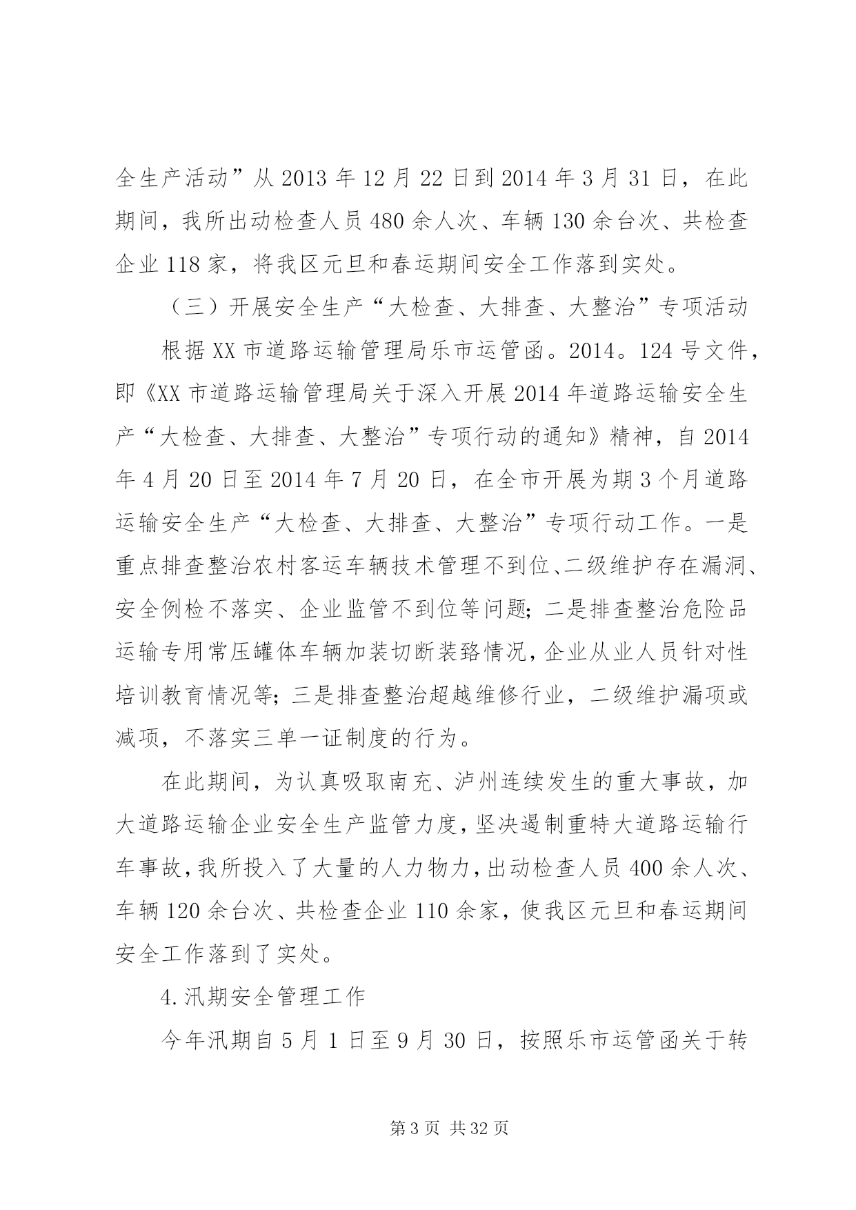 第PAGE\*Arabic\*MERGEFORMAT32页共NUMPAGES\*MERGEFORMAT32页交通部年终工作总结篇一:2014年运管所年终总结及2015年计划XX市XX县区道路运输管理所2014年度工作总结及2015年工作计划今年,我所在区交通运输局和市运管局的领导下,以“科学发展观”、党的十八届三中全会、四中全会精神为指导,认真贯彻党的路线方针政策,按照区交通运输局和市运管局下达的工作目标,进行了全面细化落实,在所领导的部署和安排下,通过全所职工的共同努力,保证了各项工作的顺利完成。现将我所全年工作总结如下:一、认真开展第二批党的群众路线教育实践活动。根据《中共XX市XX县区交通运输局委员会深入开展党的群众路线教育实践活动实施方案》(乐中交党。2014。3号)和《中共XX市XX县区交通运输局委员会关于深入开展党的群众路线教育实践活动学习教育、听取意见环节工作安排》乐中交党。2014。8号文件精神,从今年3月起,XX市XX县区道路运输管理所党支部,按照“照镜子、正衣冠、洗洗澡、治治病”的总要求,紧密围绕为民务实清廉的主要内容,紧密聚焦“四风”突出问题,紧密联系工作实际,扎扎实实完成了学习教育、听取意见,查摆问题、开展批评,整改落实、建章立制三个环节的工作任务,扎实开展了为期8个月党的群众路线教育实践活动,全所党员干部普遍接受了一轮深刻的党性锻炼和作风洗礼,达到了预期的目标。二、积极履行安全监管职责我所对安全管理工作高度重视,安全管理工作坚持“安全第一、预防为主、综合治理”的方针,贯穿“以人为本”的指导思想,务实、高效、紧凑地开展工作。坚持领导小组制及一把手负责制,大力开展各项专项整治活动,强化动态稽查和静态监管,确保了本年度全区道路运输安全生产实现了总体平稳,无一起重特大安全事故发生。(一)认真做好春运安全管理工作春运期间,全所投入了大量的人力物力,出动检查人员100余人次、车辆30余台次、共检查企业25家,使我区春运安全工作落到实处。检查中,发现各类问题共8起,全部进行立整立改或限期整改,所有问题及时整改到位。通过全所工作人员的共同努力和相关企业的参与配合,圆满完成了2014年的“春运”工作任务。(二)积极开展“百日安全活动”为了保证“百日安全生产活动”顺利开展,我所采取了一系列安全检查和监管措施,加强对企业“百日安全生产活动”监督管理。一是加大力度进行“百安”活动宣传,发传单与宣传车辆相结合;二是认真履行源头监督职能,抓好源头监管。“百日安全生产活动”从2013年12月22日到2014年3月31日,在此期间,我所出动检查人员480余人次、车辆130余台次、共检查企业118家,将我区元旦和春运期间安全工作落到实处。(三)开展安全生产“大检查、大排查、大整治”专项活动根据XX市道路运输管理局乐市运管函。2014。124号文件,即《XX市道路运输管理局关于深入开展2014年道路运输安全生产“大检查、大排查、大整治”专项行动的通知》精神,自2014年4月20日至2014年7月20日,在全市开展为期3个月道路运输安全生产“大检查、大排查、大整治”专项行动工作。一是重点排查整治农村客运车辆技术管理不到位、二级维护存在漏洞、安全例检不落实、企业监管不到位等问题;二是排查整治危险品运输专用常压罐体车辆加装切断装臵情况,企业从业人员针对性培训教育情况等;三是排查整治超越维修行业,二级维护漏项或减项,不落实三单一证制度的行为。在此期间,为认真吸取南充、泸州连续发生的重大事故,加大道路运输企业安全生产监管力度,坚决遏制重特大道路运输行车事故,我所投入了大量的人力物力,出动检查人员400余人次、车辆120余台次、共检查企业110余家,使我区元旦和春运期间安全工作落到了实处。4.汛期安全管理工作今年汛期自5月1日至9月30日,按照乐市运管函关于转发省运管局《关于做好道路运输汛期安全工作的紧急通知》。2014。202号文件精神,我所认真贯彻落实。汛期中投入人力720人次,出动车辆200台次,检查企业178家,检查客运线路4条,立整立改企业58家,限期整改40家。在汛期中,我所还开展了“安全生产月”专项活动。针对今年暴雨不断,多处塌方、积水、路基下沉等情况,我所会同运输企业在6月4日、8月8日,对乐普线(普仁)、乐青线(青平)、乐悦线(悦来)、乐安线(安谷)、乐荔线(荔枝湾)、乐罗线(罗里坝)、乐童线(童家)等客运线路进行实地检查,排查隐患。通过各方努力,圆满完成了汛期各项工作任务,保证了全区道路运输安全。5.集中开展安全生产大检查活动根据中共XX市XX县区委办公室《XX市XX县区集中开展安全生产大检查实施方案》。2014。36号文件要求,从2014年7月至9月,在全区范围内集中开展安全生产大检查,我所出动检查人