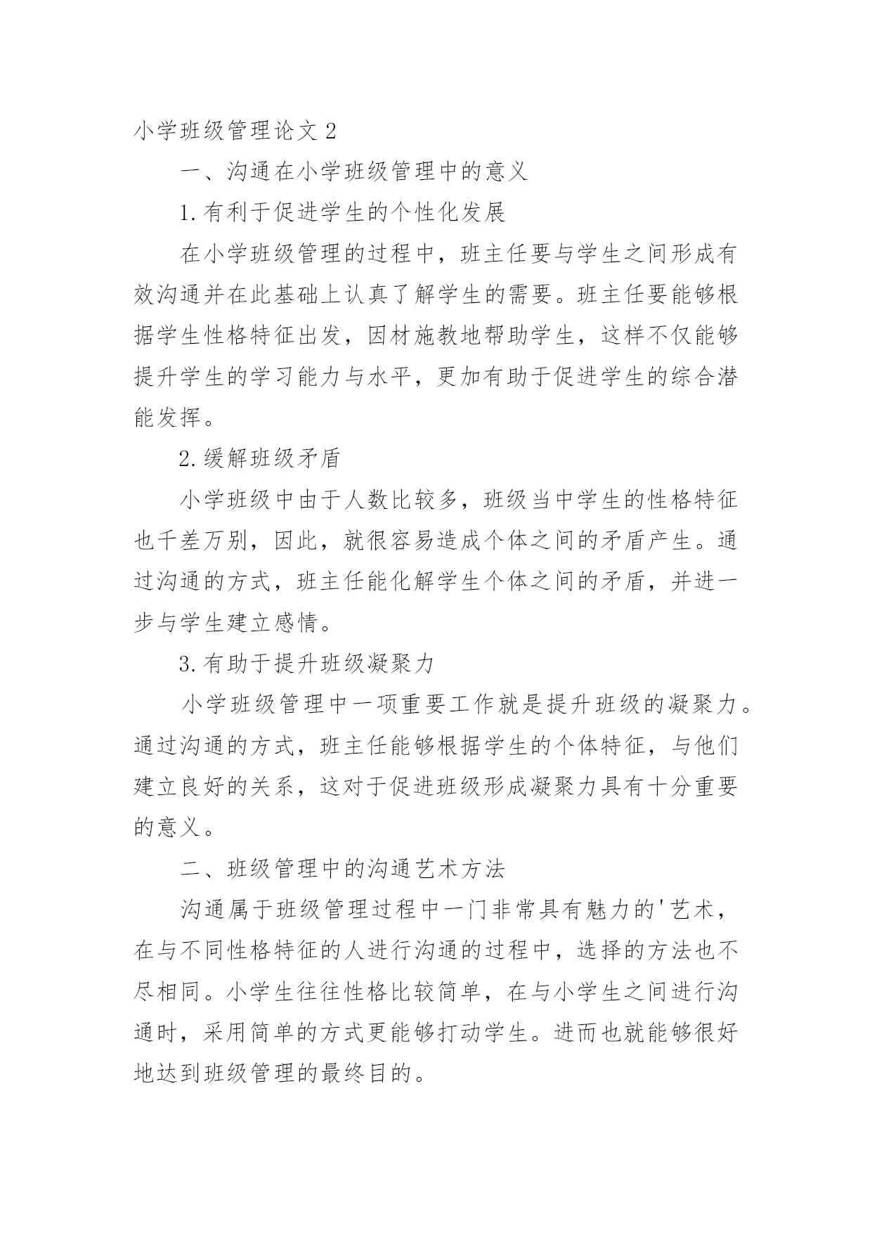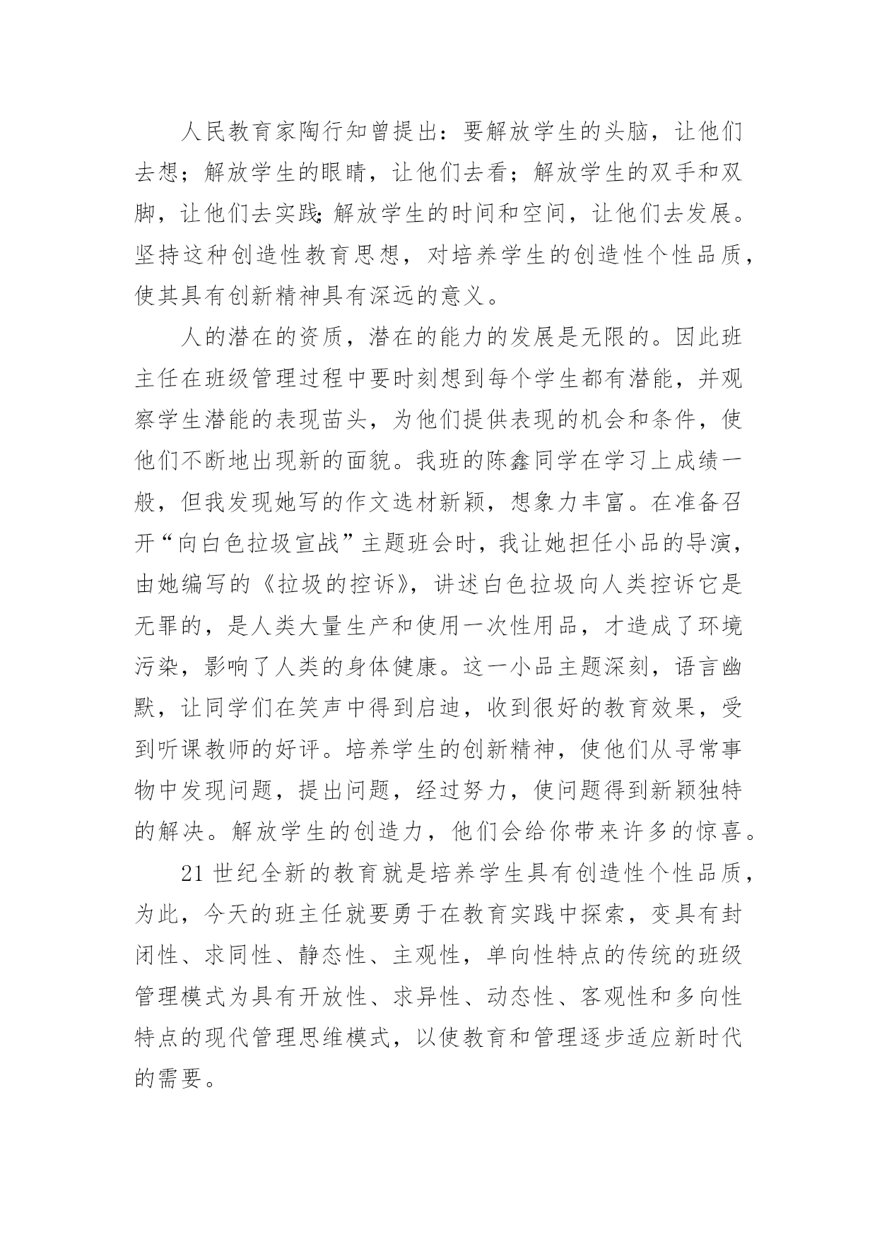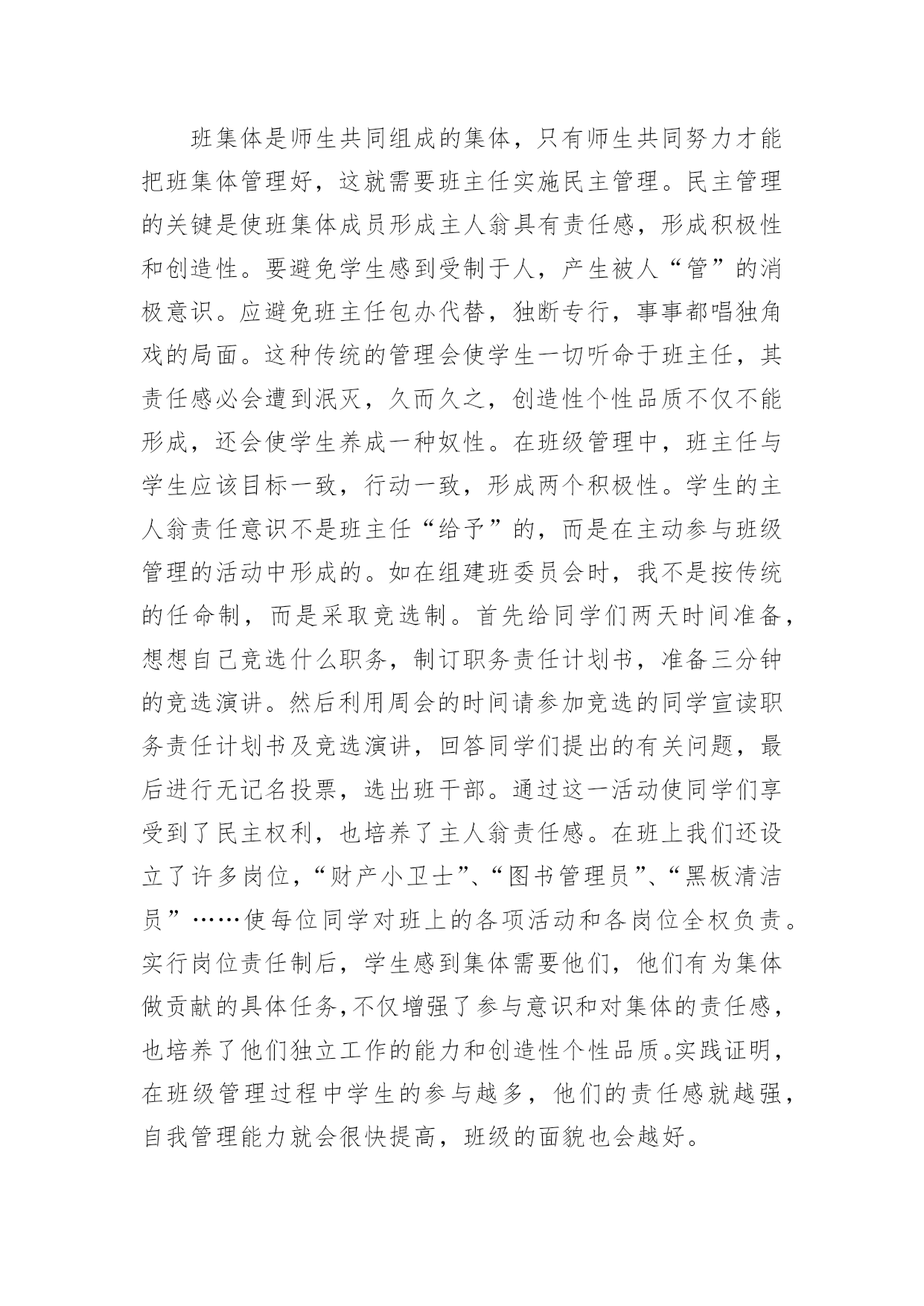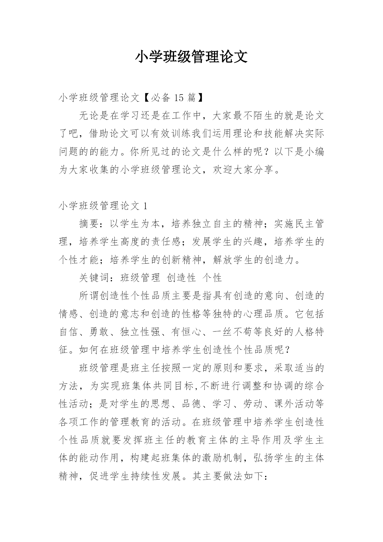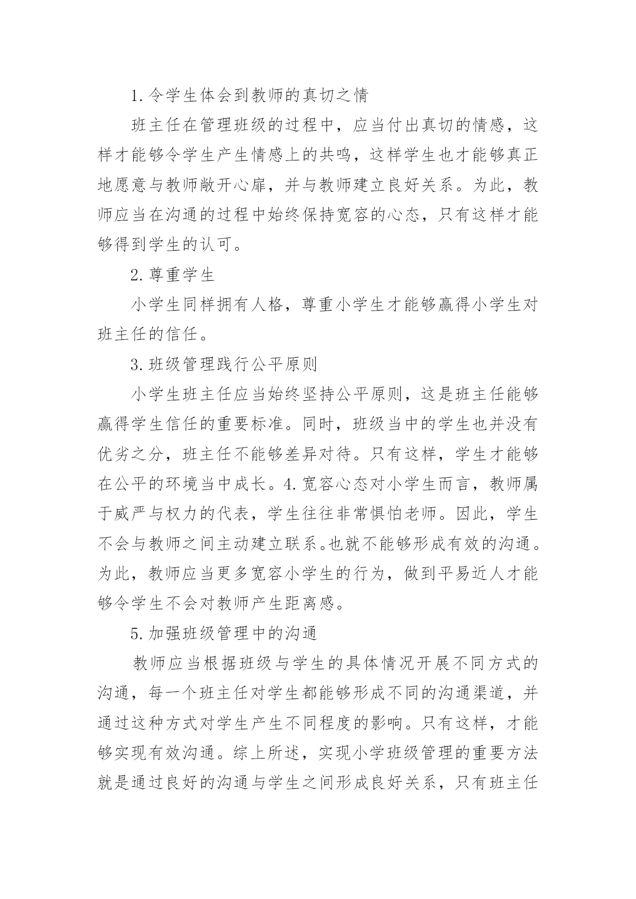 小学班级管理论文小学班级管理论文【必备15篇】无论是在学习还是在工作中,大家最不陌生的就是论文了吧,借助论文可以有效训练我们运用理论和技能解决实际问题的的能力。你所见过的论文是什么样的呢?以下是小编为大家收集的小学班级管理论文,欢迎大家分享。小学班级管理论文1摘要:以学生为本,培养独立自主的精神;实施民主管理,培养学生高度的责任感;发展学生的兴趣,培养学生的个性才能;培养学生的创新精神,解放学生的创造力。关键词:班级管理创造性个性所谓创造性个性品质主要是指具有创造的意向、创造的情感、创造的意志和创造的性格等独特的心理品质。它包括自信、勇敢、独立性强、有恒心、一丝不苟等良好的人格特征。如何在班级管理中培养学生创造性个性品质呢?班级管理是班主任按照一定的原则和要求,采取适当的方法,为实现班集体共同目标,不断进行调整和协调的综合性活动;是对学生的思想、品德、学习、劳动、课外活动等各项工作的管理教育的活动。在班级管理中培养学生创造性个性品质就要发挥班主任的教育主体的主导作用及学生主体的能动作用,构建起班集体的激励机制,弘扬学生的主体精神,促进学生持续性发展。其主要做法如下:一、以学生为本,培养独立自主的精神没有人的独立性和自主性就没有个性。教育家陶行知说:“最好的教育是教学生自己做自己的先生。”传统的班级管理中经常出现见“事”不见“人”,以“事”为本,是教师强制管理的弊病。这种班级管理是让学生服从于“事”,顺应于“活动”,把自主和有活力的人,僵化为按“号令”行动的一种工具。“听命”和“顺从”成为学生在班级管理中的基本状况,学生的自主性和创造性是无法充分表现的,学生的个性特点是很难显现的,培养创造性的个性品质也就成了空话。要培养学生创造性个性品质就必须坚持以人为本,鼓励学生积极主动参与班级管理,真正成为班级管理的主人。众所周知,缺乏独立自主精神的人是不可能具有创造性个性品质的,因此在班级管理中关键是培养学生的独立自主精神。如开学初,我组织学生制订班规,每们同学都参与,提出自己的建议,通过集中制订出:“教师在与不在一个样,班主任课与课任课一个样”这两条班规。还在班主任的指导下,由学生干部带领全班同学制订和落实班级工作计划,并由学生及时验收计划的完成情况,认真填写各项工作计划完成情况记录表。还有我按组要求他们轮流布置板报,每月一期。版面安排,艺术插图均由同学自己设计,内容形式决不能雷同,应结合班内实际情况和学校重大活动进行编排。从班规的内容,工作计划落实记录表和内容丰富、形式多样的板报可以看出同学们具有的独立自主的精神。二、实施民主管理,培养学生高度的责任感班集体是师生共同组成的集体,只有师生共同努力才能把班集体管理好,这就需要班主任实施民主管理。民主管理的关键是使班集体成员形成主人翁具有责任感,形成积极性和创造性。要避免学生感到受制于人,产生被人“管”的消极意识。应避免班主任包办代替,独断专行,事事都唱独角戏的局面。这种传统的管理会使学生一切听命于班主任,其责任感必会遭到泯灭,久而久之,创造性个性品质不仅不能形成,还会使学生养成一种奴性。在班级管理中,班主任与学生应该目标一致,行动一致,形成两个积极性。学生的主人翁责任意识不是班主任“给予”的,而是在主动参与班级管理的活动中形成的。如在组建班委员会时,我不是按传统的任命制,而是采取竞选制。首先给同学们两天时间准备,想想自己竞选什么职务,制订职务责任计划书,准备三分钟的竞选演讲。然后利用周会的时间请参加竞选的同学宣读职务责任计划书及竞选演讲,回答同学们提出的有关问题,最后进行无记名投票,选出班干部。通过这一活动使同学们享受到了民主权利,也培养了主人翁责任感。在班上我们还设立了许多岗位,“财产小卫士”、“图书管理员”、“黑板清洁员”……使每位同学对班上的各项活动和各岗位全权负责。实行岗位责任制后,学生感到集体需要他们,他们有为集体做贡献的具体任务,不仅增强了参与意识和对集体的责任感,也培养了他们独立工作的能力和创造性个性品质。实践证明,在班级管理过程中学生的参与越多,他们的责任感就越强,自我管理能力就会很快提高,班级的面貌也会越好。三、发展学生的兴趣,培养学生的个性才能教育培养学生成才,兴趣是起点,是人发挥智慧和取得成功的动力。班主任在管理学生的过程中要熟知每个学生的兴趣,要帮助学生发展兴趣,这对他们的整体素质提高将起到积极作用。班主任要帮助教育学生把他们的`兴趣同奋斗目标结合起来,使兴趣在成长中发挥动力作用。为此,我鼓励学生参加学校组织的各项兴趣小组活动,在活动中培养学生的个性和特长。如我班的李鑫同学,喜欢书法,跟书法老师学习了一段时间后,由于太辛苦想半途而废。我了解这一情况后为其讲王献之刻苦练字的故事,鼓励他持之以恒。他接受了班主任的意见,经过坚持不懈的努力获得了“全国百名小书法家”的