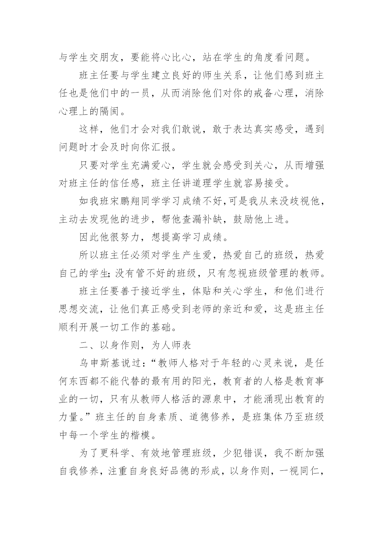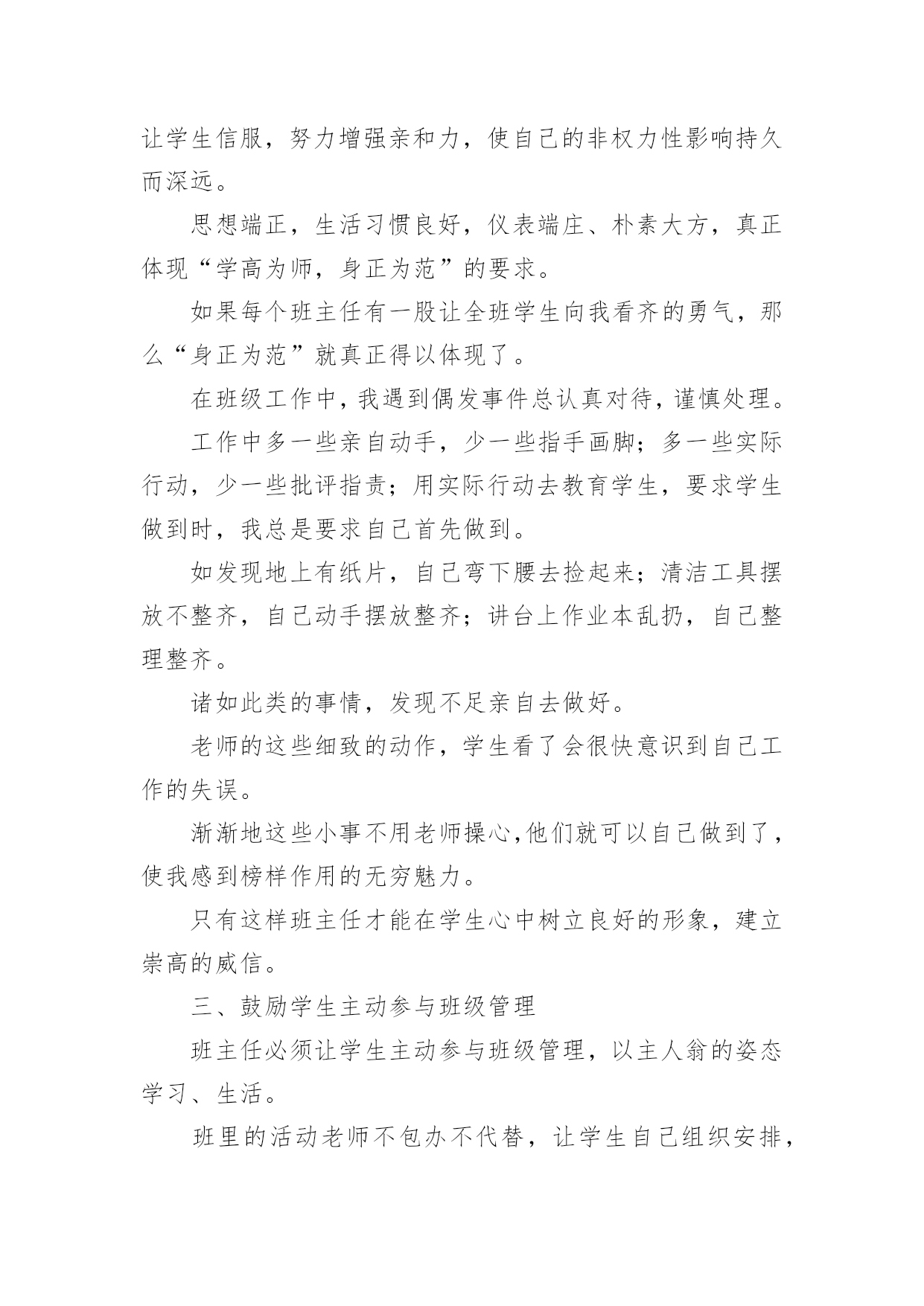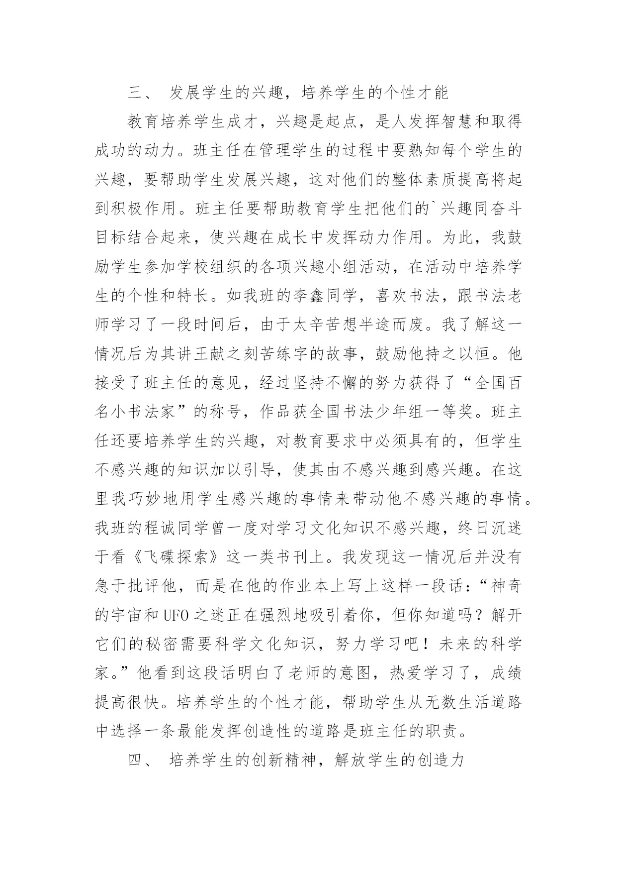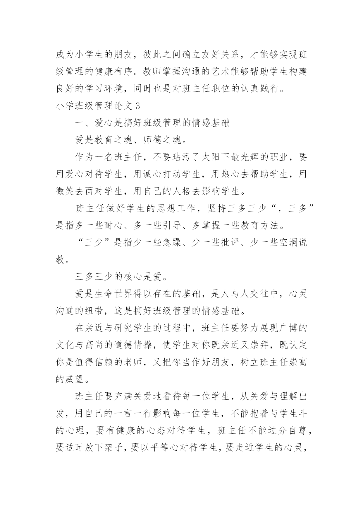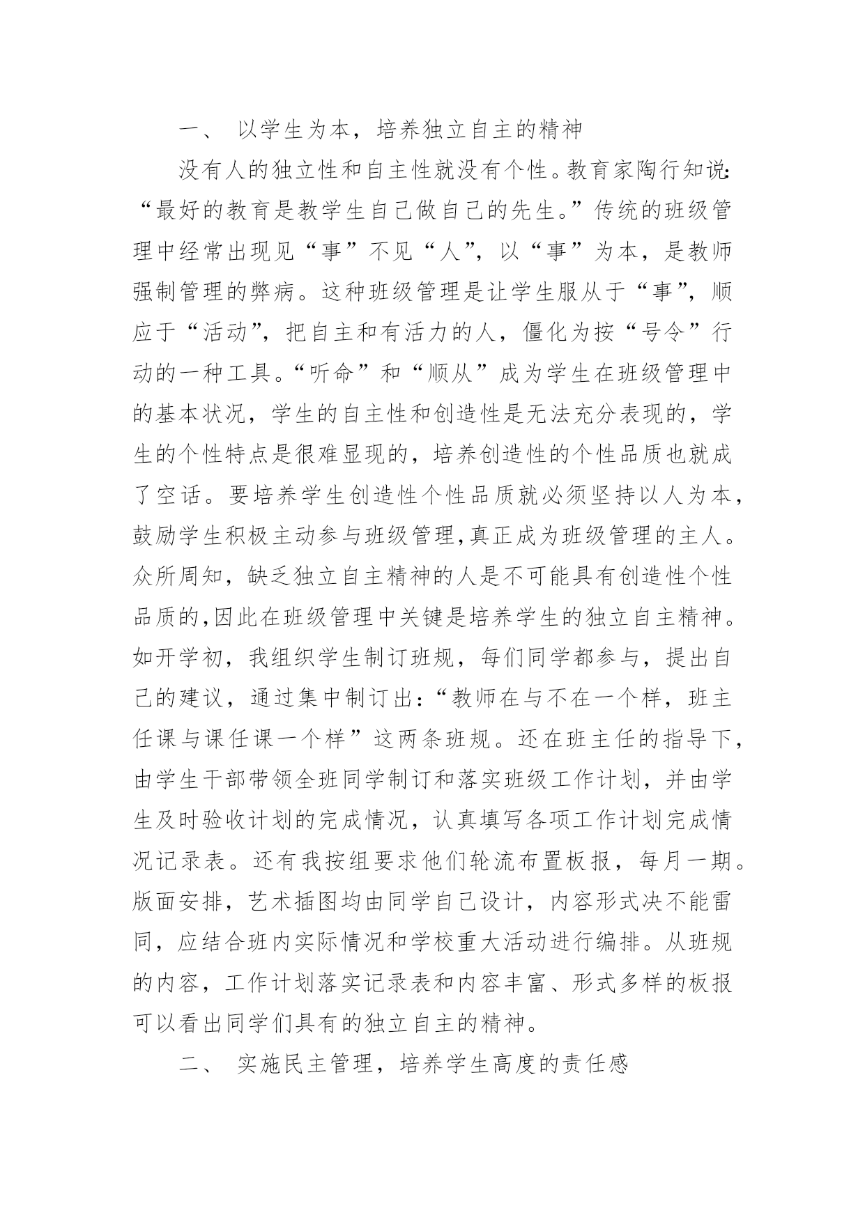 小学班级管理论文小学班级管理论文【必备15篇】无论是在学习还是在工作中,大家最不陌生的就是论文了吧,借助论文可以有效训练我们运用理论和技能解决实际问题的的能力。你所见过的论文是什么样的呢?以下是小编为大家收集的小学班级管理论文,欢迎大家分享。小学班级管理论文1摘要:以学生为本,培养独立自主的精神;实施民主管理,培养学生高度的责任感;发展学生的兴趣,培养学生的个性才能;培养学生的创新精神,解放学生的创造力。关键词:班级管理创造性个性所谓创造性个性品质主要是指具有创造的意向、创造的情感、创造的意志和创造的性格等独特的心理品质。它包括自信、勇敢、独立性强、有恒心、一丝不苟等良好的人格特征。如何在班级管理中培养学生创造性个性品质呢?班级管理是班主任按照一定的原则和要求,采取适当的方法,为实现班集体共同目标,不断进行调整和协调的综合性活动;是对学生的思想、品德、学习、劳动、课外活动等各项工作的管理教育的活动。在班级管理中培养学生创造性个性品质就要发挥班主任的教育主体的主导作用及学生主体的能动作用,构建起班集体的激励机制,弘扬学生的主体精神,促进学生持续性发展。其主要做法如下:一、以学生为本,培养独立自主的精神没有人的独立性和自主性就没有个性。教育家陶行知说:“最好的教育是教学生自己做自己的先生。”传统的班级管理中经常出现见“事”不见“人”,以“事”为本,是教师强制管理的弊病。这种班级管理是让学生服从于“事”,顺应于“活动”,把自主和有活力的人,僵化为按“号令”行动的一种工具。“听命”和“顺从”成为学生在班级管理中的基本状况,学生的自主性和创造性是无法充分表现的,学生的个性特点是很难显现的,培养创造性的个性品质也就成了空话。要培养学生创造性个性品质就必须坚持以人为本,鼓励学生积极主动参与班级管理,真正成为班级管理的主人。众所周知,缺乏独立自主精神的人是不可能具有创造性个性品质的,因此在班级管理中关键是培养学生的独立自主精神。如开学初,我组织学生制订班规,每们同学都参与,提出自己的建议,通过集中制订出:“教师在与不在一个样,班主任课与课任课一个样”这两条班规。还在班主任的指导下,由学生干部带领全班同学制订和落实班级工作计划,并由学生及时验收计划的完成情况,认真填写各项工作计划完成情况记录表。还有我按组要求他们轮流布置板报,每月一期。版面安排,艺术插图均由同学自己设计,内容形式决不能雷同,应结合班内实际情况和学校重大活动进行编排。从班规的内容,工作计划落实记录表和内容丰富、形式多样的板报可以看出同学们具有的独立自主的精神。二、实施民主管理,培养学生高度的责任感班集体是师生共同组成的集体,只有师生共同努力才能把班集体管理好,这就需要班主任实施民主管理。民主管理的关键是使班集体成员形成主人翁具有责任感,形成积极性和创造性。要避免学生感到受制于人,产生被人“管”的消极意识。应避免班主任包办代替,独断专行,事事都唱独角戏的局面。这种传统的管理会使学生一切听命于班主任,其责任感必会遭到泯灭,久而久之,创造性个性品质不仅不能形成,还会使学生养成一种奴性。在班级管理中,班主任与学生应该目标一致,行动一致,形成两个积极性。学生的主人翁责任意识不是班主任“给予”的,而是在主动参与班级管理的活动中形成的。如在组建班委员会时,我不是按传统的任命制,而是采取竞选制。首先给同学们两天时间准备,想想自己竞选什么职务,制订职务责任计划书,准备三分钟的竞选演讲。然后利用周会的时间请参加竞选的同学宣读职务责任计划书及竞选演讲,回答同学们提出的有关问题,最后进行无记名投票,选出班干部。通过这一活动使同学们享受到了民主权利,也培养了主人翁责任感。在班上我们还设立了许多岗位,“财产小卫士”、“图书管理员”、“黑板清洁员”……使每位同学对班上的各项活动和各岗位全权负责。实行岗位责任制后,学生感到集体需要他们,他们有为集体做贡献的具体任务,不仅增强了参与意识和对集体的责任感,也培养了他们独立工作的能力和创造性个性品质。实践证明,在班级管理过程中学生的参与越多,他们的责任感就越强,自我管理能力就会很快提高,班级的面貌也会越好。三、发展学生的兴趣,培养学生的个性才能教育培养学生成才,兴趣是起点,是人发挥智慧和取得成功的动力。班主任在管理学生的过程中要熟知每个学生的兴趣,要帮助学生发展兴趣,这对他们的整体素质提高将起到积极作用。班主任要帮助教育学生把他们的`兴趣同奋斗目标结合起来,使兴趣在成长中发挥动力作用。为此,我鼓励学生参加学校组织的各项兴趣小组活动,在活动中培养学生的个性和特长。如我班的李鑫同学,喜欢书法,跟书法老师学习了一段时间后,由于太辛苦想半途而废。我了解这一情况后为其讲王献之刻苦练字的故事,鼓励他持之以恒。他接受了班主任的意见,经过坚持不懈的努力获得了“全国百名小书法家”的
