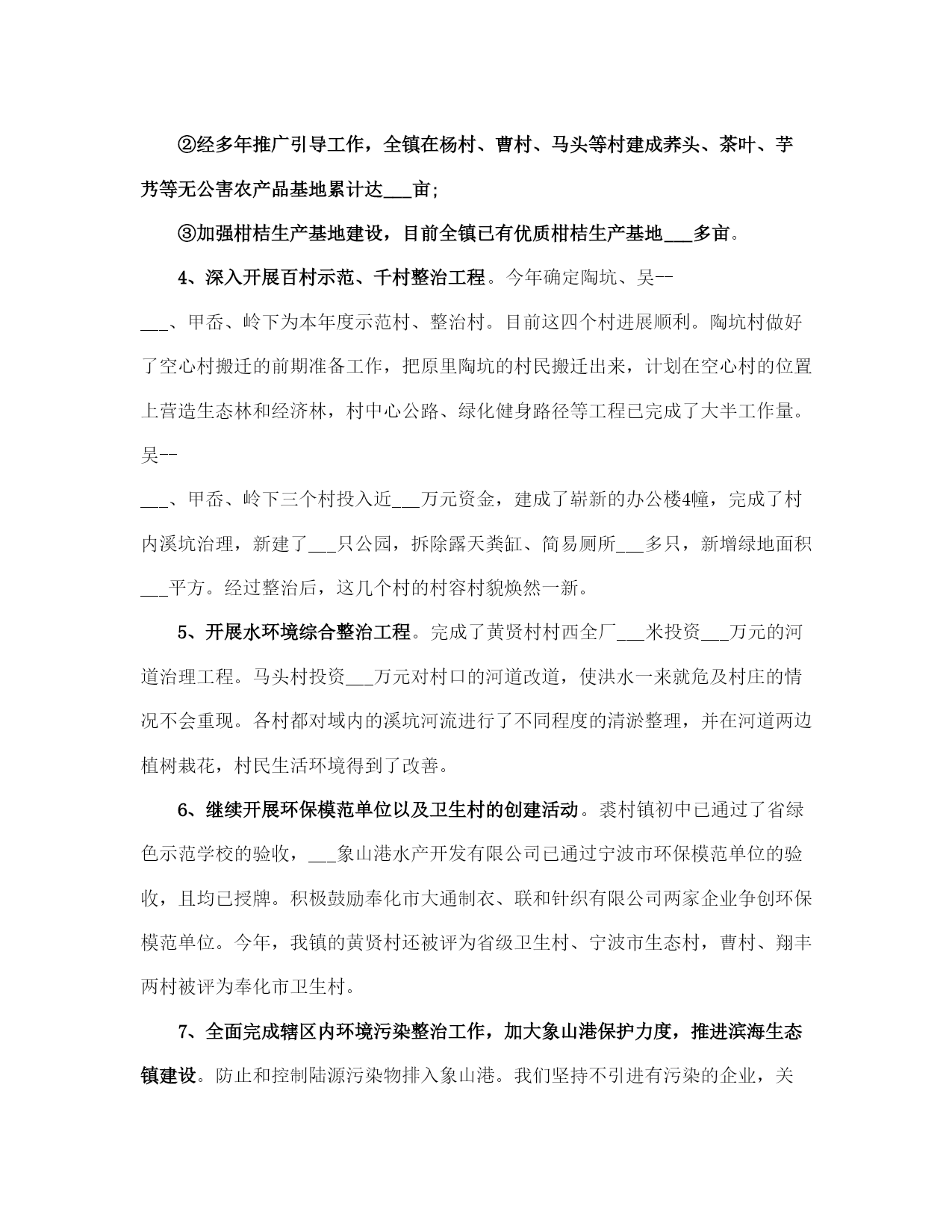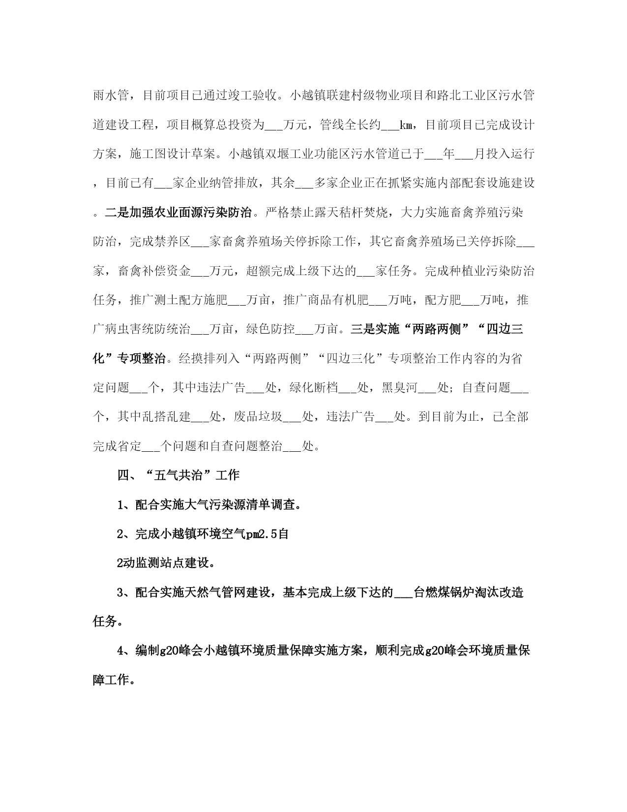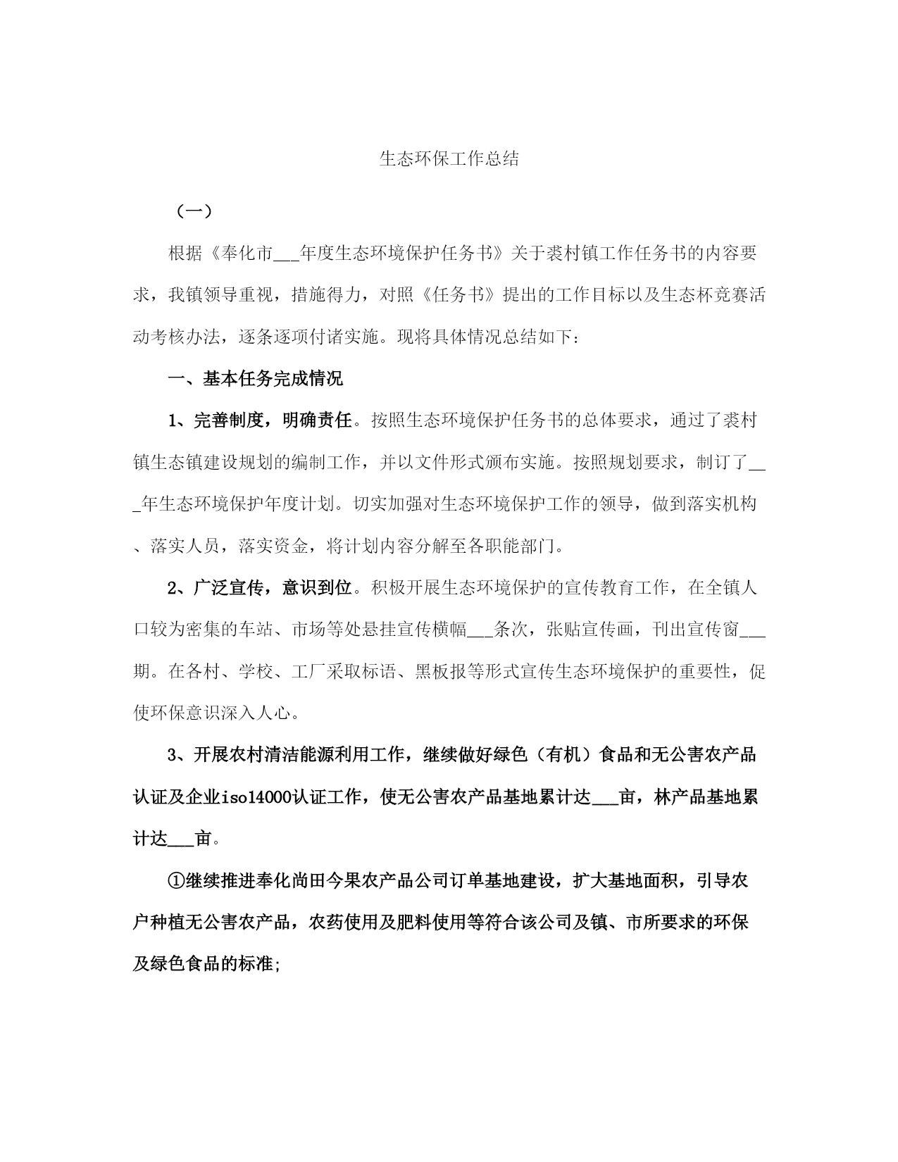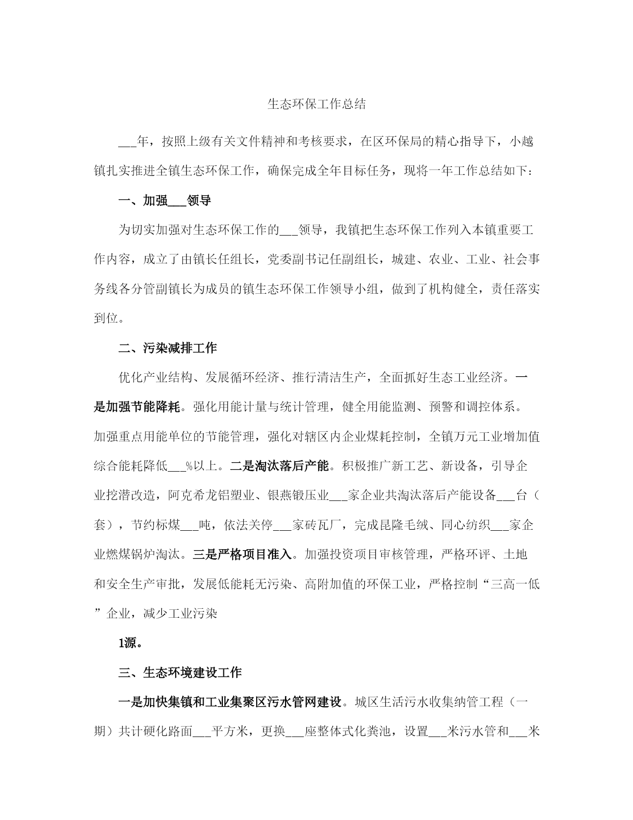 生态环保工作总结范本(完整版)文档资料可直接使用,可编辑,欢迎下载生态环保工作总结___年,按照上级有关文件精神和考核要求,在区环保局的精心指导下,小越镇扎实推进全镇生态环保工作,确保完成全年目标任务,现将一年工作总结如下:一、加强___领导为切实加强对生态环保工作的___领导,我镇把生态环保工作列入本镇重要工作内容,成立了由镇长任组长,党委副书记任副组长,城建、农业、工业、社会事务线各分管副镇长为成员的镇生态环保工作领导小组,做到了机构健全,责任落实到位。二、污染减排工作优化产业结构、发展循环经济、推行清洁生产,全面抓好生态工业经济。一是加强节能降耗。强化用能计量与统计管理,健全用能监测、预警和调控体系。加强重点用能单位的节能管理,强化对辖区内企业煤耗控制,全镇万元工业增加值综合能耗降低___%以上。二是淘汰落后产能。积极推广新工艺、新设备,引导企业挖潜改造,阿克希龙铝塑业、银燕锻压业___家企业共淘汰落后产能设备___台(套),节约标煤___吨,依法关停___家砖瓦厂,完成昆隆毛绒、同心纺织___家企业燃煤锅炉淘汰。三是严格项目准入。加强投资项目审核管理,严格环评、土地和安全生产审批,发展低能耗无污染、高附加值的环保工业,严格控制“三高一低”企业,减少工业污染1源。三、生态环境建设工作一是加快集镇和工业集聚区污水管网建设。城区生活污水收集纳管工程(一期)共计硬化路面___平方米,更换___座整体式化粪池,设置___米污水管和___米雨水管,目前项目已通过竣工验收。小越镇联建村级物业项目和路北工业区污水管道建设工程,项目概算总投资为___万元,管线全长约___km,目前项目已完成设计方案,施工图设计草案。小越镇双堰工业功能区污水管道已于___年___月投入运行,目前已有___家企业纳管排放,其余___多家企业正在抓紧实施内部配套设施建设。二是加强农业面源污染防治。严格禁止露天秸杆焚烧,大力实施畜禽养殖污染防治,完成禁养区___家畜禽养殖场关停拆除工作,其它畜禽养殖场已关停拆除___家,畜禽补偿资金___万元,超额完成上级下达的___家任务。完成种植业污染防治任务,推广测土配方施肥___万亩,推广商品有机肥___万吨,配方肥___万吨,推广病虫害统防统治___万亩,绿色防控___万亩。三是实施“两路两侧”“四边三化”专项整治。经摸排列入“两路两侧”“四边三化”专项整治工作内容的为省定问题___个,其中违法广告___处,绿化断档___处,黑臭河___处;自查问题___个,其中乱搭乱建___处,废品垃圾___处,违法广告___处。到目前为止,已全部完成省定___个问题和自查问题整治___处。四、“五气共治”工作1、配合实施大气污染源清单调查。2、完成小越镇环境空气pm2.5自2动监测站点建设。3、配合实施天然气管网建设,基本完成上级下达的___台燃煤锅炉淘汰改造任务。4、编制g20峰会小越镇环境质量保障实施方案,顺利完成g20峰会环境质量保障工作。5、严格执行印染企业废气特别排放限值要求,完成___理想同济工程机械有限公司、上虞市舜立塑业有限公司、上虞市小越镇顺发化纤加工厂___个工业挥发性有机废气(vocs)治理项目。6、淘汰落后产能,完成卡氟龙涂料、嘉利盛助剂___家化工企业关停,佑谦特种材料、佳华精化和蓝邦家纺___家化工、印染产业改造提升年度任务。7、推进工地扬尘污染控制,强化建设工程项目施工现场扬尘管理。8、强化道路扬尘治理,进一步加大镇区道路洒水的范围和频次,减少扬尘产生。9、实施绿化工程,完成___国道、五五线小越段绿化改造提升工程。10、开展“绿色混凝土搅拌站”建设,上虞区永固混凝土有限公司搅拌站基本达到“绿色混凝土搅拌站”标准。11、建立长效监管制度,控制餐饮油烟,取缔露天烧烤。12、加强巡查监管,禁止露天焚烧秸秆,露天焚烧生活垃圾、工业边角料等废弃物。13、加极大气污染环境监管执法力度,严厉打击各类环境违法行为。五、生态文明宣传工作充分利用各种宣传平台和渠道,广泛宣传,倡导绿色文明的生活方式,形成人人参与生态文明建设的浓厚氛围,进一步提高生态建设的公众知晓率和生态环境质量公众满意度。___年工作思路:要围绕上级关于生态环保工作的各项工作任务和要求,突出重3点,狠抓落实。1、要加快循环经济建设,促进产业结构优化升级,推广清洁生产和绿色经济。3、要深入推进重点区域、重点行业和重点企业的污染治理、进一步加强节能降耗、淘汰落后产能,落实减排措施,全面改善生态环境质量。3、要继续加___力度,扎实开展生态村、生态文明教育基地、绿色家庭、绿色学校等生态绿色系列创建活动。生态环保工作总结(一)根据《奉化市___年度生态环境保护任务书》关于裘村镇工作任务书的