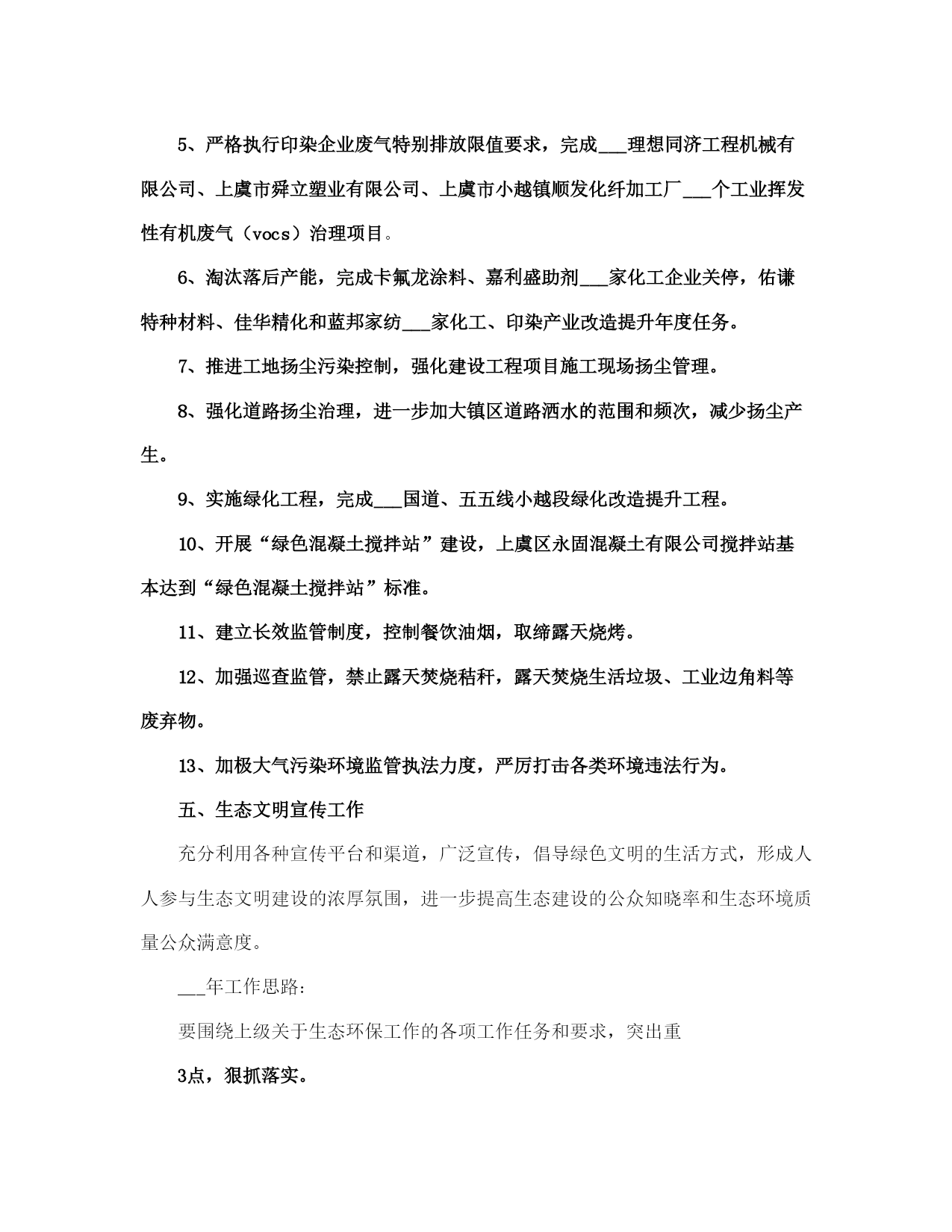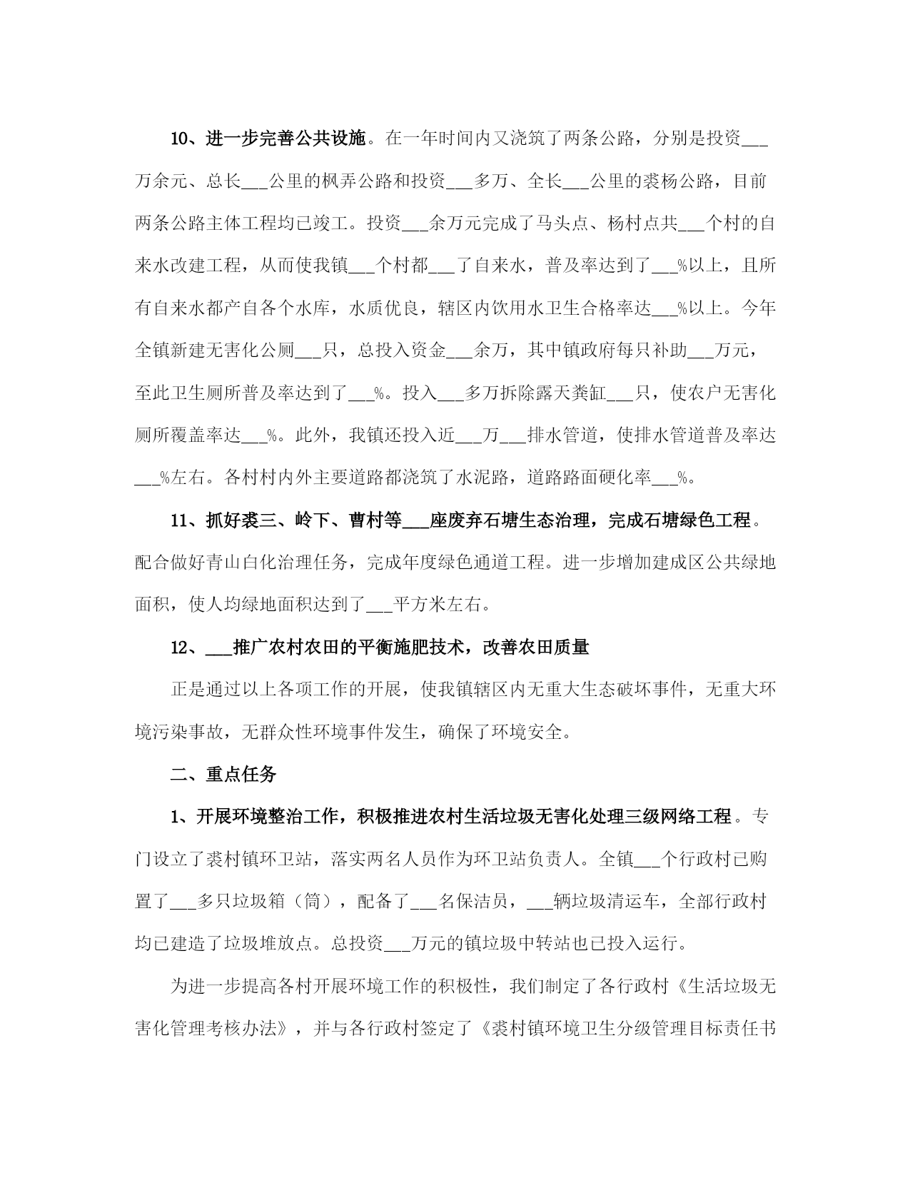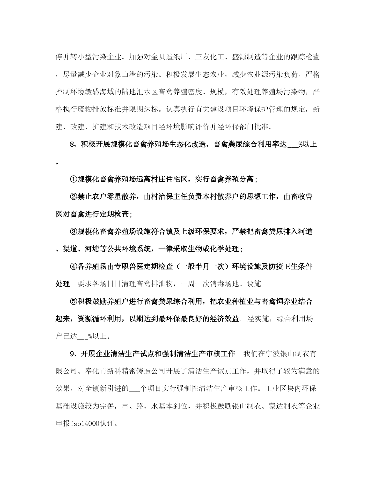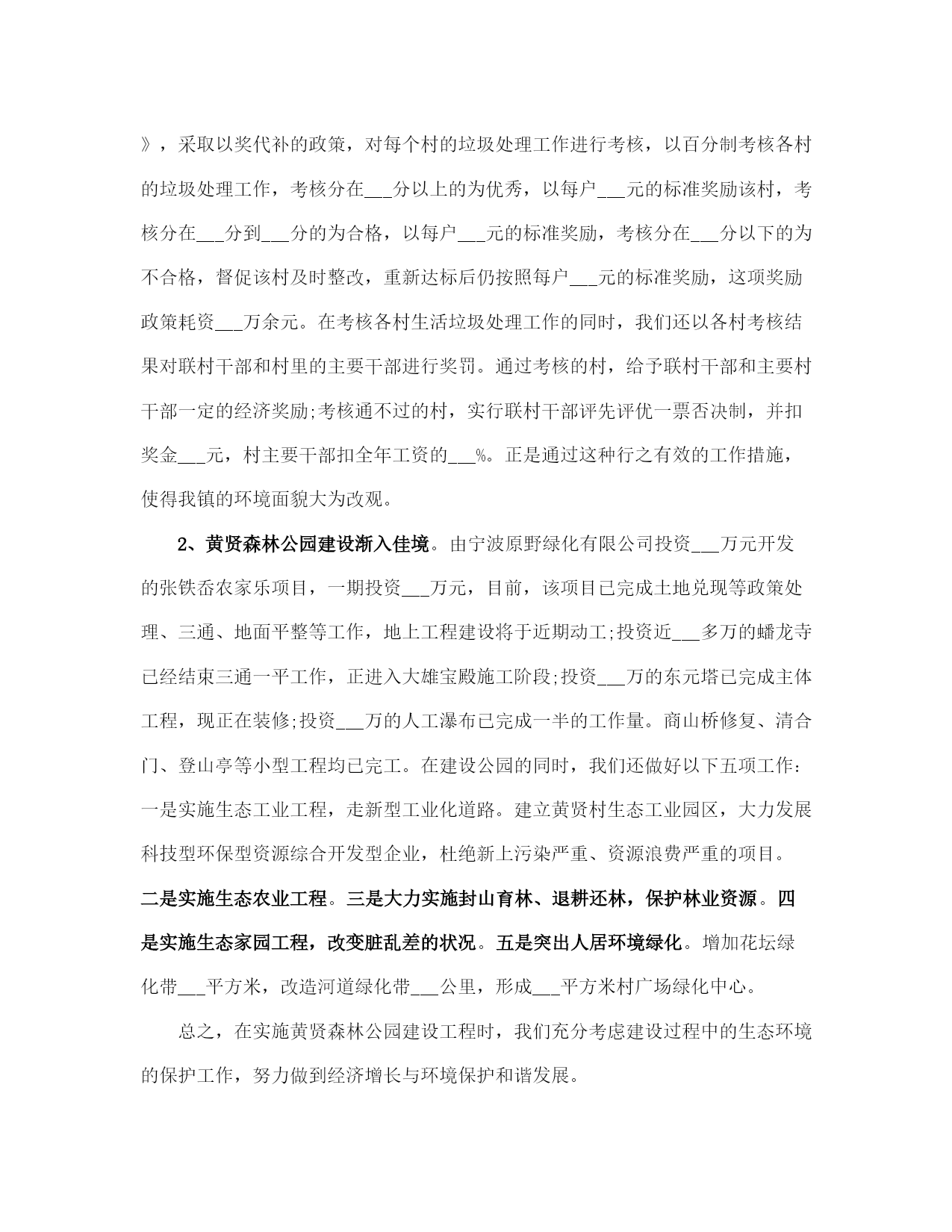 生态环保工作总结范本(完整版)文档资料可直接使用,可编辑,欢迎下载生态环保工作总结___年,按照上级有关文件精神和考核要求,在区环保局的精心指导下,小越镇扎实推进全镇生态环保工作,确保完成全年目标任务,现将一年工作总结如下:一、加强___领导为切实加强对生态环保工作的___领导,我镇把生态环保工作列入本镇重要工作内容,成立了由镇长任组长,党委副书记任副组长,城建、农业、工业、社会事务线各分管副镇长为成员的镇生态环保工作领导小组,做到了机构健全,责任落实到位。二、污染减排工作优化产业结构、发展循环经济、推行清洁生产,全面抓好生态工业经济。一是加强节能降耗。强化用能计量与统计管理,健全用能监测、预警和调控体系。加强重点用能单位的节能管理,强化对辖区内企业煤耗控制,全镇万元工业增加值综合能耗降低___%以上。二是淘汰落后产能。积极推广新工艺、新设备,引导企业挖潜改造,阿克希龙铝塑业、银燕锻压业___家企业共淘汰落后产能设备___台(套),节约标煤___吨,依法关停___家砖瓦厂,完成昆隆毛绒、同心纺织___家企业燃煤锅炉淘汰。三是严格项目准入。加强投资项目审核管理,严格环评、土地和安全生产审批,发展低能耗无污染、高附加值的环保工业,严格控制“三高一低”企业,减少工业污染1源。三、生态环境建设工作一是加快集镇和工业集聚区污水管网建设。城区生活污水收集纳管工程(一期)共计硬化路面___平方米,更换___座整体式化粪池,设置___米污水管和___米雨水管,目前项目已通过竣工验收。小越镇联建村级物业项目和路北工业区污水管道建设工程,项目概算总投资为___万元,管线全长约___km,目前项目已完成设计方案,施工图设计草案。小越镇双堰工业功能区污水管道已于___年___月投入运行,目前已有___家企业纳管排放,其余___多家企业正在抓紧实施内部配套设施建设。二是加强农业面源污染防治。严格禁止露天秸杆焚烧,大力实施畜禽养殖污染防治,完成禁养区___家畜禽养殖场关停拆除工作,其它畜禽养殖场已关停拆除___家,畜禽补偿资金___万元,超额完成上级下达的___家任务。完成种植业污染防治任务,推广测土配方施肥___万亩,推广商品有机肥___万吨,配方肥___万吨,推广病虫害统防统治___万亩,绿色防控___万亩。三是实施“两路两侧”“四边三化”专项整治。经摸排列入“两路两侧”“四边三化”专项整治工作内容的为省定问题___个,其中违法广告___处,绿化断档___处,黑臭河___处;自查问题___个,其中乱搭乱建___处,废品垃圾___处,违法广告___处。到目前为止,已全部完成省定___个问题和自查问题整治___处。四、“五气共治”工作1、配合实施大气污染源清单调查。2、完成小越镇环境空气pm2.5自2动监测站点建设。3、配合实施天然气管网建设,基本完成上级下达的___台燃煤锅炉淘汰改造任务。4、编制g20峰会小越镇环境质量保障实施方案,顺利完成g20峰会环境质量保障工作。5、严格执行印染企业废气特别排放限值要求,完成___理想同济工程机械有限公司、上虞市舜立塑业有限公司、上虞市小越镇顺发化纤加工厂___个工业挥发性有机废气(vocs)治理项目。6、淘汰落后产能,完成卡氟龙涂料、嘉利盛助剂___家化工企业关停,佑谦特种材料、佳华精化和蓝邦家纺___家化工、印染产业改造提升年度任务。7、推进工地扬尘污染控制,强化建设工程项目施工现场扬尘管理。8、强化道路扬尘治理,进一步加大镇区道路洒水的范围和频次,减少扬尘产生。9、实施绿化工程,完成___国道、五五线小越段绿化改造提升工程。10、开展“绿色混凝土搅拌站”建设,上虞区永固混凝土有限公司搅拌站基本达到“绿色混凝土搅拌站”标准。11、建立长效监管制度,控制餐饮油烟,取缔露天烧烤。12、加强巡查监管,禁止露天焚烧秸秆,露天焚烧生活垃圾、工业边角料等废弃物。13、加极大气污染环境监管执法力度,严厉打击各类环境违法行为。五、生态文明宣传工作充分利用各种宣传平台和渠道,广泛宣传,倡导绿色文明的生活方式,形成人人参与生态文明建设的浓厚氛围,进一步提高生态建设的公众知晓率和生态环境质量公众满意度。___年工作思路:要围绕上级关于生态环保工作的各项工作任务和要求,突出重3点,狠抓落实。1、要加快循环经济建设,促进产业结构优化升级,推广清洁生产和绿色经济。3、要深入推进重点区域、重点行业和重点企业的污染治理、进一步加强节能降耗、淘汰落后产能,落实减排措施,全面改善生态环境质量。3、要继续加___力度,扎实开展生态村、生态文明教育基地、绿色家庭、绿色学校等生态绿色系列创建活动。生态环保工作总结(一)根据《奉化市___年度生态环境保护任务书》关于裘村镇工作任务书的