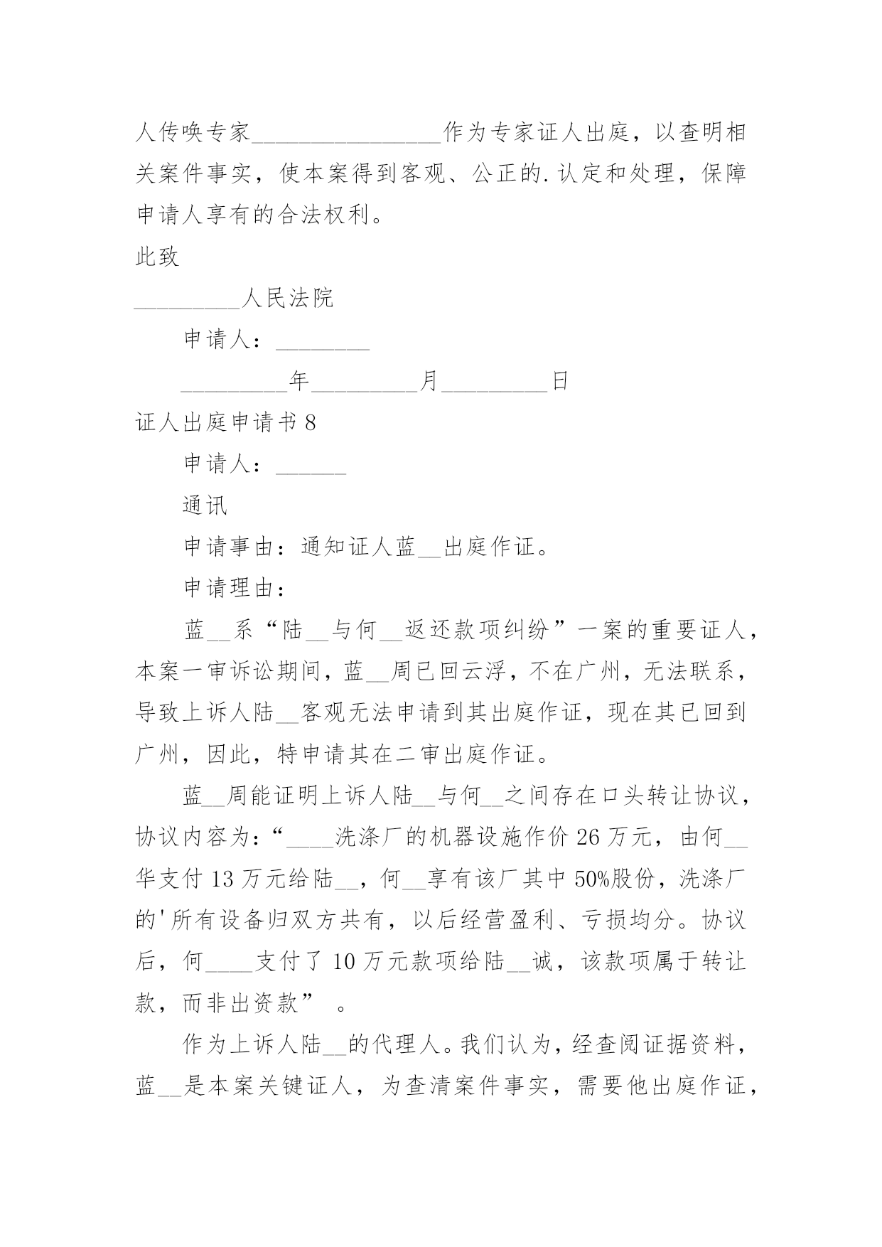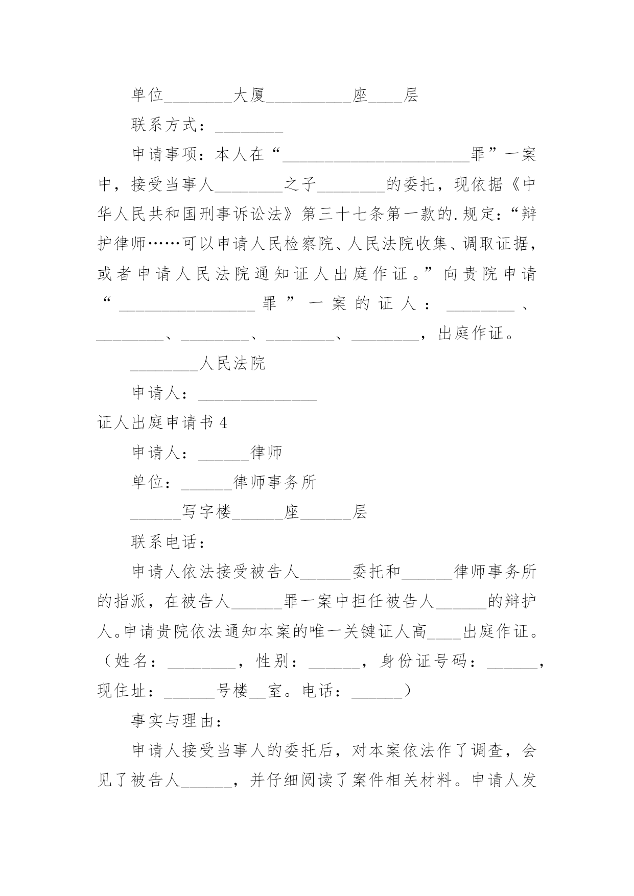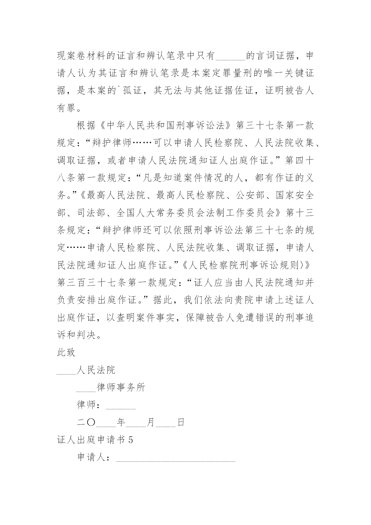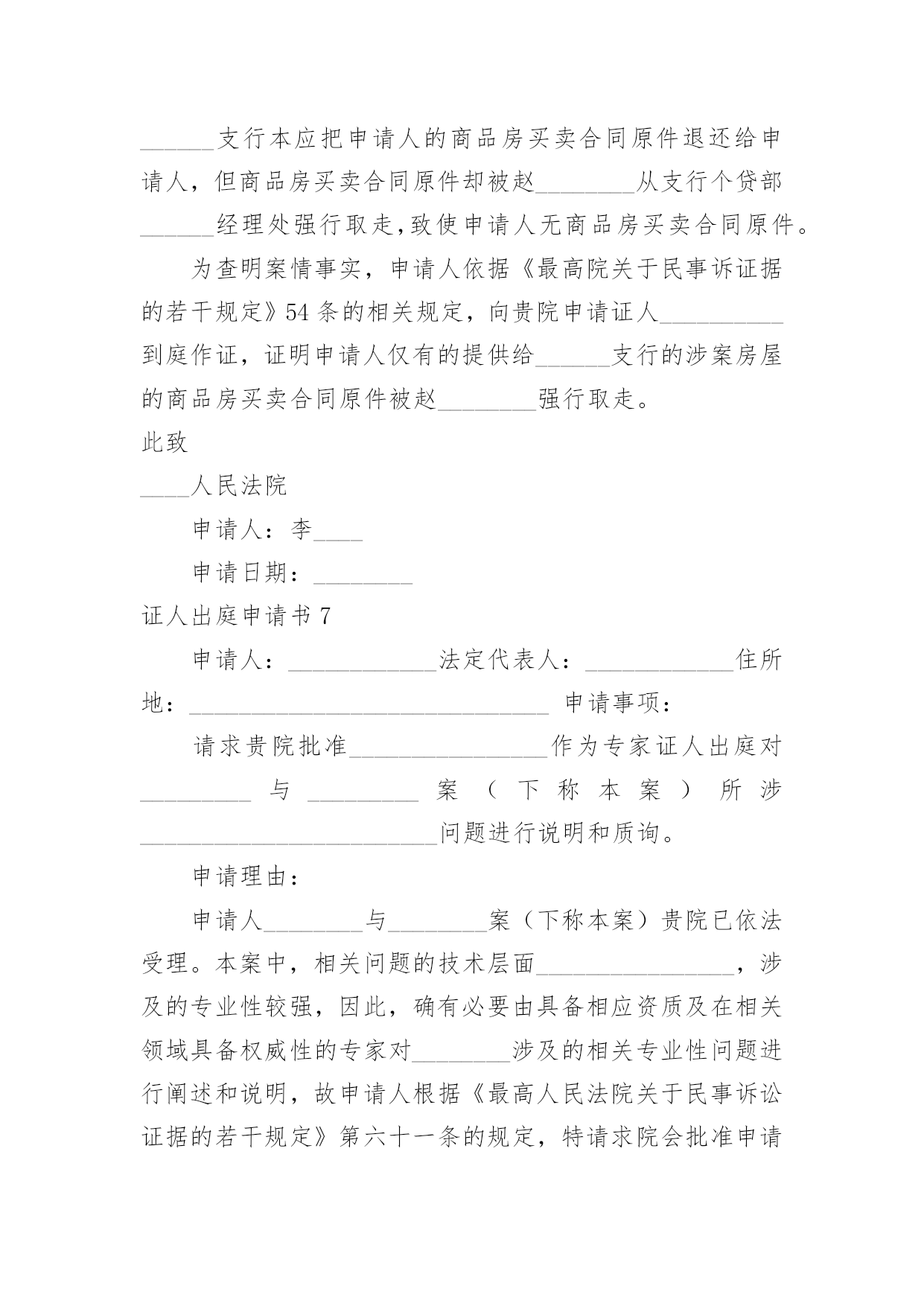 证人出庭申请书证人出庭申请书在当今社会生活中,申请书在生活中的使用越来越广泛,请注意不同的对象有不同的申请书。为了让您在写申请书中更加简单方便,以下是小编帮大家整理的证人出庭申请书,欢迎大家分享。证人出庭申请书1章丘市人民法院:____申请追加我作为________等四原告诉其道路交通事故损害赔偿案的共同被告,我业已收悉贵院的《参加诉讼通知书》及____月____日9:00的.开庭传票。为了查明案情,还原事实真相,我申请________、________二人届时出庭作证,以证明事故发生经过及抢救情况,敬请准许。申请人:__________________年____月____日证人出庭申请书2申请人:_________________________住所:____________________________法定代表人:_________________职务:____________________________请求事项:________________________________________请求跟贵院准许申请人聘请的专家对司法鉴定所出具《司法鉴定意见书》提出专业意见。事实与理由:_________________________________________________在诉我公司纠纷一案中,申请人根据《中华人民共和国民事诉讼法》之规定,聘请该方面专家出庭就司法鉴定人作出的鉴定意见及专业问题提出专业意见,请求准许。此致人民法院申请人:____________________年________月________日附专家名单:_____________________________________工作单位:____________________________________________身份证号________________________________________________联系电话:_____________________________________________住址:________________________________________________________证人出庭申请书3申请人:________单位:________律师事务所单位________大厦__________座____层联系方式:________申请事项:本人在“______________________罪”一案中,接受当事人________之子________的委托,现依据《中华人民共和国刑事诉讼法》第三十七条第一款的.规定:“辩护律师……可以申请人民检察院、人民法院收集、调取证据,或者申请人民法院通知证人出庭作证。”向贵院申请“________________罪”一案的证人:________、________、________、________、________,出庭作证。________人民法院申请人:______________证人出庭申请书4申请人:______律师单位:______律师事务所______写字楼______座______层联系电话:申请人依法接受被告人______委托和______律师事务所的指派,在被告人______罪一案中担任被告人______的辩护人。申请贵院依法通知本案的唯一关键证人高____出庭作证。(姓名:________,性别:______,身份证号码:______,现住址:______号楼__室。电话:______)事实与理由:申请人接受当事人的委托后,对本案依法作了调查,会见了被告人______,并仔细阅读了案件相关材料。申请人发现案卷材料的证言和辨认笔录中只有______的言词证据,申请人认为其证言和辨认笔录是本案定罪量刑的唯一关键证据,是本案的`孤证,其无法与其他证据佐证,证明被告人有罪。根据《中华人民共和国刑事诉讼法》第三十七条第一款规定:“辩护律师……可以申请人民检察院、人民法院收集、调取证据,或者申请人民法院通知证人出庭作证。”第四十八条第一款规定:“凡是知道案件情况的人,都有作证的义务。”《最高人民法院、最高人民检察院、公安部、国家安全部、司法部、全国人大常务委员会法制工作委员会》第十三条规定:“辩护律师还可以依照刑事诉讼法第三十七条的规定……申请人民检察院、人民法院收集、调取证据,申请人民法院通知证人出庭作证。”《人民检察院刑事诉讼规则〉》第三百三十七条第一款规定:“证人应当由人民法院通知并负责安排出庭作证。”据此,我们依法向贵院申请上述证人出庭作证,以查明案件事实,保障被告人免遭错误的刑事追诉和判决。此致____人民法院____律师事务所律师:______二〇____年____月____日证人出庭申请书5申请人:___________