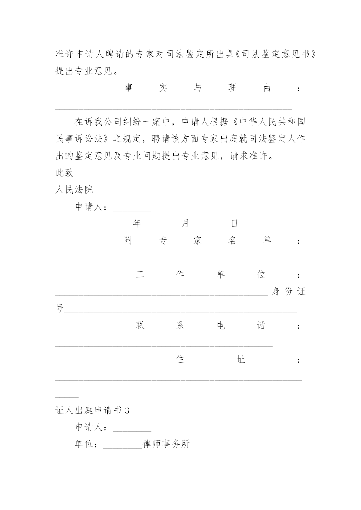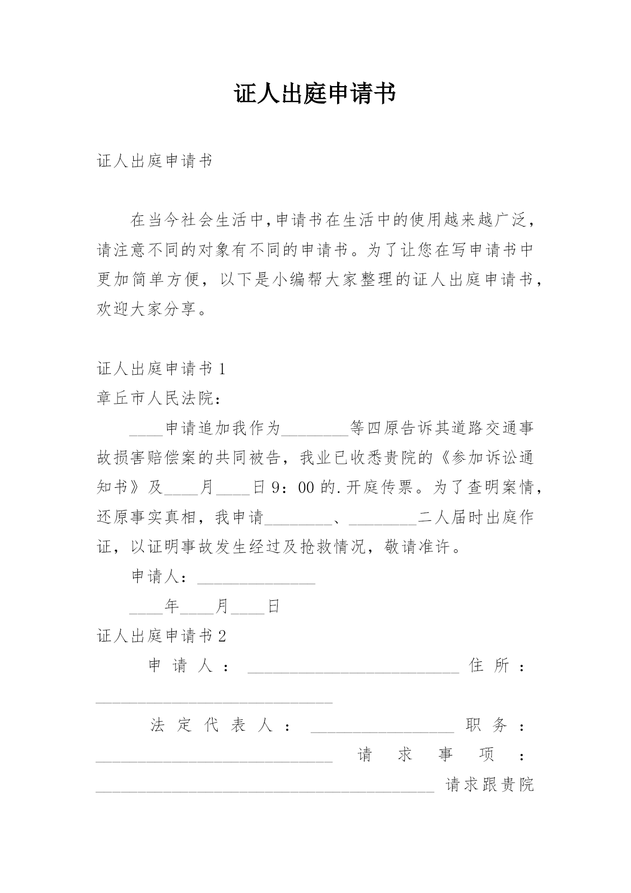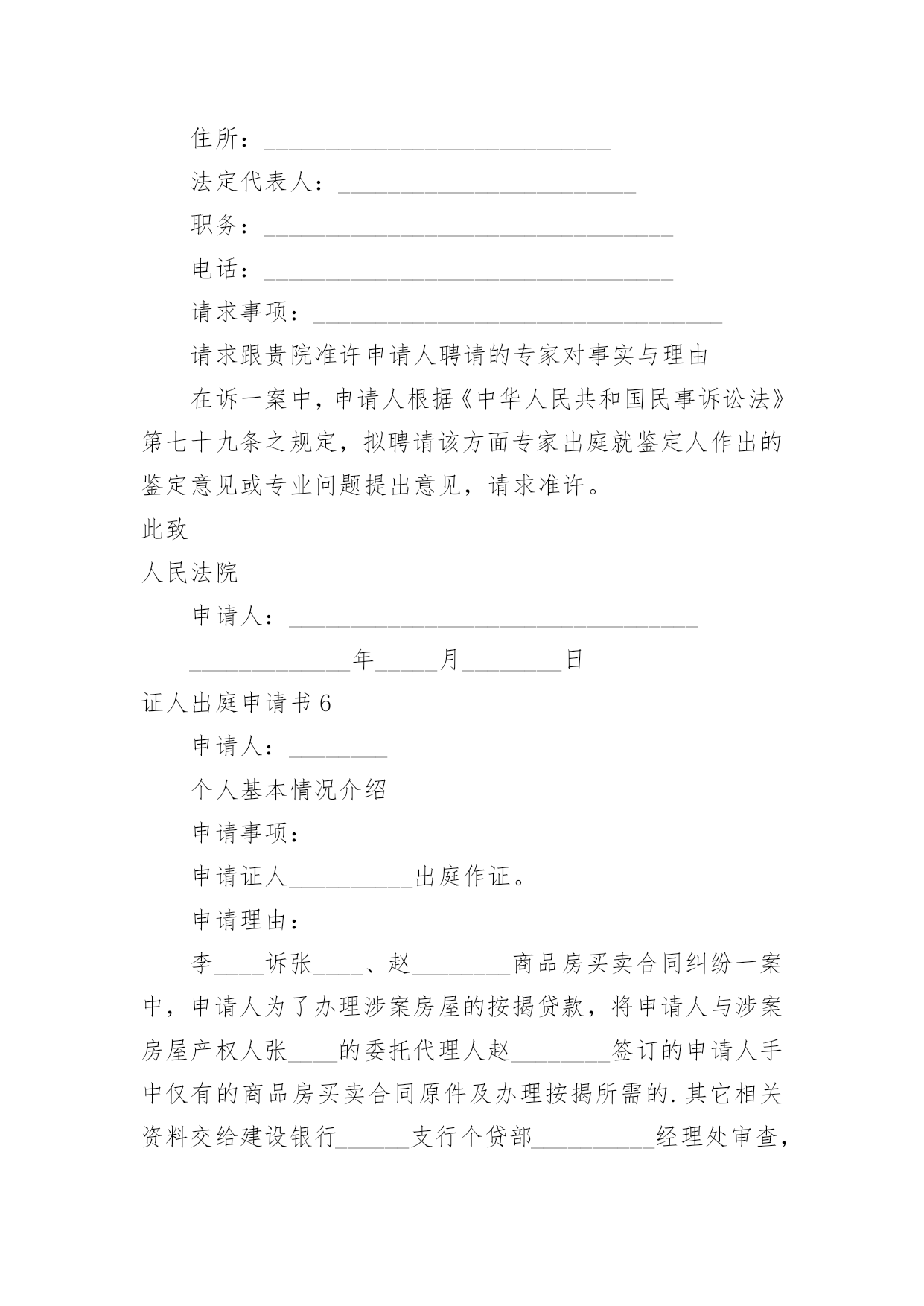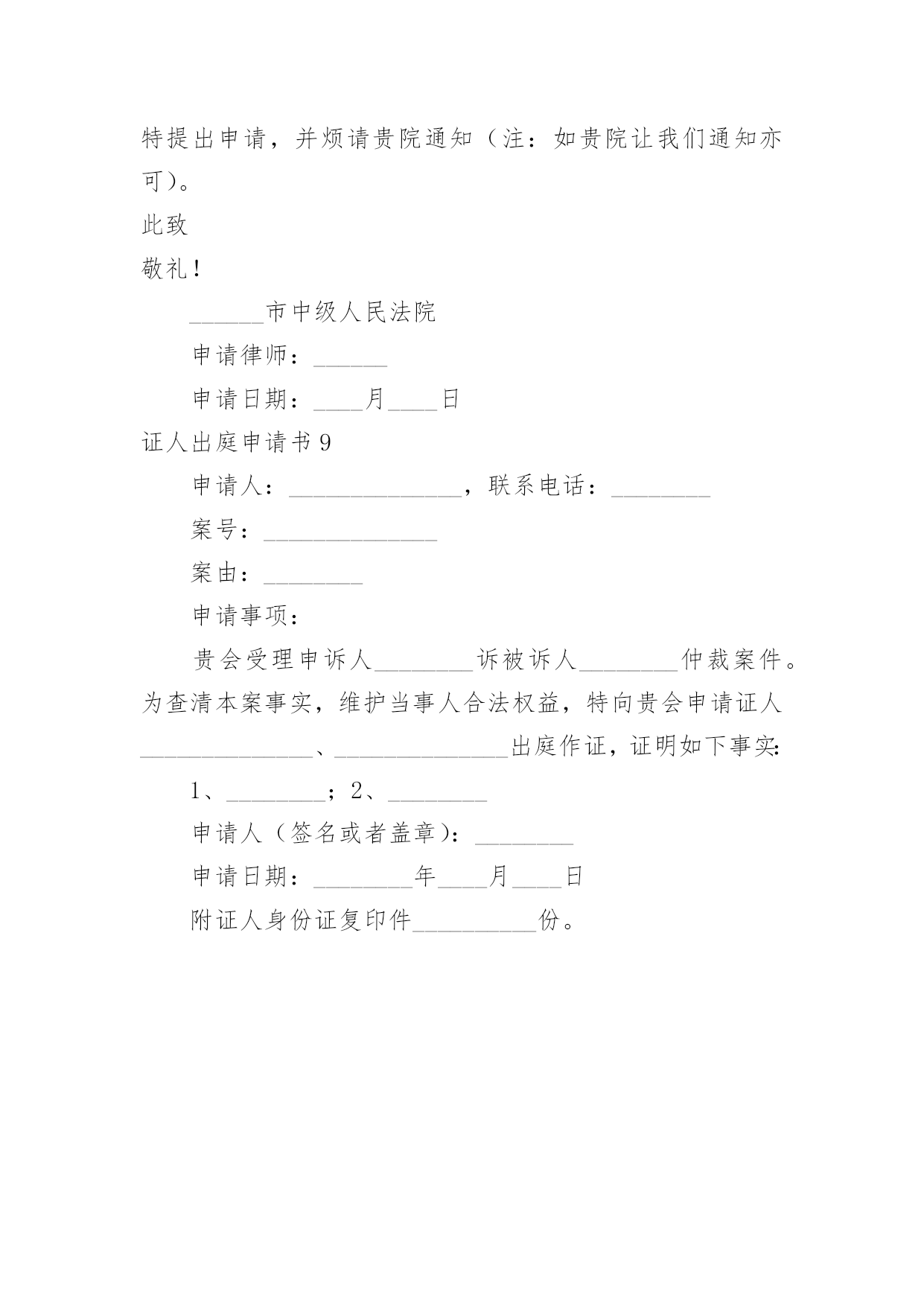 证人出庭申请书证人出庭申请书在当今社会生活中,申请书在生活中的使用越来越广泛,请注意不同的对象有不同的申请书。为了让您在写申请书中更加简单方便,以下是小编帮大家整理的证人出庭申请书,欢迎大家分享。证人出庭申请书1章丘市人民法院:____申请追加我作为________等四原告诉其道路交通事故损害赔偿案的共同被告,我业已收悉贵院的《参加诉讼通知书》及____月____日9:00的.开庭传票。为了查明案情,还原事实真相,我申请________、________二人届时出庭作证,以证明事故发生经过及抢救情况,敬请准许。申请人:__________________年____月____日证人出庭申请书2申请人:_________________________住所:____________________________法定代表人:_________________职务:____________________________请求事项:________________________________________请求跟贵院准许申请人聘请的专家对司法鉴定所出具《司法鉴定意见书》提出专业意见。事实与理由:_________________________________________________在诉我公司纠纷一案中,申请人根据《中华人民共和国民事诉讼法》之规定,聘请该方面专家出庭就司法鉴定人作出的鉴定意见及专业问题提出专业意见,请求准许。此致人民法院申请人:____________________年________月________日附专家名单:_____________________________________工作单位:____________________________________________身份证号________________________________________________联系电话:_____________________________________________住址:________________________________________________________证人出庭申请书3申请人:________单位:________律师事务所单位________大厦__________座____层联系方式:________申请事项:本人在“______________________罪”一案中,接受当事人________之子________的委托,现依据《中华人民共和国刑事诉讼法》第三十七条第一款的.规定:“辩护律师……可以申请人民检察院、人民法院收集、调取证据,或者申请人民法院通知证人出庭作证。”向贵院申请“________________罪”一案的证人:________、________、________、________、________,出庭作证。________人民法院申请人:______________证人出庭申请书4申请人:______律师单位:______律师事务所______写字楼______座______层联系电话:申请人依法接受被告人______委托和______律师事务所的指派,在被告人______罪一案中担任被告人______的辩护人。申请贵院依法通知本案的唯一关键证人高____出庭作证。(姓名:________,性别:______,身份证号码:______,现住址:______号楼__室。电话:______)事实与理由:申请人接受当事人的委托后,对本案依法作了调查,会见了被告人______,并仔细阅读了案件相关材料。申请人发现案卷材料的证言和辨认笔录中只有______的言词证据,申请人认为其证言和辨认笔录是本案定罪量刑的唯一关键证据,是本案的`孤证,其无法与其他证据佐证,证明被告人有罪。根据《中华人民共和国刑事诉讼法》第三十七条第一款规定:“辩护律师……可以申请人民检察院、人民法院收集、调取证据,或者申请人民法院通知证人出庭作证。”第四十八条第一款规定:“凡是知道案件情况的人,都有作证的义务。”《最高人民法院、最高人民检察院、公安部、国家安全部、司法部、全国人大常务委员会法制工作委员会》第十三条规定:“辩护律师还可以依照刑事诉讼法第三十七条的规定……申请人民检察院、人民法院收集、调取证据,申请人民法院通知证人出庭作证。”《人民检察院刑事诉讼规则〉》第三百三十七条第一款规定:“证人应当由人民法院通知并负责安排出庭作证。”据此,我们依法向贵院申请上述证人出庭作证,以查明案件事实,保障被告人免遭错误的刑事追诉和判决。此致____人民法院____律师事务所律师:______二〇____年____月____日证人出庭申请书5申请人:___________