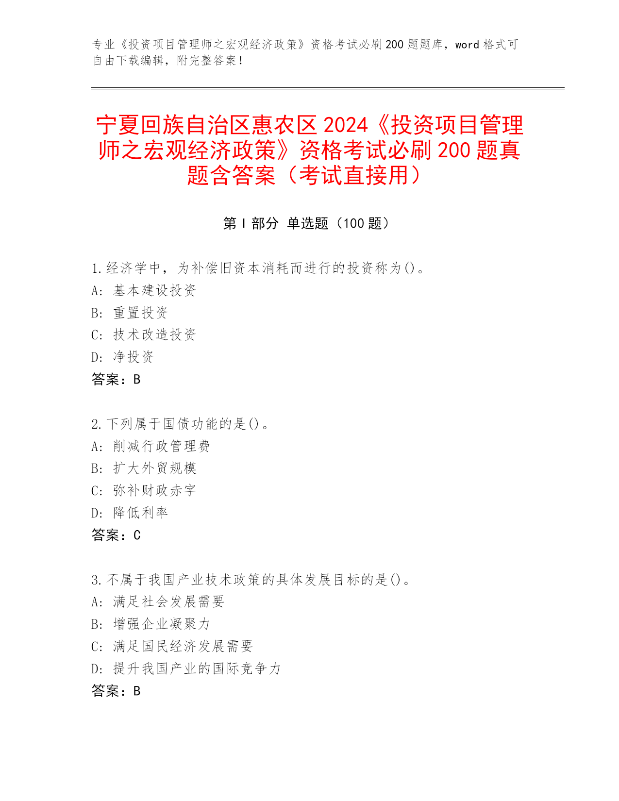 宁夏回族自治区惠农区2024《投资项目管理师之宏观经济政策》资格考试必刷200题真题含答案(考试直接用)