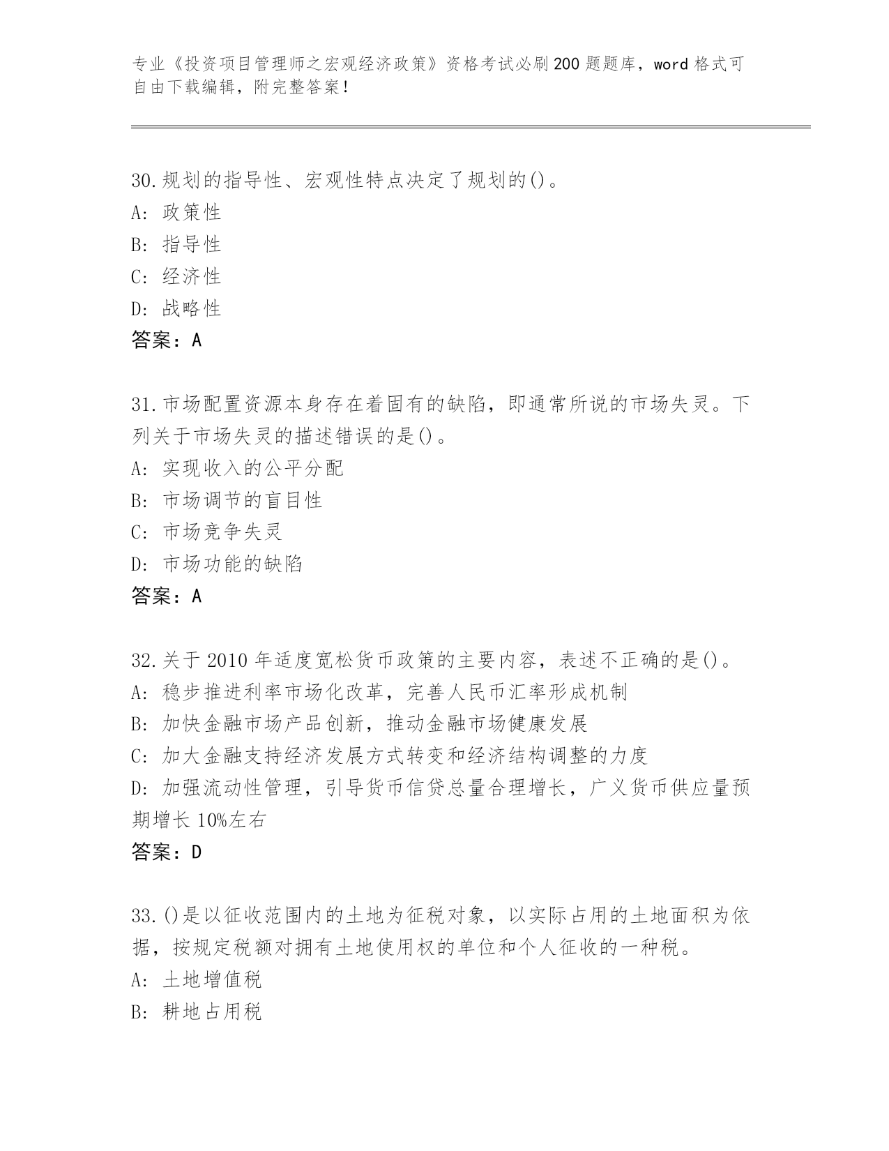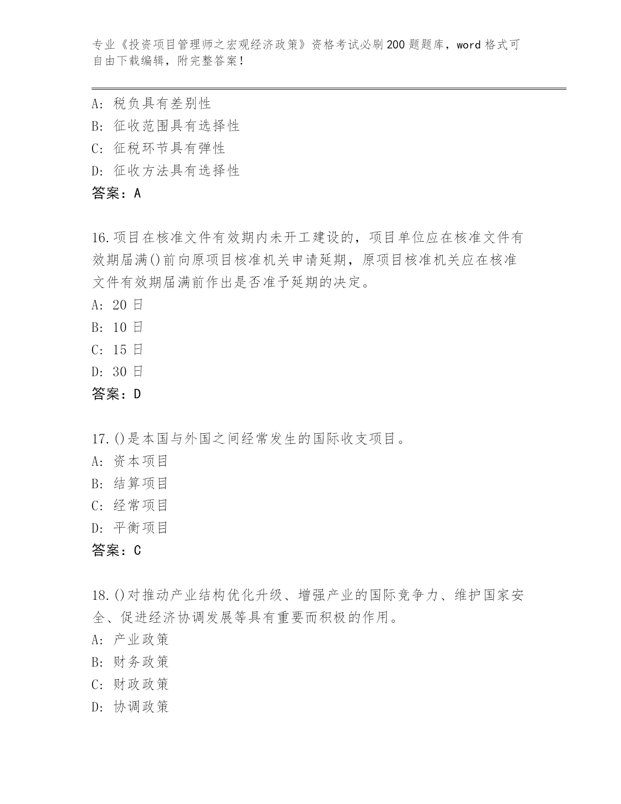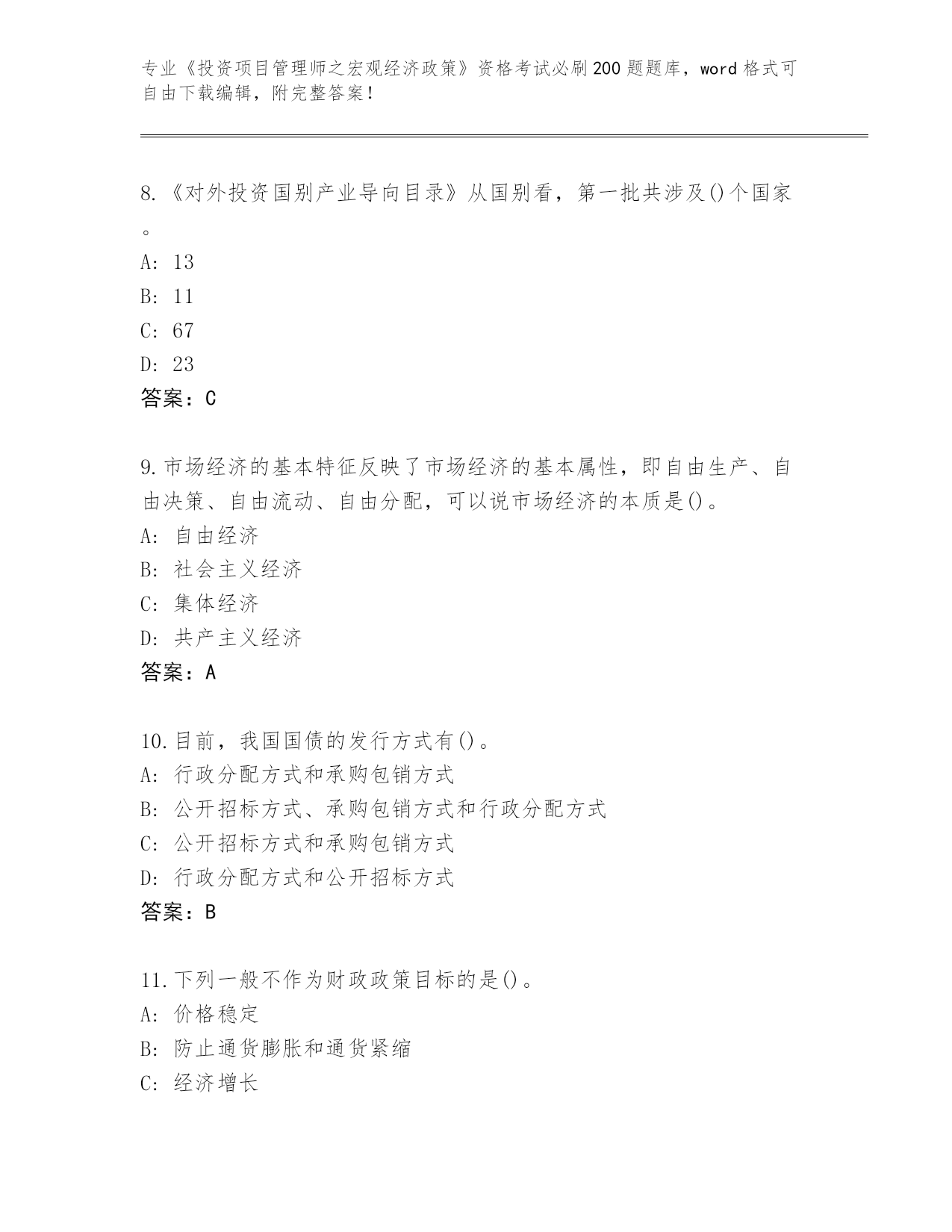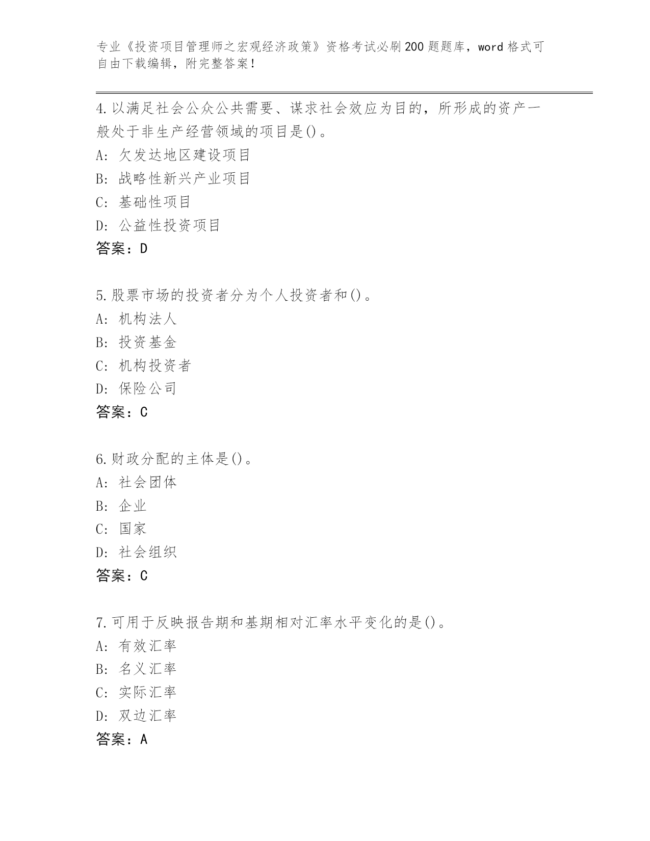 甘肃省礼县《投资项目管理师之宏观经济政策》资格考试必刷200题真题(考试直接用)