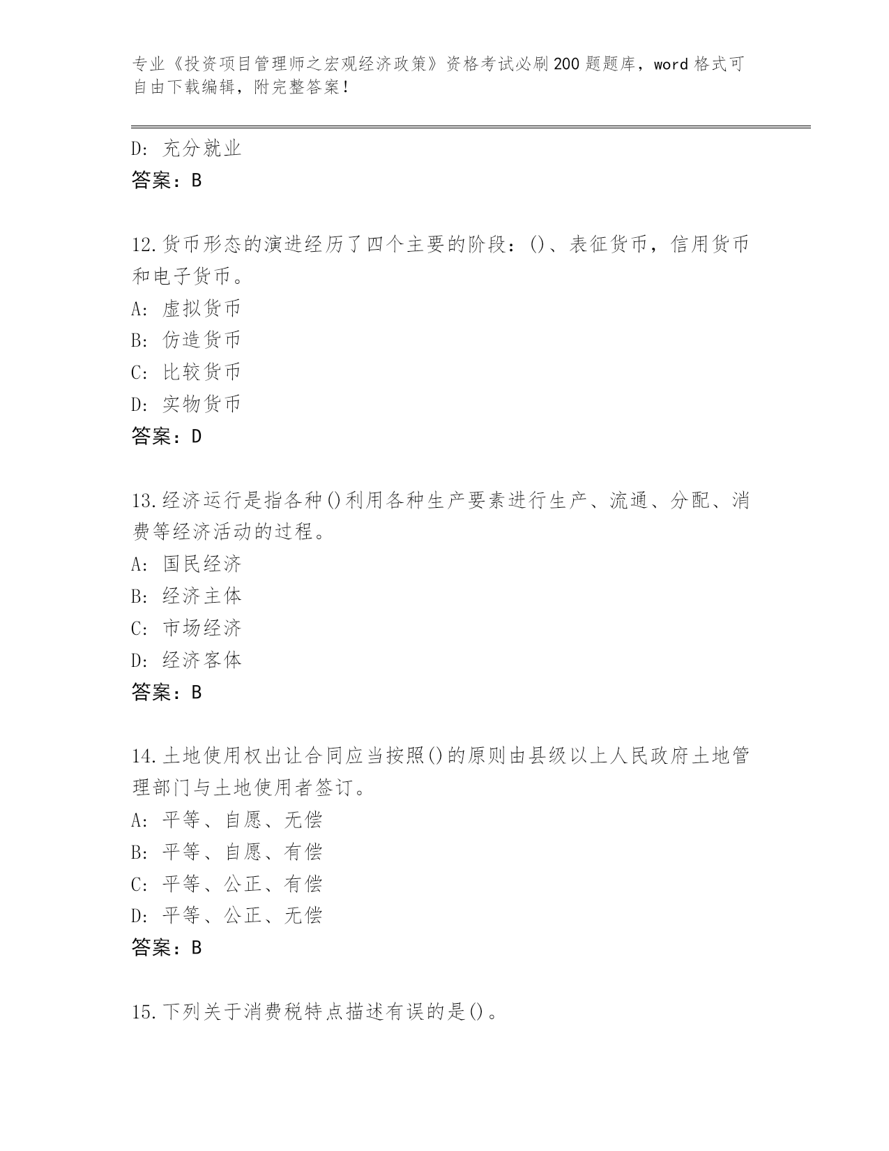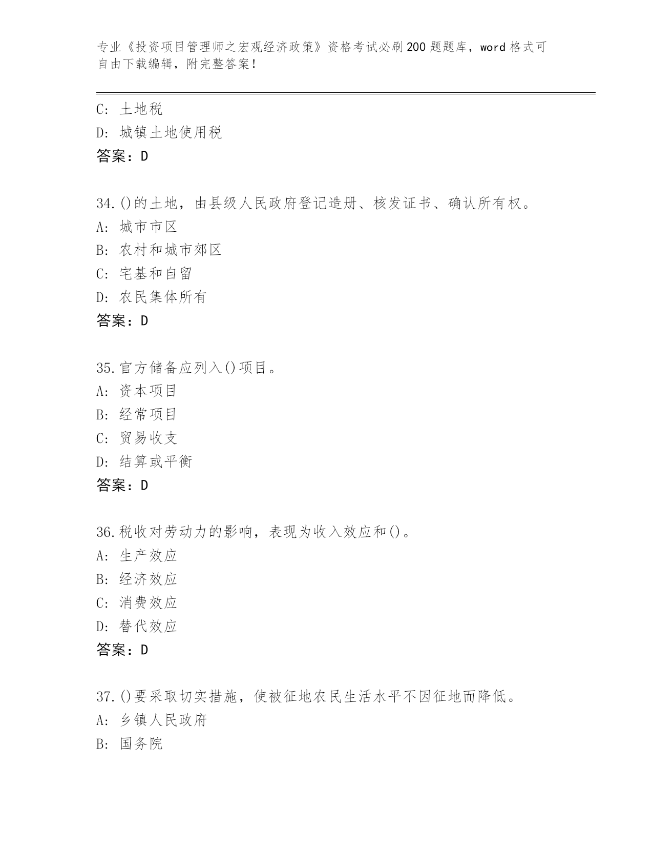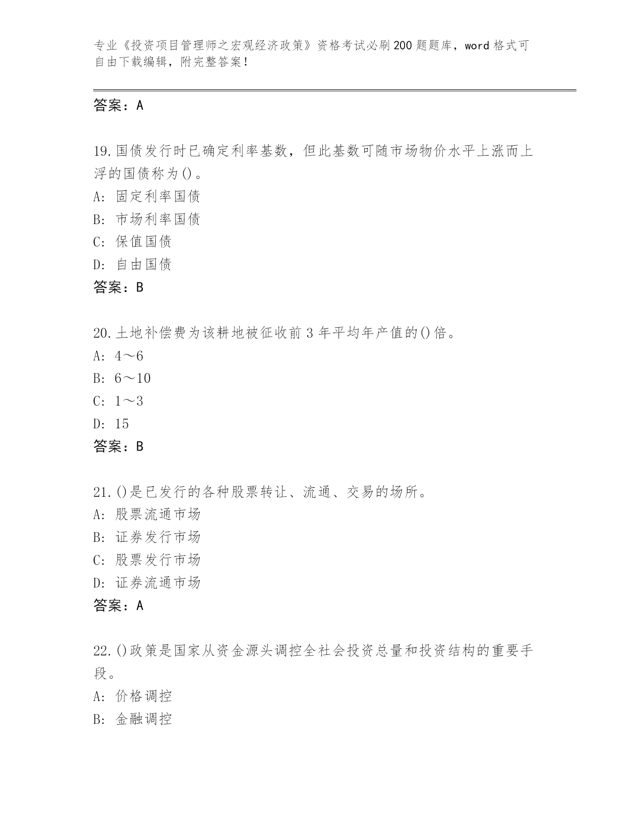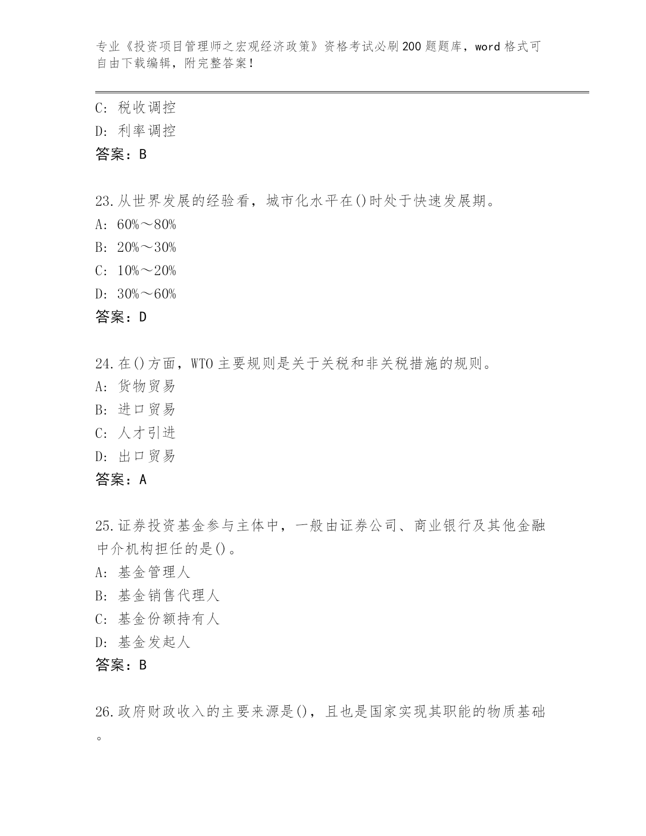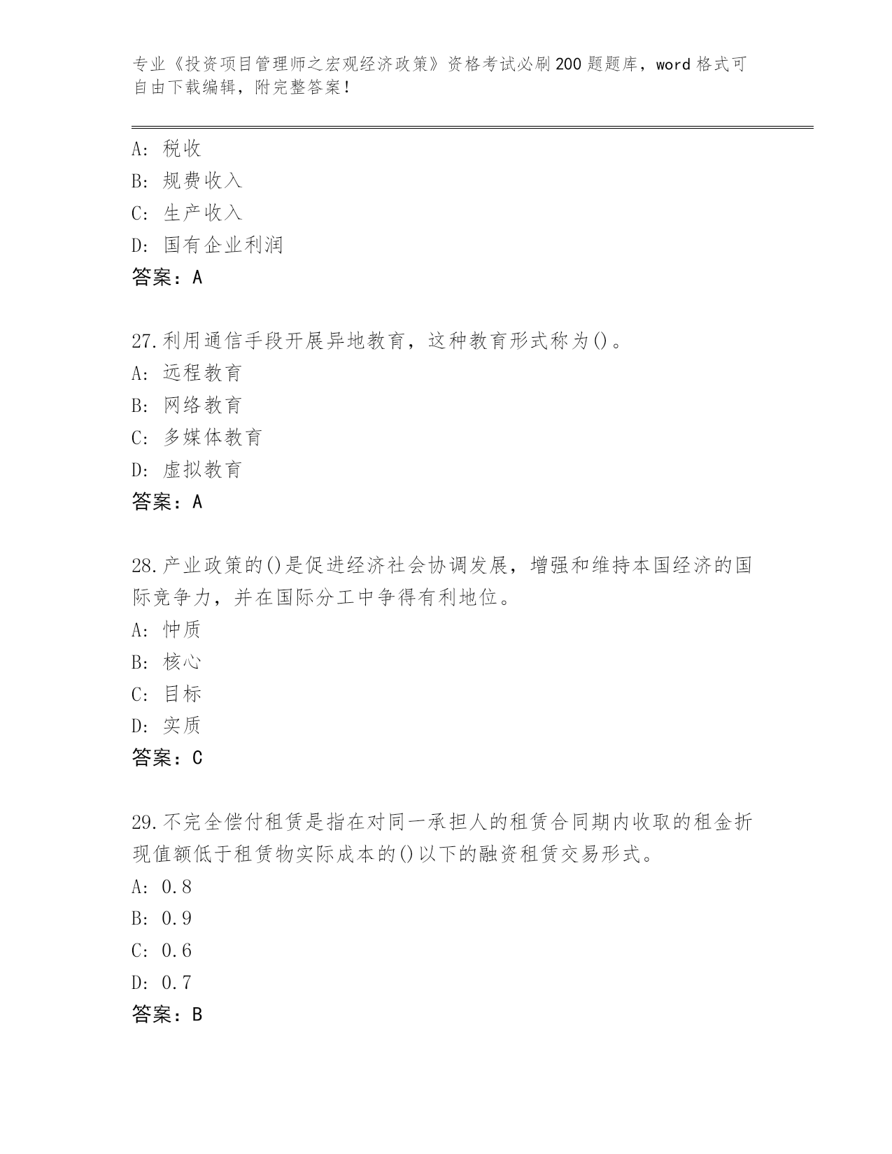 甘肃省礼县《投资项目管理师之宏观经济政策》资格考试必刷200题真题(考试直接用)