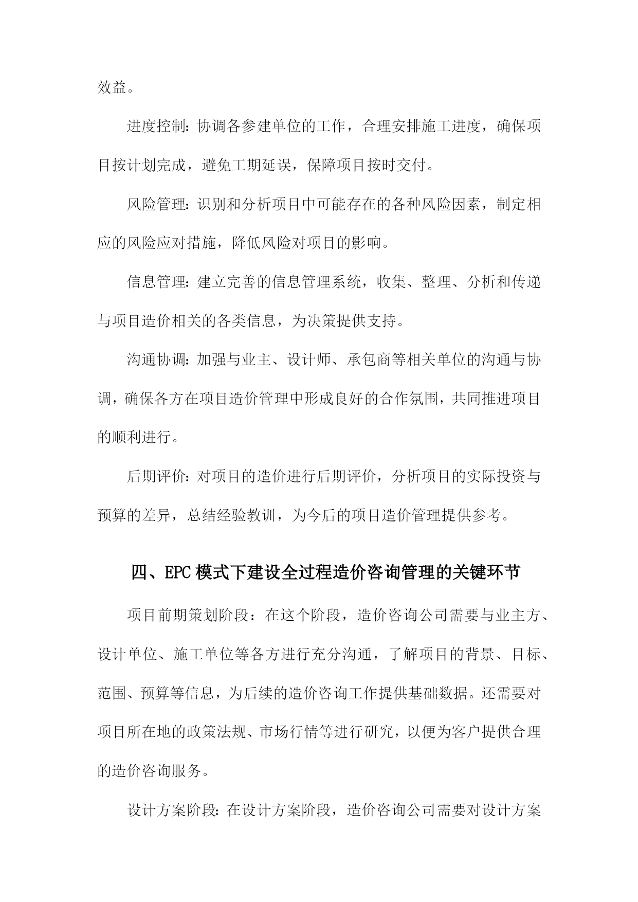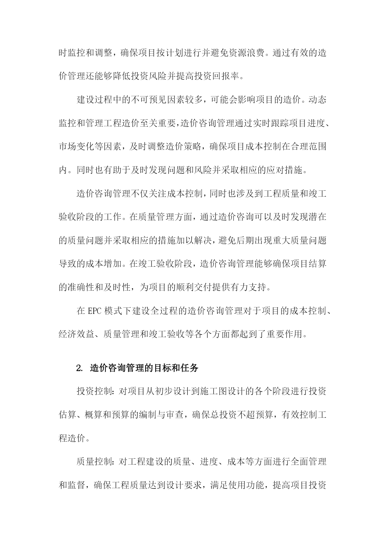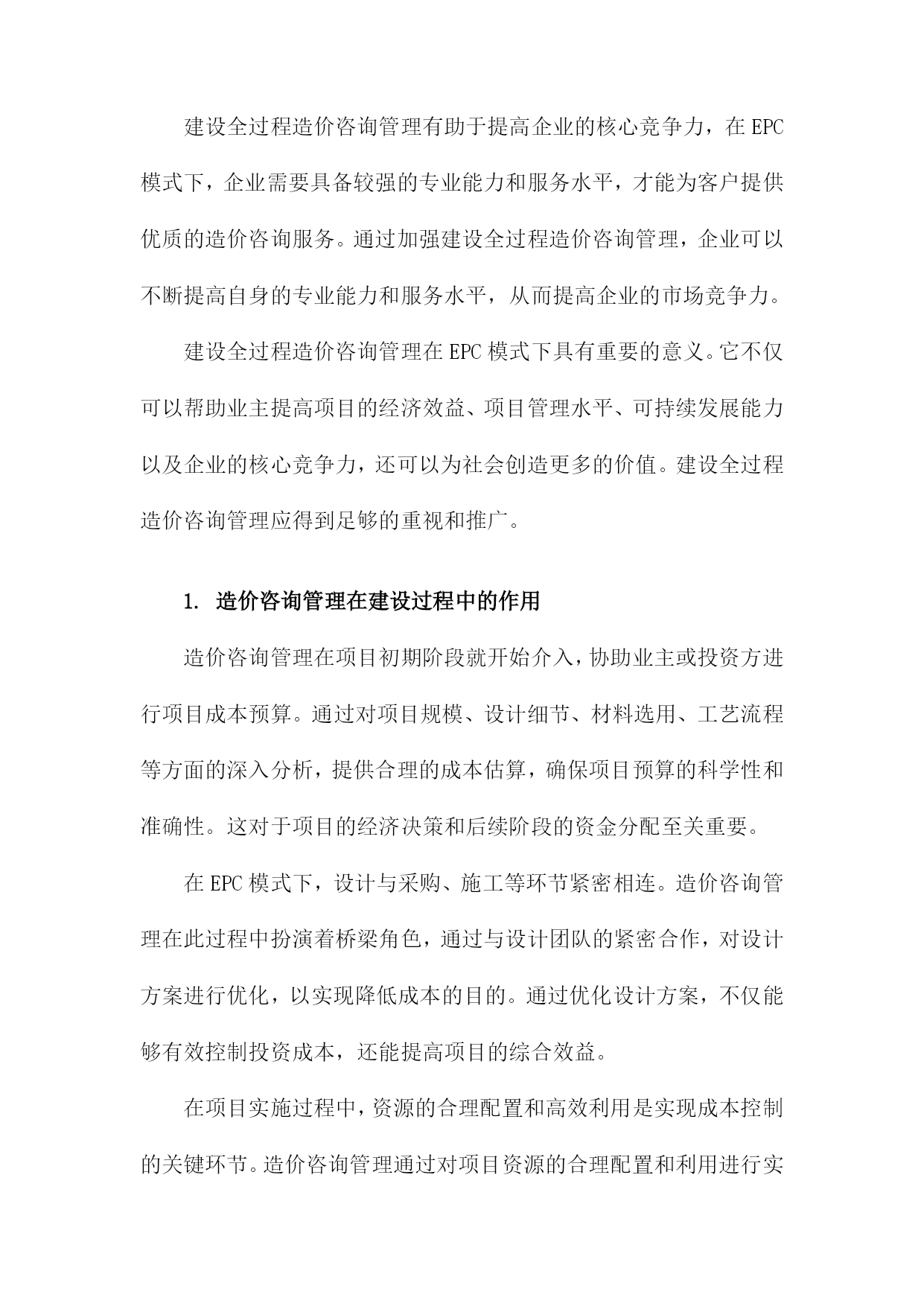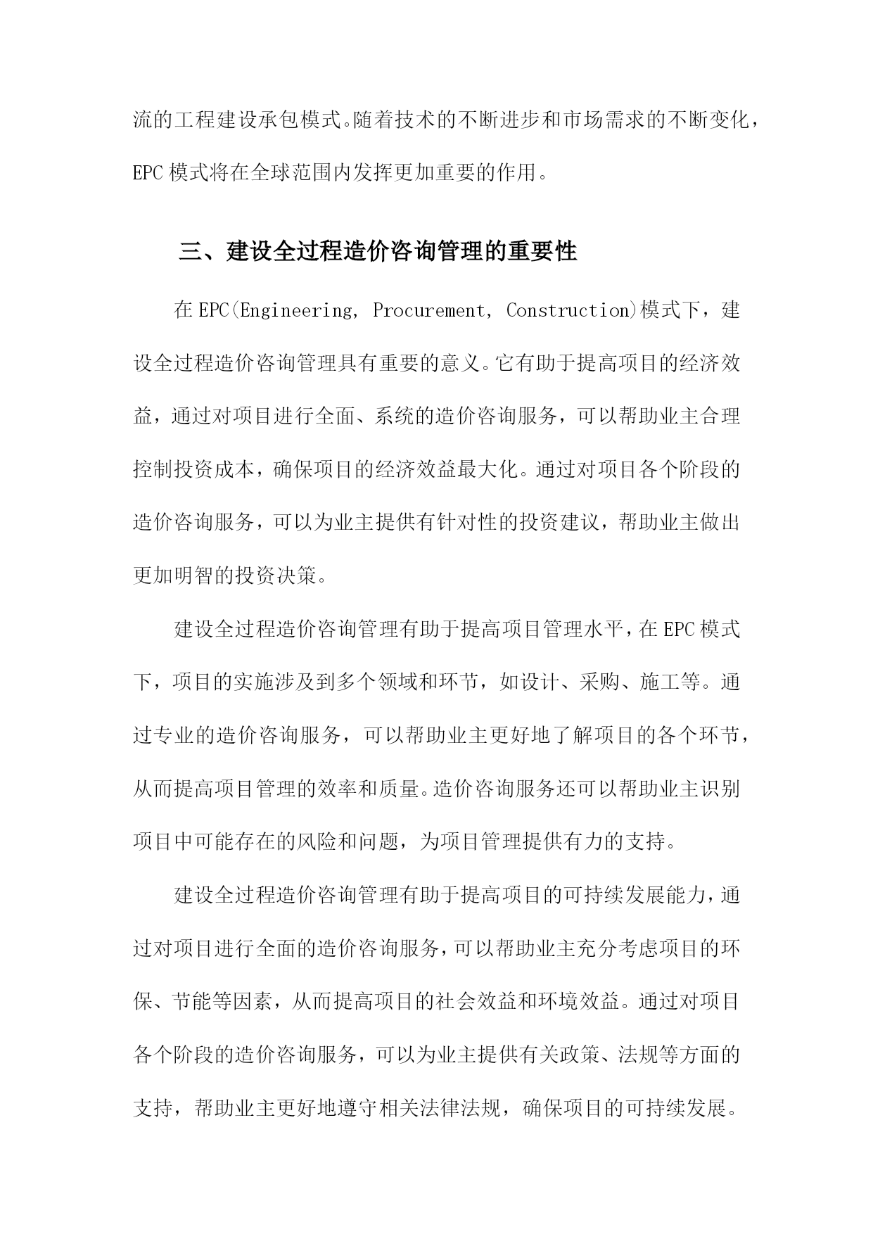 EPC模式下建设全过程造价咨询管理探究目录一、内容概览................................................2二、EPC模式概述.............................................31.定义和特点介绍........................................52.EPC模式在国内外的发展现状.............................6三、建设全过程造价咨询管理的重要性..........................71.造价咨询管理在建设过程中的作用........................82.造价咨询管理的目标和任务..............................9四、EPC模式下建设全过程造价咨询管理的关键环节..............101.项目决策阶段造价咨询管理.............................122.设计与招标阶段造价咨询管理...........................143.施工阶段造价咨询管理.................................154.竣工验收与后评价阶段造价咨询管理.....................16五、EPC模式下建设全过程造价咨询管理的挑战与对策............181.面临的挑战分析.......................................19(1)合同管理难度大的问题...............................21(2)造价波动与风险控制问题.............................22(3)技术与经济结合不够紧密的问题.......................232.应对策略与建议.......................................24(1)加强合同管理和风险防控机制建设.....................26(2)提高技术与经济结合度,优化设计方案..................27(3)强化过程监控,确保造价咨询管理的有效性..............28六、案例分析...............................................301.项目背景及基本情况介绍...............................312.造价咨询管理在EPC模式下的实践应用....................333.案例分析总结与启示...................................34七、结论与展望.............................................351.研究结论总结.........................................362.对未来研究的展望与建议...............................37一、内容概览项目前期策划与设计阶段的造价咨询:此阶段是整个项目建设周期中至关重要的环节,主要涉及项目可行性研究、初步设计、施工图设计等阶段。造价咨询人员需要积极参与这些阶段的各项工作,协助业主确定合理的建设规模和标准,优化设计方案,降低工程造价。招标与合同管理:在EPC模式下,招标和合同管理是造价咨询的重要职责之一。咨询人员需要协助业主制定招标文件,明确工程范围、质量要求、进度要求等关键条款,并协助业主与承包商签订合同。在合同执行过程中,咨询人员还需密切关注合同履行情况,及时发现和解决可能出现的争议和问题。施工阶段的造价控制与现场管理:施工阶段是工程建设的关键实施阶段,造价咨询人员需要深入现场,对施工过程中的材料采购、设备安装、变更签证等环节进行严格把关,确保实际施工成本不超出预算。咨询人员还需协助业主进行现场文明施工和安全管理,提高项目的整体效率。竣工结算与审计:竣工结算是整个项目建设周期的最终环节,也是造价咨询的重要任务之一。咨询人员需要协助业主完成竣工结算工作,确保结算金额准确无误。针对竣工结算资料,咨询人员还需进行严格的审计工作,确保结算资料的完整性和准确性。后期评价与持续改进:在项目交付使用后,造价咨询人员还需参与项目的后期评价工作,对项目的运营成本、经济效益等进行评估和分析。通过总结经验教训,为今后的项目建设提供有益的参考和借鉴。EPC模式下建设全过程造价咨询管理是一个涉及多个环节和方面的综合性工作。为了确保项目建设的顺利进行和高质量完成,业主应高度重视并加强全过程造价咨询管理工