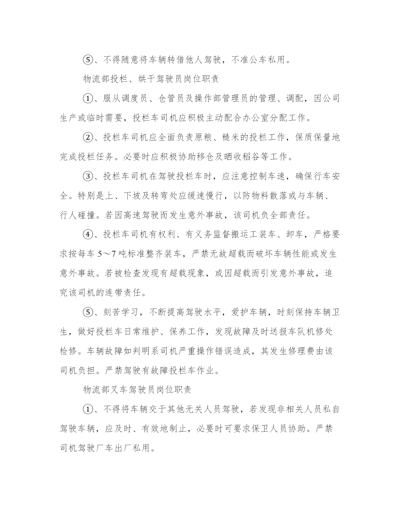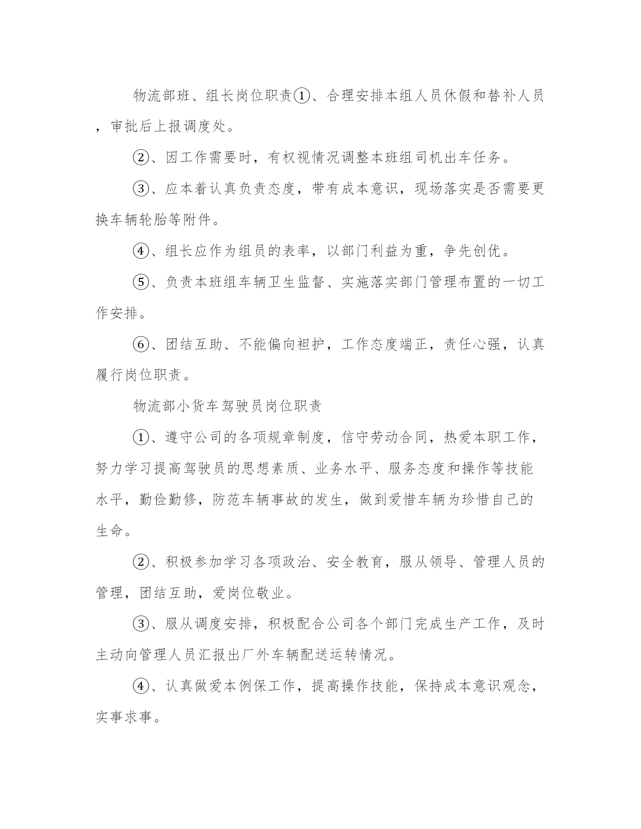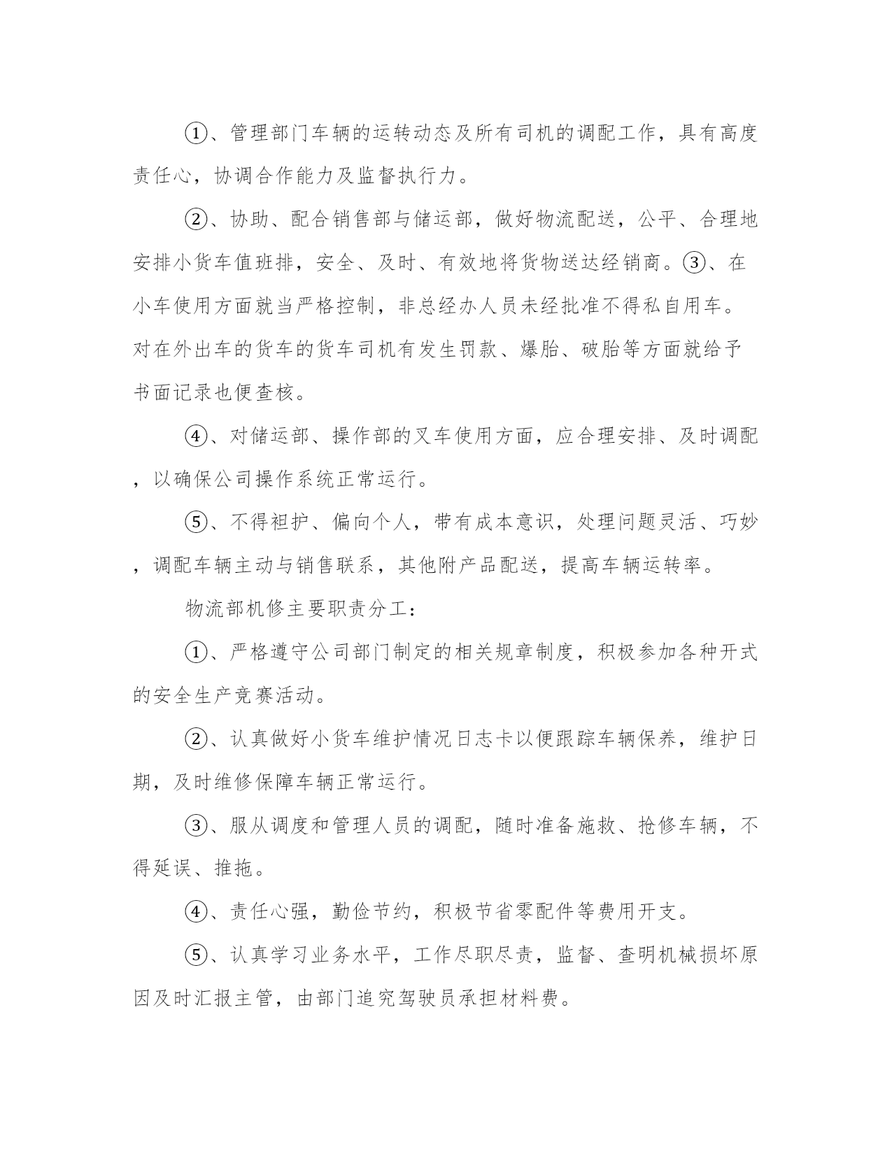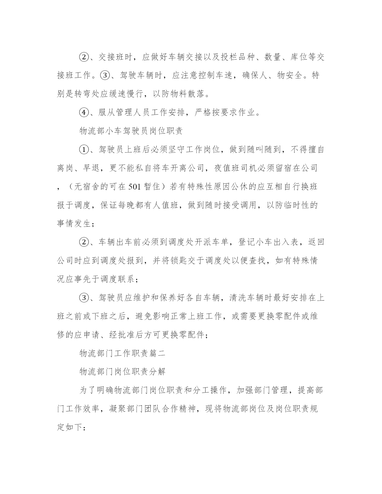 物流部门工作职责(4篇)在日常的学习、工作、生活中,肯定对各类范文都很熟悉吧。大家想知道怎么样才能写一篇比较优质的范文吗?以下是小编为大家收集的优秀范文,欢迎大家分享阅读。物流部门工作职责篇一物流部统计主要职责分工①、应当具有高度责任心,能快速有效的处理各项有关事务,做到公平、公正、开,具有监督与成本核算意识。②、协助部门经理负责日常工作运转,对于各项重要事宜及时通知各员工,正确管理每部车辆的档案及各数据的统计。③、对部门车辆的日常零星开支,如:交通费用、补胎费、换胎费以及维修费用等方面的开支应做到严格控制和监督。④、与调度配合及时记录小货车的区域销售动态以及各项营运费用方面的开支,正确核算每辆货车的费用开支与车辆盈亏状况,审核无误编制报表上报部门经理及上级主管。⑤、协助财务部做好部门员工月考勤及货车司机、叉车司机、以及投栏、烘干司机的月业绩补贴,核对无误后于10日之前上交行政部。物流部调度主要职责分工:①、管理部门车辆的运转动态及所有司机的调配工作,具有高度责任心,协调合作能力及监督执行力。②、协助、配合销售部与储运部,做好物流配送,公平、合理地安排小货车值班排,安全、及时、有效地将货物送达经销商。③、在小车使用方面就当严格控制,非总经办人员未经批准不得私自用车。对在外出车的货车的货车司机有发生罚款、爆胎、破胎等方面就给予书面记录也便查核。④、对储运部、操作部的叉车使用方面,应合理安排、及时调配,以确保公司操作系统正常运行。⑤、不得袒护、偏向个人,带有成本意识,处理问题灵活、巧妙,调配车辆主动与销售联系,其他附产品配送,提高车辆运转率。物流部机修主要职责分工:①、严格遵守公司部门制定的相关规章制度,积极参加各种开式的安全生产竞赛活动。②、认真做好小货车维护情况日志卡以便跟踪车辆保养,维护日期,及时维修保障车辆正常运行。③、服从调度和管理人员的调配,随时准备施救、抢修车辆,不得延误、推拖。④、责任心强,勤俭节约,积极节省零配件等费用开支。⑤、认真学习业务水平,工作尽职尽责,监督、查明机械损坏原因及时汇报主管,由部门追究驾驶员承担材料费。物流部班、组长岗位职责①、合理安排本组人员休假和替补人员,审批后上报调度处。②、因工作需要时,有权视情况调整本班组司机出车任务。③、应本着认真负责态度,带有成本意识,现场落实是否需要更换车辆轮胎等附件。④、组长应作为组员的表率,以部门利益为重,争先创优。⑤、负责本班组车辆卫生监督、实施落实部门管理布置的一切工作安排。⑥、团结互助、不能偏向袒护,工作态度端正,责任心强,认真履行岗位职责。物流部小货车驾驶员岗位职责①、遵守公司的各项规章制度,信守劳动合同,热爱本职工作,努力学习提高驾驶员的思想素质、业务水平、服务态度和操作等技能水平,勤俭勤修,防范车辆事故的发生,做到爱惜车辆为珍惜自己的生命。②、积极参加学习各项政治、安全教育,服从领导、管理人员的管理,团结互助,爱岗位敬业。③、服从调度安排,积极配合公司各个部门完成生产工作,及时主动向管理人员汇报出厂外车辆配送运转情况。④、认真做爱本例保工作,提高操作技能,保持成本意识观念,实事求事。⑤、不得随意将车辆转借他人驾驶,不准公车私用。物流部投栏、烘干驾驶员岗位职责①、服从调度员、仓管员及操作部管理员的管理、调配,因公司生产或临时需要,投栏车司机应积极主动配合办公室分配工作。②、投栏车司机应全面负责原粮、糙米的投栏工作,保质保量地完成投栏任务。必要时应积极协助移仓及晒收稻谷等工作。③、投栏车司机在驾驶投栏车时,应注意控制车速,确保行车安全。特别是上、下坡及转弯处应缓速慢行,以防物料散落或与车辆、行人碰撞。若因高速驾驶而发生意外事故,该司机负全部责任。④、投栏车司机有权利、有义务监督搬运工装车、卸车,严格要求按每车5~7吨标准整齐装车,严禁无故超载而破坏车辆性能或发生意外事故。若被检查发现有超载现象,或因超载而引发意外事故,追究该司机的连带责任。⑤、刻苦学习,不断提高驾驶水平,爱护车辆,时刻保持车辆卫生,做好投栏车日常维护、保养工作,发现故障及时送报车队机修处检修。车辆故障如判明系司机严重操作错误造成,其发生修理费由该司机负担。严禁驾驶有故障投栏车作业。物流部叉车驾驶员岗位职责①、不得将车辆交于其他无关人员驾驶,若发现非相关人员私自驾驶车辆,应及时、有效地制止,必要时可要求保卫人员协助。严禁司机驾驶厂车出厂私用。②、交接班时,应做好车辆交接以及投栏品种、数量、库位等交接班工作。③、驾驶车辆时,应注意控制车速,确保人、物安全。特别是转弯处应缓速慢行,以防物料散落。④、服从管理人员工作安排,严格按要求作业。物流部小车驾驶员岗位职责①、驾驶员上班后必须坚守工作岗位,做到随叫随