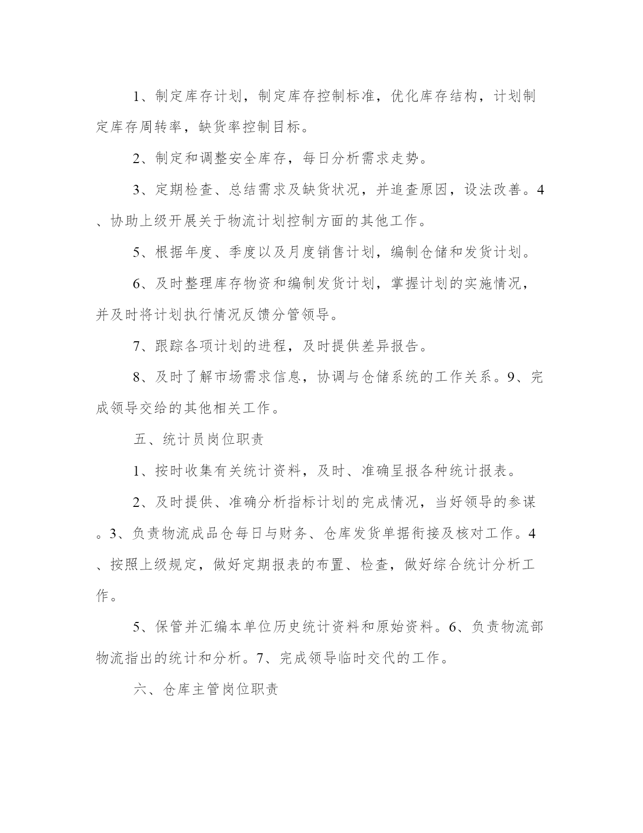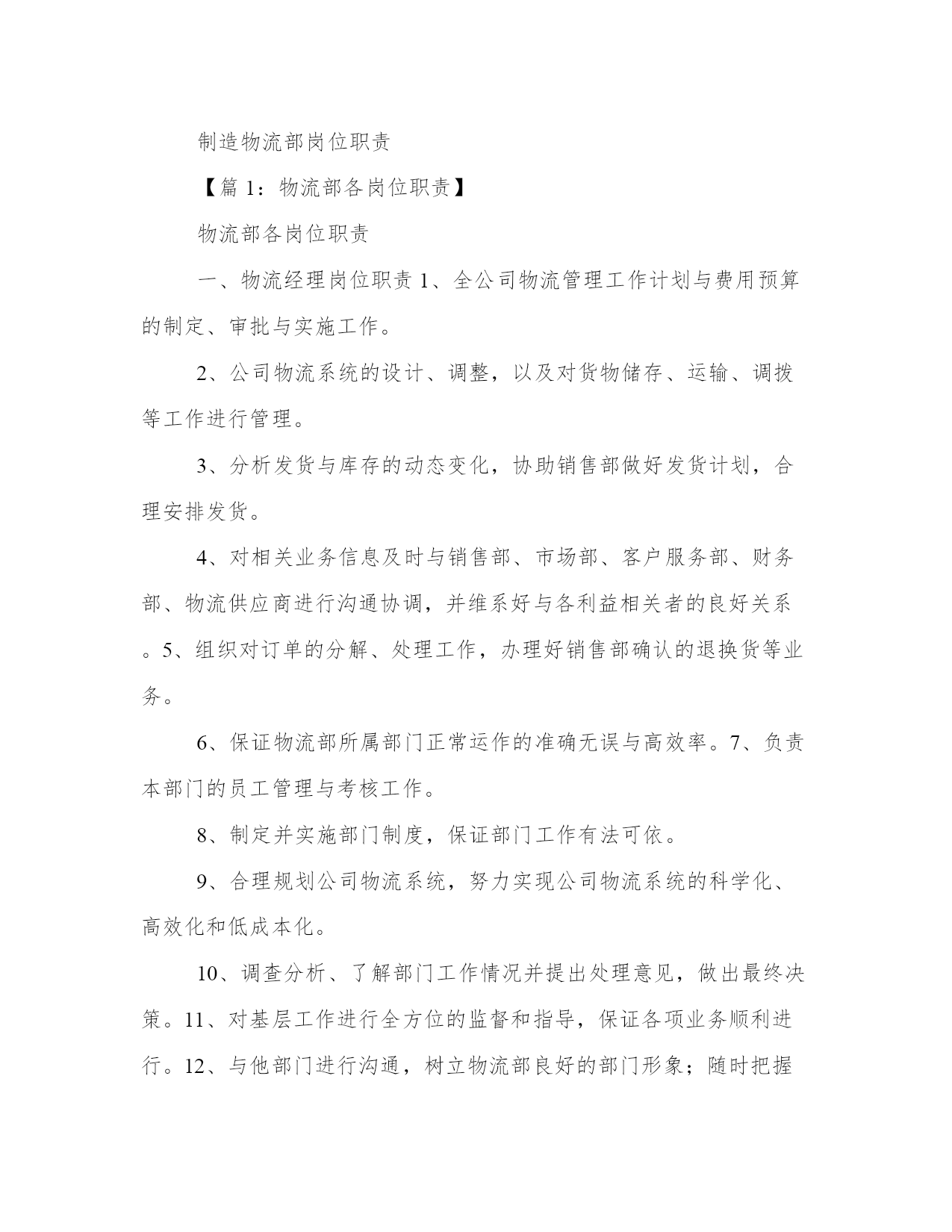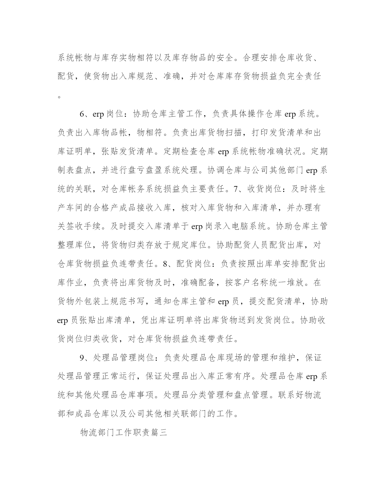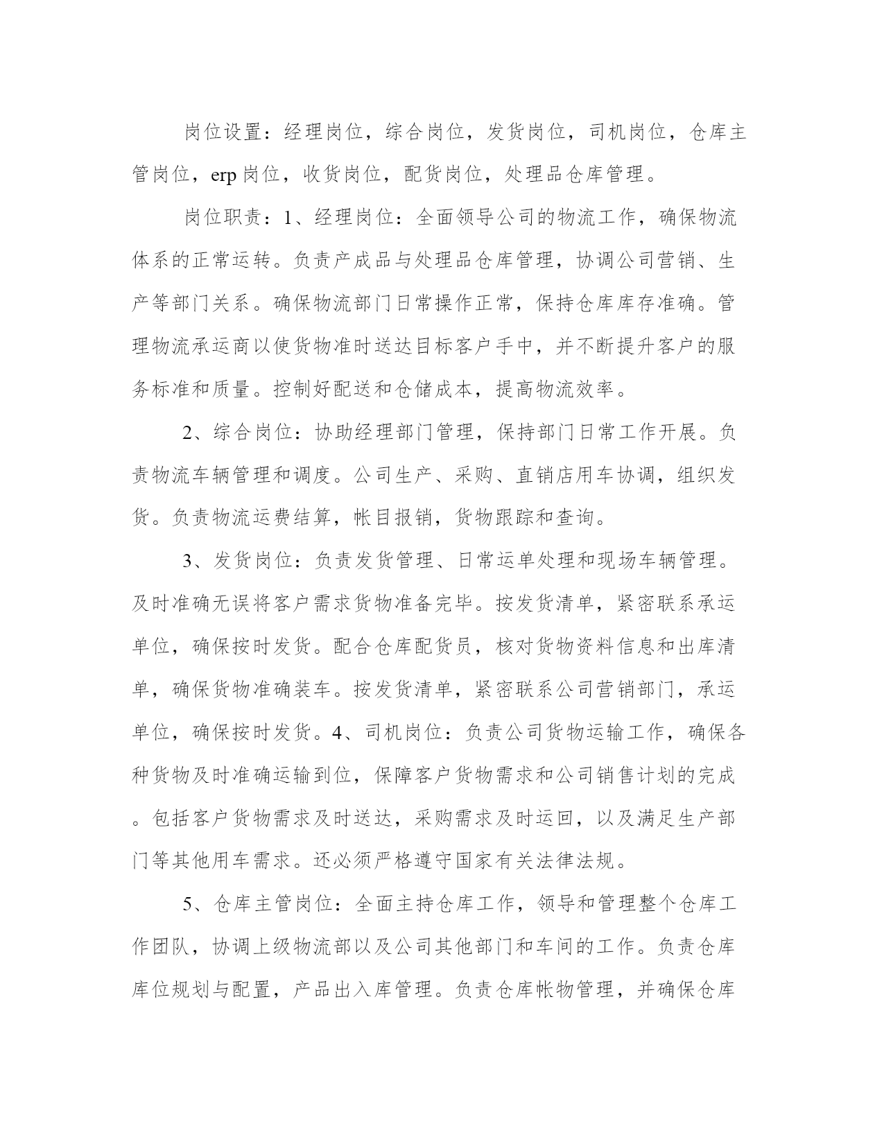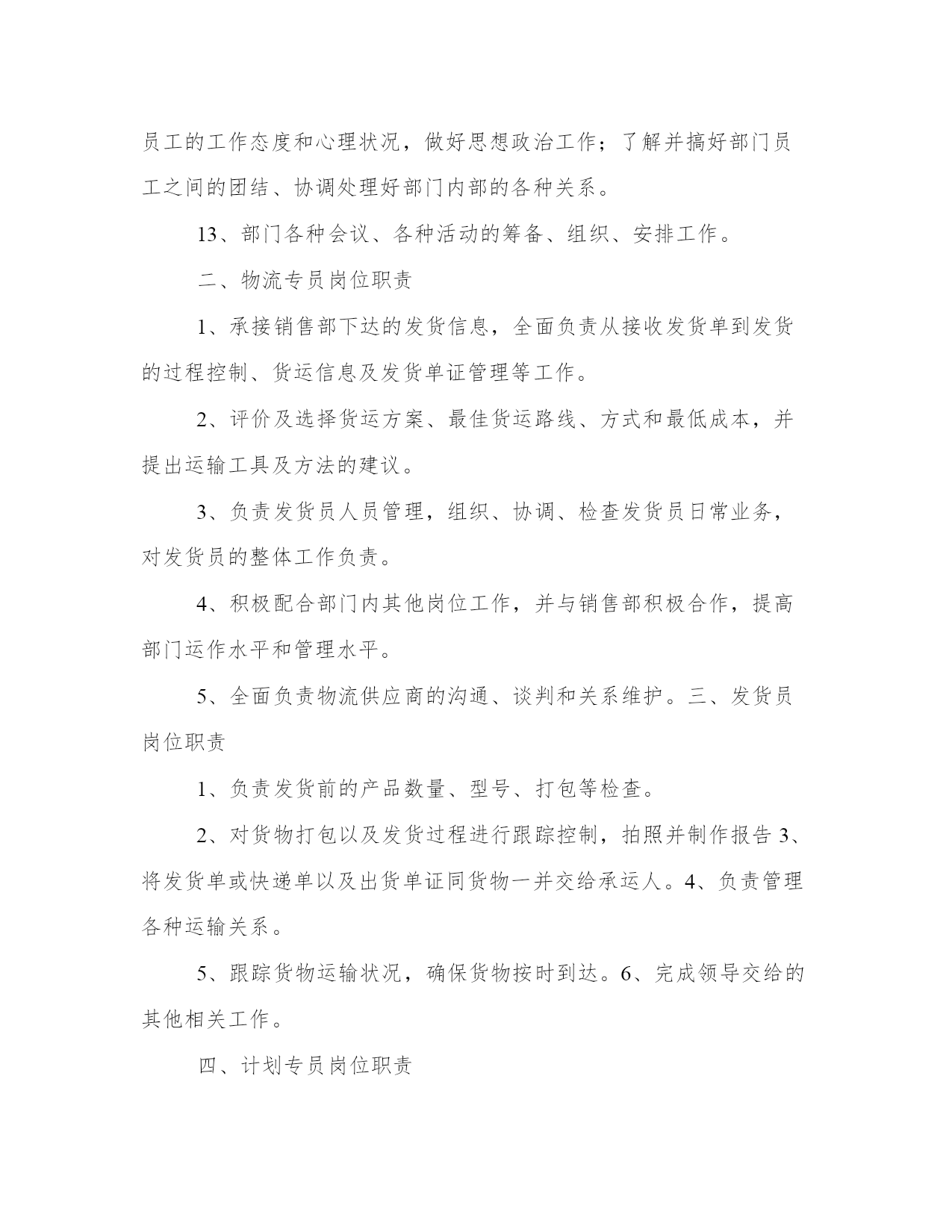 物流部门工作职责(4篇)在日常的学习、工作、生活中,肯定对各类范文都很熟悉吧。大家想知道怎么样才能写一篇比较优质的范文吗?以下是小编为大家收集的优秀范文,欢迎大家分享阅读。物流部门工作职责篇一物流部统计主要职责分工①、应当具有高度责任心,能快速有效的处理各项有关事务,做到公平、公正、开,具有监督与成本核算意识。②、协助部门经理负责日常工作运转,对于各项重要事宜及时通知各员工,正确管理每部车辆的档案及各数据的统计。③、对部门车辆的日常零星开支,如:交通费用、补胎费、换胎费以及维修费用等方面的开支应做到严格控制和监督。④、与调度配合及时记录小货车的区域销售动态以及各项营运费用方面的开支,正确核算每辆货车的费用开支与车辆盈亏状况,审核无误编制报表上报部门经理及上级主管。⑤、协助财务部做好部门员工月考勤及货车司机、叉车司机、以及投栏、烘干司机的月业绩补贴,核对无误后于10日之前上交行政部。物流部调度主要职责分工:①、管理部门车辆的运转动态及所有司机的调配工作,具有高度责任心,协调合作能力及监督执行力。②、协助、配合销售部与储运部,做好物流配送,公平、合理地安排小货车值班排,安全、及时、有效地将货物送达经销商。③、在小车使用方面就当严格控制,非总经办人员未经批准不得私自用车。对在外出车的货车的货车司机有发生罚款、爆胎、破胎等方面就给予书面记录也便查核。④、对储运部、操作部的叉车使用方面,应合理安排、及时调配,以确保公司操作系统正常运行。⑤、不得袒护、偏向个人,带有成本意识,处理问题灵活、巧妙,调配车辆主动与销售联系,其他附产品配送,提高车辆运转率。物流部机修主要职责分工:①、严格遵守公司部门制定的相关规章制度,积极参加各种开式的安全生产竞赛活动。②、认真做好小货车维护情况日志卡以便跟踪车辆保养,维护日期,及时维修保障车辆正常运行。③、服从调度和管理人员的调配,随时准备施救、抢修车辆,不得延误、推拖。④、责任心强,勤俭节约,积极节省零配件等费用开支。⑤、认真学习业务水平,工作尽职尽责,监督、查明机械损坏原因及时汇报主管,由部门追究驾驶员承担材料费。物流部班、组长岗位职责①、合理安排本组人员休假和替补人员,审批后上报调度处。②、因工作需要时,有权视情况调整本班组司机出车任务。③、应本着认真负责态度,带有成本意识,现场落实是否需要更换车辆轮胎等附件。④、组长应作为组员的表率,以部门利益为重,争先创优。⑤、负责本班组车辆卫生监督、实施落实部门管理布置的一切工作安排。⑥、团结互助、不能偏向袒护,工作态度端正,责任心强,认真履行岗位职责。物流部小货车驾驶员岗位职责①、遵守公司的各项规章制度,信守劳动合同,热爱本职工作,努力学习提高驾驶员的思想素质、业务水平、服务态度和操作等技能水平,勤俭勤修,防范车辆事故的发生,做到爱惜车辆为珍惜自己的生命。②、积极参加学习各项政治、安全教育,服从领导、管理人员的管理,团结互助,爱岗位敬业。③、服从调度安排,积极配合公司各个部门完成生产工作,及时主动向管理人员汇报出厂外车辆配送运转情况。④、认真做爱本例保工作,提高操作技能,保持成本意识观念,实事求事。⑤、不得随意将车辆转借他人驾驶,不准公车私用。物流部投栏、烘干驾驶员岗位职责①、服从调度员、仓管员及操作部管理员的管理、调配,因公司生产或临时需要,投栏车司机应积极主动配合办公室分配工作。②、投栏车司机应全面负责原粮、糙米的投栏工作,保质保量地完成投栏任务。必要时应积极协助移仓及晒收稻谷等工作。③、投栏车司机在驾驶投栏车时,应注意控制车速,确保行车安全。特别是上、下坡及转弯处应缓速慢行,以防物料散落或与车辆、行人碰撞。若因高速驾驶而发生意外事故,该司机负全部责任。④、投栏车司机有权利、有义务监督搬运工装车、卸车,严格要求按每车5~7吨标准整齐装车,严禁无故超载而破坏车辆性能或发生意外事故。若被检查发现有超载现象,或因超载而引发意外事故,追究该司机的连带责任。⑤、刻苦学习,不断提高驾驶水平,爱护车辆,时刻保持车辆卫生,做好投栏车日常维护、保养工作,发现故障及时送报车队机修处检修。车辆故障如判明系司机严重操作错误造成,其发生修理费由该司机负担。严禁驾驶有故障投栏车作业。物流部叉车驾驶员岗位职责①、不得将车辆交于其他无关人员驾驶,若发现非相关人员私自驾驶车辆,应及时、有效地制止,必要时可要求保卫人员协助。严禁司机驾驶厂车出厂私用。②、交接班时,应做好车辆交接以及投栏品种、数量、库位等交接班工作。③、驾驶车辆时,应注意控制车速,确保人、物安全。特别是转弯处应缓速慢行,以防物料散落。④、服从管理人员工作安排,严格按要求作业。物流部小车驾驶员岗位职责①、驾驶员上班后必须坚守工作岗位,做到随叫随