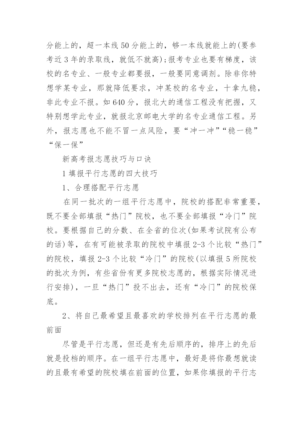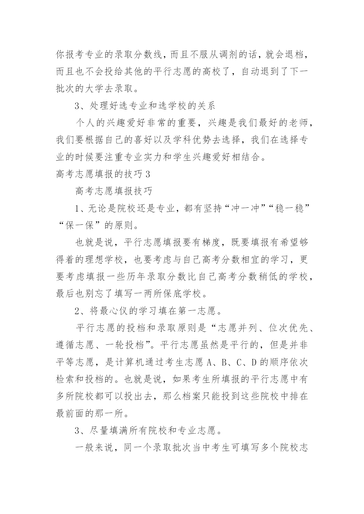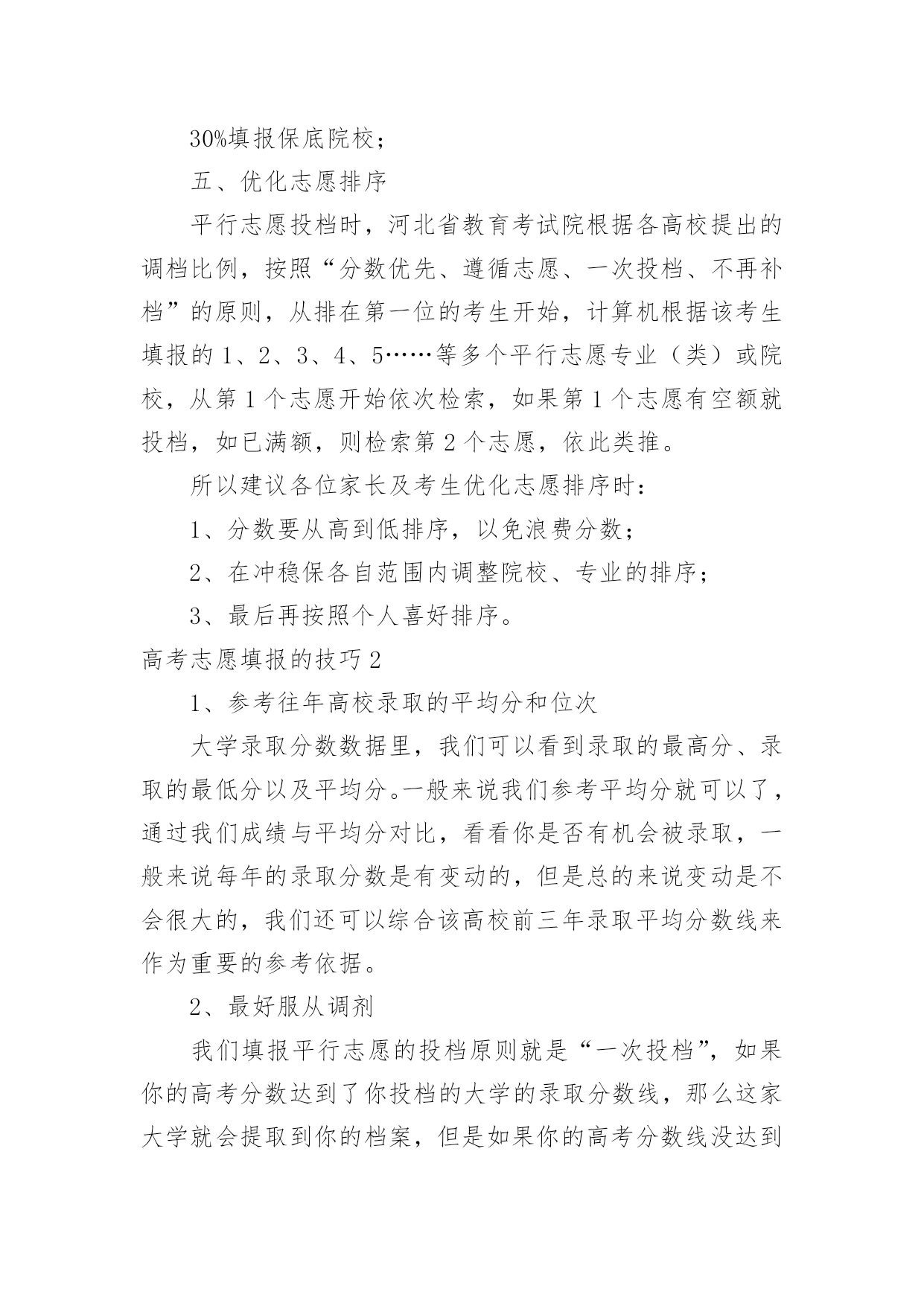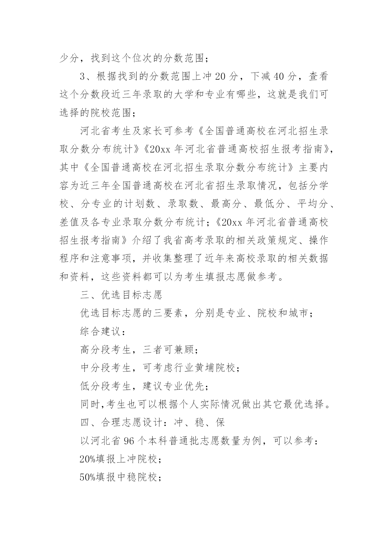 高考志愿填报的技巧高考志愿填报的技巧高考志愿填报的技巧1一、明确专业方向1、首先根据自己的选考科目,确定可选择的专业范围,因为不符合专业选科要求,即使分数再高也不能报考;2、从自身条件出发,剔除专业招生特殊要求不适合的专业,比如色盲色弱、身高要求、报考语种、单科成绩等要求的专业;3、可以根据高中时期擅长科目选择对应专业;4、综合考虑个人的性格、兴趣、能力、价值观等个人特质;5、最后再结合自己的未来规划匹配相关专业,如:未来想考研可以选择医学、理学等专业;如果想大学毕业直接工作就可以考虑工学方向;二、圈定院校范围1、出分后,根据省考试院的“一分一段表”确定自己的位次;2、根据“位次”,分别找到近三年同位次的分数(等位分),举例说明,假设20xx年的第15723名是500分,那么就看20xx年的15723名是多少分,20xx年的15723名是多少分,找到这个位次的分数范围;3、根据找到的分数范围上冲20分,下减40分,查看这个分数段近三年录取的大学和专业有哪些,这就是我们可选择的院校范围;河北省考生及家长可参考《全国普通高校在河北招生录取分数分布统计》《20xx年河北省普通高校招生报考指南》,其中《全国普通高校在河北招生录取分数分布统计》主要内容为近三年全国普通高校在河北省招生录取情况,包括分学校、分专业的计划数、录取数、最高分、最低分、平均分、差值及各专业录取分数分布统计;《20xx年河北省普通高校招生报考指南》介绍了我省高考录取的相关政策规定、操作程序和注意事项,并收集整理了近年来高校录取的相关数据和资料,这些资料都可以为考生填报志愿做参考。三、优选目标志愿优选目标志愿的三要素,分别是专业、院校和城市;综合建议:高分段考生,三者可兼顾;中分段考生,可考虑行业黄埔院校;低分段考生,建议专业优先;同时,考生也可以根据个人实际情况做出其它最优选择。四、合理志愿设计:冲、稳、保以河北省96个本科普通批志愿数量为例,可以参考:20%填报上冲院校;50%填报中稳院校;30%填报保底院校;五、优化志愿排序平行志愿投档时,河北省教育考试院根据各高校提出的调档比例,按照“分数优先、遵循志愿、一次投档、不再补档”的原则,从排在第一位的考生开始,计算机根据该考生填报的1、2、3、4、5……等多个平行志愿专业(类)或院校,从第1个志愿开始依次检索,如果第1个志愿有空额就投档,如已满额,则检索第2个志愿,依此类推。所以建议各位家长及考生优化志愿排序时:1、分数要从高到低排序,以免浪费分数;2、在冲稳保各自范围内调整院校、专业的排序;3、最后再按照个人喜好排序。高考志愿填报的技巧21、参考往年高校录取的平均分和位次大学录取分数数据里,我们可以看到录取的最高分、录取的最低分以及平均分。一般来说我们参考平均分就可以了,通过我们成绩与平均分对比,看看你是否有机会被录取,一般来说每年的录取分数是有变动的,但是总的来说变动是不会很大的,我们还可以综合该高校前三年录取平均分数线来作为重要的参考依据。2、最好服从调剂我们填报平行志愿的投档原则就是“一次投档”,如果你的高考分数达到了你投档的大学的录取分数线,那么这家大学就会提取到你的档案,但是如果你的高考分数线没达到你报考专业的录取分数线,而且不服从调剂的话,就会退档,而且也不会投给其他的平行志愿的高校了,自动退到了下一批次的大学去录取。3、处理好选专业和选学校的关系个人的兴趣爱好非常的重要,兴趣是我们最好的老师,我们要根据自己的喜好以及学科优势去选择,我们在选择专业的时候要注重专业实力和学生兴趣爱好相结合。高考志愿填报的技巧3高考志愿填报技巧1、无论是院校还是专业,都有坚持“冲一冲”“稳一稳”“保一保”的原则。也就是说,平行志愿填报要有梯度,既要填报有希望够得着的理想学校,也要考虑与自己高考分数相宜的学习,更要考虑填报一些历年录取分数比自己高考分数稍低的学校,最后也别忘了填写一两所保底学校。2、将最心仪的学习填在第一志愿。平行志愿的投档和录取原则是“志愿并列、位次优先、遵循志愿、一轮投档”。平行志愿虽然是平行的,但是并非平等志愿,是计算机通过考生志愿A、B、C、D的顺序依次检索和投档的。也就是说,如果考生所填报的平行志愿中有多所院校都可以投出去,那么档案只能投到这些院校中排在最前面的那一所。3、尽量填满所有院校和专业志愿。一般来说,同一个录取批次当中考生可填写多个院校志愿,每所院校可选填六个专业。条件允许的情况下,尽量将所有院校和专业志愿填满,否则,很有可能因为少填报了一个院校及专业志愿,就失去了一次投档机会。4、谨慎选择是否服从调剂。在填报志愿的时候,建议考生尽量选择服从专业调剂。近些年来,很多学生都是由于“不服从专业调剂”被退档了。‘服从专业调剂’的意思就是考生在没有被自己所填专业录取时,愿意被调剂到别的专业