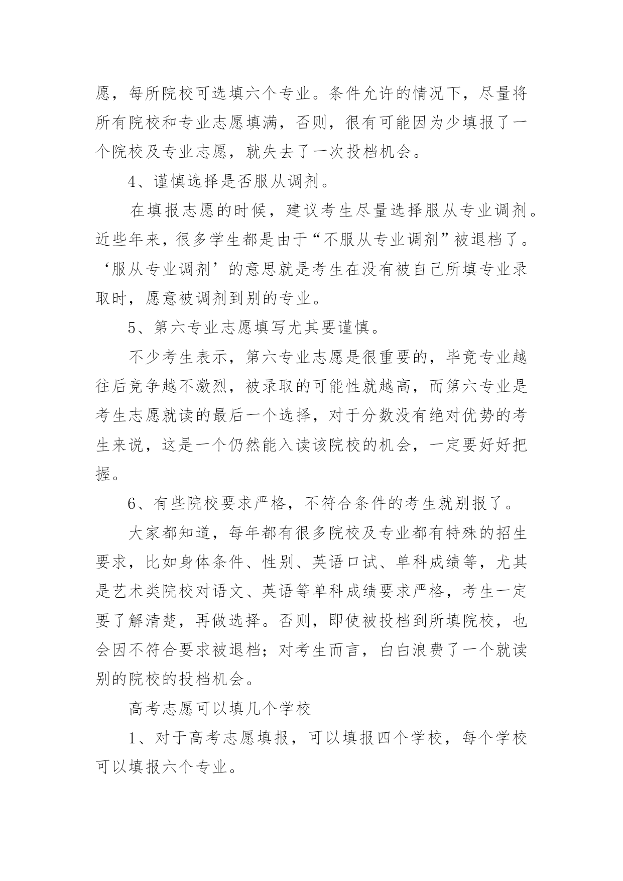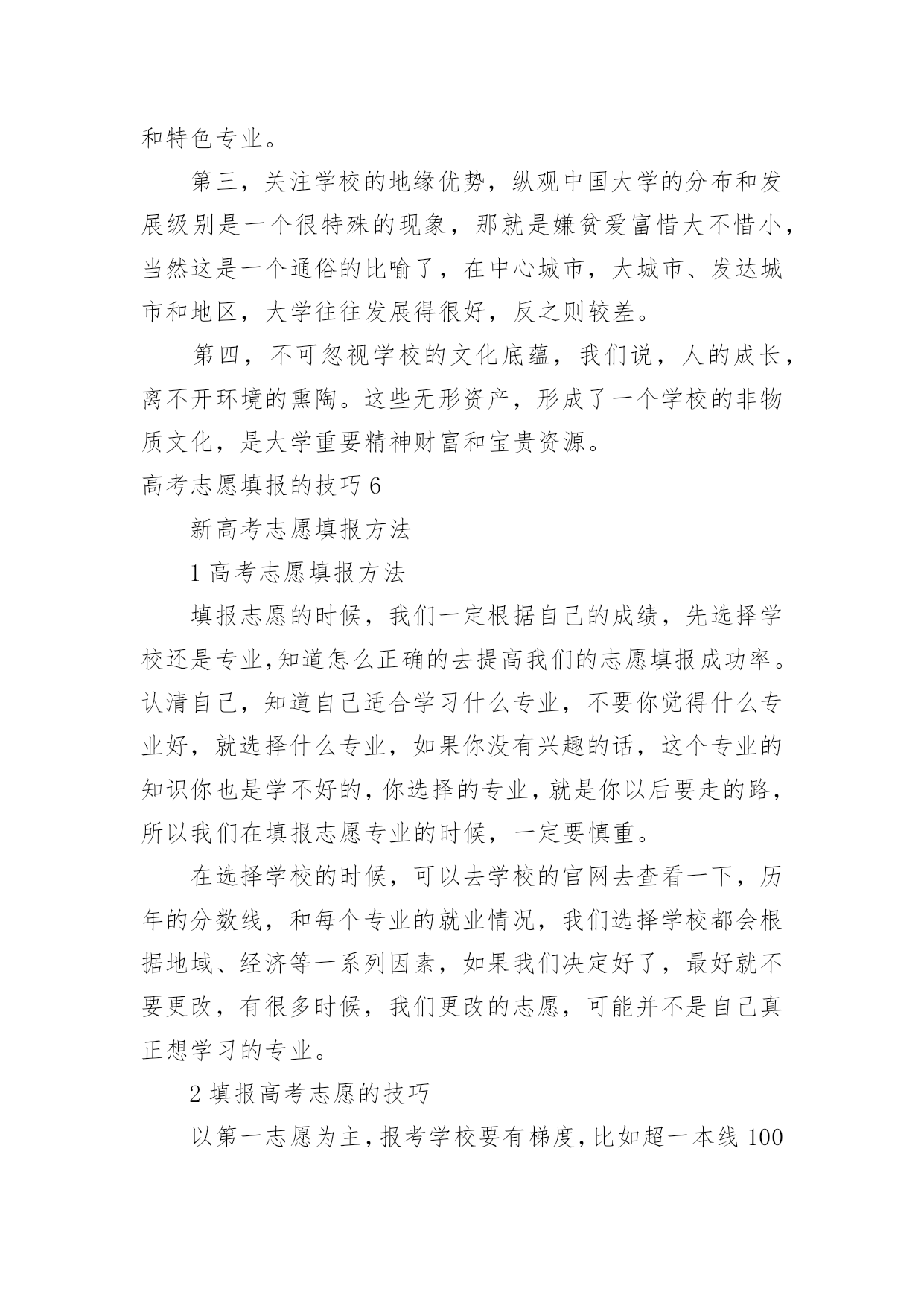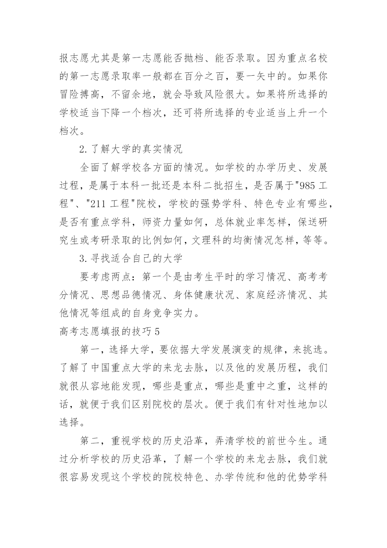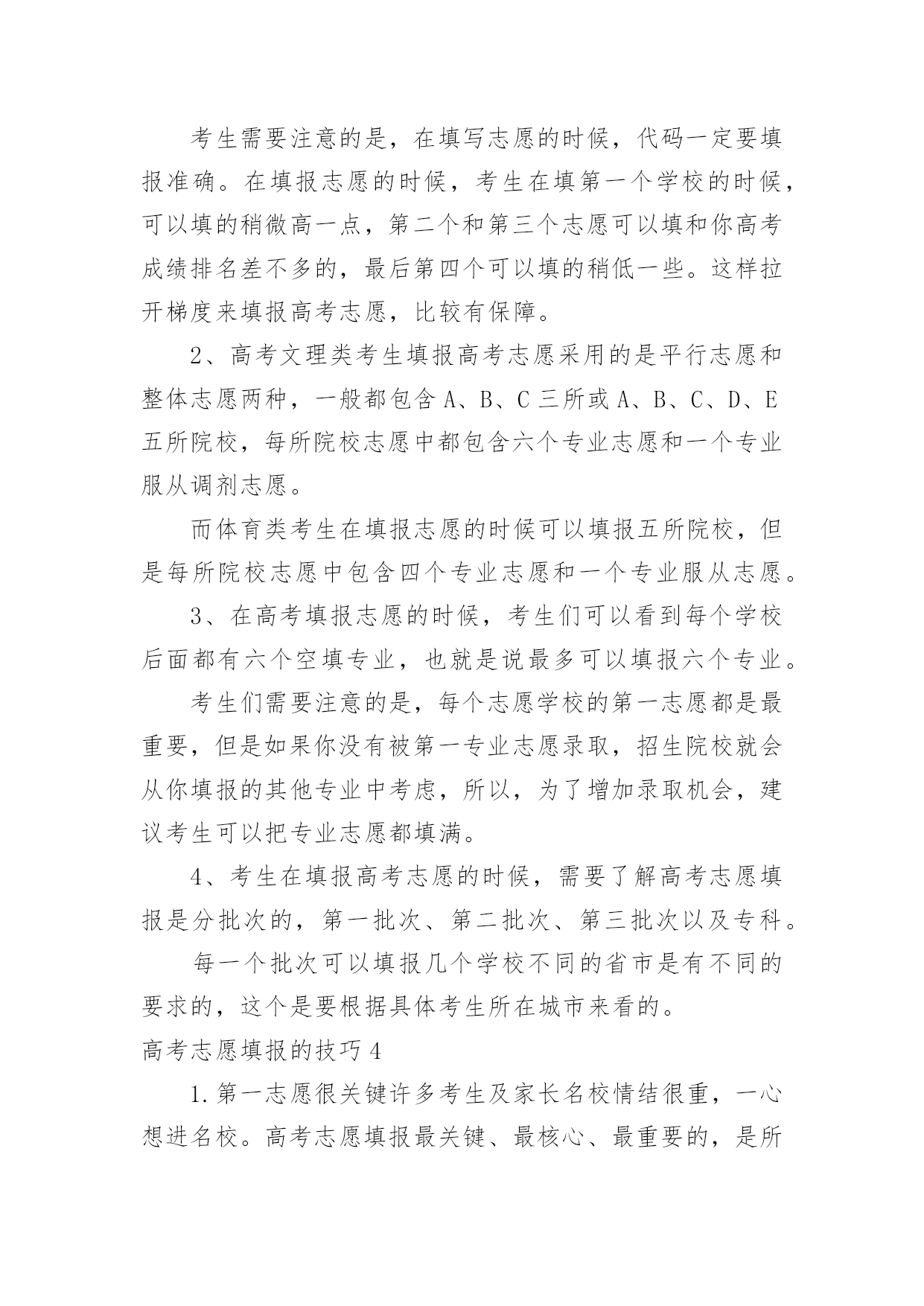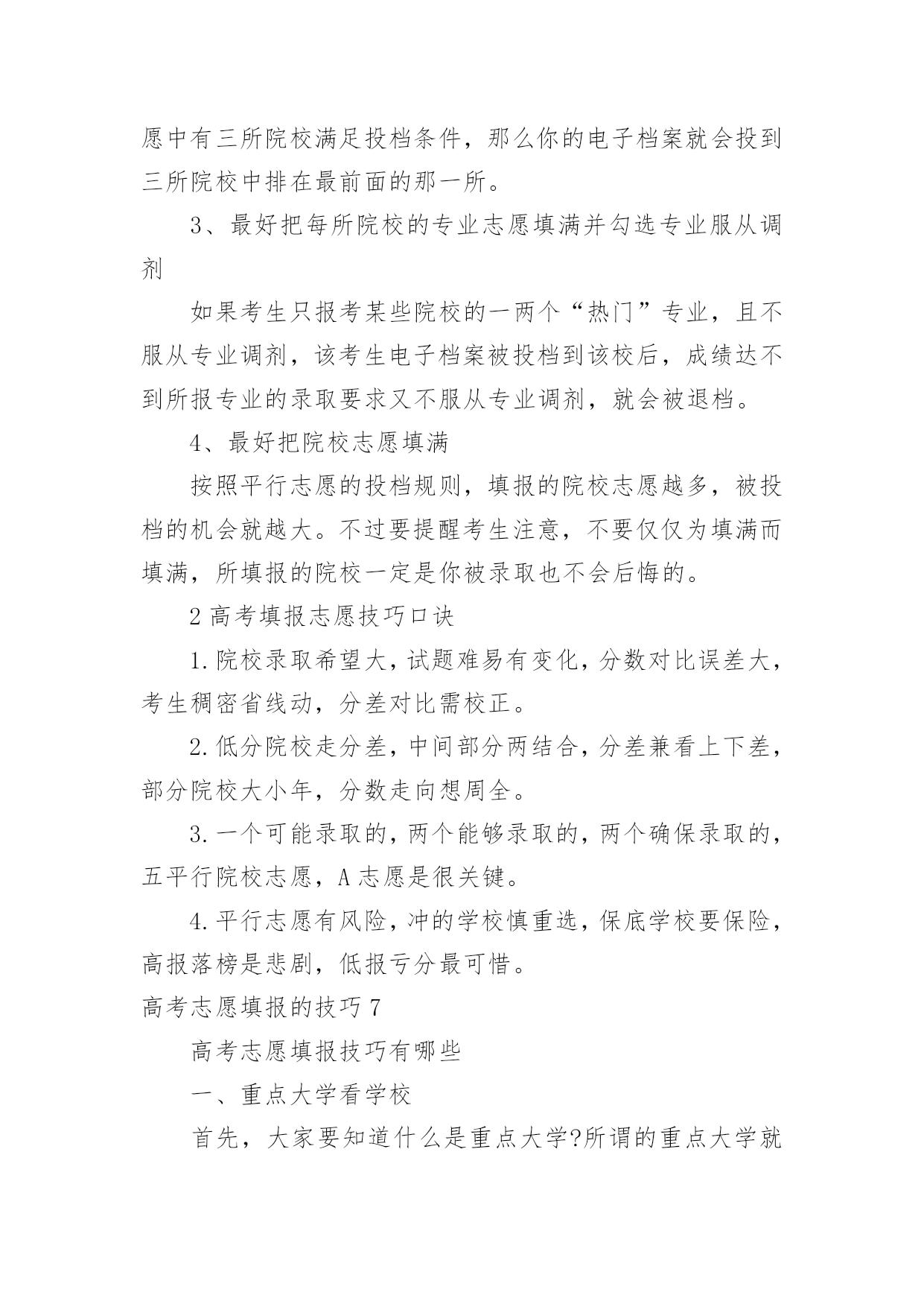 高考志愿填报的技巧高考志愿填报的技巧高考志愿填报的技巧1一、明确专业方向1、首先根据自己的选考科目,确定可选择的专业范围,因为不符合专业选科要求,即使分数再高也不能报考;2、从自身条件出发,剔除专业招生特殊要求不适合的专业,比如色盲色弱、身高要求、报考语种、单科成绩等要求的专业;3、可以根据高中时期擅长科目选择对应专业;4、综合考虑个人的性格、兴趣、能力、价值观等个人特质;5、最后再结合自己的未来规划匹配相关专业,如:未来想考研可以选择医学、理学等专业;如果想大学毕业直接工作就可以考虑工学方向;二、圈定院校范围1、出分后,根据省考试院的“一分一段表”确定自己的位次;2、根据“位次”,分别找到近三年同位次的分数(等位分),举例说明,假设20xx年的第15723名是500分,那么就看20xx年的15723名是多少分,20xx年的15723名是多少分,找到这个位次的分数范围;3、根据找到的分数范围上冲20分,下减40分,查看这个分数段近三年录取的大学和专业有哪些,这就是我们可选择的院校范围;河北省考生及家长可参考《全国普通高校在河北招生录取分数分布统计》《20xx年河北省普通高校招生报考指南》,其中《全国普通高校在河北招生录取分数分布统计》主要内容为近三年全国普通高校在河北省招生录取情况,包括分学校、分专业的计划数、录取数、最高分、最低分、平均分、差值及各专业录取分数分布统计;《20xx年河北省普通高校招生报考指南》介绍了我省高考录取的相关政策规定、操作程序和注意事项,并收集整理了近年来高校录取的相关数据和资料,这些资料都可以为考生填报志愿做参考。三、优选目标志愿优选目标志愿的三要素,分别是专业、院校和城市;综合建议:高分段考生,三者可兼顾;中分段考生,可考虑行业黄埔院校;低分段考生,建议专业优先;同时,考生也可以根据个人实际情况做出其它最优选择。四、合理志愿设计:冲、稳、保以河北省96个本科普通批志愿数量为例,可以参考:20%填报上冲院校;50%填报中稳院校;30%填报保底院校;五、优化志愿排序平行志愿投档时,河北省教育考试院根据各高校提出的调档比例,按照“分数优先、遵循志愿、一次投档、不再补档”的原则,从排在第一位的考生开始,计算机根据该考生填报的1、2、3、4、5……等多个平行志愿专业(类)或院校,从第1个志愿开始依次检索,如果第1个志愿有空额就投档,如已满额,则检索第2个志愿,依此类推。所以建议各位家长及考生优化志愿排序时:1、分数要从高到低排序,以免浪费分数;2、在冲稳保各自范围内调整院校、专业的排序;3、最后再按照个人喜好排序。高考志愿填报的技巧21、参考往年高校录取的平均分和位次大学录取分数数据里,我们可以看到录取的最高分、录取的最低分以及平均分。一般来说我们参考平均分就可以了,通过我们成绩与平均分对比,看看你是否有机会被录取,一般来说每年的录取分数是有变动的,但是总的来说变动是不会很大的,我们还可以综合该高校前三年录取平均分数线来作为重要的参考依据。2、最好服从调剂我们填报平行志愿的投档原则就是“一次投档”,如果你的高考分数达到了你投档的大学的录取分数线,那么这家大学就会提取到你的档案,但是如果你的高考分数线没达到你报考专业的录取分数线,而且不服从调剂的话,就会退档,而且也不会投给其他的平行志愿的高校了,自动退到了下一批次的大学去录取。3、处理好选专业和选学校的关系个人的兴趣爱好非常的重要,兴趣是我们最好的老师,我们要根据自己的喜好以及学科优势去选择,我们在选择专业的时候要注重专业实力和学生兴趣爱好相结合。高考志愿填报的技巧3高考志愿填报技巧1、无论是院校还是专业,都有坚持“冲一冲”“稳一稳”“保一保”的原则。也就是说,平行志愿填报要有梯度,既要填报有希望够得着的理想学校,也要考虑与自己高考分数相宜的学习,更要考虑填报一些历年录取分数比自己高考分数稍低的学校,最后也别忘了填写一两所保底学校。2、将最心仪的学习填在第一志愿。平行志愿的投档和录取原则是“志愿并列、位次优先、遵循志愿、一轮投档”。平行志愿虽然是平行的,但是并非平等志愿,是计算机通过考生志愿A、B、C、D的顺序依次检索和投档的。也就是说,如果考生所填报的平行志愿中有多所院校都可以投出去,那么档案只能投到这些院校中排在最前面的那一所。3、尽量填满所有院校和专业志愿。一般来说,同一个录取批次当中考生可填写多个院校志愿,每所院校可选填六个专业。条件允许的情况下,尽量将所有院校和专业志愿填满,否则,很有可能因为少填报了一个院校及专业志愿,就失去了一次投档机会。4、谨慎选择是否服从调剂。在填报志愿的时候,建议考生尽量选择服从专业调剂。近些年来,很多学生都是由于“不服从专业调剂”被退档了。‘服从专业调剂’的意思就是考生在没有被自己所填专业录取时,愿意被调剂到别的专业