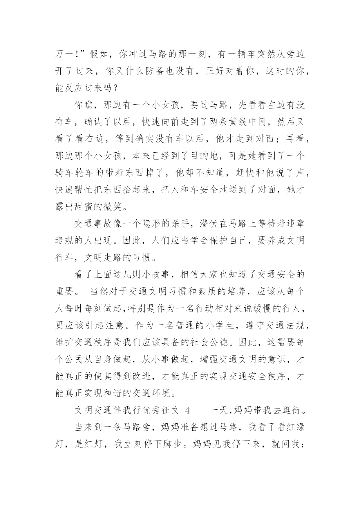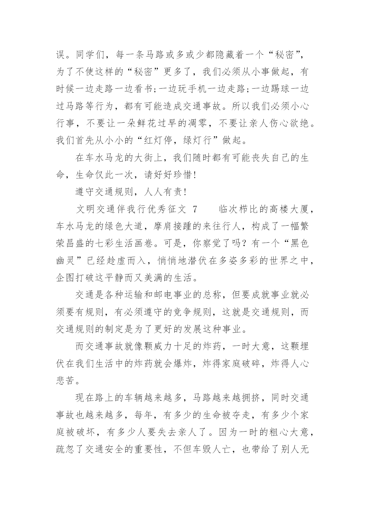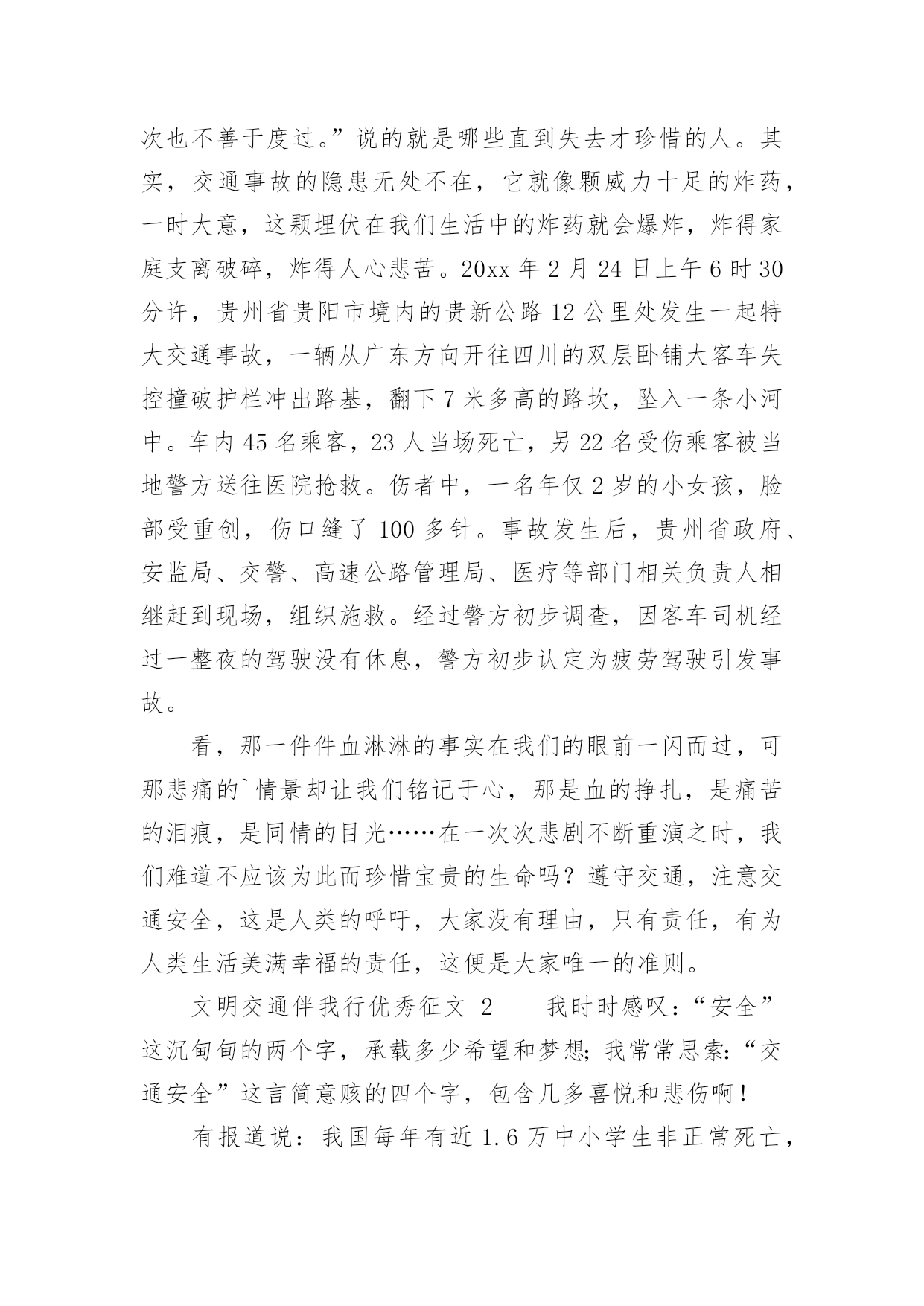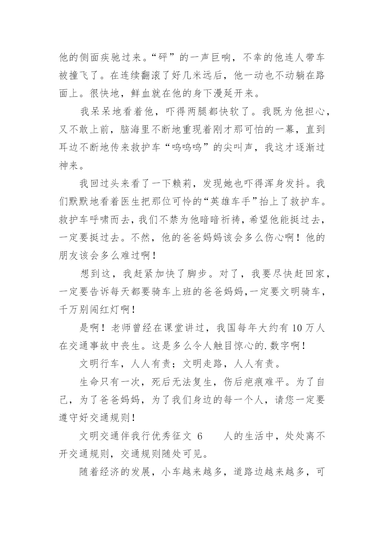 文明交通伴我行优秀征文文明交通伴我行优秀征文(精选21篇)在生活、工作和学习中,大家都经常看到征文的身影吧,借助征文人们可以实现文化交流的目的。一篇什么样的征文才能称之为优秀征文呢?下面是小编帮大家整理的文明交通伴我行优秀征文,欢迎阅读与收藏。文明交通伴我行优秀征文1人的生命是可贵的,人的生命更是极其脆弱的。伴随着人类的进步,社会的发展和科学技术的不断更新,人们生活的现实环境也在发生着翻天覆地的变化。一条条宽阔的马路,一辆辆奔驰的汽车……今天,四通八达的交通网络带来的方便和快捷,促进了现代社会的飞速发展,但随之而来的是那一幕幕鲜血淋漓的人间惨剧。交通事故频繁发生,却极少有人关注到生命的脆弱和交通安全的重要性。在中国每5分钟就有1人因车祸死亡,每1分钟就有1人因车祸伤残,每天死亡人数达到280多人,每年死亡10万多人,全球车祸累计死亡3000多万人。然而,很多人对这一连串惊人的数据却无动于衷,并非交通安全知识宣传力度不够,家长、老师从小学到大学无时无刻、无处不在地提醒我们要注意交通安全,珍爱生命。但就是有人不把这一切放在心上,非得等到惨剧降至自身上才后悔不已。吕凯特曾经说过:“生命不可能有两次,但许多人连一次也不善于度过。”说的就是哪些直到失去才珍惜的人。其实,交通事故的隐患无处不在,它就像颗威力十足的炸药,一时大意,这颗埋伏在我们生活中的炸药就会爆炸,炸得家庭支离破碎,炸得人心悲苦。20xx年2月24日上午6时30分许,贵州省贵阳市境内的贵新公路12公里处发生一起特大交通事故,一辆从广东方向开往四川的双层卧铺大客车失控撞破护栏冲出路基,翻下7米多高的路坎,坠入一条小河中。车内45名乘客,23人当场死亡,另22名受伤乘客被当地警方送往医院抢救。伤者中,一名年仅2岁的小女孩,脸部受重创,伤口缝了100多针。事故发生后,贵州省政府、安监局、交警、高速公路管理局、医疗等部门相关负责人相继赶到现场,组织施救。经过警方初步调查,因客车司机经过一整夜的驾驶没有休息,警方初步认定为疲劳驾驶引发事故。看,那一件件血淋淋的事实在我们的眼前一闪而过,可那悲痛的`情景却让我们铭记于心,那是血的挣扎,是痛苦的泪痕,是同情的目光……在一次次悲剧不断重演之时,我们难道不应该为此而珍惜宝贵的生命吗?遵守交通,注意交通安全,这是人类的呼吁,大家没有理由,只有责任,有为人类生活美满幸福的责任,这便是大家唯一的准则。文明交通伴我行优秀征文2我时时感叹:“安全”这沉甸甸的两个字,承载多少希望和梦想;我常常思索:“交通安全”这言简意赅的四个字,包含几多喜悦和悲伤啊!有报道说:我国每年有近1.6万中小学生非正常死亡,那么每天都有近40名学生意外死亡,相当于每天减少一个班级。这可怕的数字!真叫人触目惊心。每天我们行走在马路上,会时常发现有人骑自行车逆行,有人乱闯红灯横穿马路,有人坐在车里把手伸出窗外,还有的人明知车超载,硬往车上挤……交通违规的例子,不胜枚举。母亲给予了我们生命,让我们能自由呼吸,不断成长,看到了一路的好风景……今天的我们不正是冉冉升起的初阳吗?充满青春活力,散发蓬勃朝气,但是,您可曾想过,当我们离开母亲的怀抱,独立行走在人生道路上时,我们如此美妙的生命靠的是什么?我思来想去,归结成两个字:安全!是“安全”这把拐杖扞卫着我们的生命,维护我们生存的权利。生命是美好的。不讲安全的生存是危险的。在我看来,安全是幸福,为家庭带来欢笑;安全是快乐,让生活充满希望;安全是健康,给你健全的体魄,安全是激情,创造世界,书写历史。金钱诚可贵,速度价更高,若为安全故,二者皆可抛。通江县广钠小学楼道里学生遭遇踩踏时凄厉的惨叫声,江西沁源县二中学生晨练时被拉煤车碾压的'血腥画面,我分明感到,那一个个曾经青春如我,鲜亮如我的生命在逝去时是多么无奈与不甘。这一连串发生在我们身边的并不遥远的事故在以血的代价向我们诉说,威胁人类生命的杀手不是疾病,不是天灾,而是我们忽视交通安全的观念。我们作为一个鲜活的驾驭者,难道不该为自己高贵却又易碎的生命之舟保驾护航吗?时光飞逝,岁月轮回,从欢乐到悲伤,从成功到失败,生与死的距离何其遥远却又何其相近:也许就是你一个偶然的疏忽,一个盲目的行为,一丝侥幸的心理,让生命瞬间付出了昂贵代价,终生无法弥补!生命的河流,需要“交通安全”做坚固的护堤;生命的画卷,需要“交通安全”这枝笔来描绘。生命的鲜花,需要“交通安全”的绿叶衬出其千娇百媚!让我们从现在开始,用生命的全部力量,唱响安全主旋律,谱写时代新篇章!文明交通伴我行优秀征文3交通安全”这个词相信大家都很熟悉并不陌生,因为从我们刚会走路到上一年级开始,爸爸妈妈、老师就一直嘱咐我们“注意交通安全”“过马路的时候要左右看”。行走时的一次走神,过马路时的一次侥幸,开车时的一次违章,仅仅是一次小小的疏忽,这一切都