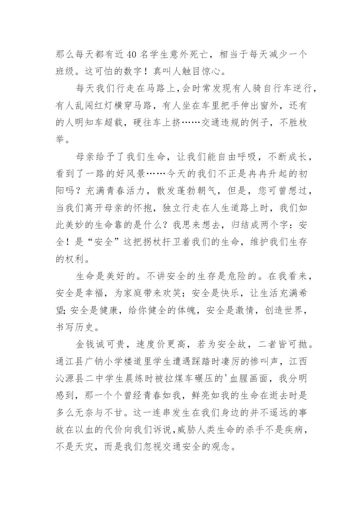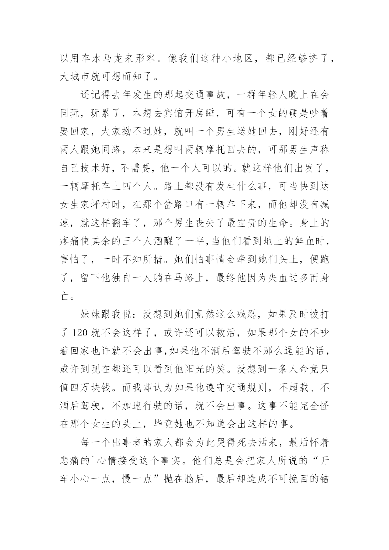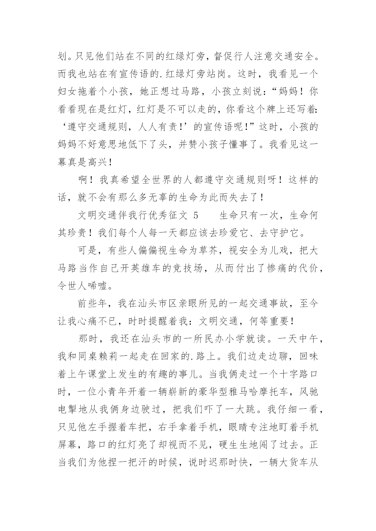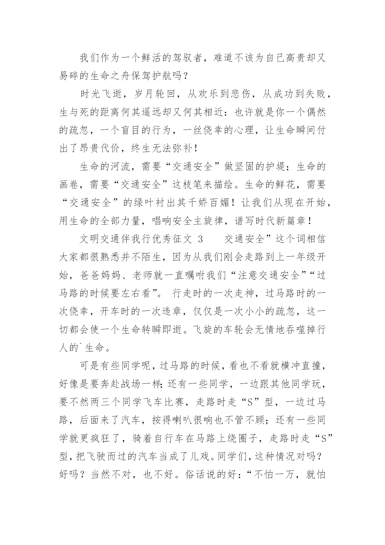 文明交通伴我行优秀征文文明交通伴我行优秀征文(精选21篇)在生活、工作和学习中,大家都经常看到征文的身影吧,借助征文人们可以实现文化交流的目的。一篇什么样的征文才能称之为优秀征文呢?下面是小编帮大家整理的文明交通伴我行优秀征文,欢迎阅读与收藏。文明交通伴我行优秀征文1人的生命是可贵的,人的生命更是极其脆弱的。伴随着人类的进步,社会的发展和科学技术的不断更新,人们生活的现实环境也在发生着翻天覆地的变化。一条条宽阔的马路,一辆辆奔驰的汽车……今天,四通八达的交通网络带来的方便和快捷,促进了现代社会的飞速发展,但随之而来的是那一幕幕鲜血淋漓的人间惨剧。交通事故频繁发生,却极少有人关注到生命的脆弱和交通安全的重要性。在中国每5分钟就有1人因车祸死亡,每1分钟就有1人因车祸伤残,每天死亡人数达到280多人,每年死亡10万多人,全球车祸累计死亡3000多万人。然而,很多人对这一连串惊人的数据却无动于衷,并非交通安全知识宣传力度不够,家长、老师从小学到大学无时无刻、无处不在地提醒我们要注意交通安全,珍爱生命。但就是有人不把这一切放在心上,非得等到惨剧降至自身上才后悔不已。吕凯特曾经说过:“生命不可能有两次,但许多人连一次也不善于度过。”说的就是哪些直到失去才珍惜的人。其实,交通事故的隐患无处不在,它就像颗威力十足的炸药,一时大意,这颗埋伏在我们生活中的炸药就会爆炸,炸得家庭支离破碎,炸得人心悲苦。20xx年2月24日上午6时30分许,贵州省贵阳市境内的贵新公路12公里处发生一起特大交通事故,一辆从广东方向开往四川的双层卧铺大客车失控撞破护栏冲出路基,翻下7米多高的路坎,坠入一条小河中。车内45名乘客,23人当场死亡,另22名受伤乘客被当地警方送往医院抢救。伤者中,一名年仅2岁的小女孩,脸部受重创,伤口缝了100多针。事故发生后,贵州省政府、安监局、交警、高速公路管理局、医疗等部门相关负责人相继赶到现场,组织施救。经过警方初步调查,因客车司机经过一整夜的驾驶没有休息,警方初步认定为疲劳驾驶引发事故。看,那一件件血淋淋的事实在我们的眼前一闪而过,可那悲痛的`情景却让我们铭记于心,那是血的挣扎,是痛苦的泪痕,是同情的目光……在一次次悲剧不断重演之时,我们难道不应该为此而珍惜宝贵的生命吗?遵守交通,注意交通安全,这是人类的呼吁,大家没有理由,只有责任,有为人类生活美满幸福的责任,这便是大家唯一的准则。文明交通伴我行优秀征文2我时时感叹:“安全”这沉甸甸的两个字,承载多少希望和梦想;我常常思索:“交通安全”这言简意赅的四个字,包含几多喜悦和悲伤啊!有报道说:我国每年有近1.6万中小学生非正常死亡,那么每天都有近40名学生意外死亡,相当于每天减少一个班级。这可怕的数字!真叫人触目惊心。每天我们行走在马路上,会时常发现有人骑自行车逆行,有人乱闯红灯横穿马路,有人坐在车里把手伸出窗外,还有的人明知车超载,硬往车上挤……交通违规的例子,不胜枚举。母亲给予了我们生命,让我们能自由呼吸,不断成长,看到了一路的好风景……今天的我们不正是冉冉升起的初阳吗?充满青春活力,散发蓬勃朝气,但是,您可曾想过,当我们离开母亲的怀抱,独立行走在人生道路上时,我们如此美妙的生命靠的是什么?我思来想去,归结成两个字:安全!是“安全”这把拐杖扞卫着我们的生命,维护我们生存的权利。生命是美好的。不讲安全的生存是危险的。在我看来,安全是幸福,为家庭带来欢笑;安全是快乐,让生活充满希望;安全是健康,给你健全的体魄,安全是激情,创造世界,书写历史。金钱诚可贵,速度价更高,若为安全故,二者皆可抛。通江县广钠小学楼道里学生遭遇踩踏时凄厉的惨叫声,江西沁源县二中学生晨练时被拉煤车碾压的'血腥画面,我分明感到,那一个个曾经青春如我,鲜亮如我的生命在逝去时是多么无奈与不甘。这一连串发生在我们身边的并不遥远的事故在以血的代价向我们诉说,威胁人类生命的杀手不是疾病,不是天灾,而是我们忽视交通安全的观念。我们作为一个鲜活的驾驭者,难道不该为自己高贵却又易碎的生命之舟保驾护航吗?时光飞逝,岁月轮回,从欢乐到悲伤,从成功到失败,生与死的距离何其遥远却又何其相近:也许就是你一个偶然的疏忽,一个盲目的行为,一丝侥幸的心理,让生命瞬间付出了昂贵代价,终生无法弥补!生命的河流,需要“交通安全”做坚固的护堤;生命的画卷,需要“交通安全”这枝笔来描绘。生命的鲜花,需要“交通安全”的绿叶衬出其千娇百媚!让我们从现在开始,用生命的全部力量,唱响安全主旋律,谱写时代新篇章!文明交通伴我行优秀征文3交通安全”这个词相信大家都很熟悉并不陌生,因为从我们刚会走路到上一年级开始,爸爸妈妈、老师就一直嘱咐我们“注意交通安全”“过马路的时候要左右看”。行走时的一次走神,过马路时的一次侥幸,开车时的一次违章,仅仅是一次小小的疏忽,这一切都