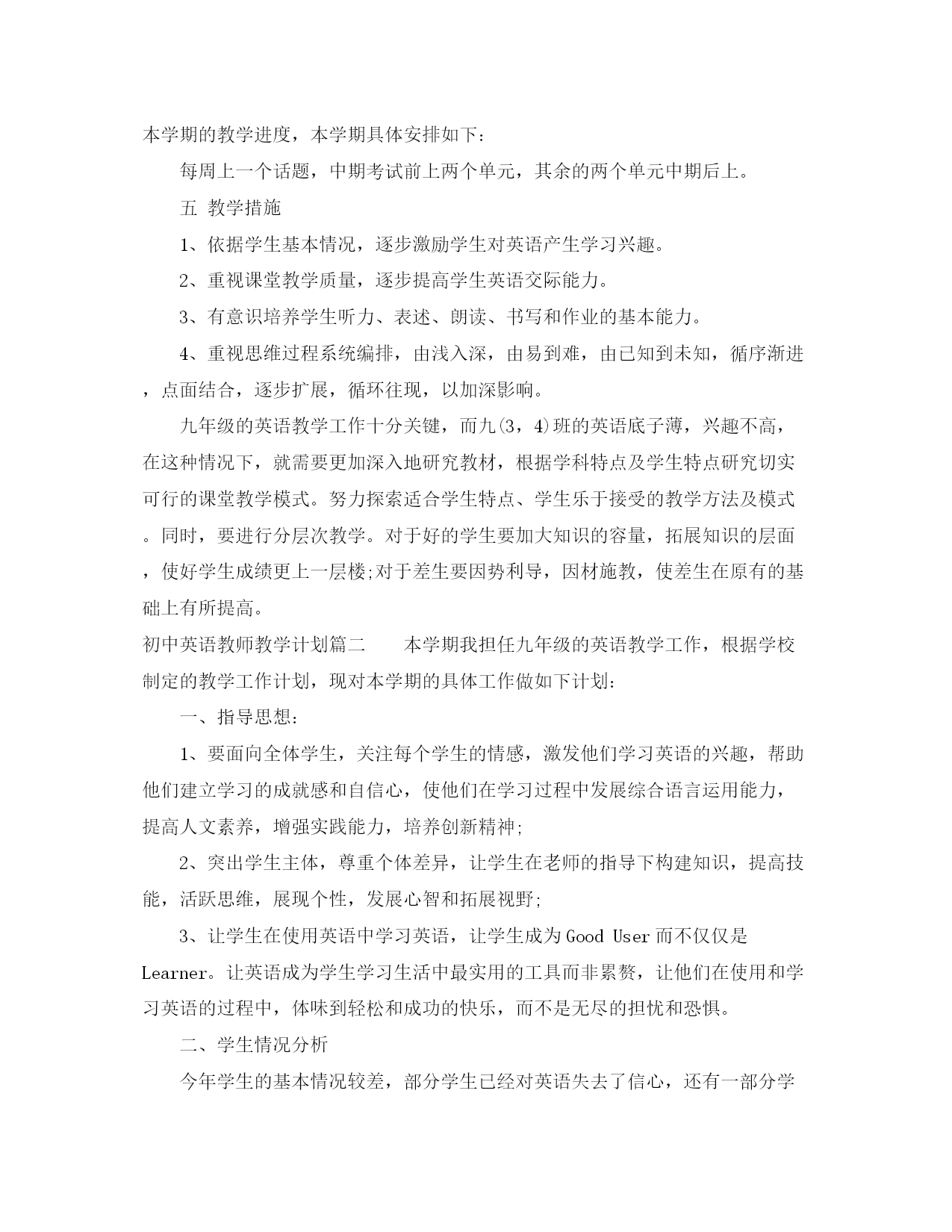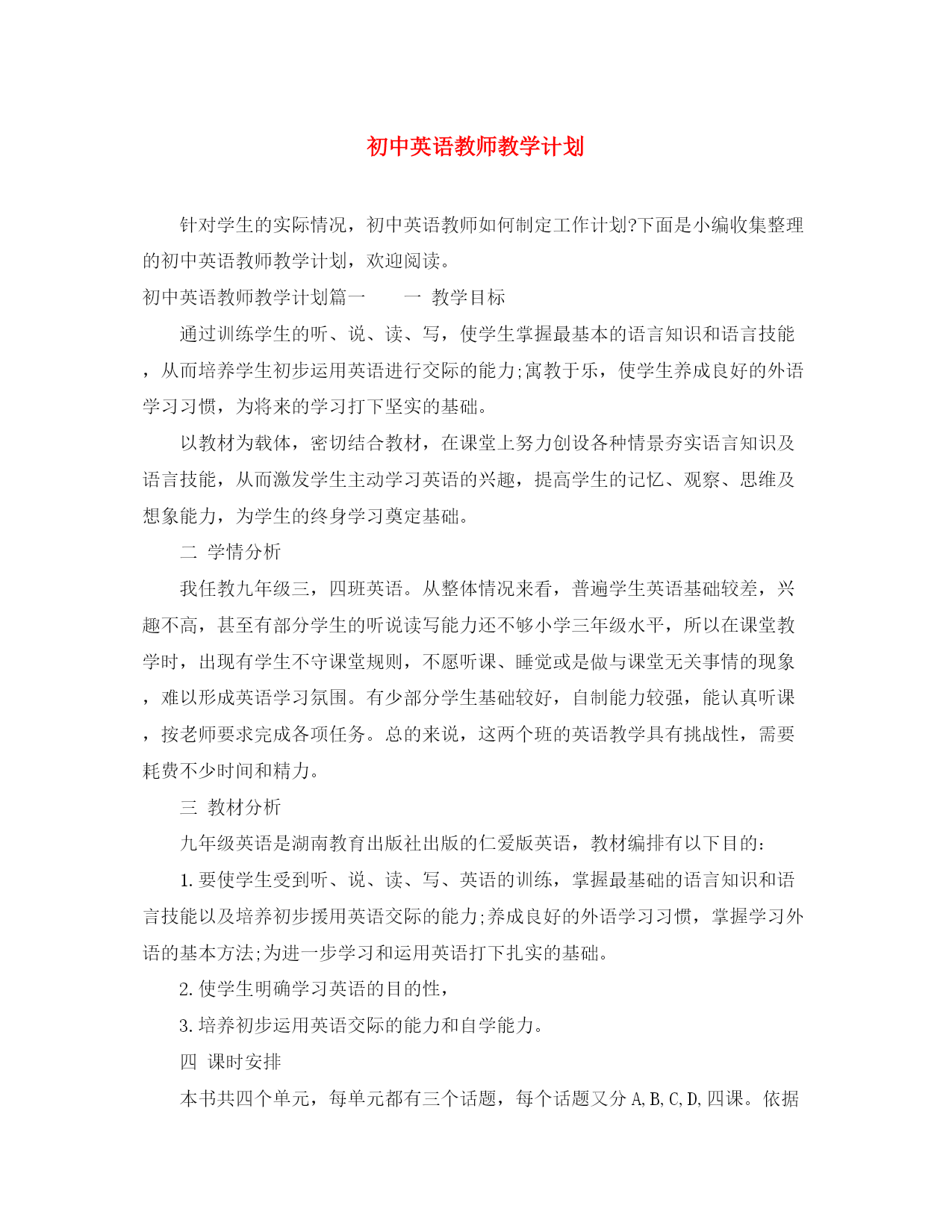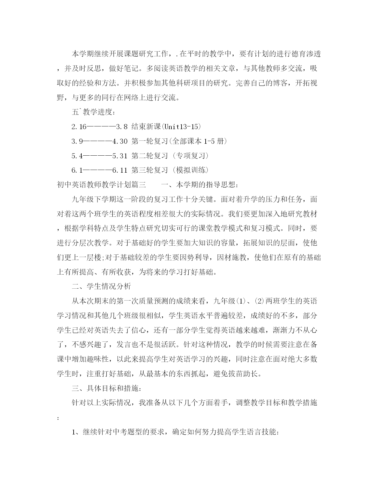 此资料由网络收集而来,如有侵权请告知上传者立即删除。资料共分享,我们负责传递知识。初中英语教师教学计划针对学生的实际情况,初中英语教师如何制定工作计划?下面是小编收集整理的初中英语教师教学计划,欢迎阅读。初中英语教师教学计划篇一一教学目标通过训练学生的听、说、读、写,使学生掌握最基本的语言知识和语言技能,从而培养学生初步运用英语进行交际的能力;寓教于乐,使学生养成良好的外语学习习惯,为将来的学习打下坚实的基础。以教材为载体,密切结合教材,在课堂上努力创设各种情景夯实语言知识及语言技能,从而激发学生主动学习英语的兴趣,提高学生的记忆、观察、思维及想象能力,为学生的终身学习奠定基础。二学情分析我任教九年级三,四班英语。从整体情况来看,普遍学生英语基础较差,兴趣不高,甚至有部分学生的听说读写能力还不够小学三年级水平,所以在课堂教学时,出现有学生不守课堂规则,不愿听课、睡觉或是做与课堂无关事情的现象,难以形成英语学习氛围。有少部分学生基础较好,自制能力较强,能认真听课,按老师要求完成各项任务。总的来说,这两个班的英语教学具有挑战性,需要耗费不少时间和精力。三教材分析九年级英语是湖南教育出版社出版的仁爱版英语,教材编排有以下目的:1.要使学生受到听、说、读、写、英语的训练,掌握最基础的语言知识和语言技能以及培养初步援用英语交际的能力;养成良好的外语学习习惯,掌握学习外语的基本方法;为进一步学习和运用英语打下扎实的基础。2.使学生明确学习英语的目的性,3.培养初步运用英语交际的能力和自学能力。四课时安排本书共四个单元,每单元都有三个话题,每个话题又分A,B,C,D,四课。依据本学期的教学进度,本学期具体安排如下:每周上一个话题,中期考试前上两个单元,其余的两个单元中期后上。五教学措施1、依据学生基本情况,逐步激励学生对英语产生学习兴趣。2、重视课堂教学质量,逐步提高学生英语交际能力。3、有意识培养学生听力、表述、朗读、书写和作业的基本能力。4、重视思维过程系统编排,由浅入深,由易到难,由已知到未知,循序渐进,点面结合,逐步扩展,循环往现,以加深影响。九年级的英语教学工作十分关键,而九(3,4)班的英语底子薄,兴趣不高,在这种情况下,就需要更加深入地研究教材,根据学科特点及学生特点研究切实可行的课堂教学模式。努力探索适合学生特点、学生乐于接受的教学方法及模式。同时,要进行分层次教学。对于好的学生要加大知识的容量,拓展知识的层面,使好学生成绩更上一层楼;对于差生要因势利导,因材施教,使差生在原有的基础上有所提高。初中英语教师教学计划篇二本学期我担任九年级的英语教学工作,根据学校制定的教学工作计划,现对本学期的具体工作做如下计划:一、指导思想:1、要面向全体学生,关注每个学生的情感,激发他们学习英语的兴趣,帮助他们建立学习的成就感和自信心,使他们在学习过程中发展综合语言运用能力,提高人文素养,增强实践能力,培养创新精神;2、突出学生主体,尊重个体差异,让学生在老师的指导下构建知识,提高技能,活跃思维,展现个性,发展心智和拓展视野;3、让学生在使用英语中学习英语,让学生成为GoodUser而不仅仅是Learner。让英语成为学生学习生活中最实用的工具而非累赘,让他们在使用和学习英语的过程中,体味到轻松和成功的快乐,而不是无尽的担忧和恐惧。二、学生情况分析今年学生的基本情况较差,部分学生已经对英语失去了信心,还有一部分学生觉得英语越来越难,渐渐力不从心了,不感兴趣了。针对这种情况,教学的时候需要注意在备课中增加基础性和趣味性,以此来提高学生对英语学习的兴趣。三、教学措施我根据近几年中考试题新特点及学生实际情况,采取“三轮复习法”作为毕业班的总复习计划,“三轮复习法”要求先全面学习,后进行重点复习和适应性考试复习。做到着眼全面,突出重点,点面结合,把全面复习和重点复习有机结合起来。这样既系统全面又有所侧面的复习,能使学生较好地掌握所学的知识考出优异成绩。第一轮复习针对学生对已学基础知识,因时间久,部分已遗忘的共性,要求学生一步一个脚印,扎扎实实搞好基础知识的复习。这一阶段按教材顺序归纳语言点,讲透语言点运用,对各单元的知识要点进行梳理,同时应注重基础词汇、词组、句型的过关(从近几年中招试题看,逐渐加强词汇、词组的考查)并通过配套练习、复习检测形成能力。在复习过程中,还要采取一些必要的措施来巩固和增强复习效果。如做到:(一)根据复习内容,布置适量的难度适中的练习;(二)循环考试,即每学完一部分后,进行阶段性测试,对试卷进行评分登记,以充分调动学生的学习积极性和自觉性。(时间:3-4月)第二轮复习要求突出重点,牢固掌握,进行专项训练。在总揽教材,学生对基础知识掌握得比较扎实基础上,相应地提