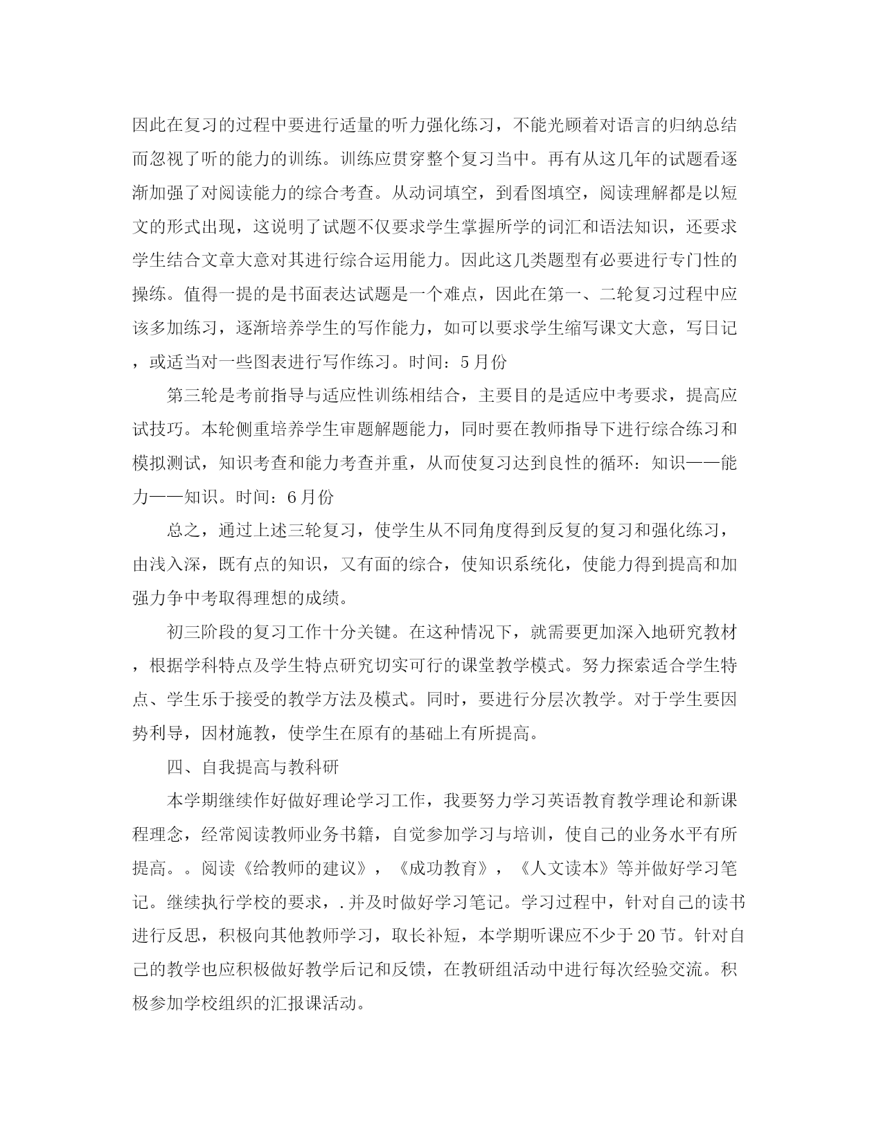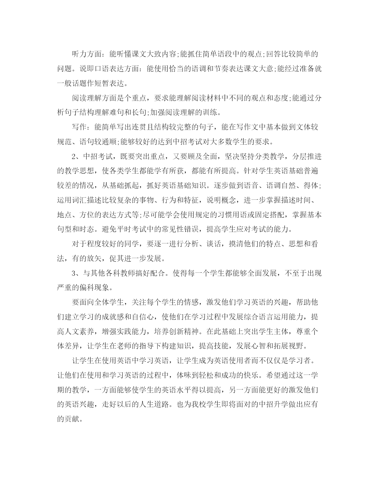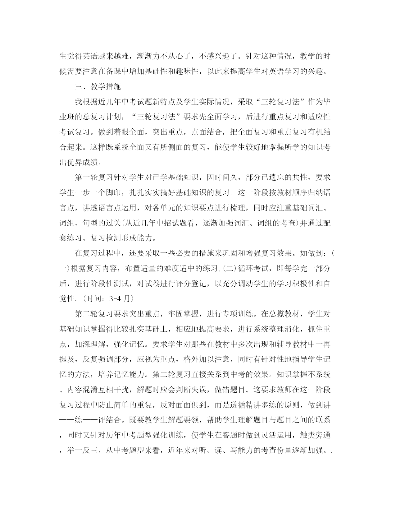 此资料由网络收集而来,如有侵权请告知上传者立即删除。资料共分享,我们负责传递知识。初中英语教师教学计划针对学生的实际情况,初中英语教师如何制定工作计划?下面是小编收集整理的初中英语教师教学计划,欢迎阅读。初中英语教师教学计划篇一一教学目标通过训练学生的听、说、读、写,使学生掌握最基本的语言知识和语言技能,从而培养学生初步运用英语进行交际的能力;寓教于乐,使学生养成良好的外语学习习惯,为将来的学习打下坚实的基础。以教材为载体,密切结合教材,在课堂上努力创设各种情景夯实语言知识及语言技能,从而激发学生主动学习英语的兴趣,提高学生的记忆、观察、思维及想象能力,为学生的终身学习奠定基础。二学情分析我任教九年级三,四班英语。从整体情况来看,普遍学生英语基础较差,兴趣不高,甚至有部分学生的听说读写能力还不够小学三年级水平,所以在课堂教学时,出现有学生不守课堂规则,不愿听课、睡觉或是做与课堂无关事情的现象,难以形成英语学习氛围。有少部分学生基础较好,自制能力较强,能认真听课,按老师要求完成各项任务。总的来说,这两个班的英语教学具有挑战性,需要耗费不少时间和精力。三教材分析九年级英语是湖南教育出版社出版的仁爱版英语,教材编排有以下目的:1.要使学生受到听、说、读、写、英语的训练,掌握最基础的语言知识和语言技能以及培养初步援用英语交际的能力;养成良好的外语学习习惯,掌握学习外语的基本方法;为进一步学习和运用英语打下扎实的基础。2.使学生明确学习英语的目的性,3.培养初步运用英语交际的能力和自学能力。四课时安排本书共四个单元,每单元都有三个话题,每个话题又分A,B,C,D,四课。依据本学期的教学进度,本学期具体安排如下:每周上一个话题,中期考试前上两个单元,其余的两个单元中期后上。五教学措施1、依据学生基本情况,逐步激励学生对英语产生学习兴趣。2、重视课堂教学质量,逐步提高学生英语交际能力。3、有意识培养学生听力、表述、朗读、书写和作业的基本能力。4、重视思维过程系统编排,由浅入深,由易到难,由已知到未知,循序渐进,点面结合,逐步扩展,循环往现,以加深影响。九年级的英语教学工作十分关键,而九(3,4)班的英语底子薄,兴趣不高,在这种情况下,就需要更加深入地研究教材,根据学科特点及学生特点研究切实可行的课堂教学模式。努力探索适合学生特点、学生乐于接受的教学方法及模式。同时,要进行分层次教学。对于好的学生要加大知识的容量,拓展知识的层面,使好学生成绩更上一层楼;对于差生要因势利导,因材施教,使差生在原有的基础上有所提高。初中英语教师教学计划篇二本学期我担任九年级的英语教学工作,根据学校制定的教学工作计划,现对本学期的具体工作做如下计划:一、指导思想:1、要面向全体学生,关注每个学生的情感,激发他们学习英语的兴趣,帮助他们建立学习的成就感和自信心,使他们在学习过程中发展综合语言运用能力,提高人文素养,增强实践能力,培养创新精神;2、突出学生主体,尊重个体差异,让学生在老师的指导下构建知识,提高技能,活跃思维,展现个性,发展心智和拓展视野;3、让学生在使用英语中学习英语,让学生成为GoodUser而不仅仅是Learner。让英语成为学生学习生活中最实用的工具而非累赘,让他们在使用和学习英语的过程中,体味到轻松和成功的快乐,而不是无尽的担忧和恐惧。二、学生情况分析今年学生的基本情况较差,部分学生已经对英语失去了信心,还有一部分学生觉得英语越来越难,渐渐力不从心了,不感兴趣了。针对这种情况,教学的时候需要注意在备课中增加基础性和趣味性,以此来提高学生对英语学习的兴趣。三、教学措施我根据近几年中考试题新特点及学生实际情况,采取“三轮复习法”作为毕业班的总复习计划,“三轮复习法”要求先全面学习,后进行重点复习和适应性考试复习。做到着眼全面,突出重点,点面结合,把全面复习和重点复习有机结合起来。这样既系统全面又有所侧面的复习,能使学生较好地掌握所学的知识考出优异成绩。第一轮复习针对学生对已学基础知识,因时间久,部分已遗忘的共性,要求学生一步一个脚印,扎扎实实搞好基础知识的复习。这一阶段按教材顺序归纳语言点,讲透语言点运用,对各单元的知识要点进行梳理,同时应注重基础词汇、词组、句型的过关(从近几年中招试题看,逐渐加强词汇、词组的考查)并通过配套练习、复习检测形成能力。在复习过程中,还要采取一些必要的措施来巩固和增强复习效果。如做到:(一)根据复习内容,布置适量的难度适中的练习;(二)循环考试,即每学完一部分后,进行阶段性测试,对试卷进行评分登记,以充分调动学生的学习积极性和自觉性。(时间:3-4月)第二轮复习要求突出重点,牢固掌握,进行专项训练。在总揽教材,学生对基础知识掌握得比较扎实基础上,相应地提