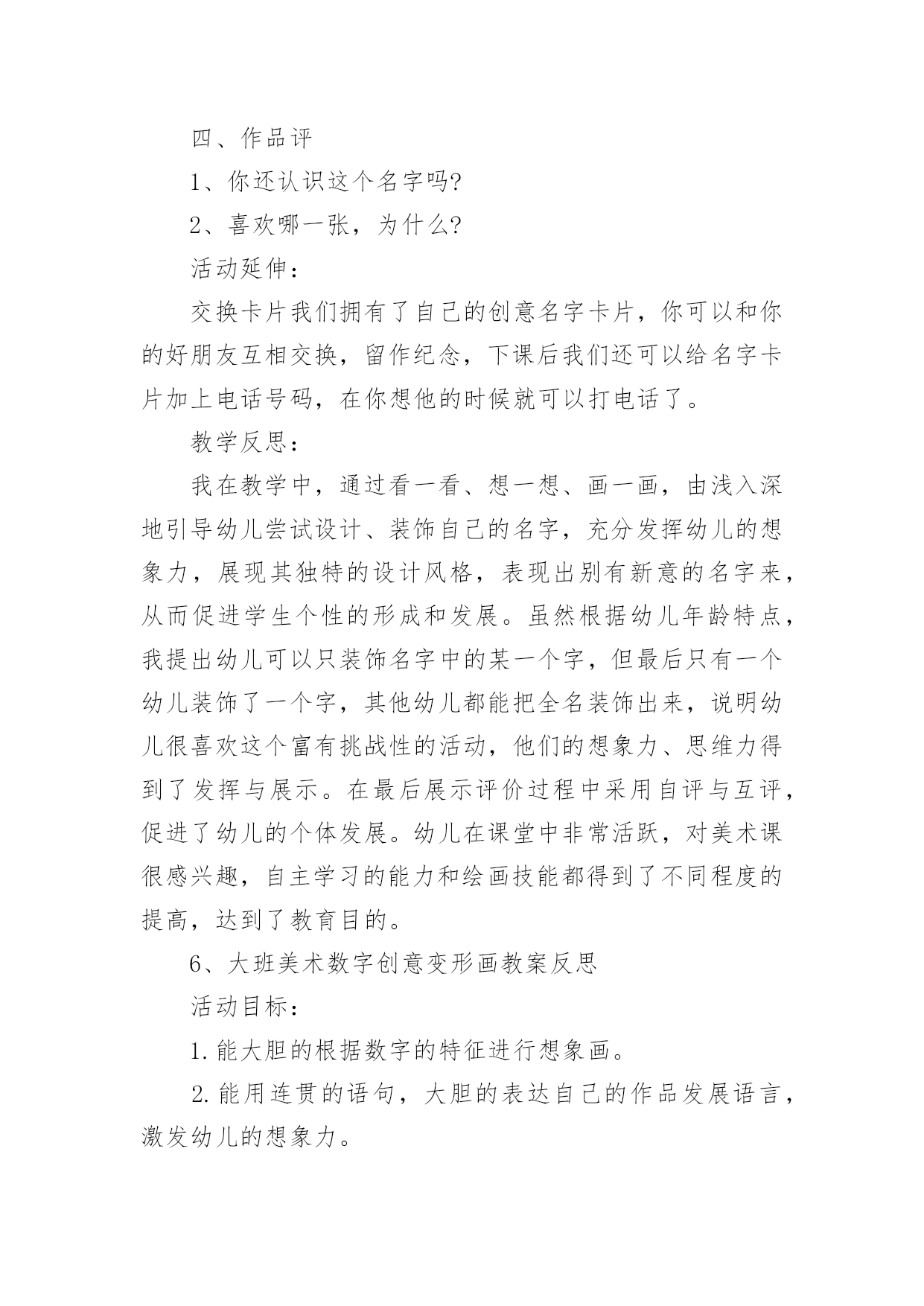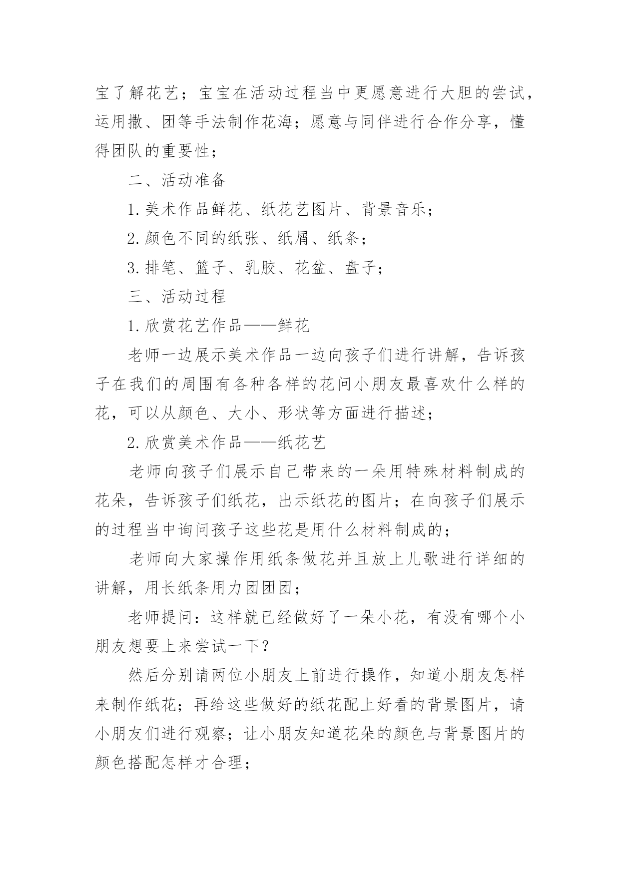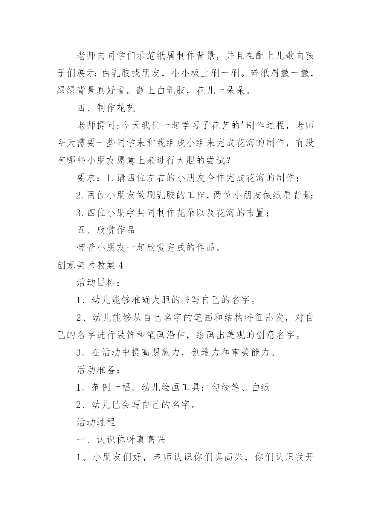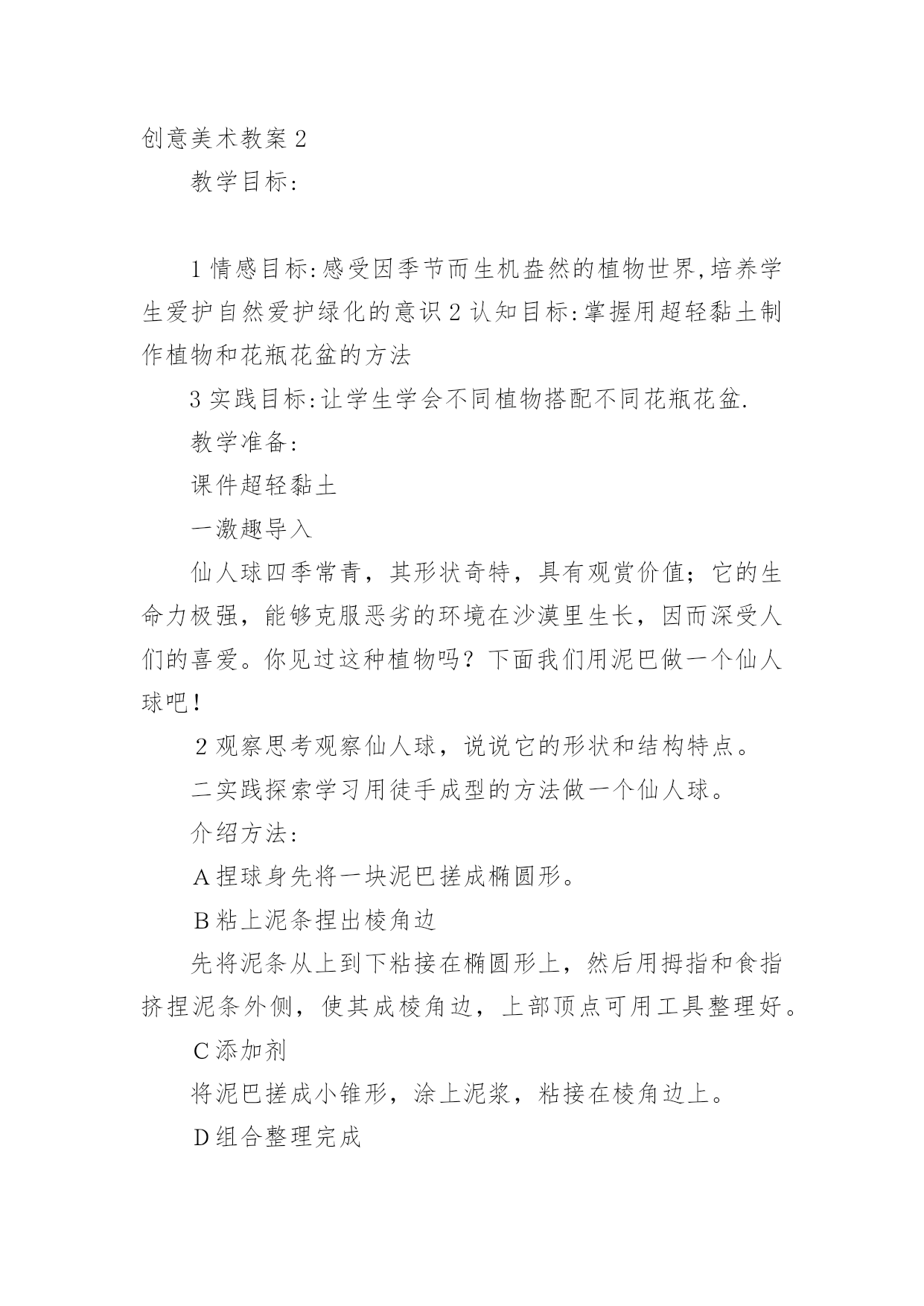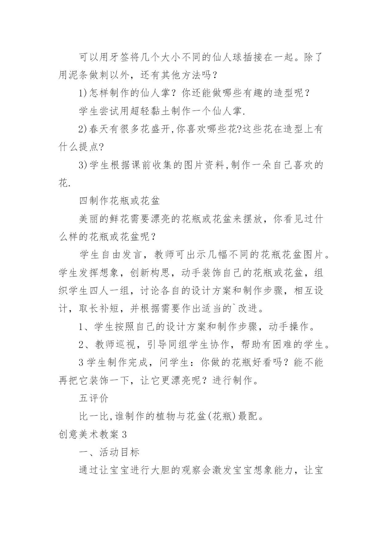 创意美术教案创意美术教案【精选】作为一名辛苦耕耘的教育工作者,常常需要准备教案,教案是教材及大纲与课堂教学的纽带和桥梁。教案要怎么写呢?下面是小编帮大家整理的创意美术教案,欢迎大家借鉴与参考,希望对大家有所帮助。创意美术教案1活动目标:1、在说说画画中让幼儿感受家人间互相关爱的情感。2、能正确使用剪刀沿轮廓剪出自己所画的图案,并进行粘贴。3、运用水粉对作品进行装饰,感受不同绘画工具所带来的不同效果。活动准备:1、素描纸、蓝色卡纸、油画棒、勾线笔、剪刀、胶水、水粉、排笔2、《让爱住我家》的音乐活动过程:一、导入活动1、幼儿一起表演唱《让爱住我家》2、我们家里都有哪些人呢?二、感受活动1、幼儿介绍一个自己最爱的人,说说为什么?(最爱奶奶,因为奶奶和我一起的时间最长。妈妈,因为妈妈最关心我…)2、听了我们小朋友的介绍,发现我们都很幸福是吗?有那么多的人关心你,爱你,那我们小朋友是怎么爱家人的呢?3、幼儿发言(给妈妈倒水、给爸爸打电话、自己很乖,不烦妈妈……)4、我们都生活在幸福的大家庭里,有那么多的人爱我们,我们也要关心他们,让他们知道我们也是爱他们的。三、操作活动1、现在我们就把自己和所爱的家人都画在画纸上,记住要把家里人的特征画出来哦!2、幼儿绘画,教师巡回指导,强调幼儿画出家里亲人的'特征。(音乐)3、、幼儿把画好的一家人留白边剪下,贴在深蓝色卡纸上。4、幼儿操作,教师巡回指导,对独立完成有困难的幼儿,重点辅导。5、幼儿用水粉对作品进行最后的装饰。四、作品展示1、幼儿将作品贴在活动室的展览壁上,布置起来,让幼儿欣赏。2、幼儿试着评选自己最喜欢的作品。创意美术教案2教学目标:1情感目标:感受因季节而生机盎然的植物世界,培养学生爱护自然爱护绿化的意识2认知目标:掌握用超轻黏土制作植物和花瓶花盆的方法3实践目标:让学生学会不同植物搭配不同花瓶花盆.教学准备:课件超轻黏土一激趣导入仙人球四季常青,其形状奇特,具有观赏价值;它的生命力极强,能够克服恶劣的环境在沙漠里生长,因而深受人们的喜爱。你见过这种植物吗?下面我们用泥巴做一个仙人球吧!2观察思考观察仙人球,说说它的形状和结构特点。二实践探索学习用徒手成型的方法做一个仙人球。介绍方法:A捏球身先将一块泥巴搓成椭圆形。B粘上泥条捏出棱角边先将泥条从上到下粘接在椭圆形上,然后用拇指和食指挤捏泥条外侧,使其成棱角边,上部顶点可用工具整理好。C添加剂将泥巴搓成小锥形,涂上泥浆,粘接在棱角边上。D组合整理完成可以用牙签将几个大小不同的仙人球插接在一起。除了用泥条做刺以外,还有其他方法吗?1)怎样制作的仙人掌?你还能做哪些有趣的造型呢?学生尝试用超轻黏土制作一个仙人掌.2)春天有很多花盛开,你喜欢哪些花?这些花在造型上有什么提点?3)学生根据课前收集的图片资料,制作一朵自己喜欢的花.四制作花瓶或花盆美丽的鲜花需要漂亮的花瓶或花盆来摆放,你看见过什么样的花瓶或花盆呢?学生自由发言,教师可出示几幅不同的花瓶花盆图片。学生发挥想象,创新构思,动手装饰自己的花瓶或花盆,组织学生四人一组,讨论各自的设计方案和制作步骤,相互设计,取长补短,并根据需要作出适当的`改进。1、学生按照自己的设计方案和制作步骤,动手操作。2、教师巡视,引导同组学生协作,帮助有困难的学生。3学生制作完成,问学生:你做的花瓶好看吗?能不能再把它装饰一下,让它更漂亮呢?进行制作。五评价比一比,谁制作的植物与花盆(花瓶)最配。创意美术教案3一、活动目标通过让宝宝进行大胆的观察会激发宝宝想象能力,让宝宝了解花艺;宝宝在活动过程当中更愿意进行大胆的尝试,运用撒、团等手法制作花海;愿意与同伴进行合作分享,懂得团队的重要性;二、活动准备1.美术作品鲜花、纸花艺图片、背景音乐;2.颜色不同的纸张、纸屑、纸条;3.排笔、篮子、乳胶、花盆、盘子;三、活动过程1.欣赏花艺作品——鲜花老师一边展示美术作品一边向孩子们进行讲解,告诉孩子在我们的周围有各种各样的花问小朋友最喜欢什么样的花,可以从颜色、大小、形状等方面进行描述;2.欣赏美术作品——纸花艺老师向孩子们展示自己带来的一朵用特殊材料制成的花朵,告诉孩子们纸花,出示纸花的图片;在向孩子们展示的过程当中询问孩子这些花是用什么材料制成的;老师向大家操作用纸条做花并且放上儿歌进行详细的讲解,用长纸条用力团团团;老师提问:这样就已经做好了一朵小花,有没有哪个小朋友想要上来尝试一下?然后分别请两位小朋友上前进行操作,知道小朋友怎样来制作纸花;再给这些做好的纸花配上好看的背景图片,请小朋友们进行观察;让小朋友知道花朵的颜色与背景图片的颜色搭配怎样才合理;老师向同学们示范纸屑制作背景,并且在配上儿歌向孩子们展示:白乳胶找朋友,小小板上刷一刷。碎纸屑撒一撒,绿绿背景真好看。蘸上白乳胶,花儿一朵朵。四、制作花艺老师提问