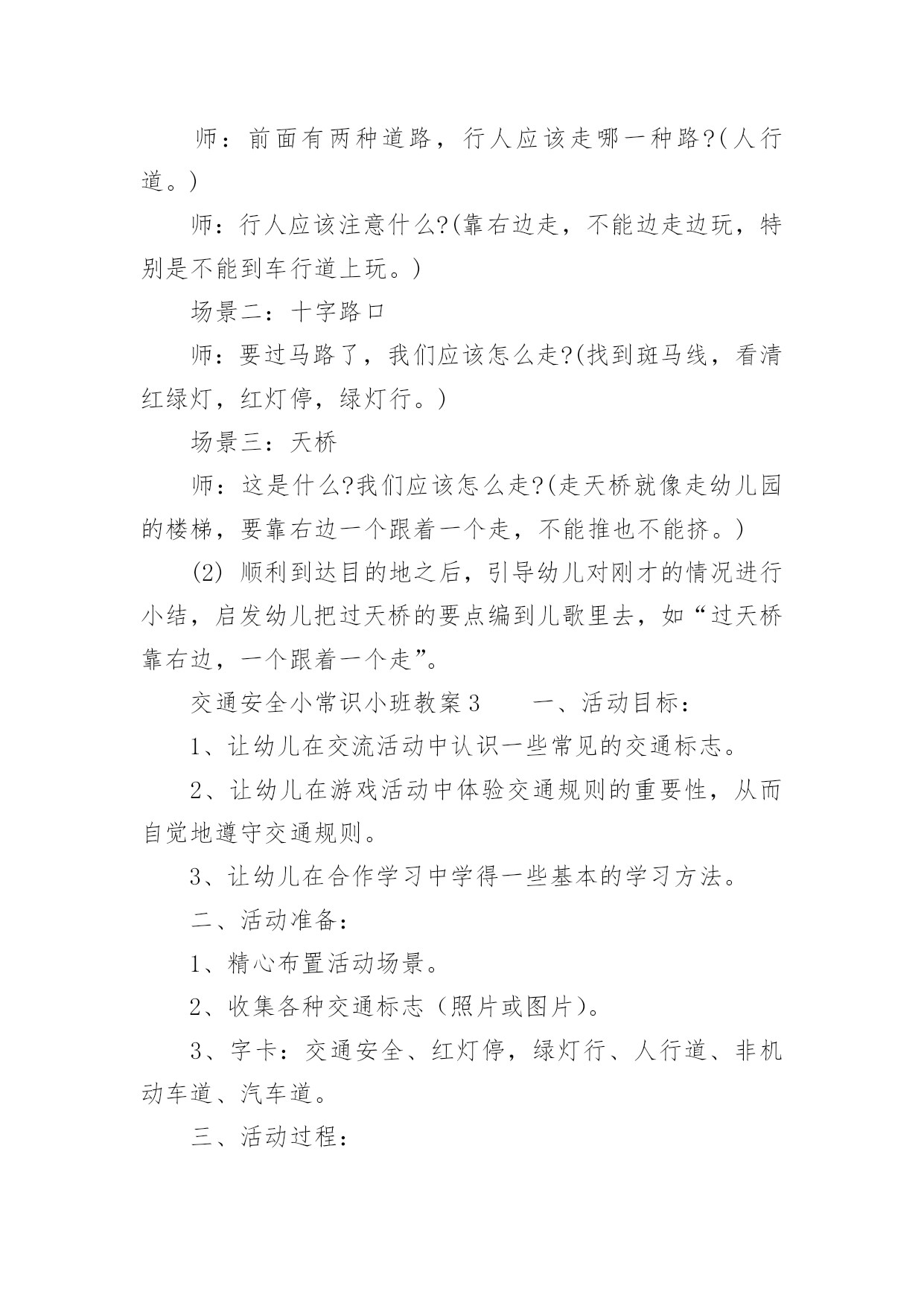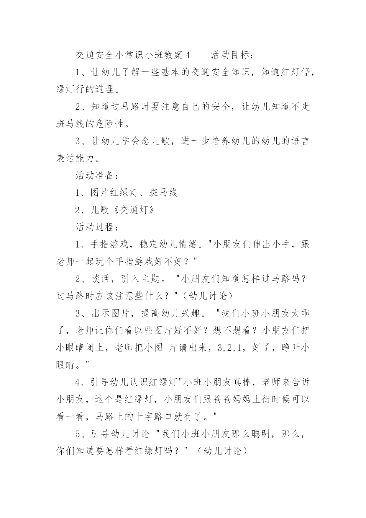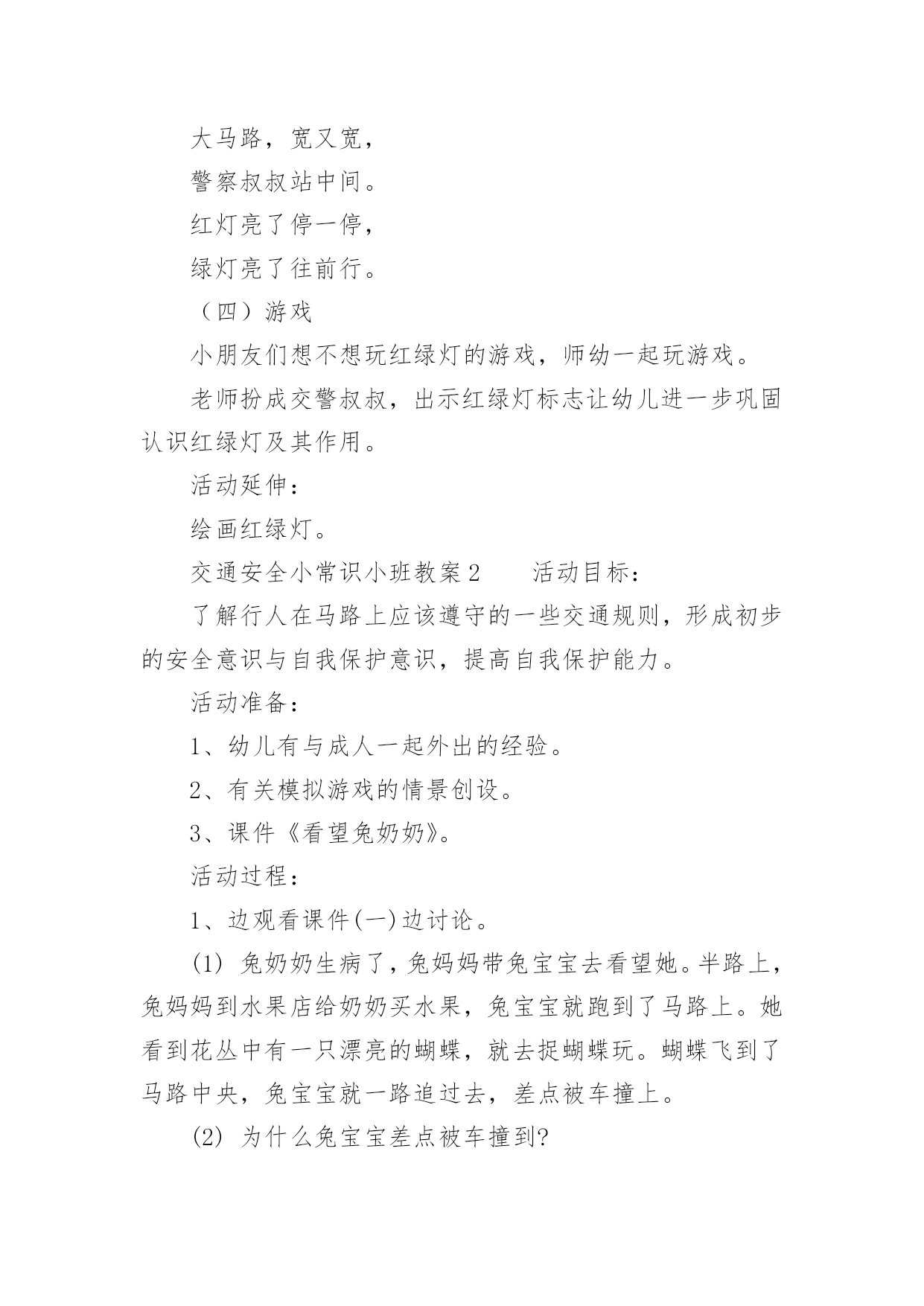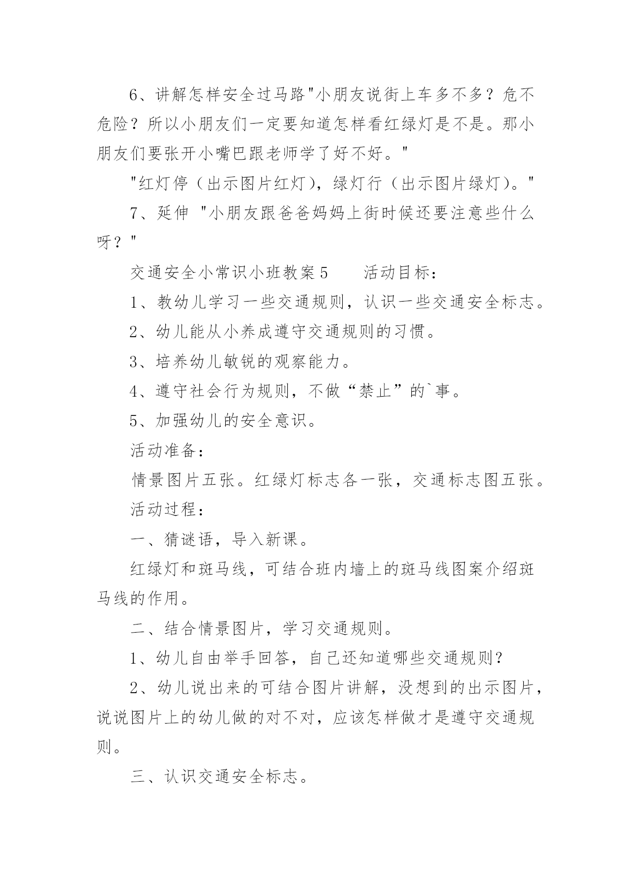 交通安全小常识小班教案交通安全小常识小班教案(通用8篇)在教学工作者实际的教学活动中,常常需要准备教案,编写教案有利于我们弄通教材内容,进而选择科学、恰当的教学方法。教案应该怎么写呢?下面是小编整理的交通安全小常识小班教案(通用8篇),欢迎大家分享。交通安全小常识小班教案1活动目标:1、注意安全,初步培养幼儿的自我保护意识。2、能认识简单的交通标记并了解安全通过马路应遵守的交通规则。活动准备:挂图四幅,红绿灯标牌各一个。视频资料活动过程:(一)导入:幼儿观看视频,引起幼儿注意。提问:发生了什么事?怎么发生的?(二)认识交通标志。1、出示挂图认识简单的交通标志:人行横道线、信号灯、停车线等。2、通过游戏《猜猜看》,来巩固对交通标志的认识。3、提问:如何过马路?安全过马路有什么好处?培养幼儿的自我保护意识。(三)学说儿歌《红绿灯》大马路,宽又宽,警察叔叔站中间。红灯亮了停一停,绿灯亮了往前行。(四)游戏小朋友们想不想玩红绿灯的游戏,师幼一起玩游戏。老师扮成交警叔叔,出示红绿灯标志让幼儿进一步巩固认识红绿灯及其作用。活动延伸:绘画红绿灯。交通安全小常识小班教案2活动目标:了解行人在马路上应该遵守的一些交通规则,形成初步的安全意识与自我保护意识,提高自我保护能力。活动准备:1、幼儿有与成人一起外出的经验。2、有关模拟游戏的情景创设。3、课件《看望兔奶奶》。活动过程:1、边观看课件(一)边讨论。(1)兔奶奶生病了,兔妈妈带兔宝宝去看望她。半路上,兔妈妈到水果店给奶奶买水果,兔宝宝就跑到了马路上。她看到花丛中有一只漂亮的蝴蝶,就去捉蝴蝶玩。蝴蝶飞到了马路中央,兔宝宝就一路追过去,差点被车撞上。(2)为什么兔宝宝差点被车撞到?(3)教师归纳:兔宝宝离开妈妈在马路上玩耍,差点被车撞上。这样太危险了,不管什么情况我们都不能在马路上玩。2、边观看课件(二)边讨论。(1)兔妈妈和兔宝宝继续往前走。奶奶家就在马路对面,兔宝宝兴奋地想冲过马路见奶奶,可是被兔妈妈一把拉住了。(2)兔妈妈为什么要拉住兔宝宝?过马路应该走哪里?(3)教师归纳:过马路要走斑马线。(4)十字路口有斑马线,行人是不是什么时候都可以走呢?什么时候可以走?(5)教师归纳:过十字路口要看红绿灯,红灯停,绿灯行。(6)兔妈妈和兔宝宝走到斑马线前,等绿灯亮时再穿过马路去奶奶家。3、小结:兔宝宝在路上遇到了一些危险,你们知道怎样才能避免那样的危险吗?(幼儿回答后,教师用自编儿歌进行归纳:小朋友,要牢记,走路要走人行道,路上玩耍不可以。过马路走斑马线,红灯停,绿灯行,确保安全是第一。)4、在情景模拟游戏“去春游”中或到马路上去实地体验。(1)带领幼儿一边走一边根据场景提问,巩固对交通规则的认识。场景一:人行道和车行道师:前面有两种道路,行人应该走哪一种路?(人行道。)师:行人应该注意什么?(靠右边走,不能边走边玩,特别是不能到车行道上玩。)场景二:十字路口师:要过马路了,我们应该怎么走?(找到斑马线,看清红绿灯,红灯停,绿灯行。)场景三:天桥师:这是什么?我们应该怎么走?(走天桥就像走幼儿园的楼梯,要靠右边一个跟着一个走,不能推也不能挤。)(2)顺利到达目的地之后,引导幼儿对刚才的情况进行小结,启发幼儿把过天桥的要点编到儿歌里去,如“过天桥靠右边,一个跟着一个走”。交通安全小常识小班教案3一、活动目标:1、让幼儿在交流活动中认识一些常见的交通标志。2、让幼儿在游戏活动中体验交通规则的重要性,从而自觉地遵守交通规则。3、让幼儿在合作学习中学得一些基本的学习方法。二、活动准备:1、精心布置活动场景。2、收集各种交通标志(照片或图片)。3、字卡:交通安全、红灯停,绿灯行、人行道、非机动车道、汽车道。三、活动过程:(一)展开联想,揭示活动主题1、出示交通事故图片,请幼儿仔细观察。提问:孩子们,刚才你们看到了什么?想到了什么?2、多么可怕的车祸,为了不让这样的事情再发生,我们一定要注意交通安全。(出示字卡“交通安全”)(二)在活动中体会交通规则的重要性1、孩子们,看看我们坐的队形像什么?十字路口的学问可多了,现在我们就在十字路口做个游戏。老师请出三个司机,三个骑车的以及五个行人。参加游戏活动的孩子听到老师说完“开始”之后,立即向自己的.对面出发。其他孩子仔细观察,看看会发生什么事情?(1)孩子们,刚才你们看到了什么?你们想说什么?(2)如果生活中也是这样可不行啊!为什么会发生这种情况呢?(3)(教师拿出信号灯标志)这是什么?谁能编句儿歌来说说信号灯的作用。(将标志贴在黑板上)幼儿回答后出示字卡“红灯停,绿灯行”。2、认识了红绿灯,我们还要知道自己应该走哪条路,这就要知道每条路的名称。孩子们,看看这个十字路口,你认识这些道路吗?(人行道、非机动车道、汽车道)(三)初步了解常见交通标志的作用(出示交通标