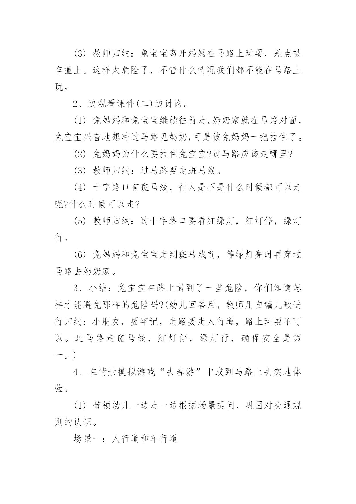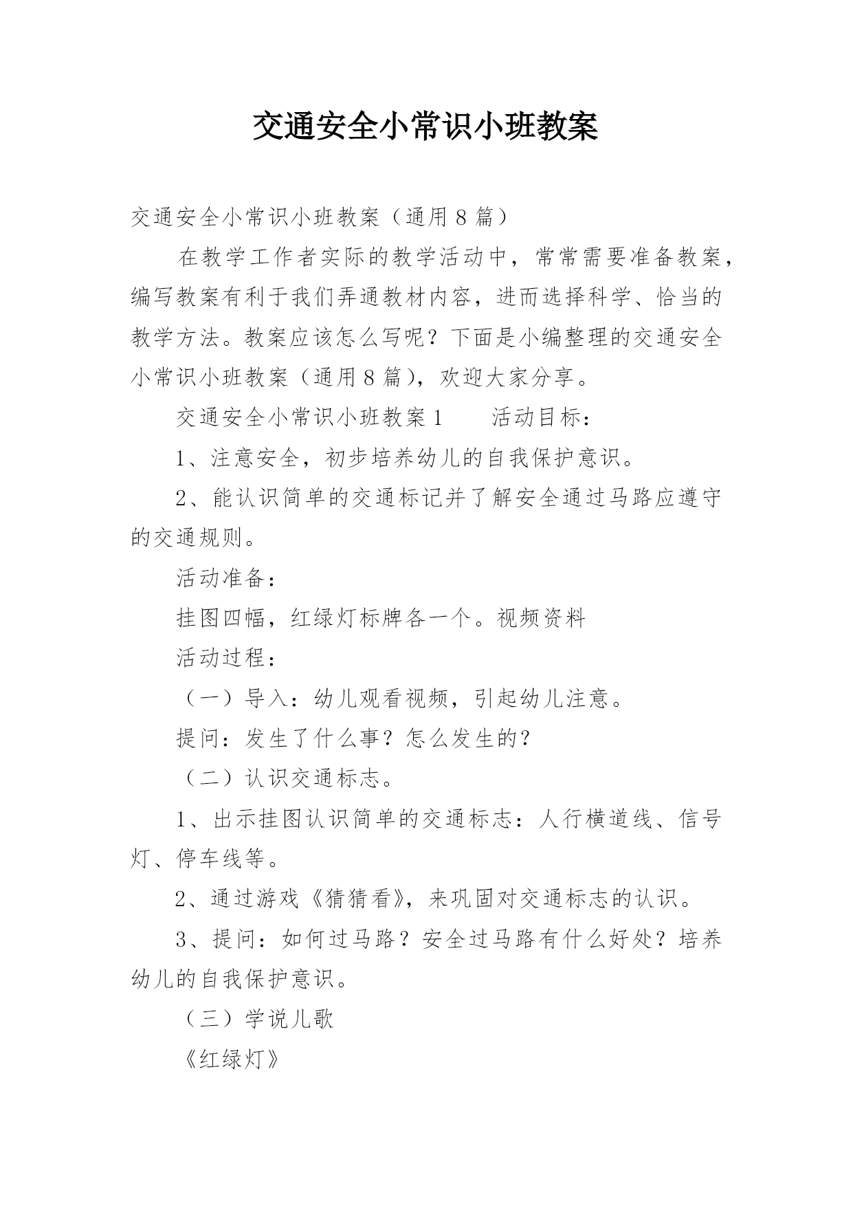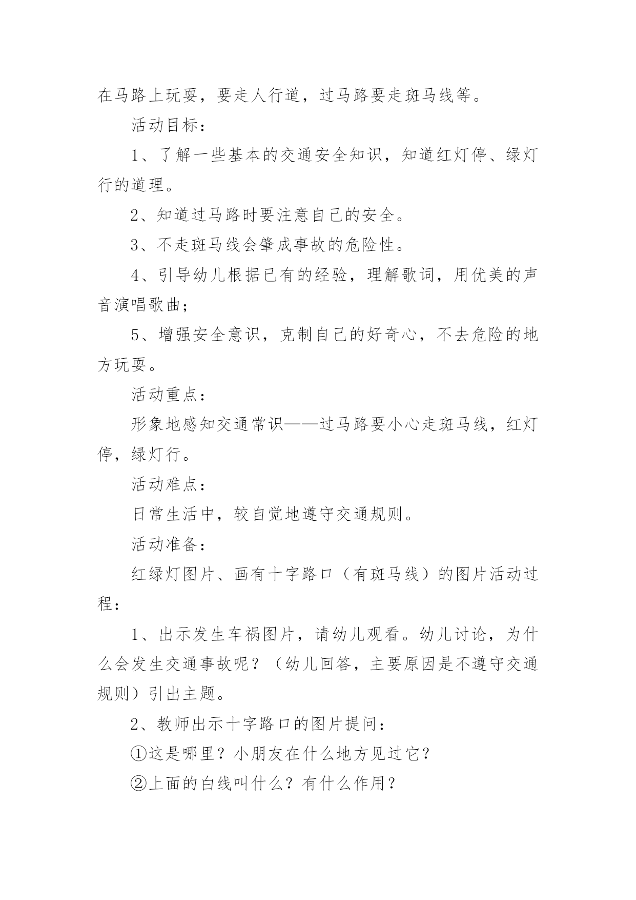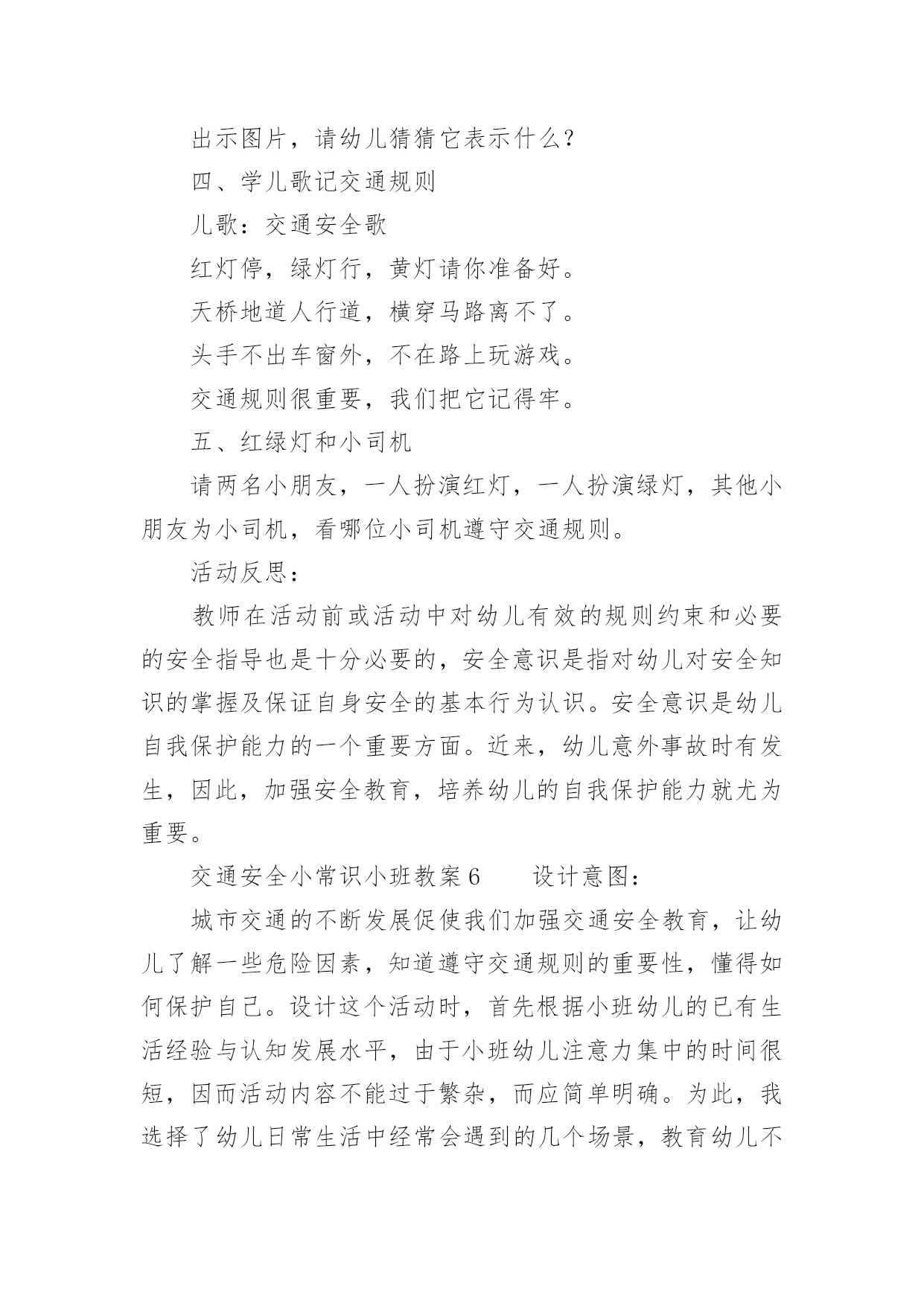 交通安全小常识小班教案交通安全小常识小班教案(通用8篇)在教学工作者实际的教学活动中,常常需要准备教案,编写教案有利于我们弄通教材内容,进而选择科学、恰当的教学方法。教案应该怎么写呢?下面是小编整理的交通安全小常识小班教案(通用8篇),欢迎大家分享。交通安全小常识小班教案1活动目标:1、注意安全,初步培养幼儿的自我保护意识。2、能认识简单的交通标记并了解安全通过马路应遵守的交通规则。活动准备:挂图四幅,红绿灯标牌各一个。视频资料活动过程:(一)导入:幼儿观看视频,引起幼儿注意。提问:发生了什么事?怎么发生的?(二)认识交通标志。1、出示挂图认识简单的交通标志:人行横道线、信号灯、停车线等。2、通过游戏《猜猜看》,来巩固对交通标志的认识。3、提问:如何过马路?安全过马路有什么好处?培养幼儿的自我保护意识。(三)学说儿歌《红绿灯》大马路,宽又宽,警察叔叔站中间。红灯亮了停一停,绿灯亮了往前行。(四)游戏小朋友们想不想玩红绿灯的游戏,师幼一起玩游戏。老师扮成交警叔叔,出示红绿灯标志让幼儿进一步巩固认识红绿灯及其作用。活动延伸:绘画红绿灯。交通安全小常识小班教案2活动目标:了解行人在马路上应该遵守的一些交通规则,形成初步的安全意识与自我保护意识,提高自我保护能力。活动准备:1、幼儿有与成人一起外出的经验。2、有关模拟游戏的情景创设。3、课件《看望兔奶奶》。活动过程:1、边观看课件(一)边讨论。(1)兔奶奶生病了,兔妈妈带兔宝宝去看望她。半路上,兔妈妈到水果店给奶奶买水果,兔宝宝就跑到了马路上。她看到花丛中有一只漂亮的蝴蝶,就去捉蝴蝶玩。蝴蝶飞到了马路中央,兔宝宝就一路追过去,差点被车撞上。(2)为什么兔宝宝差点被车撞到?(3)教师归纳:兔宝宝离开妈妈在马路上玩耍,差点被车撞上。这样太危险了,不管什么情况我们都不能在马路上玩。2、边观看课件(二)边讨论。(1)兔妈妈和兔宝宝继续往前走。奶奶家就在马路对面,兔宝宝兴奋地想冲过马路见奶奶,可是被兔妈妈一把拉住了。(2)兔妈妈为什么要拉住兔宝宝?过马路应该走哪里?(3)教师归纳:过马路要走斑马线。(4)十字路口有斑马线,行人是不是什么时候都可以走呢?什么时候可以走?(5)教师归纳:过十字路口要看红绿灯,红灯停,绿灯行。(6)兔妈妈和兔宝宝走到斑马线前,等绿灯亮时再穿过马路去奶奶家。3、小结:兔宝宝在路上遇到了一些危险,你们知道怎样才能避免那样的危险吗?(幼儿回答后,教师用自编儿歌进行归纳:小朋友,要牢记,走路要走人行道,路上玩耍不可以。过马路走斑马线,红灯停,绿灯行,确保安全是第一。)4、在情景模拟游戏“去春游”中或到马路上去实地体验。(1)带领幼儿一边走一边根据场景提问,巩固对交通规则的认识。场景一:人行道和车行道师:前面有两种道路,行人应该走哪一种路?(人行道。)师:行人应该注意什么?(靠右边走,不能边走边玩,特别是不能到车行道上玩。)场景二:十字路口师:要过马路了,我们应该怎么走?(找到斑马线,看清红绿灯,红灯停,绿灯行。)场景三:天桥师:这是什么?我们应该怎么走?(走天桥就像走幼儿园的楼梯,要靠右边一个跟着一个走,不能推也不能挤。)(2)顺利到达目的地之后,引导幼儿对刚才的情况进行小结,启发幼儿把过天桥的要点编到儿歌里去,如“过天桥靠右边,一个跟着一个走”。交通安全小常识小班教案3一、活动目标:1、让幼儿在交流活动中认识一些常见的交通标志。2、让幼儿在游戏活动中体验交通规则的重要性,从而自觉地遵守交通规则。3、让幼儿在合作学习中学得一些基本的学习方法。二、活动准备:1、精心布置活动场景。2、收集各种交通标志(照片或图片)。3、字卡:交通安全、红灯停,绿灯行、人行道、非机动车道、汽车道。三、活动过程:(一)展开联想,揭示活动主题1、出示交通事故图片,请幼儿仔细观察。提问:孩子们,刚才你们看到了什么?想到了什么?2、多么可怕的车祸,为了不让这样的事情再发生,我们一定要注意交通安全。(出示字卡“交通安全”)(二)在活动中体会交通规则的重要性1、孩子们,看看我们坐的队形像什么?十字路口的学问可多了,现在我们就在十字路口做个游戏。老师请出三个司机,三个骑车的以及五个行人。参加游戏活动的孩子听到老师说完“开始”之后,立即向自己的.对面出发。其他孩子仔细观察,看看会发生什么事情?(1)孩子们,刚才你们看到了什么?你们想说什么?(2)如果生活中也是这样可不行啊!为什么会发生这种情况呢?(3)(教师拿出信号灯标志)这是什么?谁能编句儿歌来说说信号灯的作用。(将标志贴在黑板上)幼儿回答后出示字卡“红灯停,绿灯行”。2、认识了红绿灯,我们还要知道自己应该走哪条路,这就要知道每条路的名称。孩子们,看看这个十字路口,你认识这些道路吗?(人行道、非机动车道、汽车道)(三)初步了解常见交通标志的作用(出示交通标