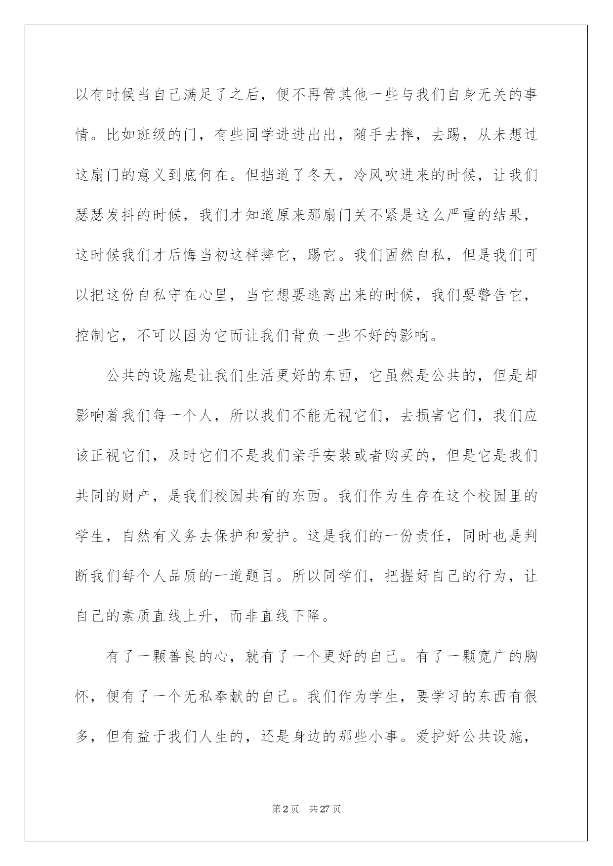 第PAGE\*Arabic\*MERGEFORMAT27页共NUMPAGES\*Arabic\*MERGEFORMAT27页第PAGE\*MERGEFORMAT27页共NUMPAGES\*MERGEFORMAT27页第PAGE\*MERGEFORMAT27页共NUMPAGES\*MERGEFORMAT27页第PAGE\*MERGEFORMAT27页共NUMPAGES\*MERGEFORMAT27页第PAGE\*MERGEFORMAT27页共NUMPAGES\*MERGEFORMAT27页第PAGE\*MERGEFORMAT27页共NUMPAGES\*MERGEFORMAT27页第PAGE\*MERGEFORMAT27页共NUMPAGES\*MERGEFORMAT27页第PAGE\*MERGEFORMAT27页共NUMPAGES\*MERGEFORMAT27页第PAGE\*MERGEFORMAT27页共NUMPAGES\*MERGEFORMAT27页第PAGE\*MERGEFORMAT27页共NUMPAGES\*MERGEFORMAT27页第PAGE\*MERGEFORMAT27页共NUMPAGES\*MERGEFORMAT27页2022爱护公共设施倡议书爱护公共设施倡议书在不断进步的社会中,能够利用到倡议书的场合越来越多,不同的倡议书内容同样也是不同的。那么你有了解过倡议书吗?以下是我为大家收集的爱护公共设施倡议书,欢迎阅读,希望大家能够喜欢。爱护公共设施倡议书1尊敬的领导:你们好!在这偌大的校园里,有让我们挥洒汗水的篮球场,有充满着青春的乒乓球场,还有安静且儒雅的图书馆,这些地方让我们的校园生活更加的丰富多姿,也让我们有更多可以发展自我的空间。但总有一些这样的现象存在,不管是校园的大型公共空间还是我们小小的班级里,总会有一些破坏公共设施的情况存在,这种行为是不应该发生的,也是不应该存在的。所以我再次倡议大家,往后请多多爱护公共设施,这是我们共同的校园,也是我们共同的家园。我们知道,每个人都是自私的,我们想的更多的是我们自己,所以有时候当自己满足了之后,便不再管其他一些与我们自身无关的事情。比如班级的门,有些同学进进出出,随手去摔,去踢,从未想过这扇门的意义到底何在。但挡道了冬天,冷风吹进来的时候,让我们瑟瑟发抖的时候,我们才知道原来那扇门关不紧是这么严重的结果,这时候我们才后悔当初这样摔它,踢它。我们固然自私,但是我们可以把这份自私守在心里,当它想要逃离出来的时候,我们要警告它,控制它,不可以因为它而让我们背负一些不好的影响。公共的设施是让我们生活更好的东西,它虽然是公共的,但是却影响着我们每一个人,所以我们不能无视它们,去损害它们,我们应该正视它们,及时它们不是我们亲手安装或者购买的,但是它是我们共同的财产,是我们校园共有的东西。我们作为生存在这个校园里的学生,自然有义务去保护和爱护。这是我们的一份责任,同时也是判断我们每个人品质的一道题目。所以同学们,把握好自己的行为,让自己的素质直线上升,而非直线下降。有了一颗善良的心,就有了一个更好的自己。有了一颗宽广的胸怀,便有了一个无私奉献的自己。我们作为学生,要学习的东西有很多,但有益于我们人生的,还是身边的那些小事。爱护好公共设施,能够增强我们个人的责任感,也能让我们对自己有一个更好的标准,这对于我们来说,是一件有利的事情,而非是一件麻烦的事情。所以同学们,就让我们一起肩负起身上的重担,在学习中努力前行,在生活中保持自我,爱护公共设施,一个高素质的学生吧!此致敬礼!倡议人:xxx20xx年x月x日爱护公共设施倡议书2全体师生员工:学校公共设施是学校基础建设的组成部分,是一个学校文明程度、发展水平和综合功能的集中体现。近年来,在学校党委、行政高度重视下,我校的基础设施建设有了很大的改善,为方便师生员工生活和净化、美化校园环境起到了积极作用。然而,校园内的一些路灯、健身器材、绿地草坪等设施被人为破坏,配置的果皮箱伤痕累累,乱涂乱画、随意张贴小广告等现象普遍。特别是入冬以来,学校的一些公共浴室水管多次被人为掰断,不仅给学生洗浴带来影响,而且造成水资源的严重浪费。为此,我们向全体师生员工倡议:一、遵纪守德,以身作则。从自身做起,从言行举止的细微之处做起,爱护公共设施,不损坏、不破坏;爱护草坪,不随意踩踏;爱护环境,不随处乱丢垃圾和张贴广告,以自己的行为带动身边人,以自己良好的公德风尚影响身边人。二、善意提醒,规劝他人。从现在做起,告别陋习,对损害校园公共设施和环境的行为进行制止,以实际行动争做文明风尚的传播者和倡导者。尊敬的师生