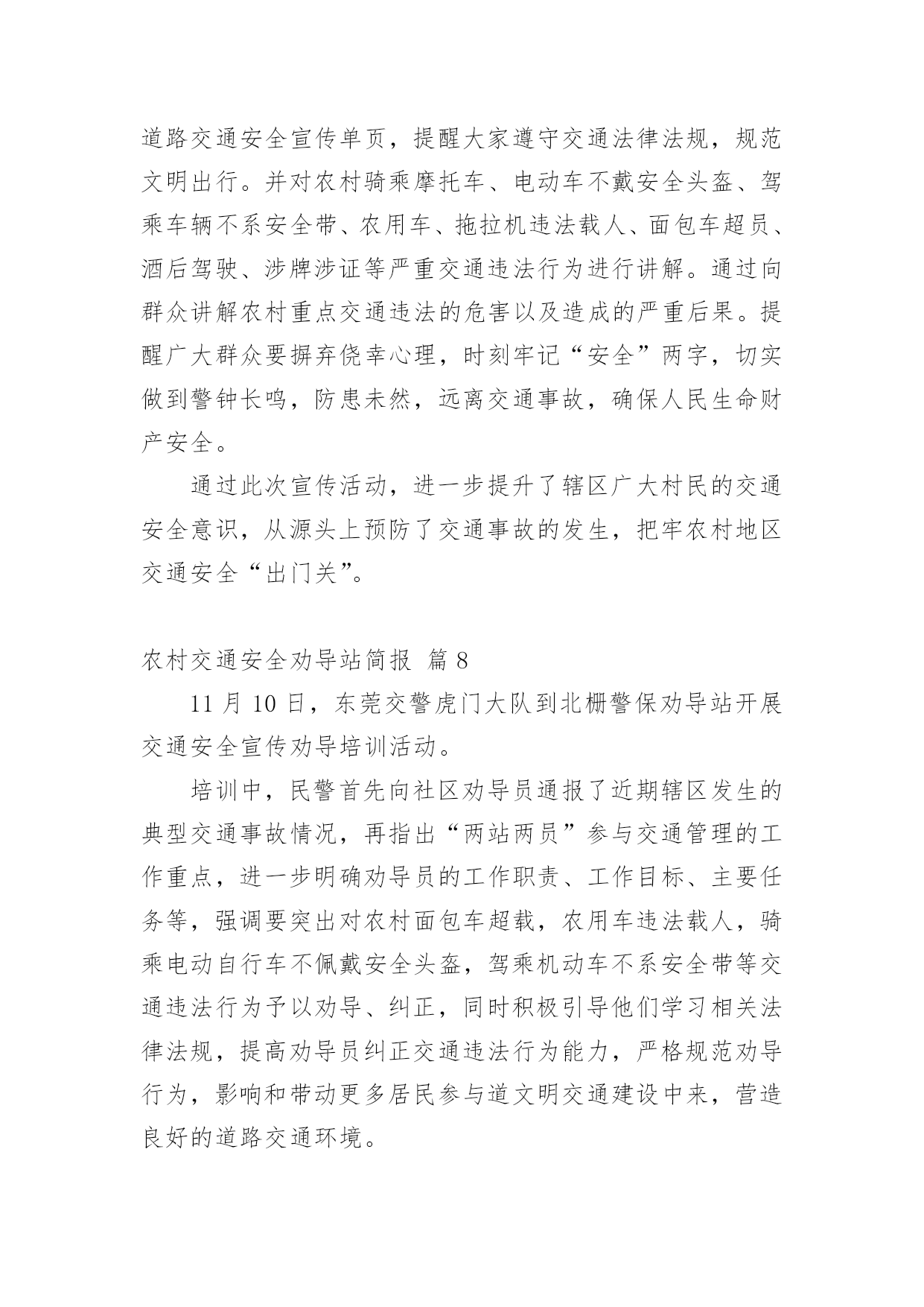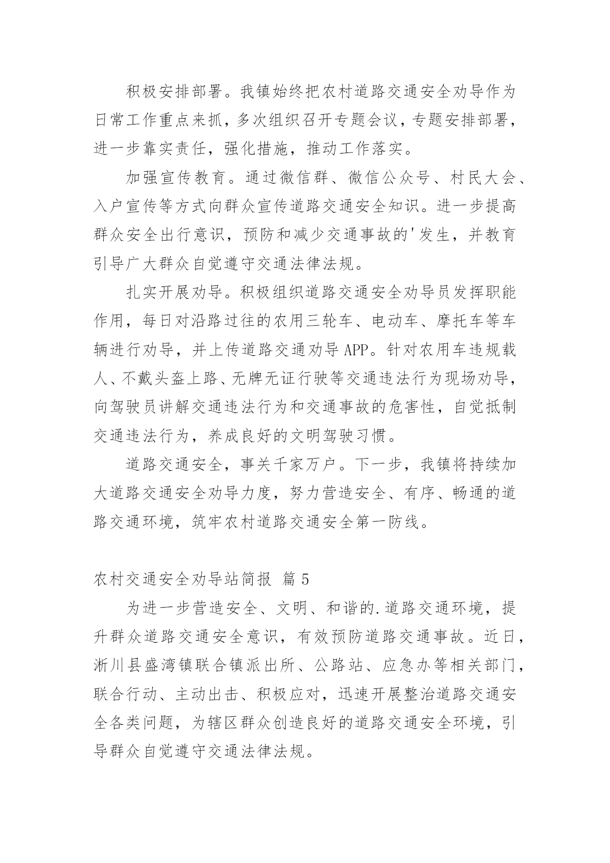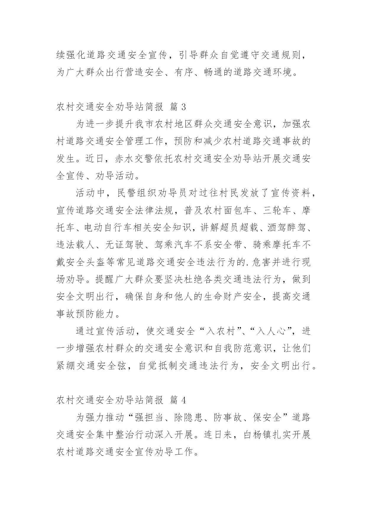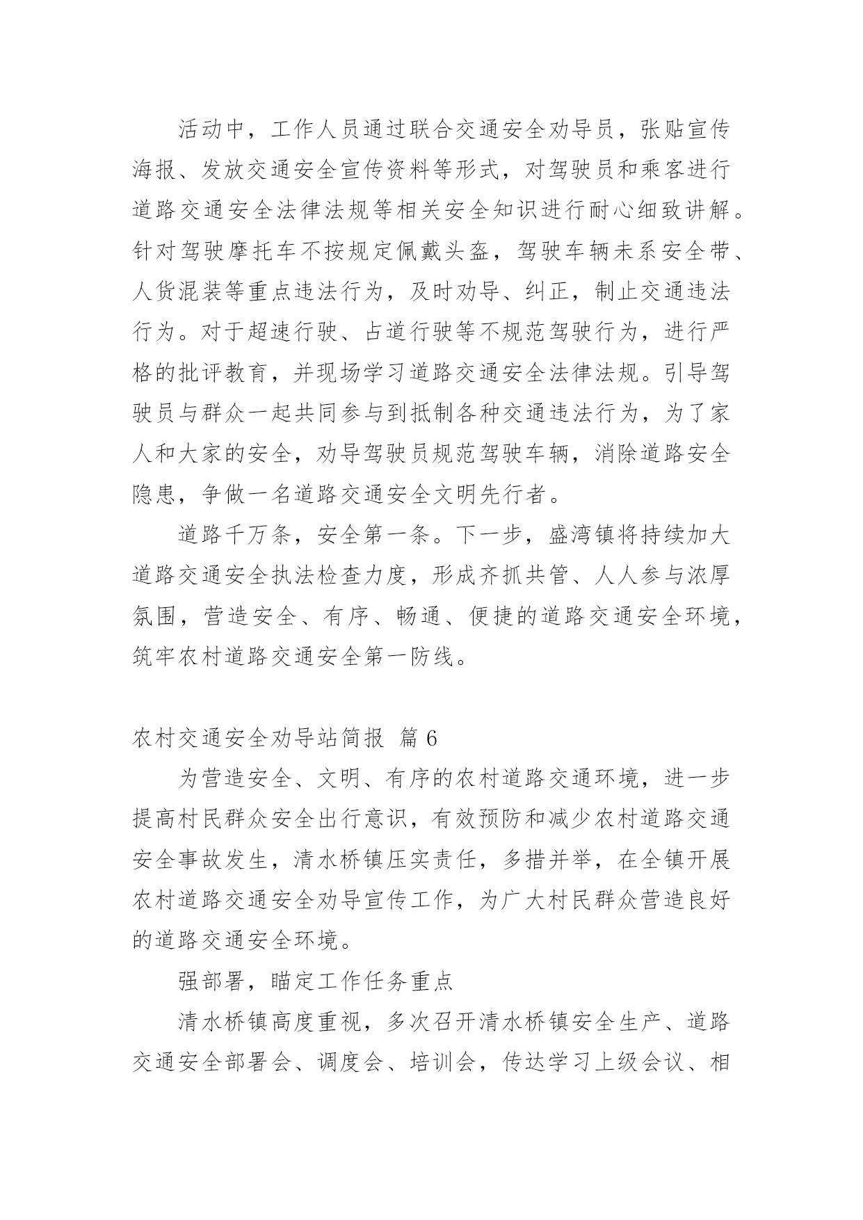 农村交通安全劝导站简报在现在的社会生活中,我们每个人都可能会接触到简报,简报具有一般报纸的新闻特点,特别是要求有很强的时效性。拟起简报来就毫无头绪?以下是小编精心整理的农村交通安全劝导站简报,欢迎阅读,希望大家能够喜欢。农村交通安全劝导站简报篇1为迅速贯彻落实农村道路交通秩序百日整治会议精神,切实加强农村道路交通秩序整治,全面预防和遏制重特大道路交通事故的发生,东安县公安局交警大队多措并举,深入开展道路交通秩序整治行动,扎实做好交通事故预防工作,铸就生命安全防线。昨日,石期市镇中队与大庙口中队均深入农村开展了道路交通整治行动。整治行动中,严查了农村摩托车、面包车、三轮车、拖拉机、电动车等车辆未戴安全头盔、超员载客、违法载人、人货混装、无牌无证等交通违法行为。对无证驾驶、无牌、无证、超员超载等严重交通违法行为现场开具处罚决定书,并对驾驶员进行交通安全宣传教育。以处罚和劝导相结合的`方式,让农村道路交通秩序深入人心。在此次整治行动中,石期市镇中队与大庙口中队共查获酒后驾驶3起,未带头盔26起,客车超员1起,三轮车载客5起,整治行动起到良好的效果。东安交警大队将继续扩大整治力度,全面深入开展农村道路交通秩序整治行动,切实改善农村道路交通环境。农村交通安全劝导站简报篇2为营造安全、文明、和谐的农村道路交通环境,提升群众交通安全意识,有效预防道路交通事故,连日来,大芦镇积极组织开展了农村道路交通安全检查劝导工作,充分发挥镇村干部、交通劝导员在农村道路交通管理工作中的积极作用,确保全镇人民群众安全出行。工作中,大芦镇的镇村干部、交通安全劝导员在主要路口、路段和重点时段向过往农用电动三轮车、摩托车驾驶员发放交通安全宣传提示单,对摩托车、电动三轮车驾驶员未戴安全头盔、非法载人、超速、超载等交通违法行为进行面对面的劝导、纠正和教育,详细讲述交通违法行为发生可能带来的交通安全影响及危害,劝导当事人自觉抵制交通违法行为,养成文明驾驶习惯,让交通安全在群众心中形成一把尺,让文明意识和安全意识深入人心。交通劝导为了我们大家的`自身安全,经常戴头盔、不载人。大芦镇副镇长小孟告诉记者:“大芦镇设立交通劝导站两处,劝导点九处,共安排劝导员30人,主要由镇村干部、党员及志愿者构成。交通劝导站实行24小时值班,对往来电动三轮车的违法载人,不戴头盔的违法行为进行劝导。”通过交通安全劝导工作的开展,提高了群众交通安全防护意识,同时消除道路交通安全隐患。下一步,大芦镇将持续强化道路交通安全宣传,引导群众自觉遵守交通规则,为广大群众出行营造安全、有序、畅通的道路交通环境。农村交通安全劝导站简报篇3为进一步提升我市农村地区群众交通安全意识,加强农村道路交通安全管理工作,预防和减少农村道路交通事故的发生。近日,赤水交警依托农村交通安全劝导站开展交通安全宣传、劝导活动。活动中,民警组织劝导员对过往村民发放了宣传资料,宣传道路交通安全法律法规,普及农村面包车、三轮车、摩托车、电动自行车相关安全知识,讲解超员超载、酒驾醉驾、违法载人、无证驾驶、驾乘汽车不系安全带、骑乘摩托车不戴安全头盔等常见道路交通安全违法行为的.危害并进行现场劝导。提醒广大群众要坚决杜绝各类交通违法行为,做到安全文明出行,确保自身和他人的生命财产安全,提高交通事故预防能力。通过宣传活动,使交通安全“入农村”、“入人心”,进一步增强农村群众的交通安全意识和自我防范意识,让他们紧绷交通安全弦,自觉抵制交通违法行为,安全文明出行。农村交通安全劝导站简报篇4为强力推动“强担当、除隐患、防事故、保安全”道路交通安全集中整治行动深入开展。连日来,白杨镇扎实开展农村道路交通安全宣传劝导工作。积极安排部署。我镇始终把农村道路交通安全劝导作为日常工作重点来抓,多次组织召开专题会议,专题安排部署,进一步靠实责任,强化措施,推动工作落实。加强宣传教育。通过微信群、微信公众号、村民大会、入户宣传等方式向群众宣传道路交通安全知识。进一步提高群众安全出行意识,预防和减少交通事故的'发生,并教育引导广大群众自觉遵守交通法律法规。扎实开展劝导。积极组织道路交通安全劝导员发挥职能作用,每日对沿路过往的农用三轮车、电动车、摩托车等车辆进行劝导,并上传道路交通劝导APP。针对农用车违规载人、不戴头盔上路、无牌无证行驶等交通违法行为现场劝导,向驾驶员讲解交通违法行为和交通事故的危害性,自觉抵制交通违法行为,养成良好的文明驾驶习惯。道路交通安全,事关千家万户。下一步,我镇将持续加大道路交通安全劝导力度,努力营造安全、有序、畅通的道路交通环境,筑牢农村道路交通安全第一防线。农村交通安全劝导站简报篇5为进一步营造安全、文明、和谐的.道路交通环境,提升群众道路交通安全意识,有效预防道路交通事故。近日,淅川县盛湾镇联合镇派出所、公路站、应急办等相关部门,联