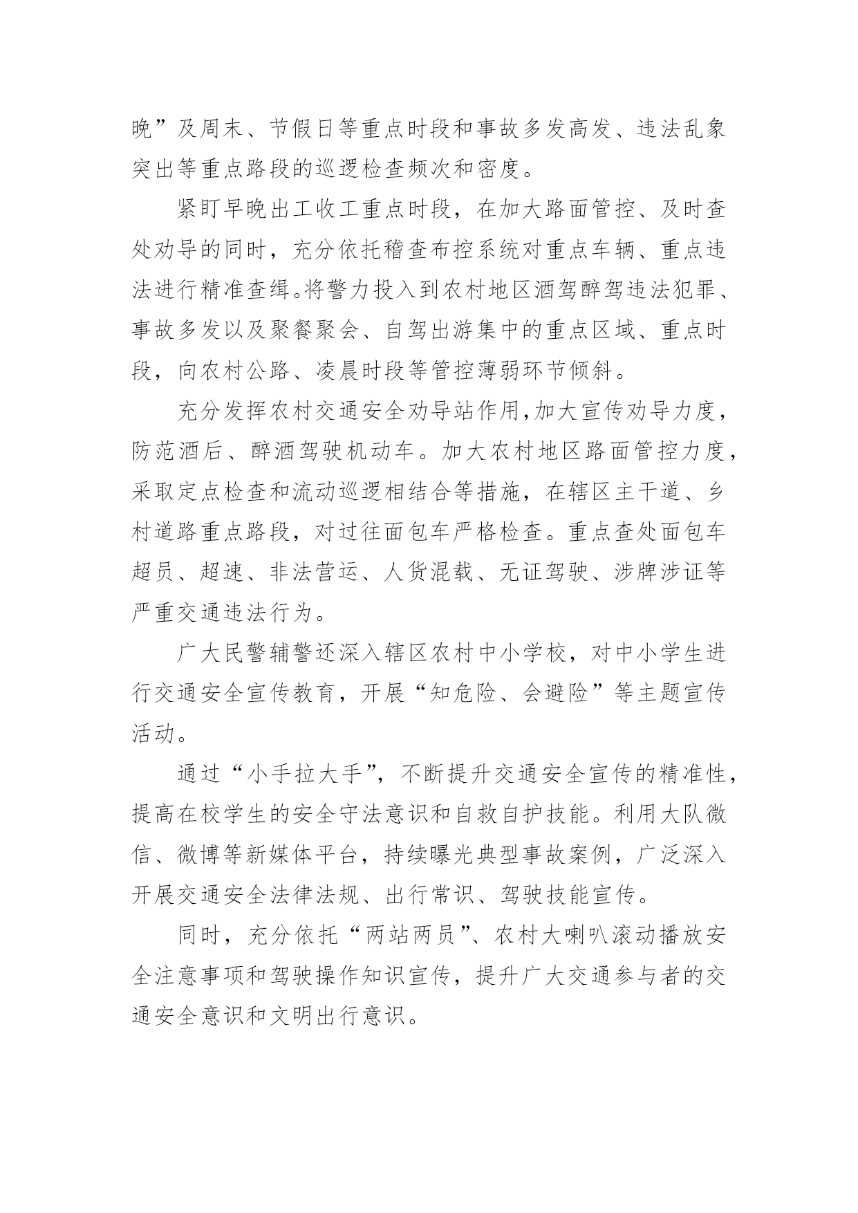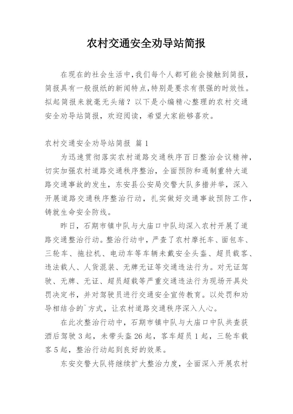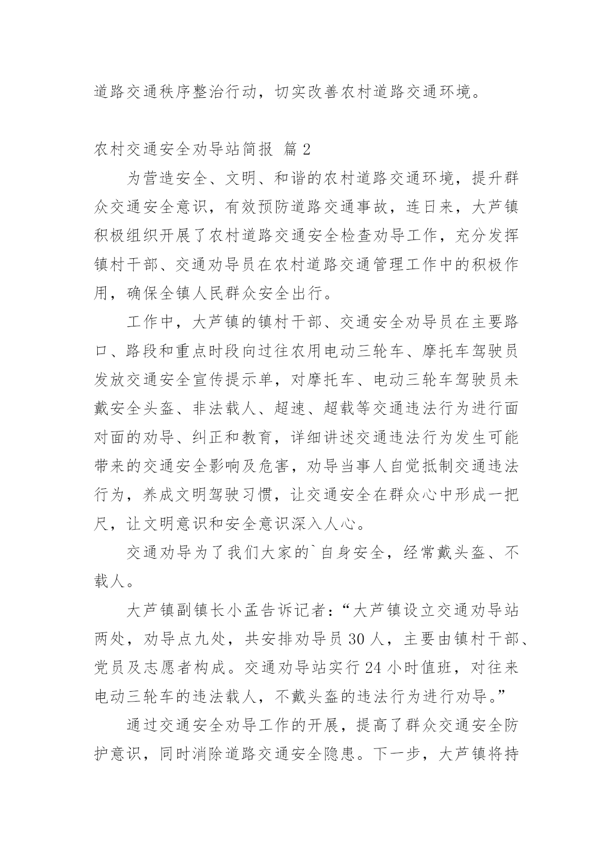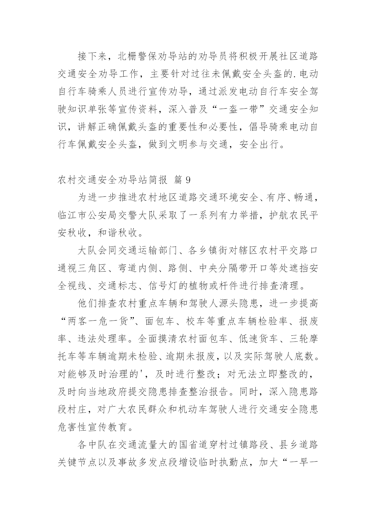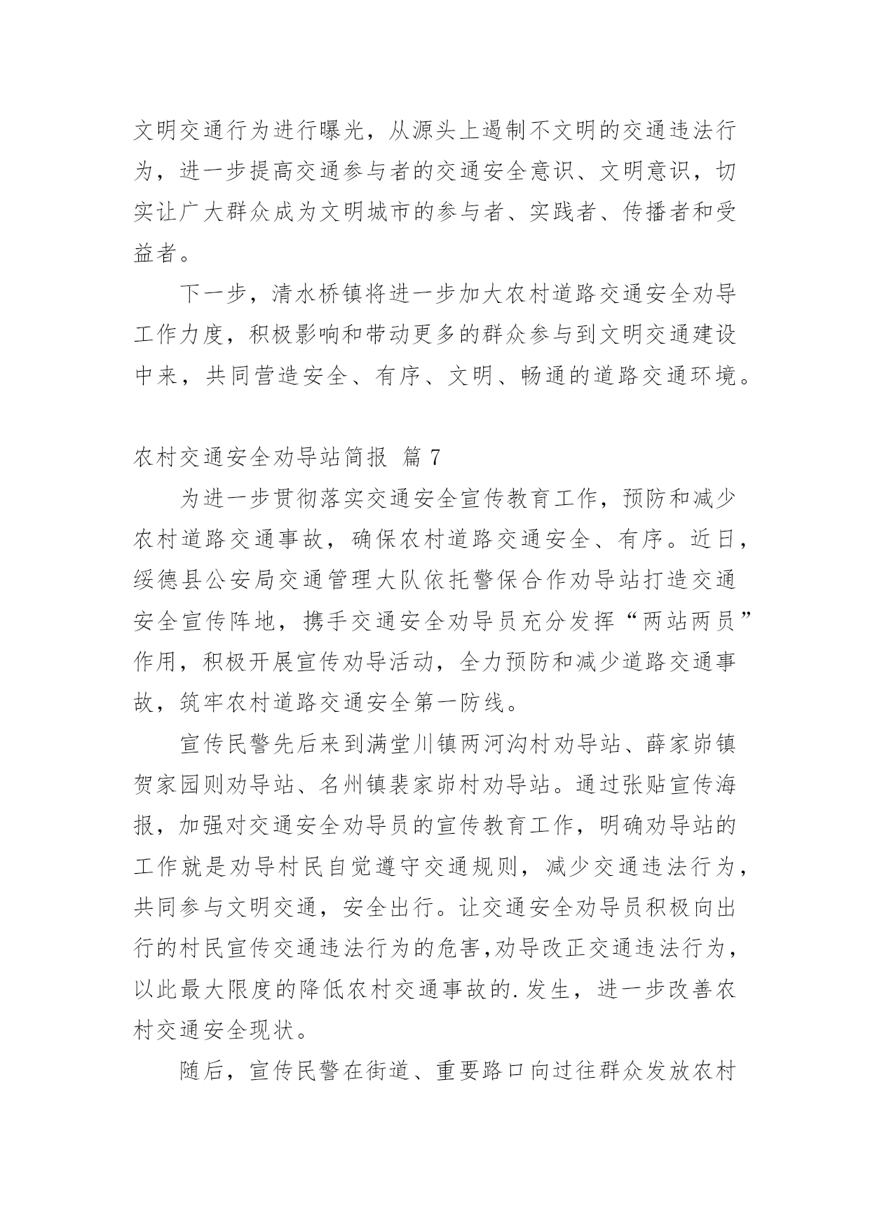 农村交通安全劝导站简报在现在的社会生活中,我们每个人都可能会接触到简报,简报具有一般报纸的新闻特点,特别是要求有很强的时效性。拟起简报来就毫无头绪?以下是小编精心整理的农村交通安全劝导站简报,欢迎阅读,希望大家能够喜欢。农村交通安全劝导站简报篇1为迅速贯彻落实农村道路交通秩序百日整治会议精神,切实加强农村道路交通秩序整治,全面预防和遏制重特大道路交通事故的发生,东安县公安局交警大队多措并举,深入开展道路交通秩序整治行动,扎实做好交通事故预防工作,铸就生命安全防线。昨日,石期市镇中队与大庙口中队均深入农村开展了道路交通整治行动。整治行动中,严查了农村摩托车、面包车、三轮车、拖拉机、电动车等车辆未戴安全头盔、超员载客、违法载人、人货混装、无牌无证等交通违法行为。对无证驾驶、无牌、无证、超员超载等严重交通违法行为现场开具处罚决定书,并对驾驶员进行交通安全宣传教育。以处罚和劝导相结合的`方式,让农村道路交通秩序深入人心。在此次整治行动中,石期市镇中队与大庙口中队共查获酒后驾驶3起,未带头盔26起,客车超员1起,三轮车载客5起,整治行动起到良好的效果。东安交警大队将继续扩大整治力度,全面深入开展农村道路交通秩序整治行动,切实改善农村道路交通环境。农村交通安全劝导站简报篇2为营造安全、文明、和谐的农村道路交通环境,提升群众交通安全意识,有效预防道路交通事故,连日来,大芦镇积极组织开展了农村道路交通安全检查劝导工作,充分发挥镇村干部、交通劝导员在农村道路交通管理工作中的积极作用,确保全镇人民群众安全出行。工作中,大芦镇的镇村干部、交通安全劝导员在主要路口、路段和重点时段向过往农用电动三轮车、摩托车驾驶员发放交通安全宣传提示单,对摩托车、电动三轮车驾驶员未戴安全头盔、非法载人、超速、超载等交通违法行为进行面对面的劝导、纠正和教育,详细讲述交通违法行为发生可能带来的交通安全影响及危害,劝导当事人自觉抵制交通违法行为,养成文明驾驶习惯,让交通安全在群众心中形成一把尺,让文明意识和安全意识深入人心。交通劝导为了我们大家的`自身安全,经常戴头盔、不载人。大芦镇副镇长小孟告诉记者:“大芦镇设立交通劝导站两处,劝导点九处,共安排劝导员30人,主要由镇村干部、党员及志愿者构成。交通劝导站实行24小时值班,对往来电动三轮车的违法载人,不戴头盔的违法行为进行劝导。”通过交通安全劝导工作的开展,提高了群众交通安全防护意识,同时消除道路交通安全隐患。下一步,大芦镇将持续强化道路交通安全宣传,引导群众自觉遵守交通规则,为广大群众出行营造安全、有序、畅通的道路交通环境。农村交通安全劝导站简报篇3为进一步提升我市农村地区群众交通安全意识,加强农村道路交通安全管理工作,预防和减少农村道路交通事故的发生。近日,赤水交警依托农村交通安全劝导站开展交通安全宣传、劝导活动。活动中,民警组织劝导员对过往村民发放了宣传资料,宣传道路交通安全法律法规,普及农村面包车、三轮车、摩托车、电动自行车相关安全知识,讲解超员超载、酒驾醉驾、违法载人、无证驾驶、驾乘汽车不系安全带、骑乘摩托车不戴安全头盔等常见道路交通安全违法行为的.危害并进行现场劝导。提醒广大群众要坚决杜绝各类交通违法行为,做到安全文明出行,确保自身和他人的生命财产安全,提高交通事故预防能力。通过宣传活动,使交通安全“入农村”、“入人心”,进一步增强农村群众的交通安全意识和自我防范意识,让他们紧绷交通安全弦,自觉抵制交通违法行为,安全文明出行。农村交通安全劝导站简报篇4为强力推动“强担当、除隐患、防事故、保安全”道路交通安全集中整治行动深入开展。连日来,白杨镇扎实开展农村道路交通安全宣传劝导工作。积极安排部署。我镇始终把农村道路交通安全劝导作为日常工作重点来抓,多次组织召开专题会议,专题安排部署,进一步靠实责任,强化措施,推动工作落实。加强宣传教育。通过微信群、微信公众号、村民大会、入户宣传等方式向群众宣传道路交通安全知识。进一步提高群众安全出行意识,预防和减少交通事故的'发生,并教育引导广大群众自觉遵守交通法律法规。扎实开展劝导。积极组织道路交通安全劝导员发挥职能作用,每日对沿路过往的农用三轮车、电动车、摩托车等车辆进行劝导,并上传道路交通劝导APP。针对农用车违规载人、不戴头盔上路、无牌无证行驶等交通违法行为现场劝导,向驾驶员讲解交通违法行为和交通事故的危害性,自觉抵制交通违法行为,养成良好的文明驾驶习惯。道路交通安全,事关千家万户。下一步,我镇将持续加大道路交通安全劝导力度,努力营造安全、有序、畅通的道路交通环境,筑牢农村道路交通安全第一防线。农村交通安全劝导站简报篇5为进一步营造安全、文明、和谐的.道路交通环境,提升群众道路交通安全意识,有效预防道路交通事故。近日,淅川县盛湾镇联合镇派出所、公路站、应急办等相关部门,联