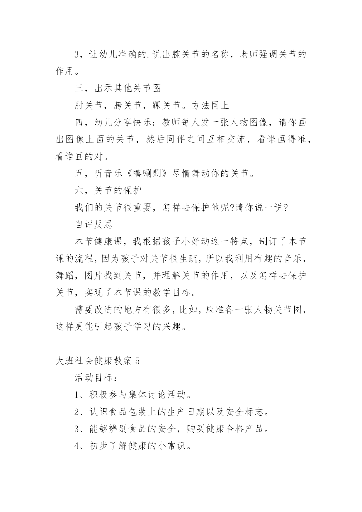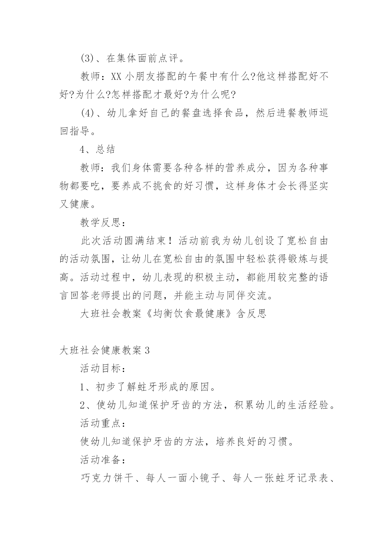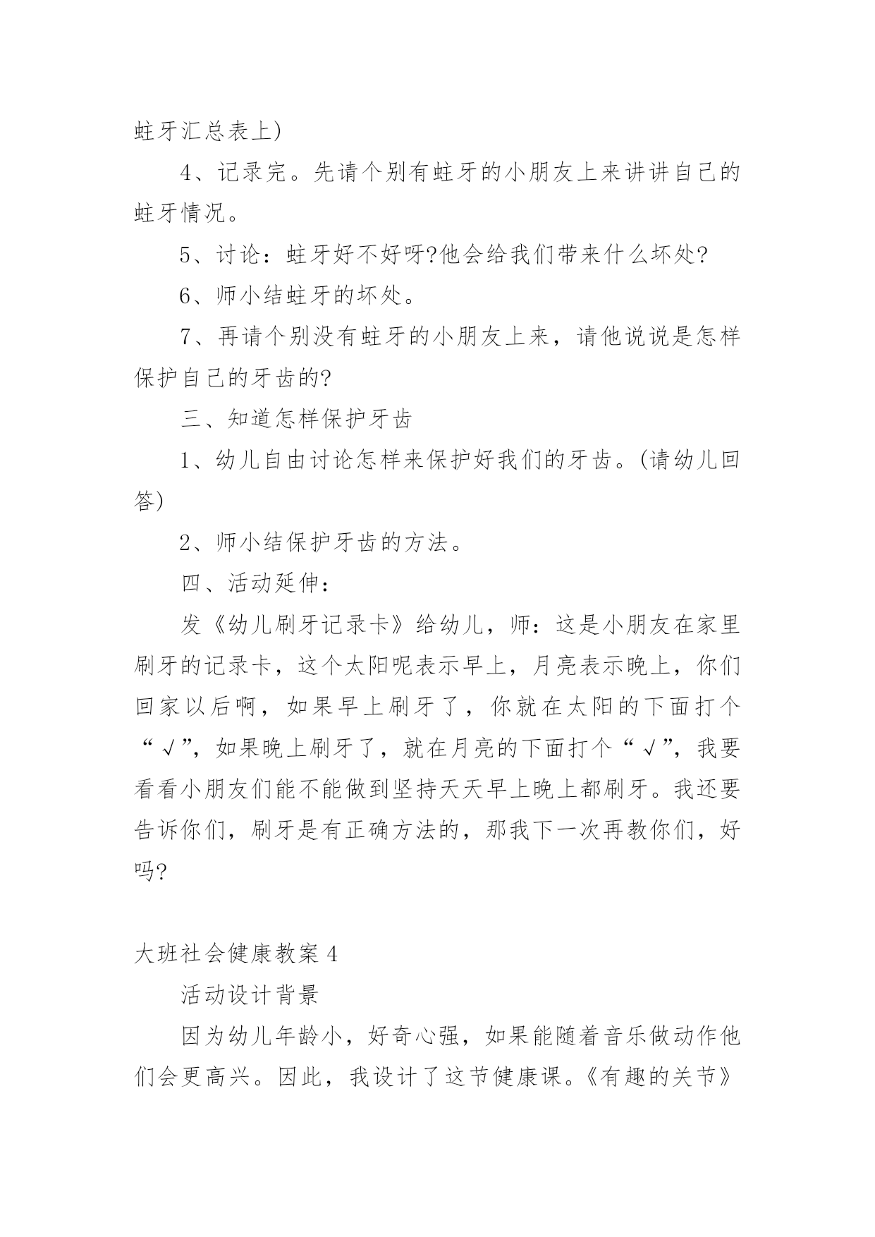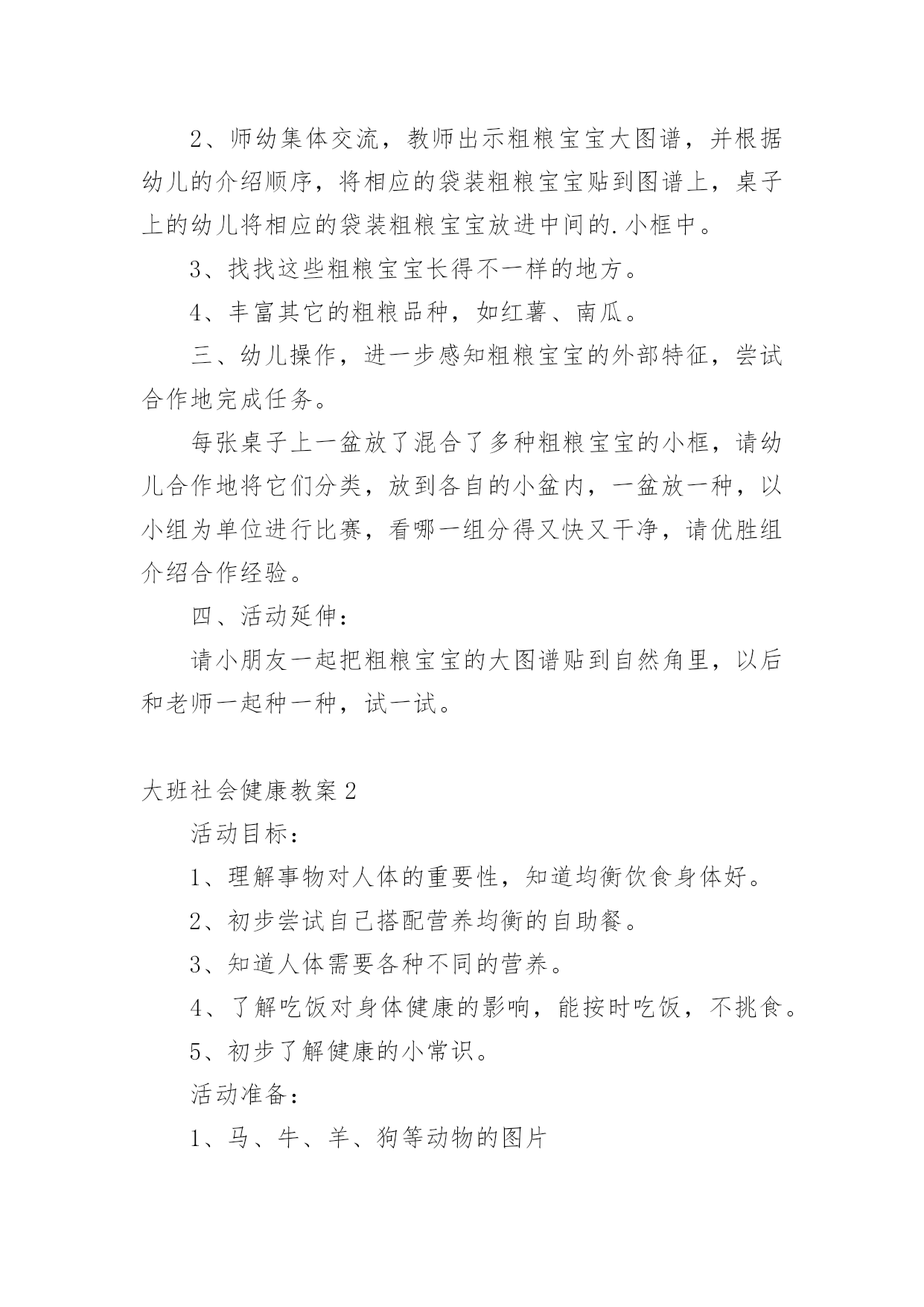 大班社会健康教案作为一位无私奉献的人民教师,就有可能用到教案,借助教案可以更好地组织教学活动。写教案需要注意哪些格式呢?以下是小编整理的大班社会健康教案,仅供参考,希望能够帮助到大家。大班社会健康教案1活动目标:1、了解各种粗粮的名称,感知它们基本的外形特征,并用清楚、正确的语言进行表达和交流。2、能主动地参与粗粮的观察与操作活动,合作地完成操作任务。3、了解粗粮对人体健康的作用,懂得要爱惜粮食。活动准备:各种粗粮(玉米、高梁、小米等)的实物若干;粗粮宝宝大图谱;各种粗粮食物若干;小框、小盆若干。活动过程:一、品尝粗粮,谈话引出主题--粗粮宝宝。通过品尝和谈话让幼儿知道粮食可以分成细粮和粗粮,并简单地介绍粗粮对人体健康的保健作用。二、观察粗粮宝宝,并用语言交流它们的基本特征及名称。1、幼儿以小组为单位进行观察和交流,教师巡回参与。2、师幼集体交流,教师出示粗粮宝宝大图谱,并根据幼儿的介绍顺序,将相应的袋装粗粮宝宝贴到图谱上,桌子上的幼儿将相应的袋装粗粮宝宝放进中间的.小框中。3、找找这些粗粮宝宝长得不一样的地方。4、丰富其它的粗粮品种,如红薯、南瓜。三、幼儿操作,进一步感知粗粮宝宝的外部特征,尝试合作地完成任务。每张桌子上一盆放了混合了多种粗粮宝宝的小框,请幼儿合作地将它们分类,放到各自的小盆内,一盆放一种,以小组为单位进行比赛,看哪一组分得又快又干净,请优胜组介绍合作经验。四、活动延伸:请小朋友一起把粗粮宝宝的大图谱贴到自然角里,以后和老师一起种一种,试一试。大班社会健康教案2活动目标:1、理解事物对人体的重要性,知道均衡饮食身体好。2、初步尝试自己搭配营养均衡的自助餐。3、知道人体需要各种不同的营养。4、了解吃饭对身体健康的影响,能按时吃饭,不挑食。5、初步了解健康的小常识。活动准备:1、马、牛、羊、狗等动物的图片2、各类食品的图片3、食品小面包、花卷、小馒头、各种各样的水果块,蔬菜片或丝、火腿、鹌鹑蛋等。活动过程:一、游戏,引发幼儿参与活动的兴趣。1、教师:这些小动物喜欢吃什么食物。(分别出示小狗、马、羊、老虎、狮子的图片,幼儿回答)2、与幼儿讨论我们吃到的事物(1)、教师:你们都吃过那些东西呢?(请打开幼儿用书)幼儿回到,教师根据回答逐一将幼儿用书上的图画指给他们看。(2)、教师:小朋友吃过的东西真丰富,我们为什么要吃品种多样的事物呢?(.教案来自:快思教.案网)只吃一种事物行吗?为什么呢?(3)、幼儿讨论并回答(4)、教师小结:不同的事物有不同的营养成分,而我们的.身体需要多种营养才能长得结实又健康。米饭、馒头、面包可供给身体热量,吃了身体才有劲;牛奶盒肉类提供给身体蛋白质,让我们的身体更有能量;水果、蔬菜含有丰富的维生素、纤维素,可清理肠道,使我们更健康。3、自助餐会。(1)、教师:每种事物都有不同的营养,我们来做小营养师,为自己搭配一顿自助餐吧!(2)、教师先请两三位幼儿搭配一顿午餐(3)、在集体面前点评。教师:XX小朋友搭配的午餐中有什么?他这样搭配好不好?为什么?怎样搭配才最好?为什么呢?(4)、幼儿拿好自己的餐盘选择食品,然后进餐教师巡回指导。4、总结教师:我们身体需要各种各样的营养成分,因为各种事物都要吃,要养成不挑食的好习惯,这样身体才会长得坚实又健康。教学反思:此次活动圆满结束!活动前我为幼儿创设了宽松自由的活动氛围,让幼儿在宽松自由的氛围中轻松获得锻炼与提高。活动过程中,幼儿表现的积极主动,都能用较完整的语言回答老师提出的问题,并能主动与同伴交流。大班社会教案《均衡饮食最健康》含反思大班社会健康教案3活动目标:1、初步了解蛀牙形成的原因。2、使幼儿知道保护牙齿的方法,积累幼儿的生活经验。活动重点:使幼儿知道保护牙齿的方法,培养良好的习惯。活动准备:巧克力饼干、每人一面小镜子、每人一张蛀牙记录表、蛀牙汇总表、笔、装物品的小篮子五个、多媒体课件、刷牙记录卡。活动过程:一、吃点心(饼干)引出课题。1、师:小朋友,今天让我来猜一猜:你们刚刚吃的是什么饼干?(师走近一幼儿,观察该幼儿的牙齿)哦,我知道了!你们刚刚吃的是巧克力饼干,对吗?请你们猜一猜,我是怎么知道的呀?(让幼儿自由猜)我请你们也来看一看好朋友的牙齿。2、幼儿相互看牙齿,提问:你们看到了什么呀?3、师小结:哦,你们看到了牙齿上有饼干屑。原来,饼干没有全部吃到你们的肚子里,还有一些饼干啊留在你们的牙齿上。唉,有一个小朋友叫东东,他吃了饼干后呀饼干屑也留在了他的牙齿上,那让我们来看一看会发生什么事情?二、了解蛀牙形成的原因1、师放课件《牙齿的秘密》。提问:(1)他是谁呀?他在东东的.牙齿上干什么呀?(2)东东的牙齿怎么了?变成什么样啦?(3)你们在录像里还看到了什么呀?(据幼儿的回答,逐步追问)2、观察记录蛀牙。自由观察:那我请你们互相看看你们有