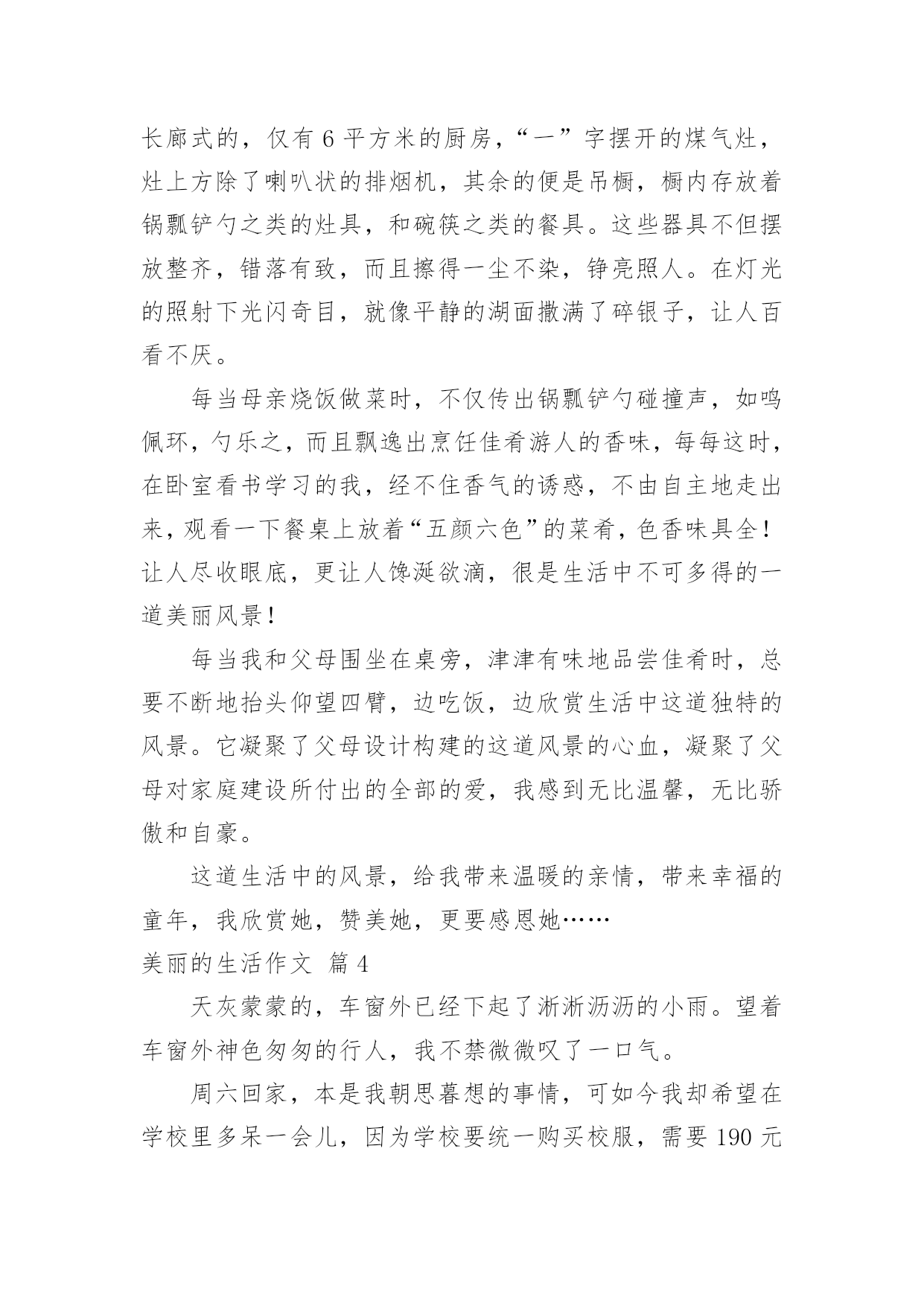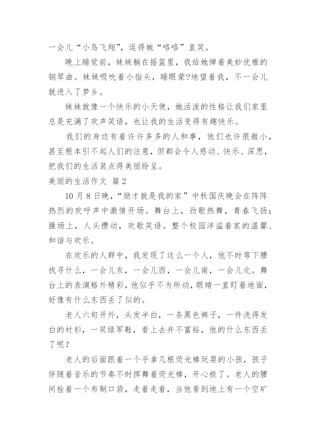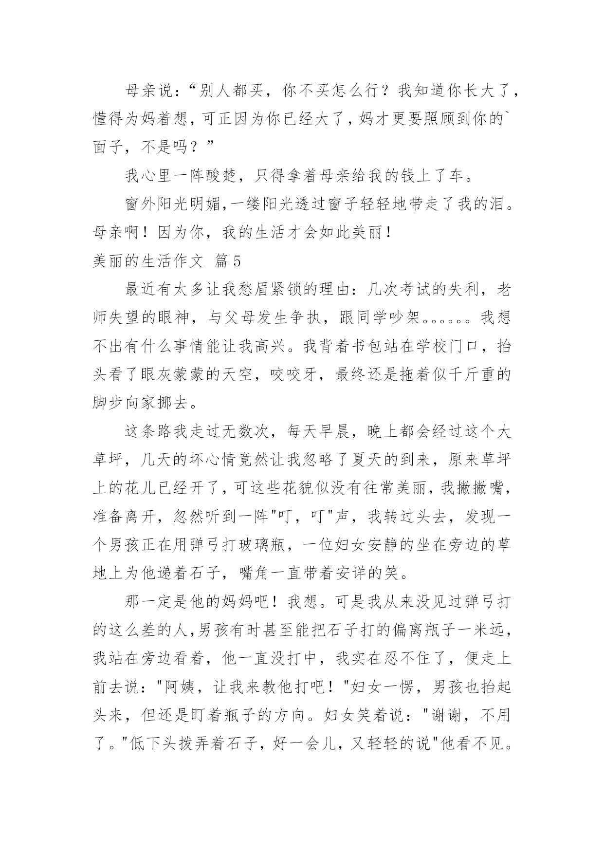 美丽的生活作文关于美丽的生活作文五篇在日常的学习、工作、生活中,大家都写过作文吧,借助作文人们可以反映客观事物、表达思想感情、传递知识信息。那么,怎么去写作文呢?下面是小编精心整理的美丽的生活作文5篇,欢迎大家分享。美丽的生活作文篇1我们身边每天都有许许多多的人和事,他们有的令人快乐,有的令人感动,有的令人敬佩,有的令人深思。我每天都坐公交车上下学,我发现每当到十字路口的时候,总会有一些不守规矩的行人乱闯红灯,不遵守交通规则,并且还一副理直气壮的样子。这时候,司机叔叔们却总是十分有礼貌地停车让行,丝毫没有怨言。这件事情,让我对司机叔叔们的敬佩之情油然而生。每次到学校后,我都会发现:黑板讲桌干干净净,课桌椅子整整齐齐,地面一尘不染,窗台上的'植物水分充足。这一切都归功于我们班的“勤快王”——马吴辉。他平时在班里默默无闻,成绩也很一般,但是他坚持每天第一个到教室,并且把教室打扫得干干净净,这使我们班经常被评为全校的“卫生小标兵”。这件事情让我很感动。每天放学回到家里,首先迎接我的绝对是可爱的小妹妹。她随即会向我送来甜甜的微笑和奶声奶气的问候。这时候,我就会把她抱起来高兴地转几个圈,一会儿“空中飞人”,一会儿“小鸟飞翔”,逗得她“咯咯”直笑。晚上睡觉前,妹妹躺在摇篮里,我给她弹着美妙优雅的钢琴曲。妹妹吸吮着小指头,睡眼蒙?地望着我,不一会儿就进入了梦乡。妹妹就像一个快乐的小天使,她活泼的性格让我们家里总是充满了欢声笑语,也让我的生活变得有趣快乐。我们的身边有着许许多多的人和事,他们也许很微小,甚至根本引不起人们的注意,但都会令人感动、快乐、深思,把我们的生活装点得美丽纷呈。美丽的生活作文篇210月8日晚,“励才就是我的家”中秋国庆晚会在阵阵热烈的欢呼声中激情开场。舞台上,劲歌热舞,青春飞扬;操场上,人头攒动,欢歌笑语。整个校园洋溢着家的温馨、和谐与欢乐。在欢乐的人群中,我发现了这么一个人,他不时弯下腰找寻什么,一会儿东,一会儿西,一会儿南,一会儿北。舞台上的表演格外精彩,他似乎不为所动,眼睛一直盯着地面,好像有什么东西丢了似的。老人六旬开外,头发半白,一条黑色裤子,一件洗得发白的衬衫,一双绿军鞋,看上去并不富裕,他的什么东西丢了呢?老人的后面跟着一个手拿几根荧光棒玩耍的小孩,孩子伴随着音乐的节奏不时挥舞着荧光棒,开心极了。老人的腰间拴着一个布制口袋,走着走着,当他看到地上有一个空矿泉水瓶时,眼睛忽然一亮,迅速捡起瓶子放进布袋。“原来是一个拾荒的。消息真灵通啊,知道今晚人多,不放过每一个捡便宜的机会!”不知咋的,我心里突然对这个老人产生了厌恶感,手里刚刚喝空的矿泉水瓶久久不愿放下。老人所到之处,人们或散开,或避而远之,在我看来,人们似乎都在嫌弃老人身上那浓浓的土腥味。没多大功夫,老人不大的布袋就装满了。“收获多多,他该走了吧!”我心想。就在我不打算再关注这个老人时,出人意料的`情景出现了,只见老人把口袋解下来提在手上,走到操场边上的垃圾桶旁,把所有的瓶子、废袋子一股脑儿倒了进去,然后又把布袋拴在腰上,开始了新一轮的“搜寻”……我呆呆地看了老人许久,不解其意。“刘畅,你看什么呢,快看我们班的节目!”同学曹洋提醒我,我用手指了指不远处的老人说:“你看那老人,他拾荒为什么又把瓶子倒进垃圾筒?”“你说的是他啊,我认识,是个退休教师,他才不是拾荒,是怕地上有瓶子,我们踩着会摔跤,做好事呢!他那个布袋是他买菜、购物的宝贝,听说他有个怪毛病,从来不用塑料袋!”说到最后,曹洋一脸的神秘。曹洋的一番话听得我目瞪口呆,老人的形象在我的心中瞬间高大起来,多么可敬、可爱的老人,朴素的衣着下竟然有这样一颗乐于奉献的滚烫的心。励才就是我的家,“家”之所以如此温馨与和谐,或许正因为有这样一批默默奉献、不求回报的人。也许就在此刻,在某间教室、在某个岗位,他(她)、他(她)们,正在为我们的成长、成才而辛勤耕耘着。青春年少的我们,能否为他们减轻一点负担呢?想到这里,我拿着手中的矿泉水瓶,径直走向垃圾筒……美丽的生活作文篇3有人说生活是一杯白开水,你放进去盐,品尝的是咸。你加进塘,收获的是甜。你让它渗透进酸,感觉到的必然是涩。总之,生活是多姿多彩的,包罗万象,让我们尝尽了酸甜苦辣!人生也像标点符号。生活就是一个个省略号,假如我们能放弃的就放弃,能包容的就包容,那么让生活是一道美丽的风景线就简单多了,容易多了。时间的流失,岁月的推移。人的一生从小到大,经历过好多事情。有开心、痛苦、悲哀……酸甜苦辣,岁时间的漫漫消磨,随之边成回忆。现在想以前所有的.喜怒哀乐,那时的心情会是什么样子吧。呵呵,多想昂这天空长长的叹口气,不知道是否领悟到了什么,还是发现了什么真理,嘴角范起一丝丝微笑。我不羡慕夕阳西下的风景,也不留恋绿树成荫的森林风景,更不欣赏鲜花开,争奇斗艳,五彩缤纷的百花园