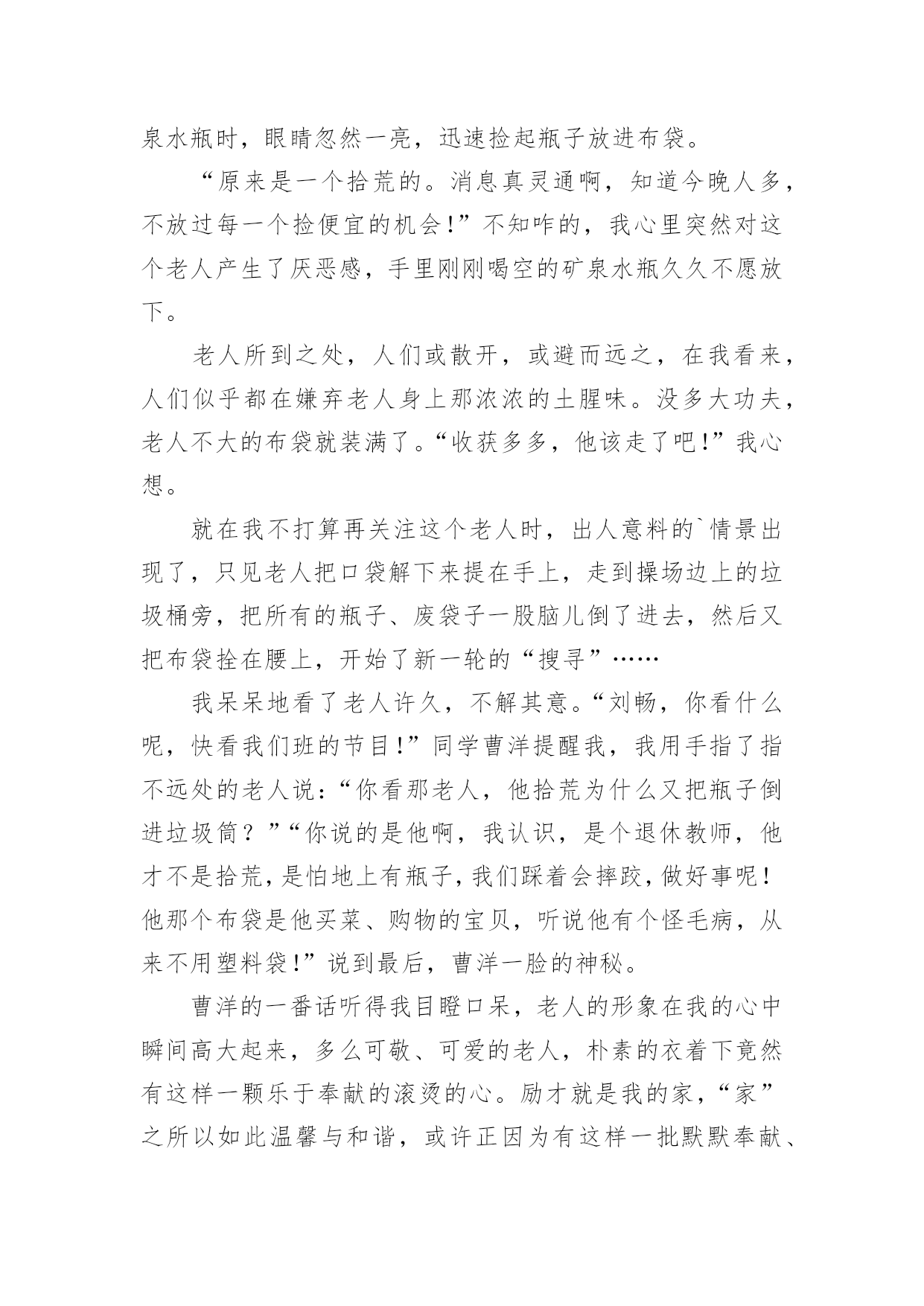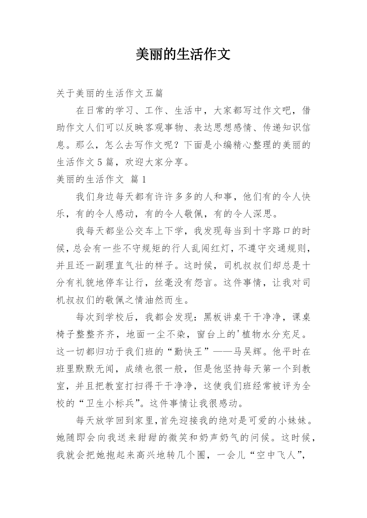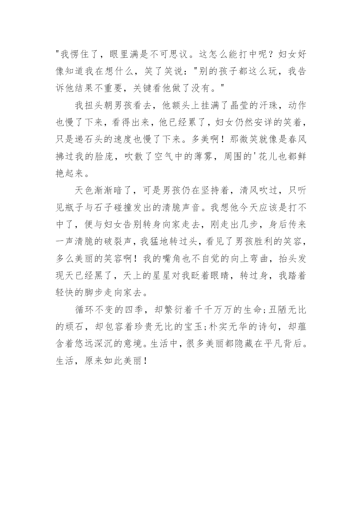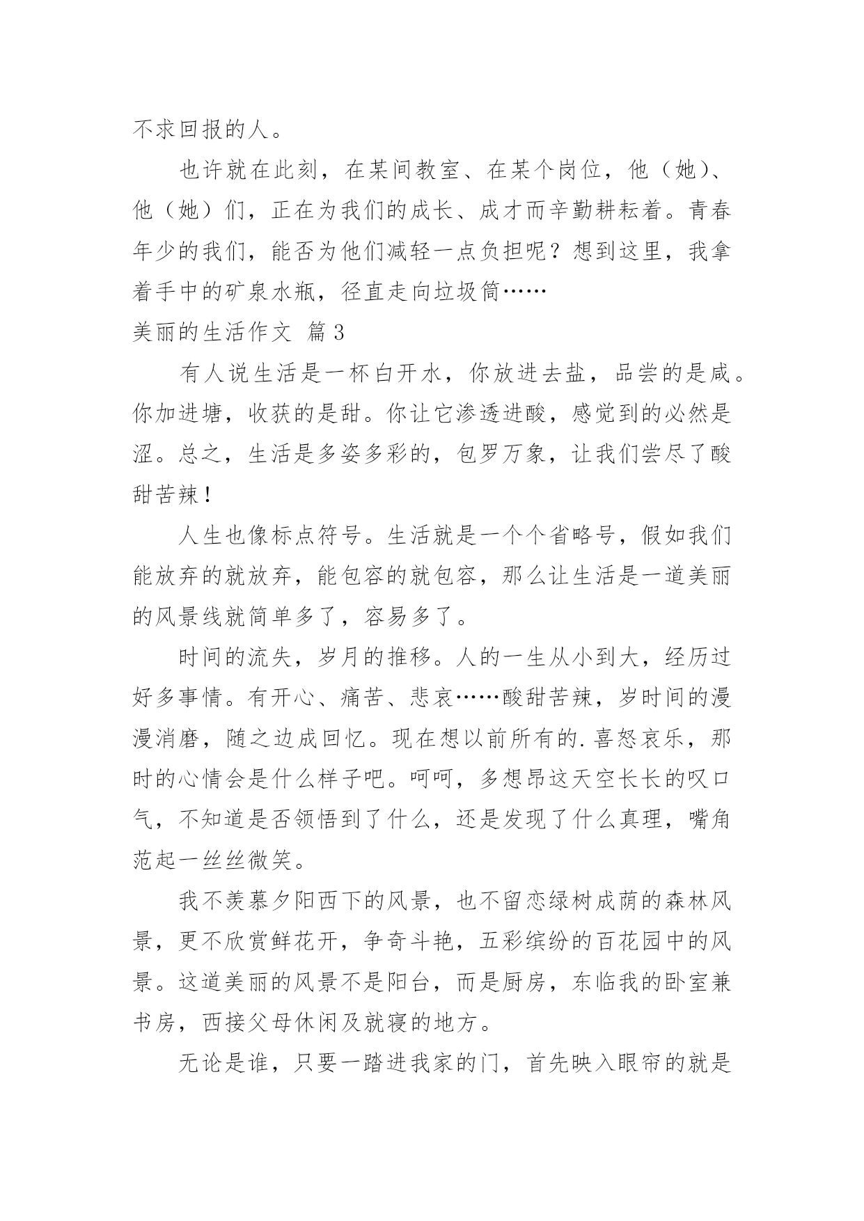 美丽的生活作文关于美丽的生活作文五篇在日常的学习、工作、生活中,大家都写过作文吧,借助作文人们可以反映客观事物、表达思想感情、传递知识信息。那么,怎么去写作文呢?下面是小编精心整理的美丽的生活作文5篇,欢迎大家分享。美丽的生活作文篇1我们身边每天都有许许多多的人和事,他们有的令人快乐,有的令人感动,有的令人敬佩,有的令人深思。我每天都坐公交车上下学,我发现每当到十字路口的时候,总会有一些不守规矩的行人乱闯红灯,不遵守交通规则,并且还一副理直气壮的样子。这时候,司机叔叔们却总是十分有礼貌地停车让行,丝毫没有怨言。这件事情,让我对司机叔叔们的敬佩之情油然而生。每次到学校后,我都会发现:黑板讲桌干干净净,课桌椅子整整齐齐,地面一尘不染,窗台上的'植物水分充足。这一切都归功于我们班的“勤快王”——马吴辉。他平时在班里默默无闻,成绩也很一般,但是他坚持每天第一个到教室,并且把教室打扫得干干净净,这使我们班经常被评为全校的“卫生小标兵”。这件事情让我很感动。每天放学回到家里,首先迎接我的绝对是可爱的小妹妹。她随即会向我送来甜甜的微笑和奶声奶气的问候。这时候,我就会把她抱起来高兴地转几个圈,一会儿“空中飞人”,一会儿“小鸟飞翔”,逗得她“咯咯”直笑。晚上睡觉前,妹妹躺在摇篮里,我给她弹着美妙优雅的钢琴曲。妹妹吸吮着小指头,睡眼蒙?地望着我,不一会儿就进入了梦乡。妹妹就像一个快乐的小天使,她活泼的性格让我们家里总是充满了欢声笑语,也让我的生活变得有趣快乐。我们的身边有着许许多多的人和事,他们也许很微小,甚至根本引不起人们的注意,但都会令人感动、快乐、深思,把我们的生活装点得美丽纷呈。美丽的生活作文篇210月8日晚,“励才就是我的家”中秋国庆晚会在阵阵热烈的欢呼声中激情开场。舞台上,劲歌热舞,青春飞扬;操场上,人头攒动,欢歌笑语。整个校园洋溢着家的温馨、和谐与欢乐。在欢乐的人群中,我发现了这么一个人,他不时弯下腰找寻什么,一会儿东,一会儿西,一会儿南,一会儿北。舞台上的表演格外精彩,他似乎不为所动,眼睛一直盯着地面,好像有什么东西丢了似的。老人六旬开外,头发半白,一条黑色裤子,一件洗得发白的衬衫,一双绿军鞋,看上去并不富裕,他的什么东西丢了呢?老人的后面跟着一个手拿几根荧光棒玩耍的小孩,孩子伴随着音乐的节奏不时挥舞着荧光棒,开心极了。老人的腰间拴着一个布制口袋,走着走着,当他看到地上有一个空矿泉水瓶时,眼睛忽然一亮,迅速捡起瓶子放进布袋。“原来是一个拾荒的。消息真灵通啊,知道今晚人多,不放过每一个捡便宜的机会!”不知咋的,我心里突然对这个老人产生了厌恶感,手里刚刚喝空的矿泉水瓶久久不愿放下。老人所到之处,人们或散开,或避而远之,在我看来,人们似乎都在嫌弃老人身上那浓浓的土腥味。没多大功夫,老人不大的布袋就装满了。“收获多多,他该走了吧!”我心想。就在我不打算再关注这个老人时,出人意料的`情景出现了,只见老人把口袋解下来提在手上,走到操场边上的垃圾桶旁,把所有的瓶子、废袋子一股脑儿倒了进去,然后又把布袋拴在腰上,开始了新一轮的“搜寻”……我呆呆地看了老人许久,不解其意。“刘畅,你看什么呢,快看我们班的节目!”同学曹洋提醒我,我用手指了指不远处的老人说:“你看那老人,他拾荒为什么又把瓶子倒进垃圾筒?”“你说的是他啊,我认识,是个退休教师,他才不是拾荒,是怕地上有瓶子,我们踩着会摔跤,做好事呢!他那个布袋是他买菜、购物的宝贝,听说他有个怪毛病,从来不用塑料袋!”说到最后,曹洋一脸的神秘。曹洋的一番话听得我目瞪口呆,老人的形象在我的心中瞬间高大起来,多么可敬、可爱的老人,朴素的衣着下竟然有这样一颗乐于奉献的滚烫的心。励才就是我的家,“家”之所以如此温馨与和谐,或许正因为有这样一批默默奉献、不求回报的人。也许就在此刻,在某间教室、在某个岗位,他(她)、他(她)们,正在为我们的成长、成才而辛勤耕耘着。青春年少的我们,能否为他们减轻一点负担呢?想到这里,我拿着手中的矿泉水瓶,径直走向垃圾筒……美丽的生活作文篇3有人说生活是一杯白开水,你放进去盐,品尝的是咸。你加进塘,收获的是甜。你让它渗透进酸,感觉到的必然是涩。总之,生活是多姿多彩的,包罗万象,让我们尝尽了酸甜苦辣!人生也像标点符号。生活就是一个个省略号,假如我们能放弃的就放弃,能包容的就包容,那么让生活是一道美丽的风景线就简单多了,容易多了。时间的流失,岁月的推移。人的一生从小到大,经历过好多事情。有开心、痛苦、悲哀……酸甜苦辣,岁时间的漫漫消磨,随之边成回忆。现在想以前所有的.喜怒哀乐,那时的心情会是什么样子吧。呵呵,多想昂这天空长长的叹口气,不知道是否领悟到了什么,还是发现了什么真理,嘴角范起一丝丝微笑。我不羡慕夕阳西下的风景,也不留恋绿树成荫的森林风景,更不欣赏鲜花开,争奇斗艳,五彩缤纷的百花园
