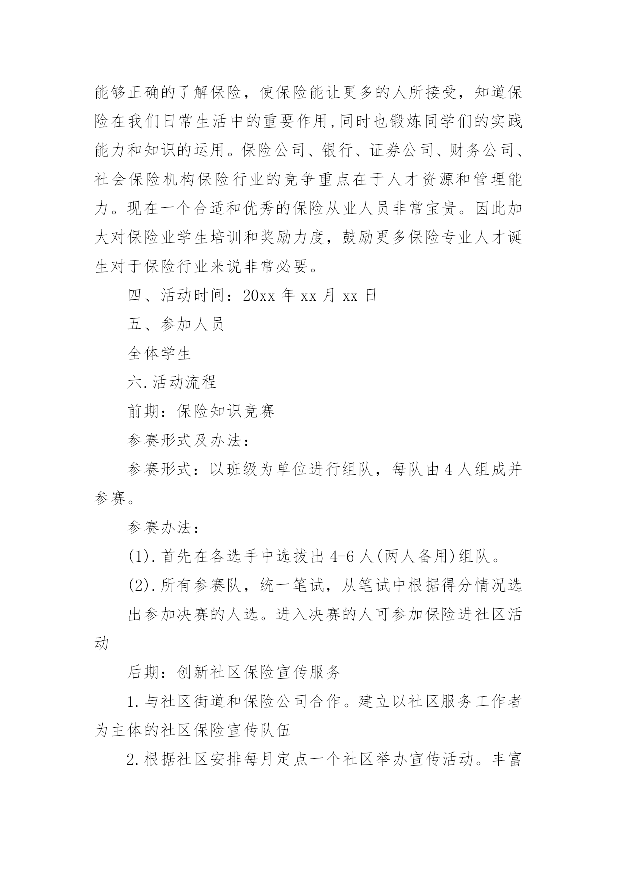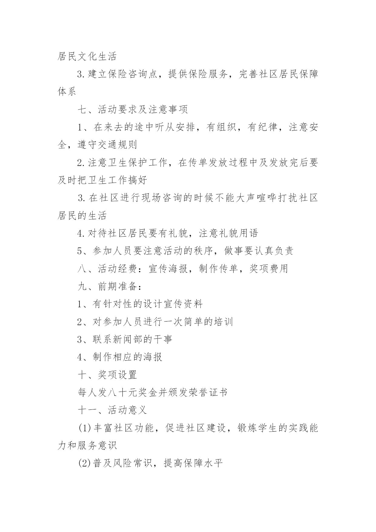 保险公司营销活动方案优秀保险公司营销活动方案优秀为了确保工作或事情顺利进行,常常需要提前制定一份优秀的方案,方案可以对一个行动明确一个大概的方向。那么应当如何制定方案呢?以下是小编为大家收集的保险公司营销活动方案优秀,仅供参考,希望能够帮助到大家。一、活动背景保险就是保障生活的一种的方式。如今,保险业在中国发展迅速。一些人也尝试了保险,但似乎,保险并不怎么得人心。说起保险,有人不屑,有人排斥,甚至还有人发出“保险是骗人的”这样的慨叹。有的买了保险的,却不知道具体是怎样的情况,白白浪费了许多可行使的权利。这是个非常严峻的问题。为什么会出现这种情况呢?是因为许多人不了解保险,只是道听途说一些,对于保险的知识不明确,还存在许多误区。我们这次举办的“保险知识进社区”活动就是为了让居民了解保险知识,让他们明白保险的好处并能从中受益,使保险能被更多的人认可。让更多的人“明明白白买保险,安安心心过生活”。二、活动主题发展保险,为就业保驾护航三、活动目的通过咨询或发放有关保险知识方面的传单让更多的人能够正确的了解保险,使保险能让更多的人所接受,知道保险在我们日常生活中的重要作用,同时也锻炼同学们的实践能力和知识的运用。保险公司、银行、证券公司、财务公司、社会保险机构保险行业的竞争重点在于人才资源和管理能力。现在一个合适和优秀的保险从业人员非常宝贵。因此加大对保险业学生培训和奖励力度,鼓励更多保险专业人才诞生对于保险行业来说非常必要。四、活动时间:20xx年xx月xx日五、参加人员全体学生六.活动流程前期:保险知识竞赛参赛形式及办法:参赛形式:以班级为单位进行组队,每队由4人组成并参赛。参赛办法:(1).首先在各选手中选拔出4-6人(两人备用)组队。(2).所有参赛队,统一笔试,从笔试中根据得分情况选出参加决赛的人选。进入决赛的人可参加保险进社区活动后期:创新社区保险宣传服务1.与社区街道和保险公司合作。建立以社区服务工作者为主体的社区保险宣传队伍2.根据社区安排每月定点一个社区举办宣传活动。丰富居民文化生活3.建立保险咨询点,提供保险服务,完善社区居民保障体系七、活动要求及注意事项1、在来去的途中听从安排,有组织,有纪律,注意安全,遵守交通规则2.注意卫生保护工作,在传单发放过程中及发放完后要及时把卫生工作搞好3.在社区进行现场咨询的时候不能大声喧哗打扰社区居民的生活4.对待社区居民要有礼貌,注意礼貌用语5、参加人员要注意活动的秩序,做事要认真负责八、活动经费:宣传海报,制作传单,奖项费用九、前期准备:1、有针对性的设计宣传资料2、对参加人员进行一次简单的培训3、联系新闻部的干事4、制作相应的海报十、奖项设置每人发八十元奖金并颁发荣誉证书十一、活动意义(1)丰富社区功能,促进社区建设,锻炼学生的实践能力和服务意识(2)普及风险常识,提高保障水平树立科学的保险消费理念,提高投保率从而提高居民保障水平,实现社区居民“人人有保险、户户有保障”,提高社区居民的生活水平和质量。(3)强化社会管理,服务和谐社会开展社区保险,不应简单地看作是一种商业行为,更应将保险作为一种促进居民和谐、社区繁荣的管理工具。