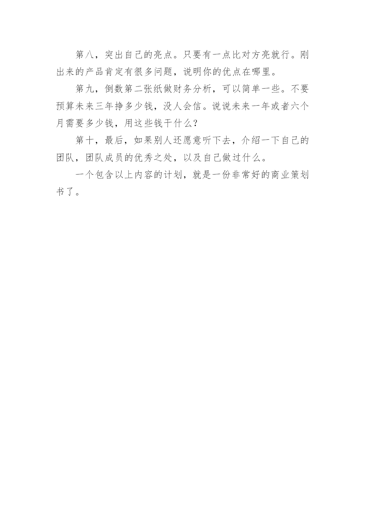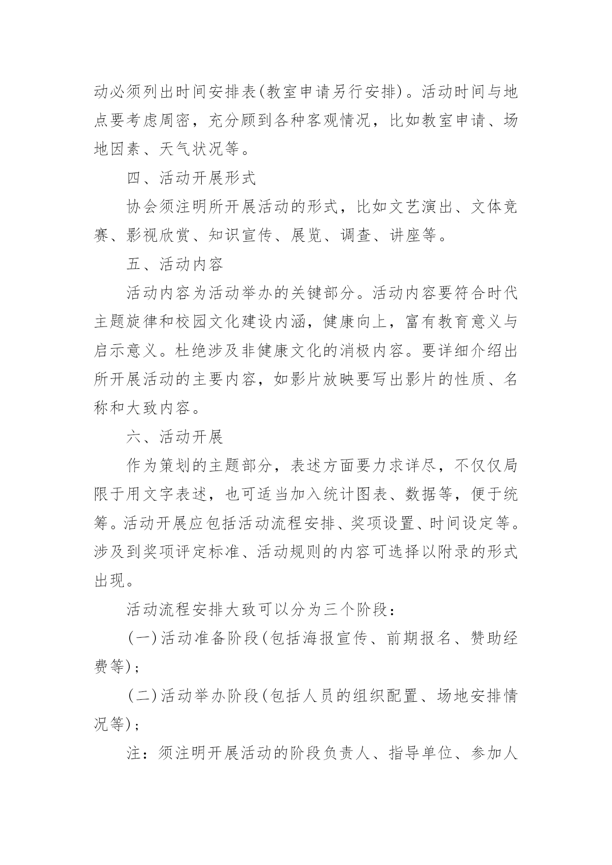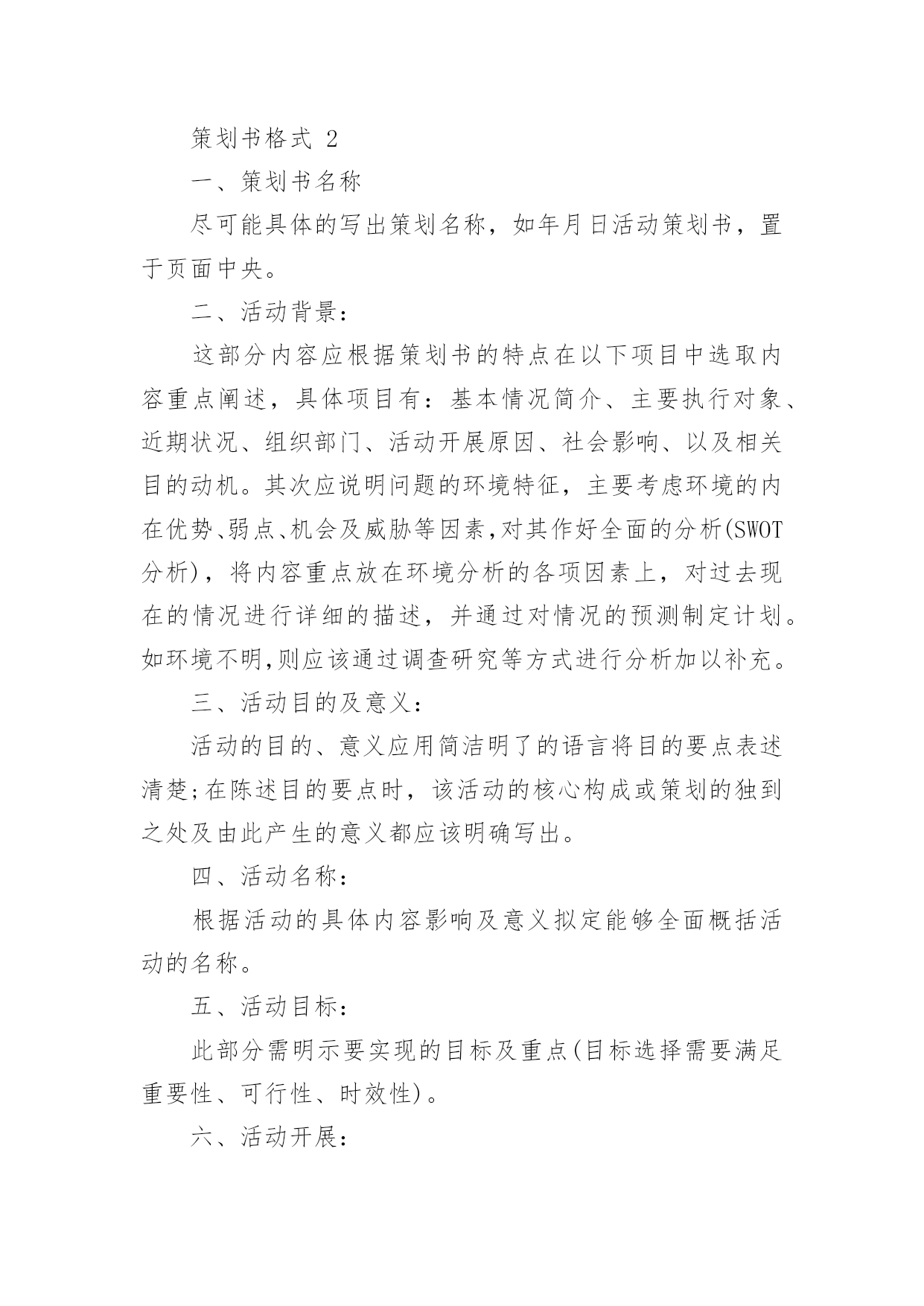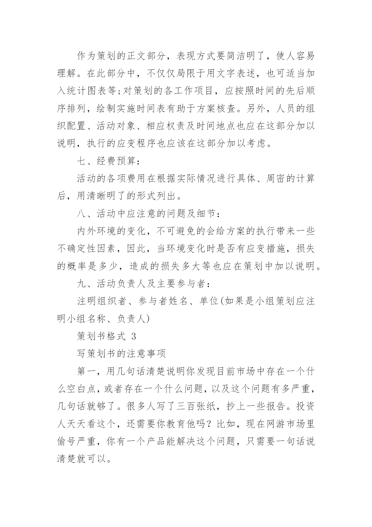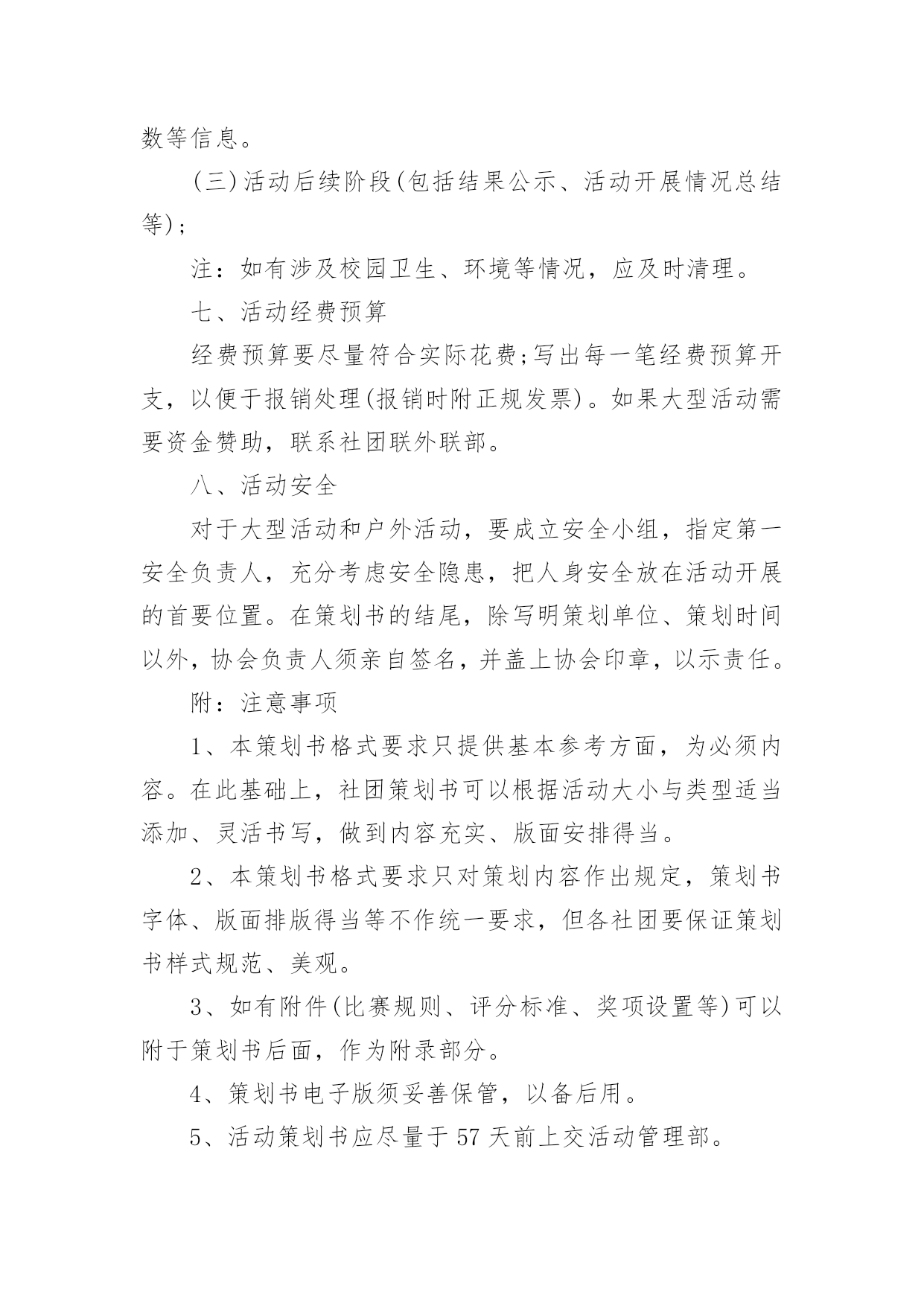 策划书格式策划书格式模板不经意间,工作已经告一段落,我们的工作又将迎来新的任务和目标,我们要好好制定今后的工作方法,写一份策划书了。相信写策划书是一个让许多人都头痛的问题,下面是小编收集整理的策划书格式模板,欢迎阅读,希望大家能够喜欢。策划书格式1一、策划书名称写清策划书名称,简单明了,如xx活动策划书,xx为活动内容或活动主题,不需要冠以协会名称。如果需要冠名协会,则可以考虑以正、副标题的形式出现。避免使用诸如社团活动策划书等模糊标题。二、活动背景、目的与意义活动背景、活动目的与活动意义要贯穿一致,突出该活动的核心构成或策划的独到之处。活动背景要求紧扣时代背景、社会背景与教育背景,鲜明体现在活动主题上;活动目的即活动举办要达到一个什么样的目标,陈述活动目的要简洁明了,要具体化;活动意义其中包括文化意义、教育意义和社会效益,及预期在活动中产生怎样的效果或影响等,书写应明确、具体、到位。三、活动时间与地点该项必须详细写出,非一次性举办的常规活动、项目活动必须列出时间安排表(教室申请另行安排)。活动时间与地点要考虑周密,充分顾到各种客观情况,比如教室申请、场地因素、天气状况等。四、活动开展形式协会须注明所开展活动的形式,比如文艺演出、文体竞赛、影视欣赏、知识宣传、展览、调查、讲座等。五、活动内容活动内容为活动举办的关键部分。活动内容要符合时代主题旋律和校园文化建设内涵,健康向上,富有教育意义与启示意义。杜绝涉及非健康文化的消极内容。要详细介绍出所开展活动的主要内容,如影片放映要写出影片的性质、名称和大致内容。六、活动开展作为策划的主题部分,表述方面要力求详尽,不仅仅局限于用文字表述,也可适当加入统计图表、数据等,便于统筹。活动开展应包括活动流程安排、奖项设置、时间设定等。涉及到奖项评定标准、活动规则的内容可选择以附录的形式出现。活动流程安排大致可以分为三个阶段:(一)活动准备阶段(包括海报宣传、前期报名、赞助经费等);(二)活动举办阶段(包括人员的组织配置、场地安排情况等);注:须注明开展活动的阶段负责人、指导单位、参加人数等信息。(三)活动后续阶段(包括结果公示、活动开展情况总结等);注:如有涉及校园卫生、环境等情况,应及时清理。七、活动经费预算经费预算要尽量符合实际花费;写出每一笔经费预算开支,以便于报销处理(报销时附正规发票)。如果大型活动需要资金赞助,联系社团联外联部。八、活动安全对于大型活动和户外活动,要成立安全小组,指定第一安全负责人,充分考虑安全隐患,把人身安全放在活动开展的首要位置。在策划书的结尾,除写明策划单位、策划时间以外,协会负责人须亲自签名,并盖上协会印章,以示责任。附:注意事项1、本策划书格式要求只提供基本参考方面,为必须内容。在此基础上,社团策划书可以根据活动大小与类型适当添加、灵活书写,做到内容充实、版面安排得当。2、本策划书格式要求只对策划内容作出规定,策划书字体、版面排版得当等不作统一要求,但各社团要保证策划书样式规范、美观。3、如有附件(比赛规则、评分标准、奖项设置等)可以附于策划书后面,作为附录部分。4、策划书电子版须妥善保管,以备后用。5、活动策划书应尽量于57天前上交活动管理部。策划书格式2一、策划书名称尽可能具体的写出策划名称,如年月日活动策划书,置于页面中央。二、活动背景:这部分内容应根据策划书的特点在以下项目中选取内容重点阐述,具体项目有:基本情况简介、主要执行对象、近期状况、组织部门、活动开展原因、社会影响、以及相关目的动机。其次应说明问题的环境特征,主要考虑环境的内在优势、弱点、机会及威胁等因素,对其作好全面的分析(SWOT分析),将内容重点放在环境分析的各项因素上,对过去现在的情况进行详细的描述,并通过对情况的预测制定计划。如环境不明,则应该通过调查研究等方式进行分析加以补充。三、活动目的及意义:活动的目的、意义应用简洁明了的语言将目的要点表述清楚;在陈述目的要点时,该活动的核心构成或策划的独到之处及由此产生的意义都应该明确写出。四、活动名称:根据活动的具体内容影响及意义拟定能够全面概括活动的名称。五、活动目标:此部分需明示要实现的目标及重点(目标选择需要满足重要性、可行性、时效性)。六、活动开展:作为策划的正文部分,表现方式要简洁明了,使人容易理解。在此部分中,不仅仅局限于用文字表述,也可适当加入统计图表等;对策划的各工作项目,应按照时间的先后顺序排列,绘制实施时间表有助于方案核查。另外,人员的组织配置、活动对象、相应权责及时间地点也应在这部分加以说明,执行的应变程序也应该在这部分加以考虑。七、经费预算:活动的各项费用在根据实际情况进行具体、周密的计算后,用清晰明了的形式列出。八、活动中应注意的问题及细节:内外环境的变化,不可避免的会给方案的执行带来一些不确定性因素,因此