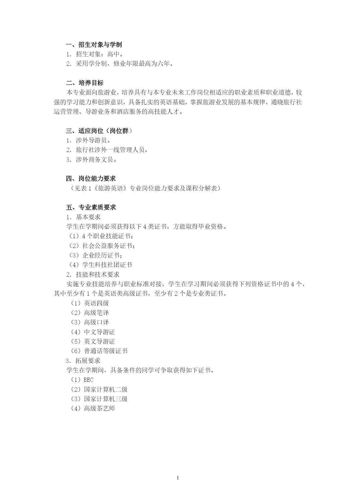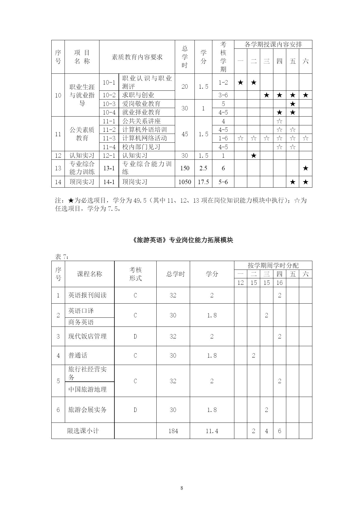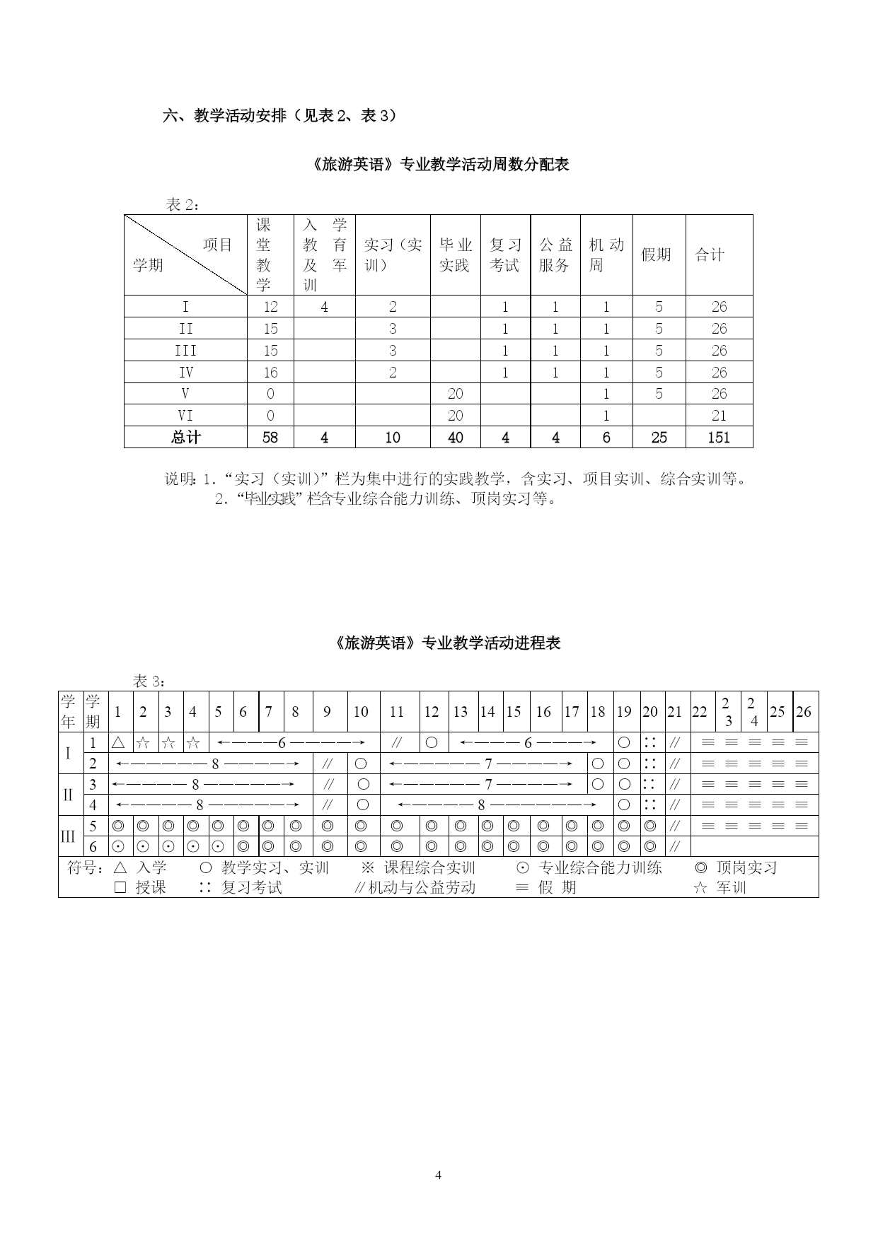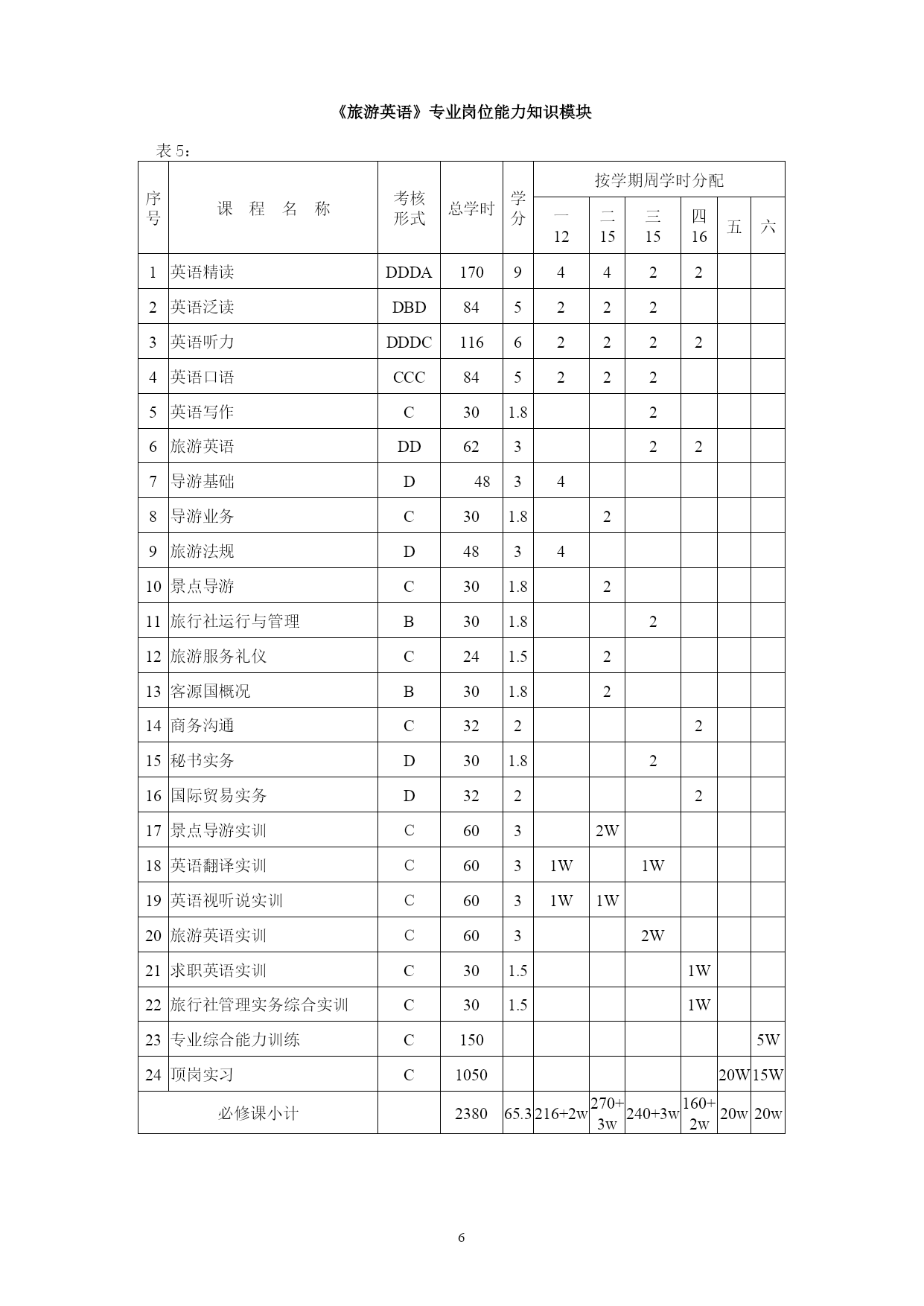 PAGEPAGEPAGE322旅游英语专业人才培养方案商贸旅游系旅游英语教研室一、招生对象与学制1.招生对象:高中。2.采用学分制,修业年限最高为六年。二、培养目标本专业面向旅游业,培养具有与本专业未来工作岗位相适应的职业素质和职业道德,较强的学习能力和创新意识,具备扎实的英语基础,掌握旅游业发展的基本规律,通晓旅行社运营管理、导游业务和酒店服务的高技能人才。三、适应岗位(岗位群)1.涉外导游员。2.旅行社涉外一线管理人员。3.涉外商务文员。四、岗位能力要求(见表1《旅游英语》专业岗位能力要求及课程分解表)五、专业素质要求1.基本要求学生在学期间必须获得以下4类证书,方能取得毕业资格。(1)4个职业技能证书;(2)社会公益服务证书;(3)企业经历证书;(4)学生科技社团证书2.技能和技术要求实施专业技能培养与职业标准对接,学生在学习期间必须获得下列资格证书中的4个,其中至少有1个是英语类高级证书,至少有2个是专业类证书。(1)英语四级(2)高级笔译(3)高级口译(4)中文导游证(5)英文导游证(6)普通话等级证书3.拓展要求学生在学期间,具备条件的同学可争取获得如下证书。(1)BEC(2)国家计算机二级(3)国家计算机三级(4)高级茶艺师《旅游英语》专业岗位能力要求及课程分解表表1:岗位及岗位群岗位能力岗位具体能力要求干什么学什么缺什么补什么要什么给什么备注对应课程支撑课程名称及主要内容名称及主要内容名称及主要内容名称及主要内容1.涉外导游员。2.旅行社涉外一线管理人员。3.涉外商务文员。导游业务能力及英语语言运用能力1.熟练掌握涉外导游业务涉及的语言应用能力,达到国家英语导游员资格标准。2.掌握英语听、说、读写基本技能,达到大英语四级水平要求。3.具备在涉外交流中处理商业信函,翻译英文资料、接待境外商务人员的能力。1.英语精读2.英语泛读3.英语听力4.英语口语5.英语写作6.旅游英语7.英语翻译实训1.英语视听说实训旅游英语实训求职英语实训A岗位能力拓展模块1.英语报刊阅读2.普通话3.现代饭店管理4英语口译商务英语5.旅行社经营实务中国旅游地理6.旅游会展实务B职业素质教育与拓展模块(见表6:职业素质教学与拓展模块)A岗位能力提升模块a.语言模块1.英文电影欣赏2.英美社会与文化3.韩语/日语基础b.旅游业务模块1.旅游经济原理2.人力资源管理3.旅游资源规划与开发c.商务接待模块1.管理学基础2.公关礼仪3.管理沟通技巧B基础技能知识拓展模块(见表9:基础技能知识展模块)C专业能力提升模块(见表10:专业能力提升模块)导游业务能力及英语语言运用能力1.熟练掌握导游相关服务技能,达到国家导游员资格标准。2.熟悉导游业务各流程,具备处理导游事务的能力,达到高级导游员的水平要求。3.具备与境外旅游和境内接待业务相关的组织和协调能力。1.导游基础2.导游业务3.旅游法规4.景点导游5.旅行社运行与管理1.客源国概况2.旅游服务礼仪3.景点导游实训4.旅行社管理实物综合实训涉外商务接待能力1.熟悉对外贸易实务流程,能够处理英文商务文件。2.掌握涉外服务技能,能够进行商务接待。3.具备扎实的英语文字能力,能够进行文献、资料的翻译与整理。1.商务沟通1.国际贸易实务2.秘书实务PAGEPAGEPAGE1822六、教学活动安排(见表2、表3)《旅游英语》专业教学活动周数分配表表2:项目学期课堂教学入学教育及军训实习(实训)毕业实践复习考试公益服务机动周假期合计I1242111526II153111526III153111526IV162111526V0201526VI020121总计584104044625151说明:1.“实习(实训)”栏为集中进行的实践教学,含实习、项目实训、综合实训等。2.“毕业实践”栏含专业综合能力训练、顶岗实习等。《旅游英语》专业教学活动进程表表3:学年学期1234567891011121314151617181920212223242526Ⅰ1△☆☆☆←———6————→∥○←———6———→○∷∥≡≡≡≡≡2←—————8————→∥○←—————7————→○○∷∥≡≡≡≡≡Ⅱ3←————8—————→∥○←—————7————→○○∷∥≡≡≡≡≡4←————8—————→∥○←————8——————→○∷∥≡≡≡≡≡Ⅲ5◎◎◎◎◎◎◎◎◎◎◎◎◎◎◎◎◎◎
