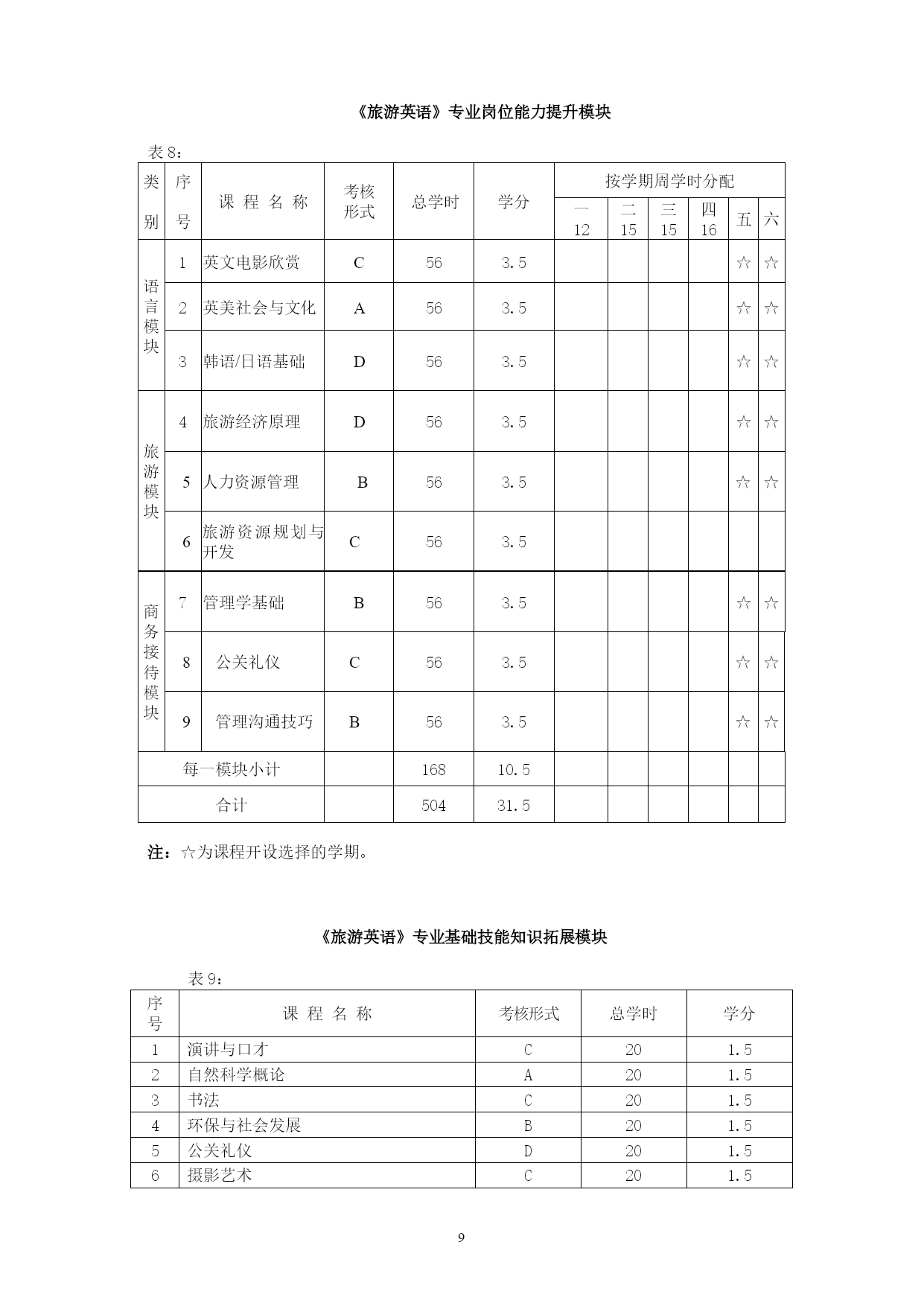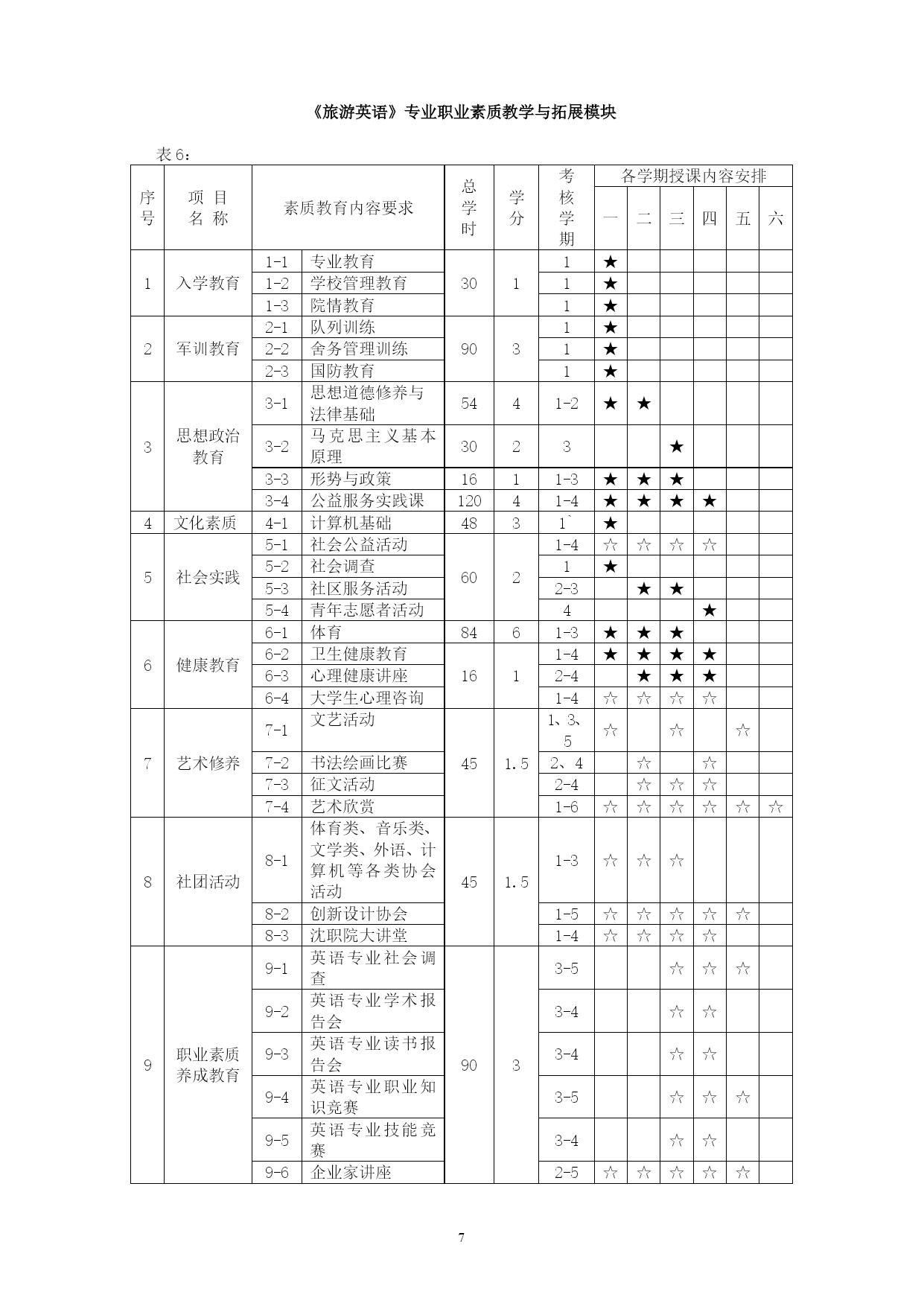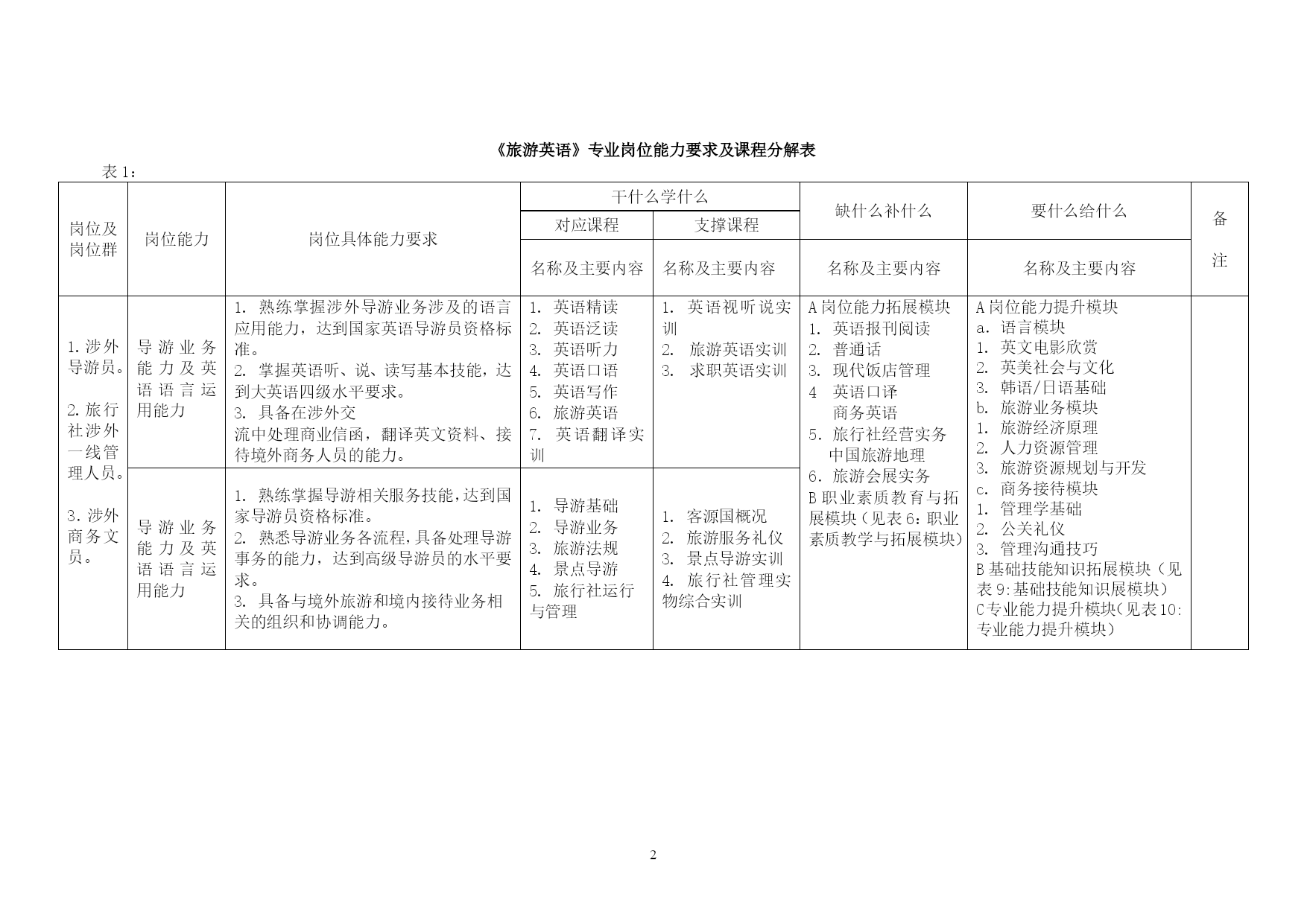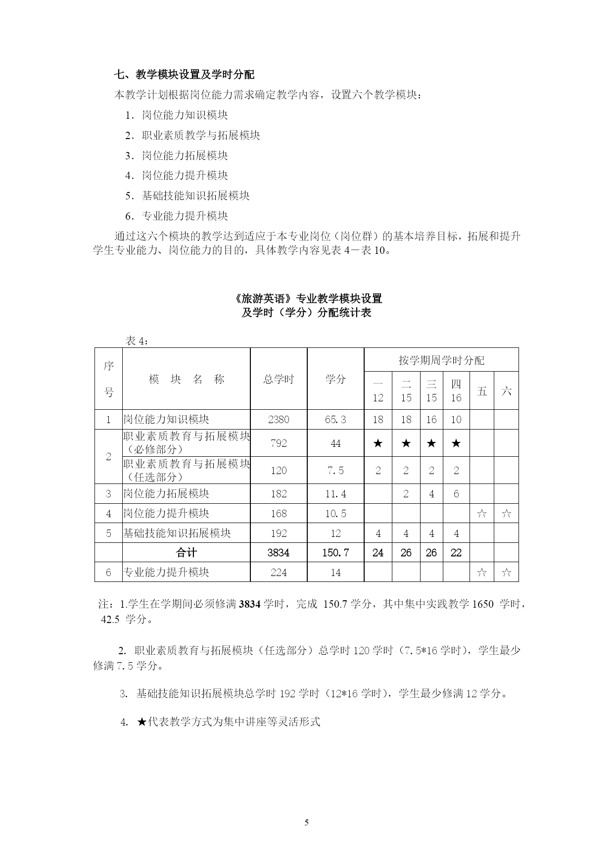 PAGEPAGEPAGE322旅游英语专业人才培养方案商贸旅游系旅游英语教研室一、招生对象与学制1.招生对象:高中。2.采用学分制,修业年限最高为六年。二、培养目标本专业面向旅游业,培养具有与本专业未来工作岗位相适应的职业素质和职业道德,较强的学习能力和创新意识,具备扎实的英语基础,掌握旅游业发展的基本规律,通晓旅行社运营管理、导游业务和酒店服务的高技能人才。三、适应岗位(岗位群)1.涉外导游员。2.旅行社涉外一线管理人员。3.涉外商务文员。四、岗位能力要求(见表1《旅游英语》专业岗位能力要求及课程分解表)五、专业素质要求1.基本要求学生在学期间必须获得以下4类证书,方能取得毕业资格。(1)4个职业技能证书;(2)社会公益服务证书;(3)企业经历证书;(4)学生科技社团证书2.技能和技术要求实施专业技能培养与职业标准对接,学生在学习期间必须获得下列资格证书中的4个,其中至少有1个是英语类高级证书,至少有2个是专业类证书。(1)英语四级(2)高级笔译(3)高级口译(4)中文导游证(5)英文导游证(6)普通话等级证书3.拓展要求学生在学期间,具备条件的同学可争取获得如下证书。(1)BEC(2)国家计算机二级(3)国家计算机三级(4)高级茶艺师《旅游英语》专业岗位能力要求及课程分解表表1:岗位及岗位群岗位能力岗位具体能力要求干什么学什么缺什么补什么要什么给什么备注对应课程支撑课程名称及主要内容名称及主要内容名称及主要内容名称及主要内容1.涉外导游员。2.旅行社涉外一线管理人员。3.涉外商务文员。导游业务能力及英语语言运用能力1.熟练掌握涉外导游业务涉及的语言应用能力,达到国家英语导游员资格标准。2.掌握英语听、说、读写基本技能,达到大英语四级水平要求。3.具备在涉外交流中处理商业信函,翻译英文资料、接待境外商务人员的能力。1.英语精读2.英语泛读3.英语听力4.英语口语5.英语写作6.旅游英语7.英语翻译实训1.英语视听说实训旅游英语实训求职英语实训A岗位能力拓展模块1.英语报刊阅读2.普通话3.现代饭店管理4英语口译商务英语5.旅行社经营实务中国旅游地理6.旅游会展实务B职业素质教育与拓展模块(见表6:职业素质教学与拓展模块)A岗位能力提升模块a.语言模块1.英文电影欣赏2.英美社会与文化3.韩语/日语基础b.旅游业务模块1.旅游经济原理2.人力资源管理3.旅游资源规划与开发c.商务接待模块1.管理学基础2.公关礼仪3.管理沟通技巧B基础技能知识拓展模块(见表9:基础技能知识展模块)C专业能力提升模块(见表10:专业能力提升模块)导游业务能力及英语语言运用能力1.熟练掌握导游相关服务技能,达到国家导游员资格标准。2.熟悉导游业务各流程,具备处理导游事务的能力,达到高级导游员的水平要求。3.具备与境外旅游和境内接待业务相关的组织和协调能力。1.导游基础2.导游业务3.旅游法规4.景点导游5.旅行社运行与管理1.客源国概况2.旅游服务礼仪3.景点导游实训4.旅行社管理实物综合实训涉外商务接待能力1.熟悉对外贸易实务流程,能够处理英文商务文件。2.掌握涉外服务技能,能够进行商务接待。3.具备扎实的英语文字能力,能够进行文献、资料的翻译与整理。1.商务沟通1.国际贸易实务2.秘书实务PAGEPAGEPAGE1822六、教学活动安排(见表2、表3)《旅游英语》专业教学活动周数分配表表2:项目学期课堂教学入学教育及军训实习(实训)毕业实践复习考试公益服务机动周假期合计I1242111526II153111526III153111526IV162111526V0201526VI020121总计584104044625151说明:1.“实习(实训)”栏为集中进行的实践教学,含实习、项目实训、综合实训等。2.“毕业实践”栏含专业综合能力训练、顶岗实习等。《旅游英语》专业教学活动进程表表3:学年学期1234567891011121314151617181920212223242526Ⅰ1△☆☆☆←———6————→∥○←———6———→○∷∥≡≡≡≡≡2←—————8————→∥○←—————7————→○○∷∥≡≡≡≡≡Ⅱ3←————8—————→∥○←—————7————→○○∷∥≡≡≡≡≡4←————8—————→∥○←————8——————→○∷∥≡≡≡≡≡Ⅲ5◎◎◎◎◎◎◎◎◎◎◎◎◎◎◎◎◎◎