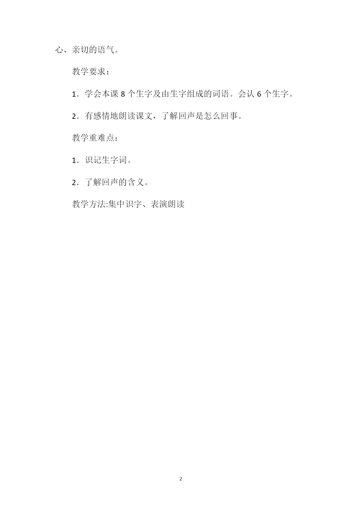 PAGEPAGE2《回声》教学设计二一、导入新课。今天,我们来学习生字词。1.指名读课后的生字,并说说课文中由这些字组成的词。2.抽卡认读8个生字的字意,并说说每个字的结构。读新词。(可板书在黑板一则)二、学生练习生字词。1.指导学生练习生字,学会组词。2.抄写生字词,加强巩固。课后反思:大多数学生对回声的了解只是停留在感性的认识层面上,有的甚至还没碰到过这种情况,对回声的形成更是不明白。为突破这教学难点,我采用了直观演示的方法,通过演示青蛙妈妈投石击水和小青蛙在桥洞下面的叫声,让学生理解了回声是怎样形成的在阅读教学中我把读贯穿于全文。通过多种形式的朗读,激发孩子们的朗读热情。例如:、师生互读、齐读、默读、表演读、赛读、带动作读等等。经过教师的适时引导,学生能根据小青蛙对回声的认识的变化,读出不同的语气。由赞美到奇怪到欢乐。读出青蛙妈妈耐心、亲切的语气。教学要求:1.学会本课8个生字及由生字组成的词语。会认6个生字。2.有感情地朗读课文,了解回声是怎么回事。教学重难点:1.识记生字词。2.了解回声的含义。教学方法:集中识字、表演朗读