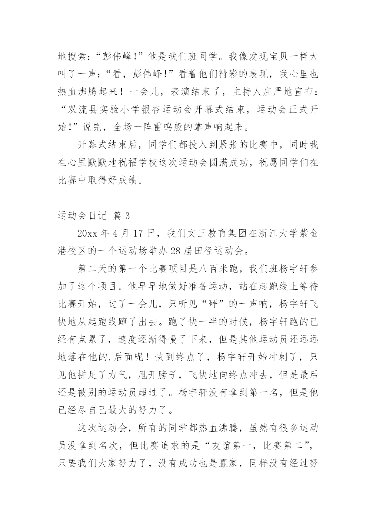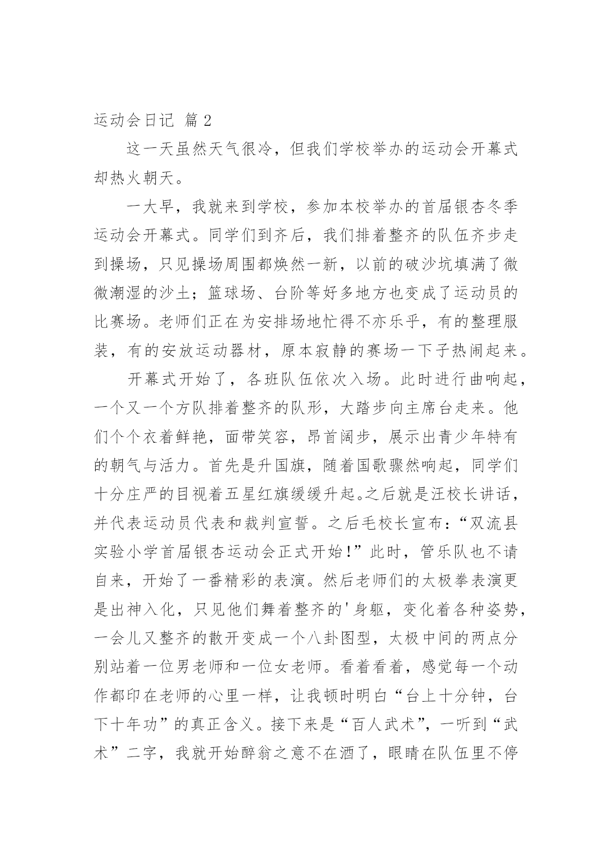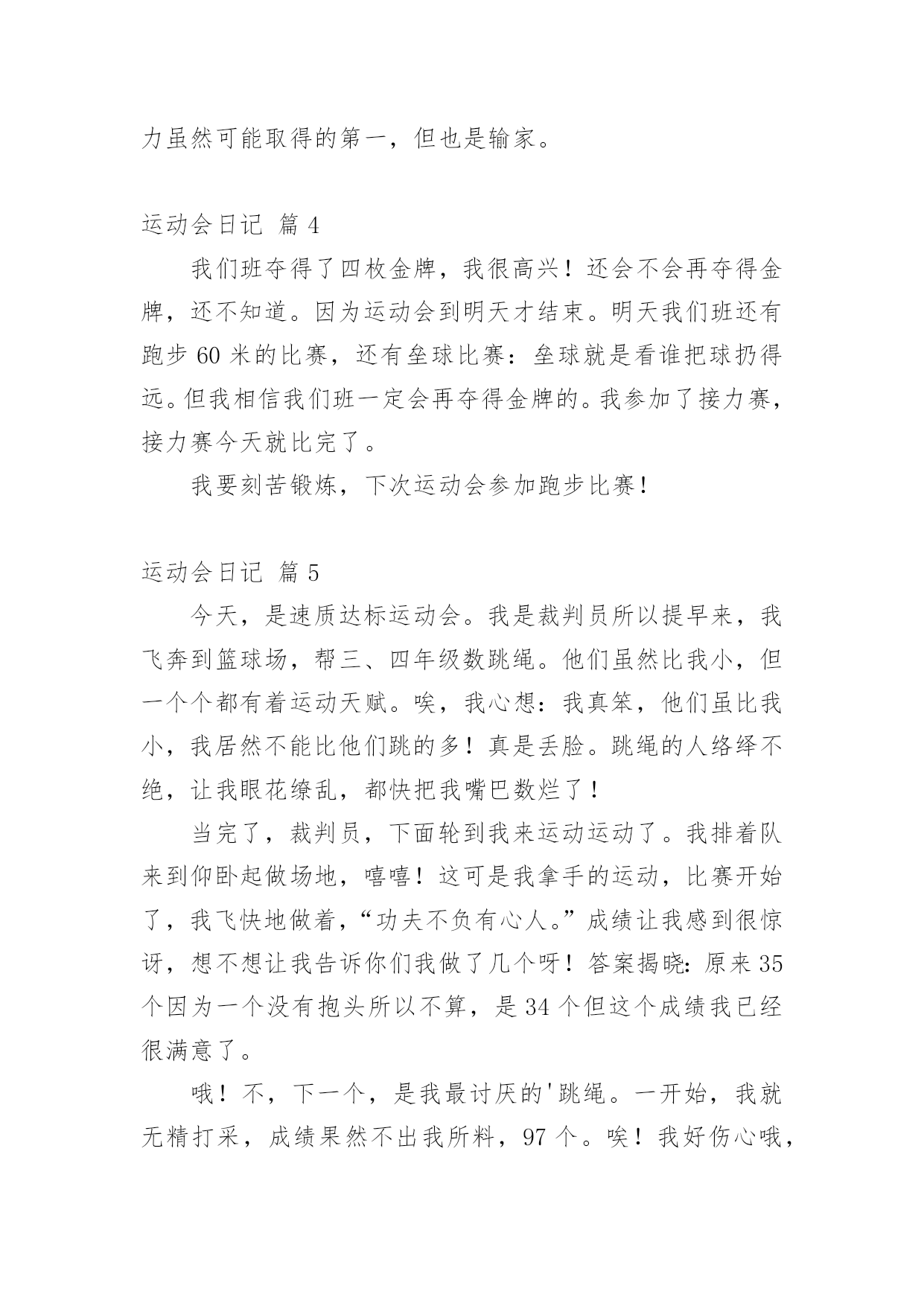 运动会日记【推荐】运动会日记范文集锦5篇时间过得真快,一天又过去了,我们一定有不少所感触的事情吧,需要进行好好的总结并且记录在日记里了。日记你想好怎么写了吗?以下是小编为大家收集的运动会日记5篇,仅供参考,欢迎大家阅读。运动会日记篇1今天学校要开运动会,我比平时都要早来到学校。跑到操场,就快要比赛了。我快速地练了一下足式保龄球和定点投篮,准备比赛。上午比的是定点投篮,轮到我了,我用尽全身的力气把球抛了出去,结果没进。第二次我调整了一下,球进了!跟我进球数相同的有几个小朋友,所以我们还要再比一次,这时候周老师也站在旁边,不知道哪里来的力气,我一下子进了6个球,太奇怪了!足式保龄球是下午进行的.,十个矿泉水瓶摆成三角形,我们用足球踢过去,谁踢倒的水瓶多谁就获得胜利。我第一脚就踢偏了,第二次,我摆好球,用尽力气踢了一脚,结果还是偏了。最后要颁奖了,当我听到体育老师在报二年级女子定点投篮,我是第三名的时候,我好兴奋啊!我跑上去领奖,那时我心里充满着自豪!不知别的小朋友有没有这种感觉。运动会日记篇2这一天虽然天气很冷,但我们学校举办的运动会开幕式却热火朝天。一大早,我就来到学校,参加本校举办的首届银杏冬季运动会开幕式。同学们到齐后,我们排着整齐的队伍齐步走到操场,只见操场周围都焕然一新,以前的破沙坑填满了微微潮湿的沙土;篮球场、台阶等好多地方也变成了运动员的比赛场。老师们正在为安排场地忙得不亦乐乎,有的整理服装,有的安放运动器材,原本寂静的赛场一下子热闹起来。开幕式开始了,各班队伍依次入场。此时进行曲响起,一个又一个方队排着整齐的队形,大踏步向主席台走来。他们个个衣着鲜艳,面带笑容,昂首阔步,展示出青少年特有的朝气与活力。首先是升国旗,随着国歌骤然响起,同学们十分庄严的目视着五星红旗缓缓升起。之后就是汪校长讲话,并代表运动员代表和裁判宣誓。之后毛校长宣布:“双流县实验小学首届银杏运动会正式开始!”此时,管乐队也不请自来,开始了一番精彩的表演。然后老师们的太极拳表演更是出神入化,只见他们舞着整齐的'身躯,变化着各种姿势,一会儿又整齐的散开变成一个八卦图型,太极中间的两点分别站着一位男老师和一位女老师。看着看着,感觉每一个动作都印在老师的心里一样,让我顿时明白“台上十分钟,台下十年功”的真正含义。接下来是“百人武术”,一听到“武术”二字,我就开始醉翁之意不在酒了,眼睛在队伍里不停地搜索:“彭伟峰!”他是我们班同学。我像发现宝贝一样大叫了一声:“看,彭伟峰!”看着他们精彩的表现,我心里也热血沸腾起来!一会儿,表演结束了,主持人庄严地宣布:“双流县实验小学银杏运动会开幕式结束,运动会正式开始!”说完,全场一阵雷鸣般的掌声响起来。开幕式结束后,同学们都投入到紧张的比赛中,同时我在心里默默地祝福学校这次运动会圆满成功,祝愿同学们在比赛中取得好成绩。运动会日记篇320xx年4月17日,我们文三教育集团在浙江大学紫金港校区的一个运动场举办28届田径运动会。第二天的第一个比赛项目是八百米跑,我们班杨宇轩参加了这个项目。他早早地做好准备运动,站在起跑线上等待比赛开始,过了一会儿,只听见“砰”的一声响,杨宇轩飞快地从起跑线蹿了出去。跑了快一半的时候,杨宇轩跑的已经有点累了,速度逐渐得慢了下来,但是其他运动员还远远地落在他的.后面呢!快到终点了,杨宇轩开始冲刺了,只见他拼足了力气,甩开膀子,飞快地向终点冲去,但是最后还是被别的运动员超过了。杨宇轩没有拿到第一名,但是他已经尽自己最大的努力了。这次运动会,所有的同学都热血沸腾,虽然有很多运动员没拿到名次,但比赛追求的是“友谊第一,比赛第二”,只要我们大家努力了,没有成功也是赢家,同样没有经过努力虽然可能取得的第一,但也是输家。运动会日记篇4我们班夺得了四枚金牌,我很高兴!还会不会再夺得金牌,还不知道。因为运动会到明天才结束。明天我们班还有跑步60米的比赛,还有垒球比赛:垒球就是看谁把球扔得远。但我相信我们班一定会再夺得金牌的。我参加了接力赛,接力赛今天就比完了。我要刻苦锻炼,下次运动会参加跑步比赛!运动会日记篇5今天,是速质达标运动会。我是裁判员所以提早来,我飞奔到篮球场,帮三、四年级数跳绳。他们虽然比我小,但一个个都有着运动天赋。唉,我心想:我真笨,他们虽比我小,我居然不能比他们跳的多!真是丢脸。跳绳的人络绎不绝,让我眼花缭乱,都快把我嘴巴数烂了!当完了,裁判员,下面轮到我来运动运动了。我排着队来到仰卧起做场地,嘻嘻!这可是我拿手的运动,比赛开始了,我飞快地做着,“功夫不负有心人。”成绩让我感到很惊讶,想不想让我告诉你们我做了几个呀!答案揭晓:原来35个因为一个没有抱头所以不算,是34个但这个成绩我已经很满意了。哦!不,下一个,是我最讨厌的'跳绳。一开始,我就无精打采,成绩果然不出我所料,97个。唉!我好伤