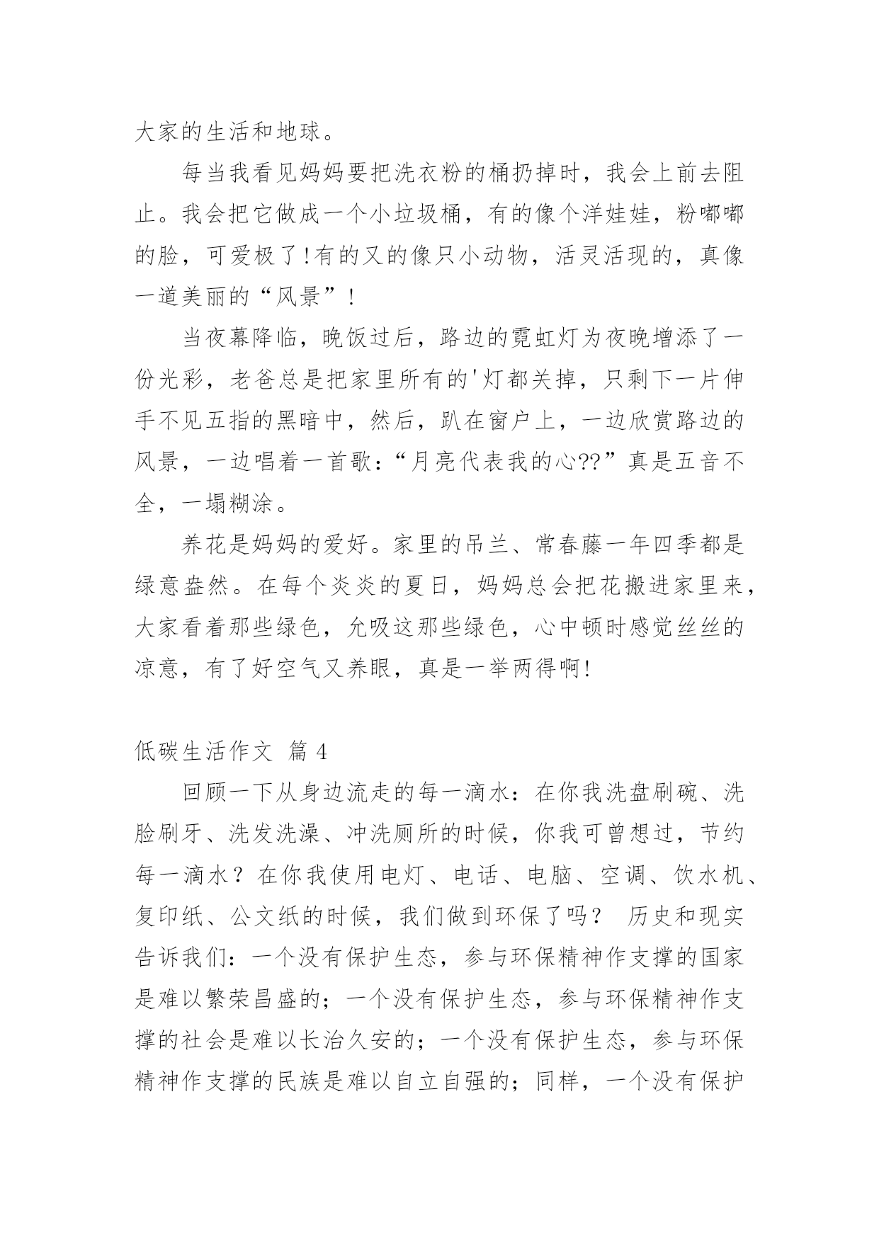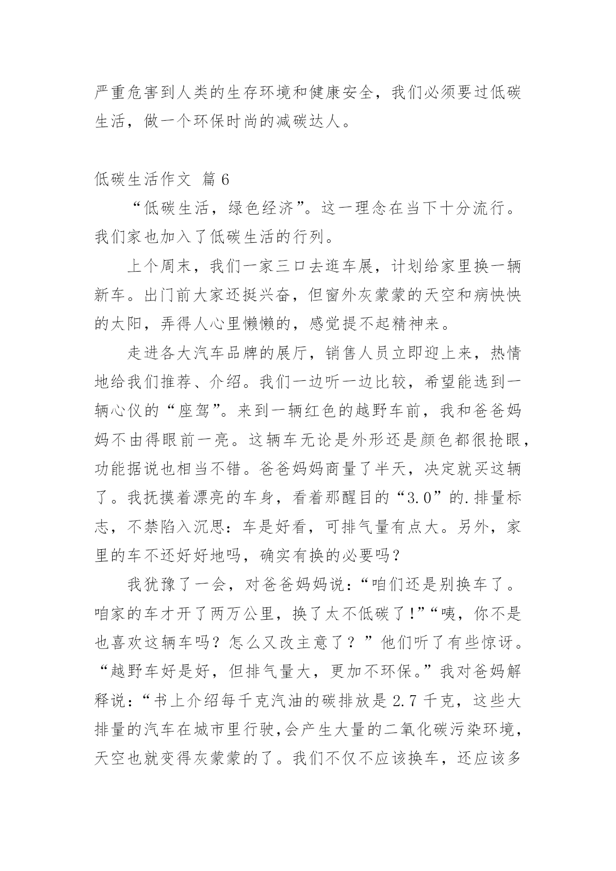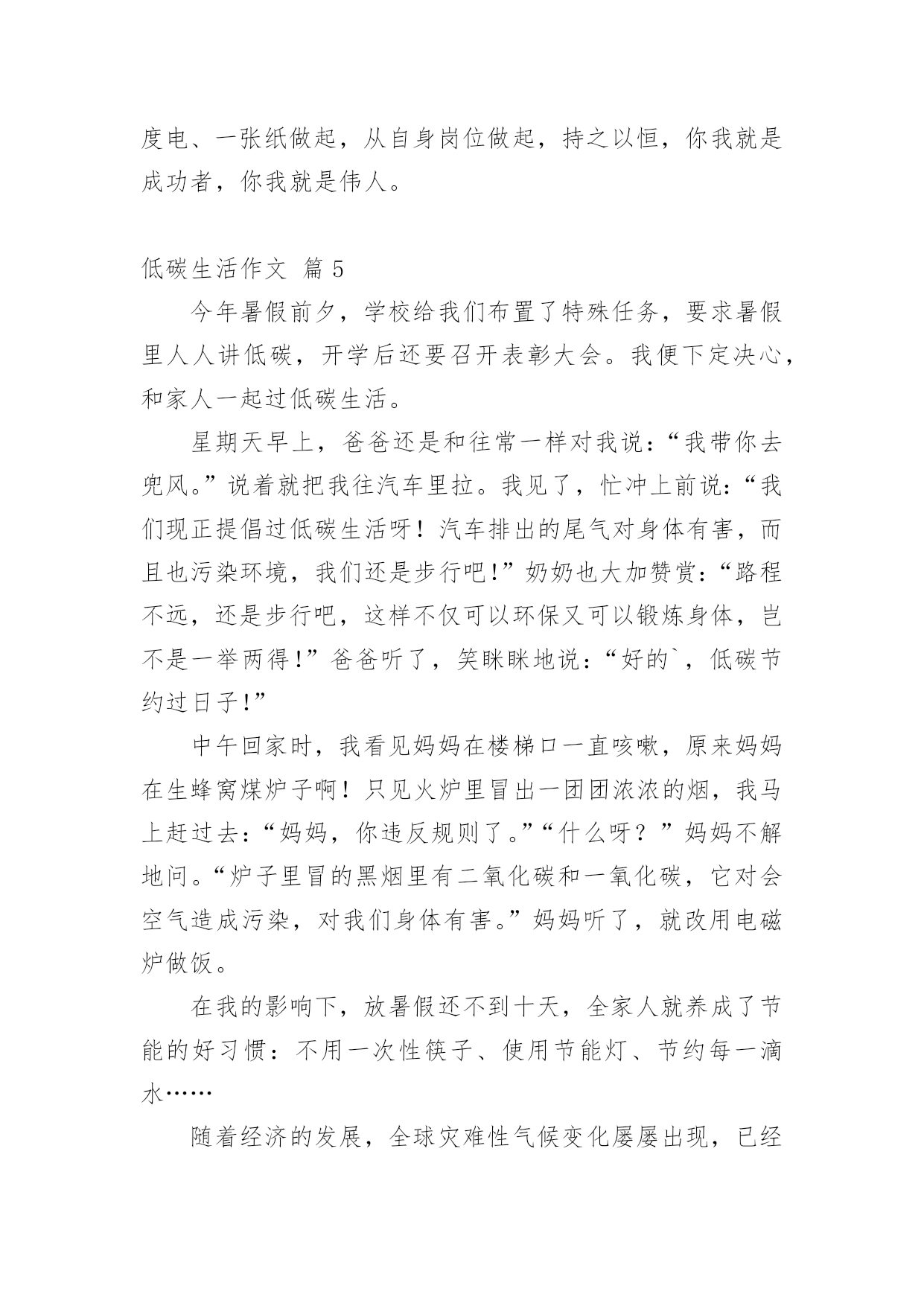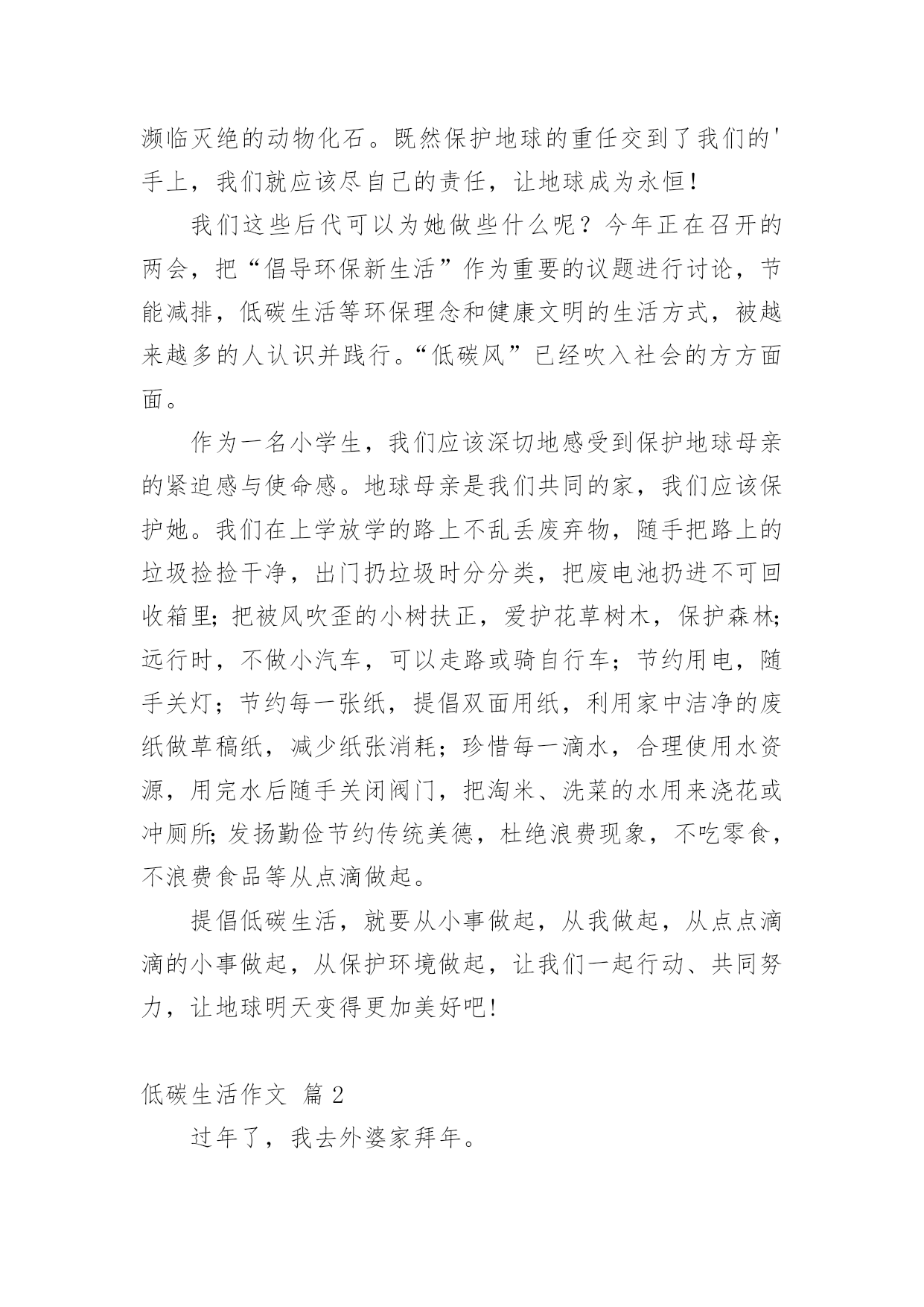 低碳生活作文低碳生活作文(集合14篇)在学习、工作乃至生活中,许多人都有过写作文的经历,对作文都不陌生吧,借助作文可以宣泄心中的情感,调节自己的心情。那么,怎么去写作文呢?下面是小编收集整理的低碳生活作文,欢迎大家分享。低碳生活作文篇1我们的地球母亲是那样的伟大,那样的和蔼可亲。她用自己的所有资源无私地哺育着我们,抚养了我们。可是,我们做儿女的又给了她什么回报呢?我们什么也没有回报,我们给予母亲的只是一件件令她伤心的事:滥用化学品,使母亲身上体无完肤;乱砍乱伐,使母亲漂亮的绿色花衣一天天消逝;胡乱开垦,让母亲的血液不再清澈,而是浑黄一体,满江泥沙……有人可能会问这到底是我们造成的吗?越来越多的动物灭绝,越来越多的绿洲沙漠化。大气层遭破坏,汽车尾气、工厂废烟使我们的空气质量一天不如一天。昔日的清澈小溪,今日的死鱼塘。原本郁郁葱葱的森林,最后只剩下光秃秃的树桩……我们要珍惜地球母亲给予我们的一切,来保护这一切,不能因为自己的一己私利而破坏它;不能因为自己的一次冲动破坏它的和谐。我们要为了后代着想,不要让子孙只看到濒临灭绝的动物化石。既然保护地球的重任交到了我们的'手上,我们就应该尽自己的责任,让地球成为永恒!我们这些后代可以为她做些什么呢?今年正在召开的两会,把“倡导环保新生活”作为重要的议题进行讨论,节能减排,低碳生活等环保理念和健康文明的生活方式,被越来越多的人认识并践行。“低碳风”已经吹入社会的方方面面。作为一名小学生,我们应该深切地感受到保护地球母亲的紧迫感与使命感。地球母亲是我们共同的家,我们应该保护她。我们在上学放学的路上不乱丢废弃物,随手把路上的垃圾捡捡干净,出门扔垃圾时分分类,把废电池扔进不可回收箱里;把被风吹歪的小树扶正,爱护花草树木,保护森林;远行时,不做小汽车,可以走路或骑自行车;节约用电,随手关灯;节约每一张纸,提倡双面用纸,利用家中洁净的废纸做草稿纸,减少纸张消耗;珍惜每一滴水,合理使用水资源,用完水后随手关闭阀门,把淘米、洗菜的水用来浇花或冲厕所;发扬勤俭节约传统美德,杜绝浪费现象,不吃零食,不浪费食品等从点滴做起。提倡低碳生活,就要从小事做起,从我做起,从点点滴滴的小事做起,从保护环境做起,让我们一起行动、共同努力,让地球明天变得更加美好吧!低碳生活作文篇2过年了,我去外婆家拜年。奶奶家在农村,是一个安静的小山村,风景很美。我一走进外婆家的院子,第一个映入我眼帘的是一大片绿色。篱笆上只有一个长长的花坛,花坛里摆满了青菜。也许你还能看到奶奶提着竹篮,竹篮里放着青菜,去小溪里洗漱!环顾院子,你还会发现奶奶家的屋檐下有两个大水箱。看到这里,你会觉得很奇怪,你拿着两个大水箱干什么?原来这是爷爷用来“借水”的圆柱体。每当下雨,屋檐上的水就会顺着下水管道流进水箱。爷爷用罐子里的水浇花、浇果树、冲厕所……走廊里有一个垃圾桶,是用废油漆桶做成的。每当垃圾桶装满时,爷爷就会把垃圾捡起来扔到山上,用作果树的肥料。不知不觉,传来一阵香味。对,肯定是奶奶做饭。顺着香气走进厨房,奶奶在炉子上忙着呢!你以为奶奶在用煤气炉做饭,这是大错特错。奶奶很少用煤气炉,但用枯枝柴火炉做燃料。奶奶会做美味的食物。柴火灶旁边,还有一个不锈钢的'烧水锅。开水炉和小锅炉一样,也是用果树枯枝做燃料,一次可以烧五六壶开水!吃饭的时候发现筷子和市面上的不一样,又细又长,还有点粗糙。不用说,肯定是爷爷的杰作。有一次,我对拿着竹篮准备上街的爷爷说:“爷爷,你没钱啊,为什么存这么多!”爷爷笑着说:“家里的这些竹篮值几千个塑料袋!这样做,既环保又经济,还能避免对食物的污染!”原来奶奶的生活是低碳生活!低碳生活作文篇3以前,我总是把电灯开上个彻夜到明,水从晚上滴到明早,冰箱塞满乱七八糟的东西。这样,既浪费水,又浪费电??现在,我听到了城市在宣传倡导低碳生活,我渐渐有些懂了。我开始了“低碳生活”。首先,低碳的生活方式,就是在生活的细节上注重节能减耗。除了做作业必须开灯之外,其余的事情都靠窗外的照明灯来相助。因为我们的客厅大,窗外的照明灯照进来都可以醒目地看到室内的一切,吃饭时,真像一桌“烛光晚餐”,这真是一大盏“天然的灯啊!”只要我洗好手,就都把水龙头拧的紧紧地,不让水“逃”出来,这样,我就可以安心了。但我又担忧爸爸妈妈会不会做好,每次看见爸爸妈妈进洗手间洗手并顺其自然的把水龙头关紧,我十分高兴,我希望“低碳家庭”会做的更好。冰箱里放着乱七八糟的东西,妈妈说很浪费电,我灵机一动,想出了妙招:于是,我就拿起以前堆积如山的硬纸板,把它做成一个个大小不一的盒子,上面贴上了各种分类的标志,然后,按分类去整理,不一会儿,冰箱变得又干净又整洁,焕然一新,一眼就目睹摆放整整齐齐的东西。这样,既帮助了我们,又节省了电。原来,电器开着,就连小小的手机电池在插座上插着时都会排放出可