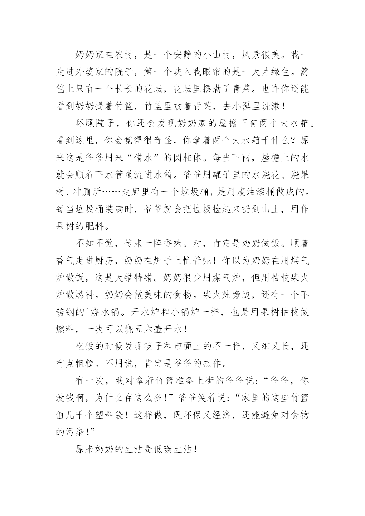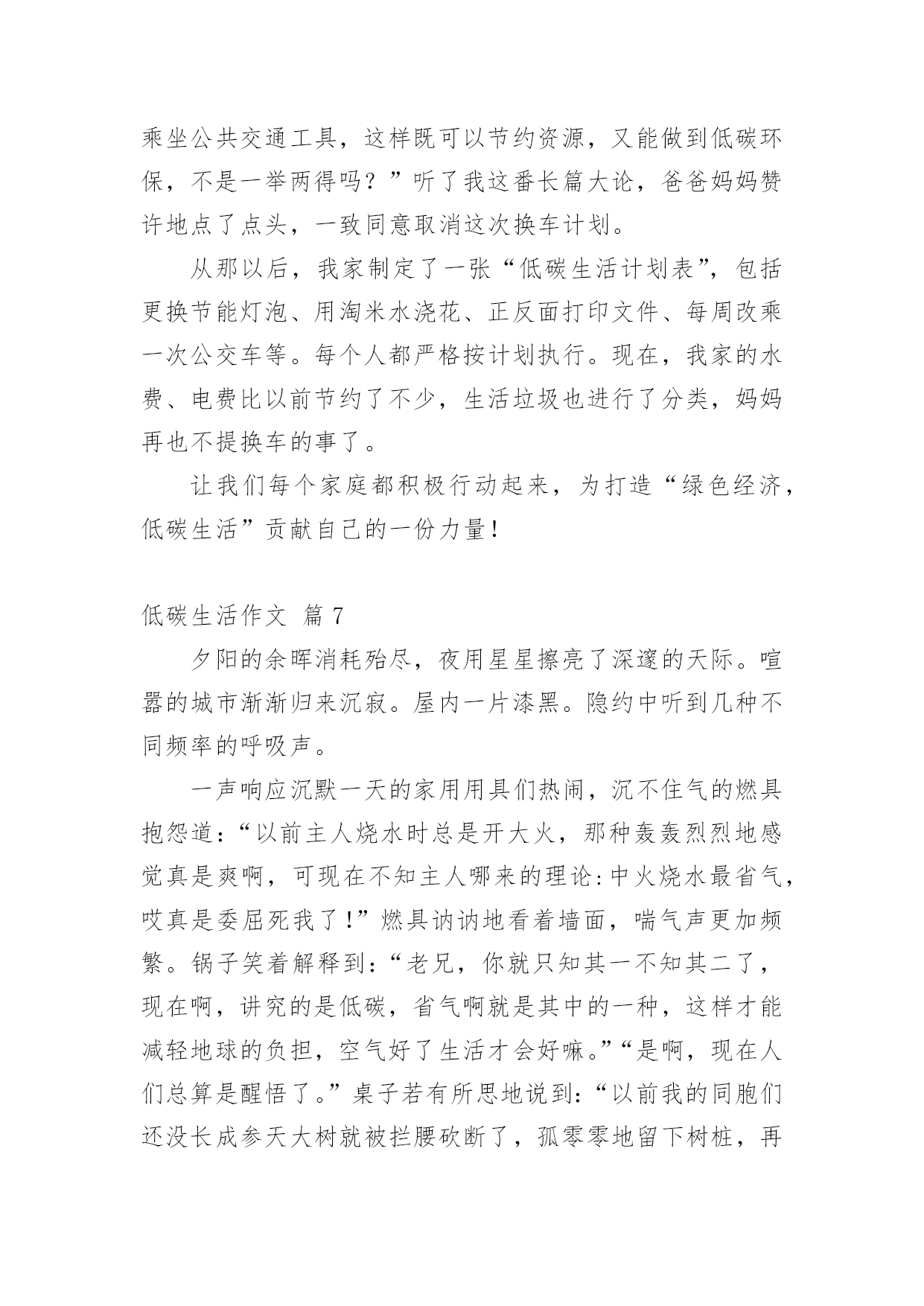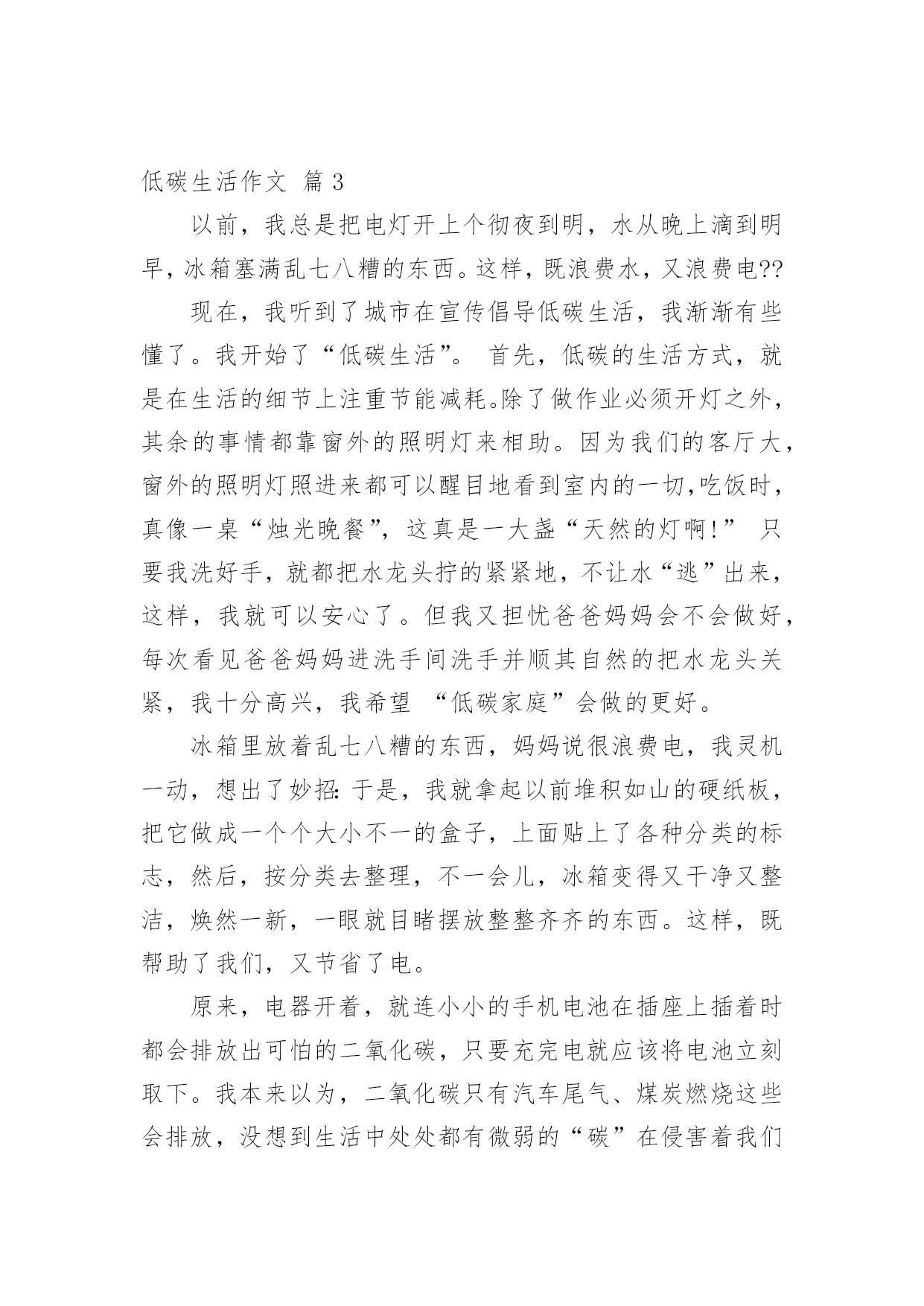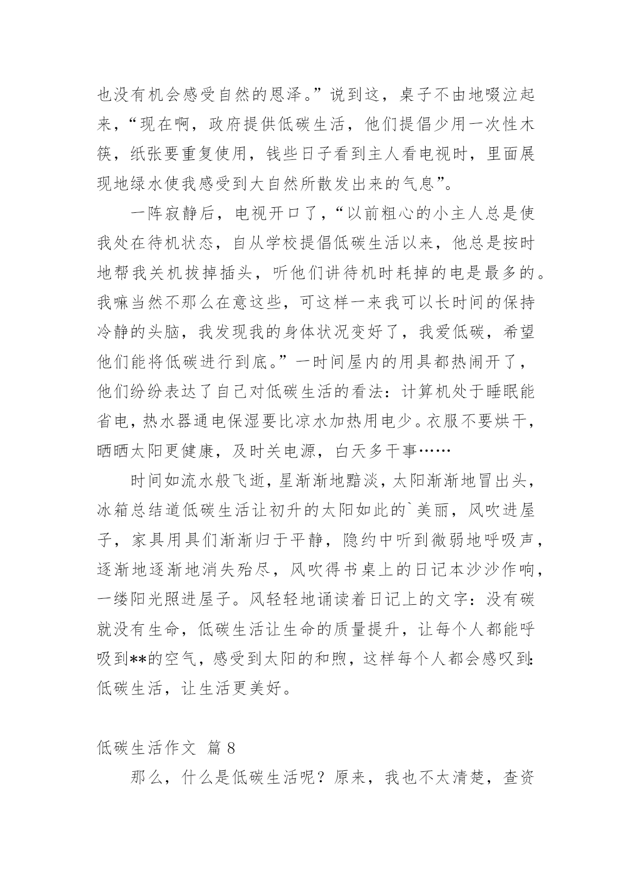 低碳生活作文低碳生活作文(集合14篇)在学习、工作乃至生活中,许多人都有过写作文的经历,对作文都不陌生吧,借助作文可以宣泄心中的情感,调节自己的心情。那么,怎么去写作文呢?下面是小编收集整理的低碳生活作文,欢迎大家分享。低碳生活作文篇1我们的地球母亲是那样的伟大,那样的和蔼可亲。她用自己的所有资源无私地哺育着我们,抚养了我们。可是,我们做儿女的又给了她什么回报呢?我们什么也没有回报,我们给予母亲的只是一件件令她伤心的事:滥用化学品,使母亲身上体无完肤;乱砍乱伐,使母亲漂亮的绿色花衣一天天消逝;胡乱开垦,让母亲的血液不再清澈,而是浑黄一体,满江泥沙……有人可能会问这到底是我们造成的吗?越来越多的动物灭绝,越来越多的绿洲沙漠化。大气层遭破坏,汽车尾气、工厂废烟使我们的空气质量一天不如一天。昔日的清澈小溪,今日的死鱼塘。原本郁郁葱葱的森林,最后只剩下光秃秃的树桩……我们要珍惜地球母亲给予我们的一切,来保护这一切,不能因为自己的一己私利而破坏它;不能因为自己的一次冲动破坏它的和谐。我们要为了后代着想,不要让子孙只看到濒临灭绝的动物化石。既然保护地球的重任交到了我们的'手上,我们就应该尽自己的责任,让地球成为永恒!我们这些后代可以为她做些什么呢?今年正在召开的两会,把“倡导环保新生活”作为重要的议题进行讨论,节能减排,低碳生活等环保理念和健康文明的生活方式,被越来越多的人认识并践行。“低碳风”已经吹入社会的方方面面。作为一名小学生,我们应该深切地感受到保护地球母亲的紧迫感与使命感。地球母亲是我们共同的家,我们应该保护她。我们在上学放学的路上不乱丢废弃物,随手把路上的垃圾捡捡干净,出门扔垃圾时分分类,把废电池扔进不可回收箱里;把被风吹歪的小树扶正,爱护花草树木,保护森林;远行时,不做小汽车,可以走路或骑自行车;节约用电,随手关灯;节约每一张纸,提倡双面用纸,利用家中洁净的废纸做草稿纸,减少纸张消耗;珍惜每一滴水,合理使用水资源,用完水后随手关闭阀门,把淘米、洗菜的水用来浇花或冲厕所;发扬勤俭节约传统美德,杜绝浪费现象,不吃零食,不浪费食品等从点滴做起。提倡低碳生活,就要从小事做起,从我做起,从点点滴滴的小事做起,从保护环境做起,让我们一起行动、共同努力,让地球明天变得更加美好吧!低碳生活作文篇2过年了,我去外婆家拜年。奶奶家在农村,是一个安静的小山村,风景很美。我一走进外婆家的院子,第一个映入我眼帘的是一大片绿色。篱笆上只有一个长长的花坛,花坛里摆满了青菜。也许你还能看到奶奶提着竹篮,竹篮里放着青菜,去小溪里洗漱!环顾院子,你还会发现奶奶家的屋檐下有两个大水箱。看到这里,你会觉得很奇怪,你拿着两个大水箱干什么?原来这是爷爷用来“借水”的圆柱体。每当下雨,屋檐上的水就会顺着下水管道流进水箱。爷爷用罐子里的水浇花、浇果树、冲厕所……走廊里有一个垃圾桶,是用废油漆桶做成的。每当垃圾桶装满时,爷爷就会把垃圾捡起来扔到山上,用作果树的肥料。不知不觉,传来一阵香味。对,肯定是奶奶做饭。顺着香气走进厨房,奶奶在炉子上忙着呢!你以为奶奶在用煤气炉做饭,这是大错特错。奶奶很少用煤气炉,但用枯枝柴火炉做燃料。奶奶会做美味的食物。柴火灶旁边,还有一个不锈钢的'烧水锅。开水炉和小锅炉一样,也是用果树枯枝做燃料,一次可以烧五六壶开水!吃饭的时候发现筷子和市面上的不一样,又细又长,还有点粗糙。不用说,肯定是爷爷的杰作。有一次,我对拿着竹篮准备上街的爷爷说:“爷爷,你没钱啊,为什么存这么多!”爷爷笑着说:“家里的这些竹篮值几千个塑料袋!这样做,既环保又经济,还能避免对食物的污染!”原来奶奶的生活是低碳生活!低碳生活作文篇3以前,我总是把电灯开上个彻夜到明,水从晚上滴到明早,冰箱塞满乱七八糟的东西。这样,既浪费水,又浪费电??现在,我听到了城市在宣传倡导低碳生活,我渐渐有些懂了。我开始了“低碳生活”。首先,低碳的生活方式,就是在生活的细节上注重节能减耗。除了做作业必须开灯之外,其余的事情都靠窗外的照明灯来相助。因为我们的客厅大,窗外的照明灯照进来都可以醒目地看到室内的一切,吃饭时,真像一桌“烛光晚餐”,这真是一大盏“天然的灯啊!”只要我洗好手,就都把水龙头拧的紧紧地,不让水“逃”出来,这样,我就可以安心了。但我又担忧爸爸妈妈会不会做好,每次看见爸爸妈妈进洗手间洗手并顺其自然的把水龙头关紧,我十分高兴,我希望“低碳家庭”会做的更好。冰箱里放着乱七八糟的东西,妈妈说很浪费电,我灵机一动,想出了妙招:于是,我就拿起以前堆积如山的硬纸板,把它做成一个个大小不一的盒子,上面贴上了各种分类的标志,然后,按分类去整理,不一会儿,冰箱变得又干净又整洁,焕然一新,一眼就目睹摆放整整齐齐的东西。这样,既帮助了我们,又节省了电。原来,电器开着,就连小小的手机电池在插座上插着时都会排放出可