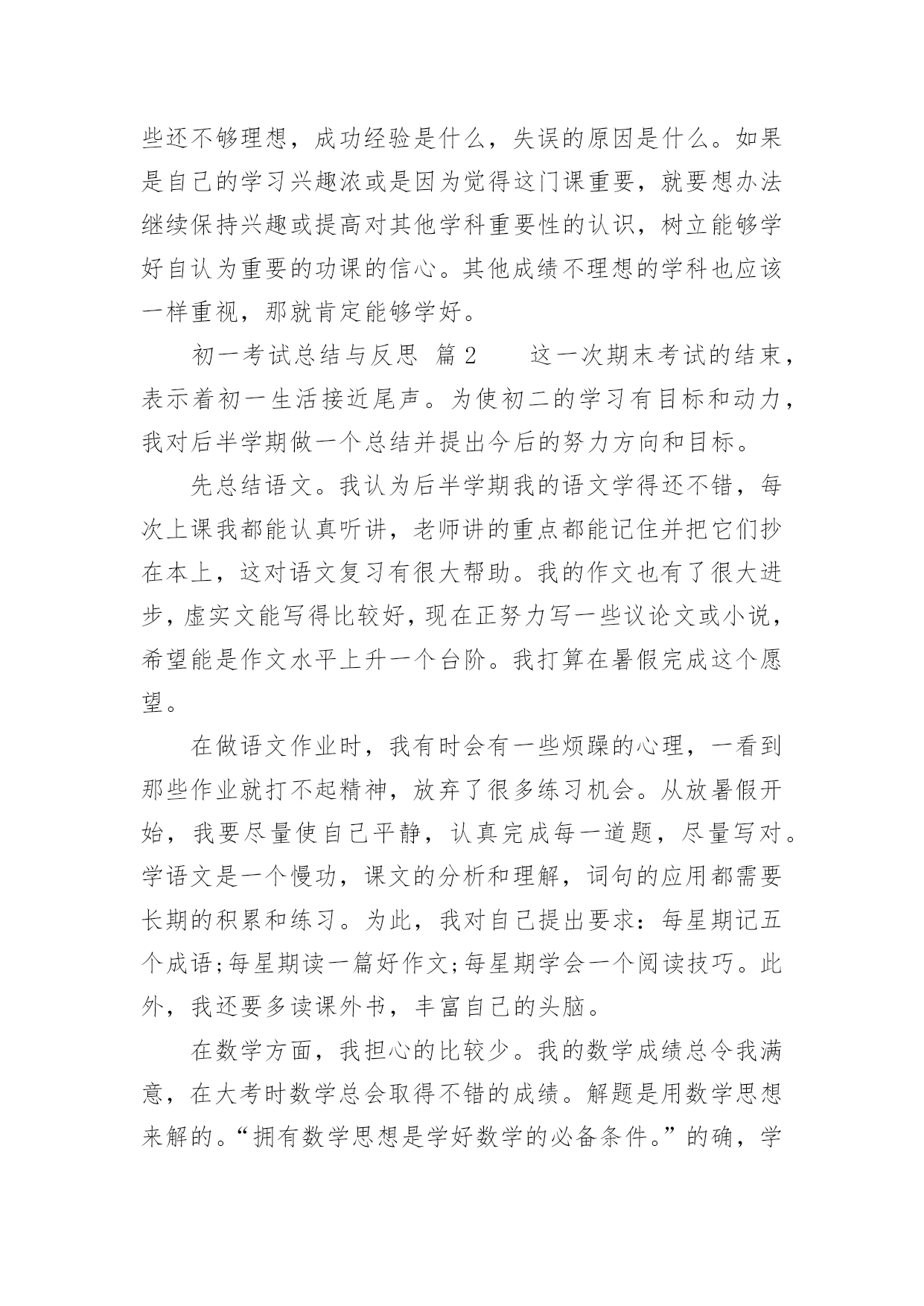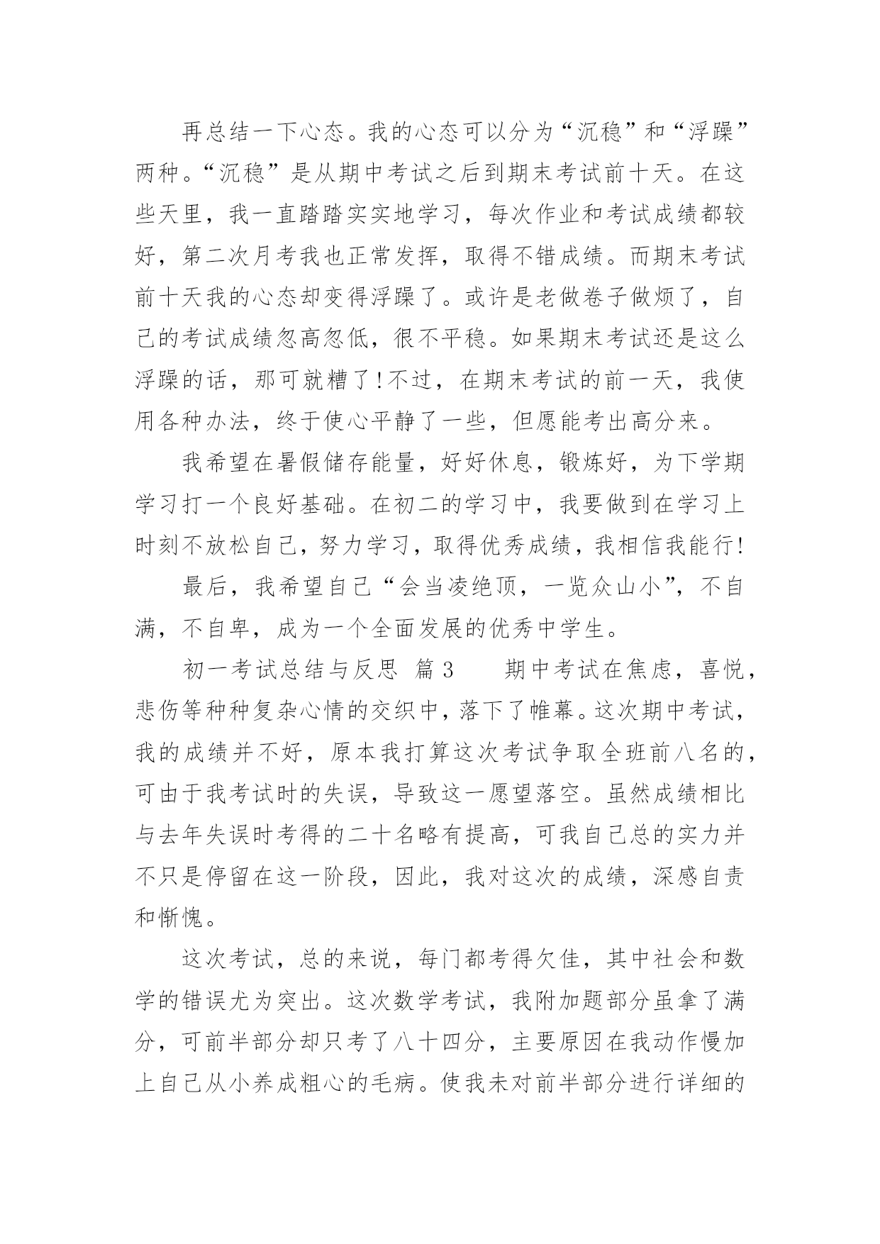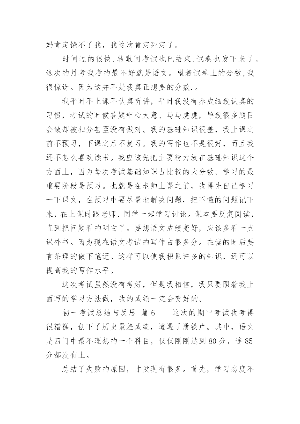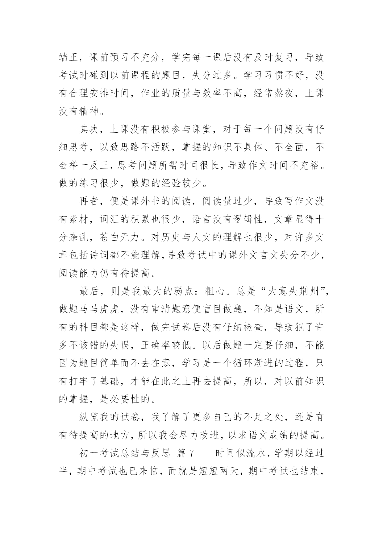 初一考试总结与反思初一考试总结与反思(精选10篇)在不断进步的社会中,课堂教学是我们的工作之一,反思是思考过去的事情,从中总结经验教训。那么什么样的反思才是好的呢?下面是小编精心整理的初一考试总结与反思,仅供参考,希望能够帮助到大家。初一考试总结与反思篇1在刚刚结束的期中考试里,我犯了很多不该犯的错误。于是我进行了自我反思。首先是学习态度的反思。学习态度是决定学习成绩的重要因素。怎样评价你的学习态度是否端正呢?一是要看课堂上能否专心听讲,能否克制自己不做与学习无关的事情。二是能否自觉、独立、认真地完成作业,能否主动改正错题。三是在完成规定作业后能否主动复习、预习和进行课外学习。四是在学习中遇到问题是否想办法解决。五是能否合理分配自己的时间。其次是学习方法的反思。科学的学习方法可以收到事半功倍的效果,但科学高效的学习方法是需要学生不断摸索、总结的,特别是考试之后对各门功课的学习方法的总结,如文科一些需要背诵的内容,在什么时间,怎样背效率高,是抄背还是读背。其三是单科差异的反思。不少学生对各门功课并不是同样感兴趣,往往会出现偏科现象,从而导致弱科太差,强科无效。这就需要在考试之后进行反思,哪些功课学得好,哪些还不够理想,成功经验是什么,失误的原因是什么。如果是自己的学习兴趣浓或是因为觉得这门课重要,就要想办法继续保持兴趣或提高对其他学科重要性的认识,树立能够学好自认为重要的功课的信心。其他成绩不理想的学科也应该一样重视,那就肯定能够学好。初一考试总结与反思篇2这一次期末考试的结束,表示着初一生活接近尾声。为使初二的学习有目标和动力,我对后半学期做一个总结并提出今后的努力方向和目标。先总结语文。我认为后半学期我的语文学得还不错,每次上课我都能认真听讲,老师讲的重点都能记住并把它们抄在本上,这对语文复习有很大帮助。我的作文也有了很大进步,虚实文能写得比较好,现在正努力写一些议论文或小说,希望能是作文水平上升一个台阶。我打算在暑假完成这个愿望。在做语文作业时,我有时会有一些烦躁的心理,一看到那些作业就打不起精神,放弃了很多练习机会。从放暑假开始,我要尽量使自己平静,认真完成每一道题,尽量写对。学语文是一个慢功,课文的分析和理解,词句的应用都需要长期的积累和练习。为此,我对自己提出要求:每星期记五个成语;每星期读一篇好作文;每星期学会一个阅读技巧。此外,我还要多读课外书,丰富自己的头脑。在数学方面,我担心的比较少。我的数学成绩总令我满意,在大考时数学总会取得不错的成绩。解题是用数学思想来解的。“拥有数学思想是学好数学的必备条件。”的确,学数学不能把写看得太重视,重点应该是想。学完一课后,谁都会做这一课的基本练习和作业,但是把易题变难题,一题变十题就不是人人都能做到了。我认为难题是由基本的数学思想结合而成,看清本质,解题就不难了。我虽然会解难题,但那是凭着“题海战术”和活脑子练出来的。而数学并不需要用“题海战术”来获得做题经验。所以,对于很难的题,我就束手无策了。看来,我的数学要真正入门还需要努力。此外,我心态的好坏也决定成绩的高低,因为自己心态不定,使我的数学成绩高低起伏。但我认为小考只是一种练习,虽然各种练习都要重视,但重视程度不同,大型考试我是尽力去做,而小型考试我可以不用使出全部精力,而是从空闲时间中去学习其它课程,这反而有利于我综合素质的提高。因为初二数学是分化点,领会者上,未领会者下。英语,我担心得最多,它是我所有科目中最“小气”的,每次都只“给”我那么一点儿分。看着别人从英语上大把捞分时,我又羡慕又妒忌。但又能有什么用?经过长期思考,我发现我的课堂知识的掌握和背诵很好,还有一些不足:词汇量小。所以做“完型填空”和“阅读理解”时我感觉吃力。有些生词不认识就别想看懂文章大意,我连意思都看不懂,更别提把题作对了。大把丢分!说到原因,只有俩字:缺练!有句话说“身体是革命的本钱”。这一学期我没有得过什么病,身体比较健康。体育成绩比以前有所提高。立定跳远、抛实心球、单杠等项目我都取得较为不错的成绩。再总结一下心态。我的心态可以分为“沉稳”和“浮躁”两种。“沉稳”是从期中考试之后到期末考试前十天。在这些天里,我一直踏踏实实地学习,每次作业和考试成绩都较好,第二次月考我也正常发挥,取得不错成绩。而期末考试前十天我的心态却变得浮躁了。或许是老做卷子做烦了,自己的考试成绩忽高忽低,很不平稳。如果期末考试还是这么浮躁的话,那可就糟了!不过,在期末考试的前一天,我使用各种办法,终于使心平静了一些,但愿能考出高分来。我希望在暑假储存能量,好好休息,锻炼好,为下学期学习打一个良好基础。在初二的学习中,我要做到在学习上时刻不放松自己,努力学习,取得优秀成绩,我相信我能行!最后,我希望自己“会当凌绝顶,一览众山小”,不自满,不自卑,成为一个全面发展的优秀