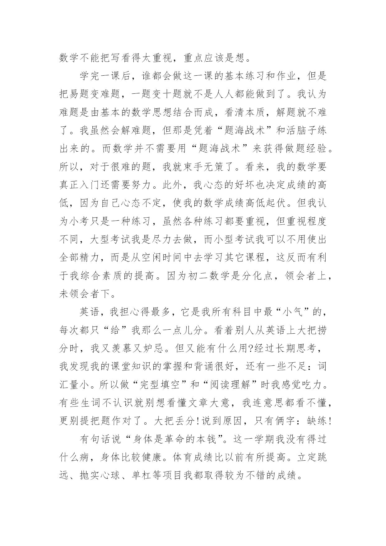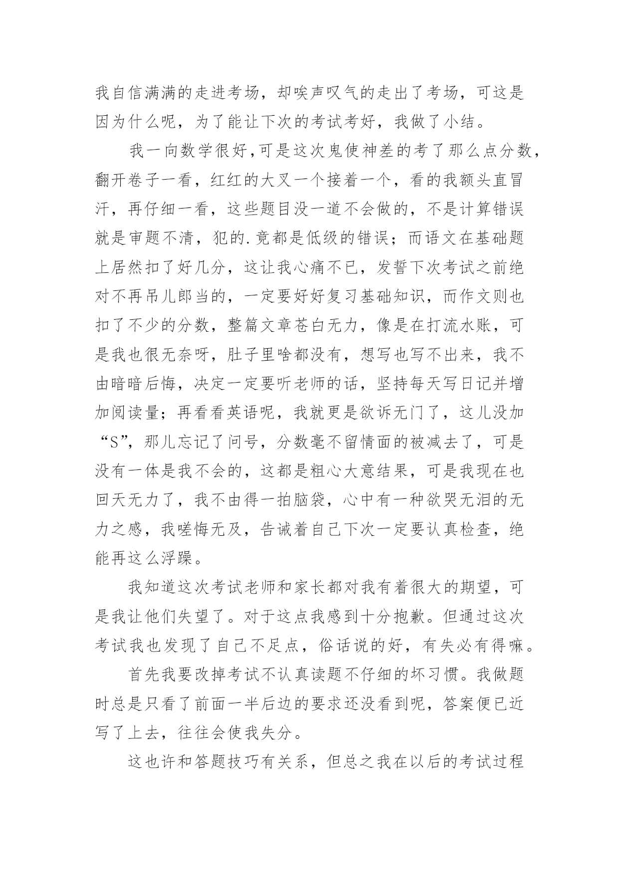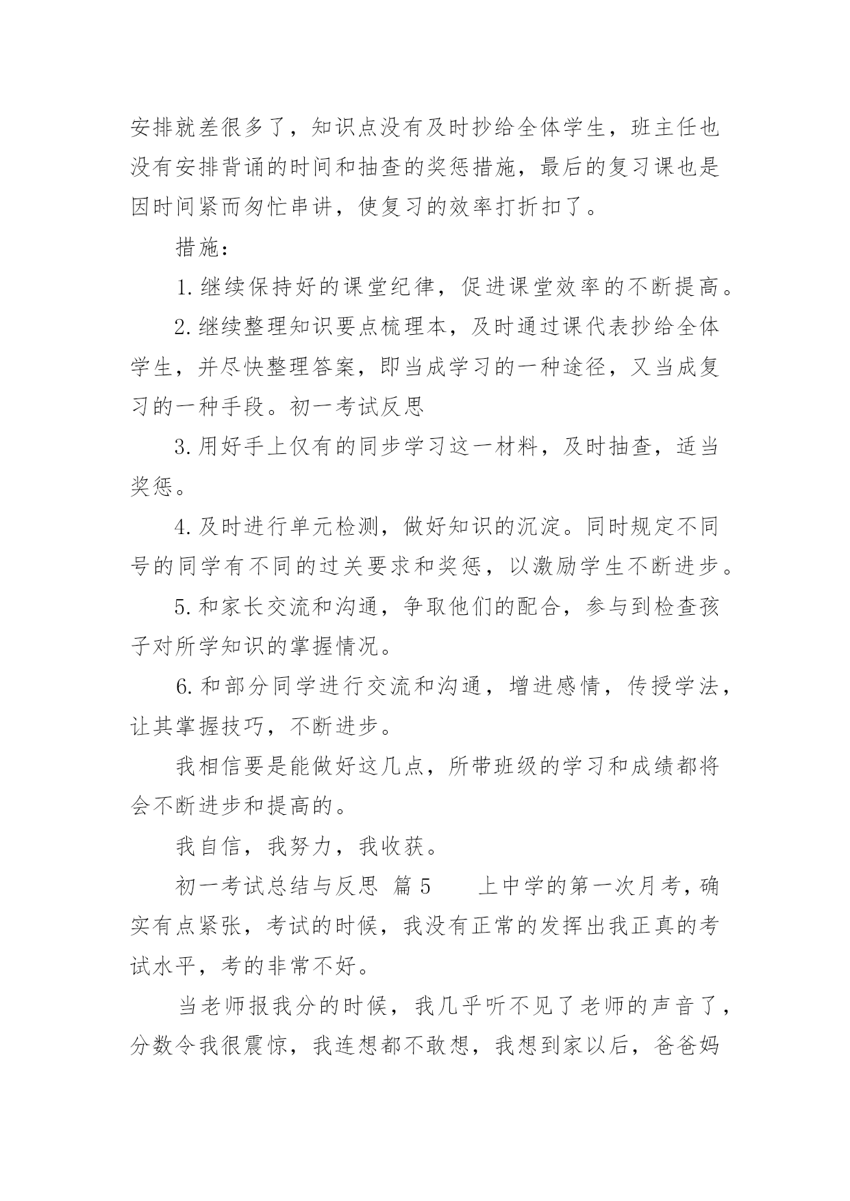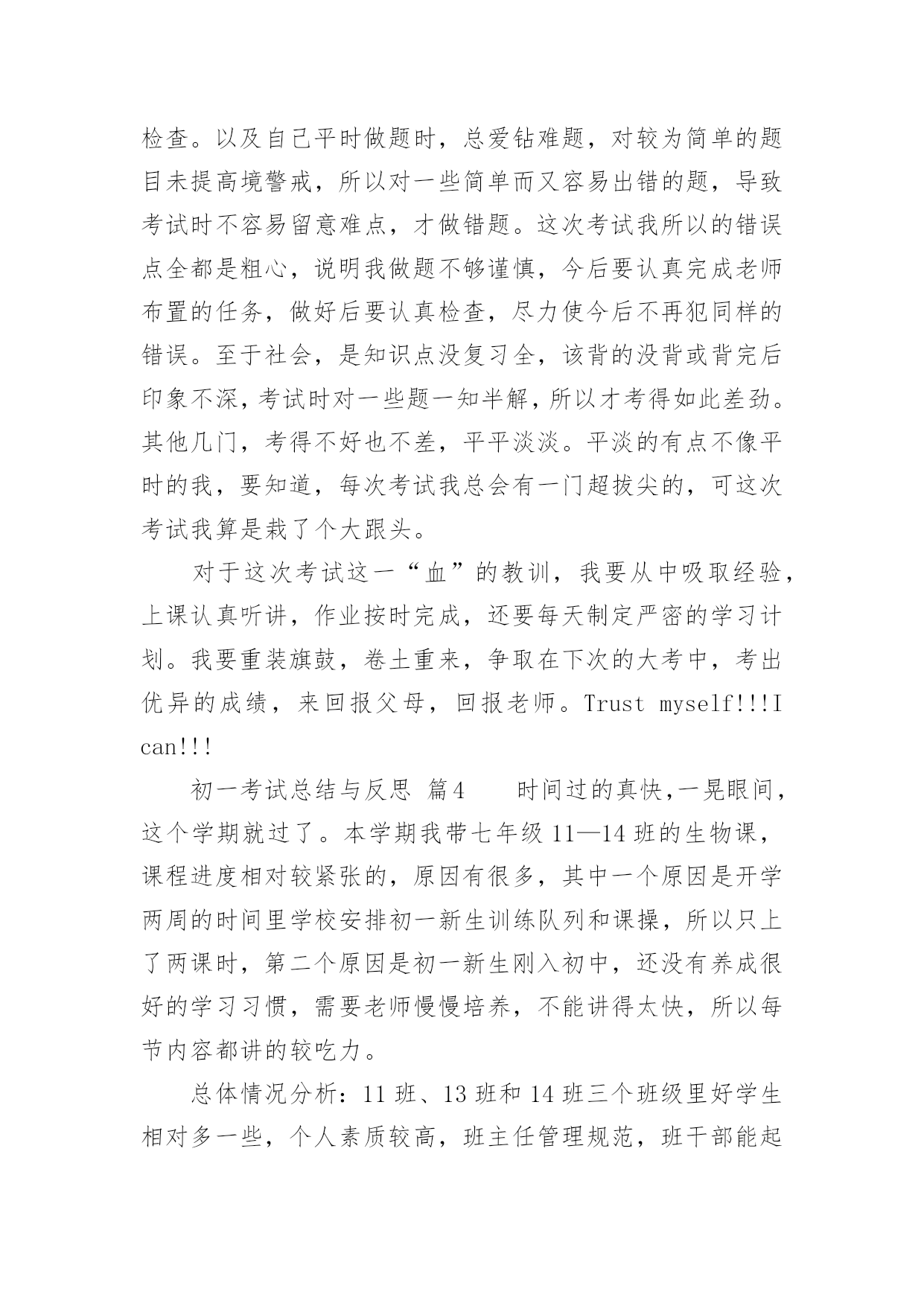 初一考试总结与反思初一考试总结与反思(精选10篇)在不断进步的社会中,课堂教学是我们的工作之一,反思是思考过去的事情,从中总结经验教训。那么什么样的反思才是好的呢?下面是小编精心整理的初一考试总结与反思,仅供参考,希望能够帮助到大家。初一考试总结与反思篇1在刚刚结束的期中考试里,我犯了很多不该犯的错误。于是我进行了自我反思。首先是学习态度的反思。学习态度是决定学习成绩的重要因素。怎样评价你的学习态度是否端正呢?一是要看课堂上能否专心听讲,能否克制自己不做与学习无关的事情。二是能否自觉、独立、认真地完成作业,能否主动改正错题。三是在完成规定作业后能否主动复习、预习和进行课外学习。四是在学习中遇到问题是否想办法解决。五是能否合理分配自己的时间。其次是学习方法的反思。科学的学习方法可以收到事半功倍的效果,但科学高效的学习方法是需要学生不断摸索、总结的,特别是考试之后对各门功课的学习方法的总结,如文科一些需要背诵的内容,在什么时间,怎样背效率高,是抄背还是读背。其三是单科差异的反思。不少学生对各门功课并不是同样感兴趣,往往会出现偏科现象,从而导致弱科太差,强科无效。这就需要在考试之后进行反思,哪些功课学得好,哪些还不够理想,成功经验是什么,失误的原因是什么。如果是自己的学习兴趣浓或是因为觉得这门课重要,就要想办法继续保持兴趣或提高对其他学科重要性的认识,树立能够学好自认为重要的功课的信心。其他成绩不理想的学科也应该一样重视,那就肯定能够学好。初一考试总结与反思篇2这一次期末考试的结束,表示着初一生活接近尾声。为使初二的学习有目标和动力,我对后半学期做一个总结并提出今后的努力方向和目标。先总结语文。我认为后半学期我的语文学得还不错,每次上课我都能认真听讲,老师讲的重点都能记住并把它们抄在本上,这对语文复习有很大帮助。我的作文也有了很大进步,虚实文能写得比较好,现在正努力写一些议论文或小说,希望能是作文水平上升一个台阶。我打算在暑假完成这个愿望。在做语文作业时,我有时会有一些烦躁的心理,一看到那些作业就打不起精神,放弃了很多练习机会。从放暑假开始,我要尽量使自己平静,认真完成每一道题,尽量写对。学语文是一个慢功,课文的分析和理解,词句的应用都需要长期的积累和练习。为此,我对自己提出要求:每星期记五个成语;每星期读一篇好作文;每星期学会一个阅读技巧。此外,我还要多读课外书,丰富自己的头脑。在数学方面,我担心的比较少。我的数学成绩总令我满意,在大考时数学总会取得不错的成绩。解题是用数学思想来解的。“拥有数学思想是学好数学的必备条件。”的确,学数学不能把写看得太重视,重点应该是想。学完一课后,谁都会做这一课的基本练习和作业,但是把易题变难题,一题变十题就不是人人都能做到了。我认为难题是由基本的数学思想结合而成,看清本质,解题就不难了。我虽然会解难题,但那是凭着“题海战术”和活脑子练出来的。而数学并不需要用“题海战术”来获得做题经验。所以,对于很难的题,我就束手无策了。看来,我的数学要真正入门还需要努力。此外,我心态的好坏也决定成绩的高低,因为自己心态不定,使我的数学成绩高低起伏。但我认为小考只是一种练习,虽然各种练习都要重视,但重视程度不同,大型考试我是尽力去做,而小型考试我可以不用使出全部精力,而是从空闲时间中去学习其它课程,这反而有利于我综合素质的提高。因为初二数学是分化点,领会者上,未领会者下。英语,我担心得最多,它是我所有科目中最“小气”的,每次都只“给”我那么一点儿分。看着别人从英语上大把捞分时,我又羡慕又妒忌。但又能有什么用?经过长期思考,我发现我的课堂知识的掌握和背诵很好,还有一些不足:词汇量小。所以做“完型填空”和“阅读理解”时我感觉吃力。有些生词不认识就别想看懂文章大意,我连意思都看不懂,更别提把题作对了。大把丢分!说到原因,只有俩字:缺练!有句话说“身体是革命的本钱”。这一学期我没有得过什么病,身体比较健康。体育成绩比以前有所提高。立定跳远、抛实心球、单杠等项目我都取得较为不错的成绩。再总结一下心态。我的心态可以分为“沉稳”和“浮躁”两种。“沉稳”是从期中考试之后到期末考试前十天。在这些天里,我一直踏踏实实地学习,每次作业和考试成绩都较好,第二次月考我也正常发挥,取得不错成绩。而期末考试前十天我的心态却变得浮躁了。或许是老做卷子做烦了,自己的考试成绩忽高忽低,很不平稳。如果期末考试还是这么浮躁的话,那可就糟了!不过,在期末考试的前一天,我使用各种办法,终于使心平静了一些,但愿能考出高分来。我希望在暑假储存能量,好好休息,锻炼好,为下学期学习打一个良好基础。在初二的学习中,我要做到在学习上时刻不放松自己,努力学习,取得优秀成绩,我相信我能行!最后,我希望自己“会当凌绝顶,一览众山小”,不自满,不自卑,成为一个全面发展的优秀