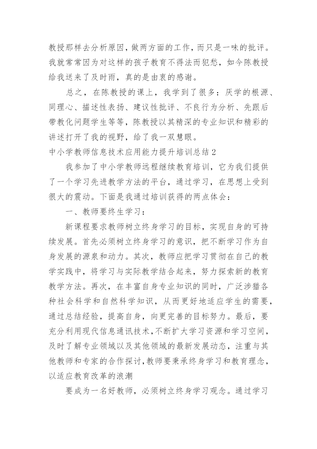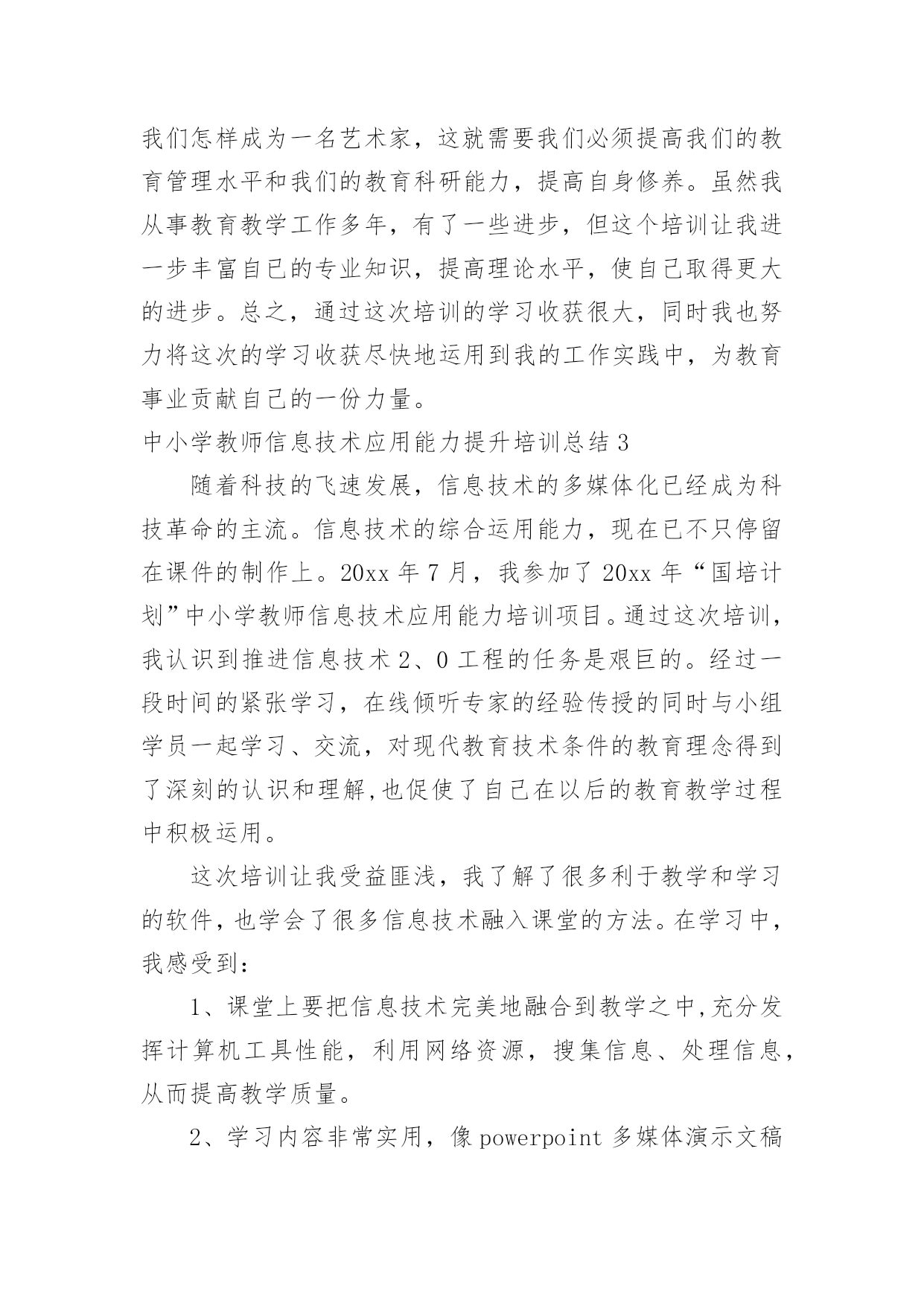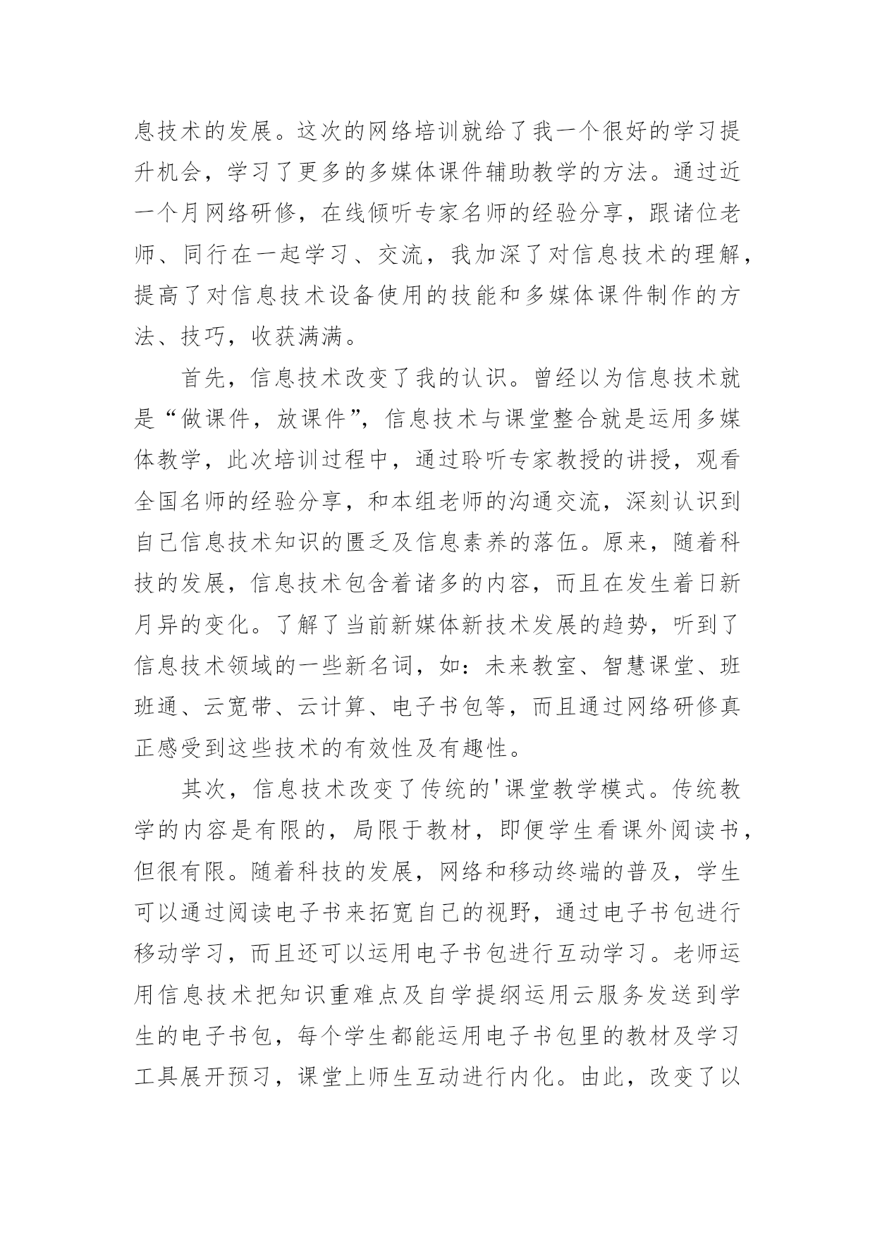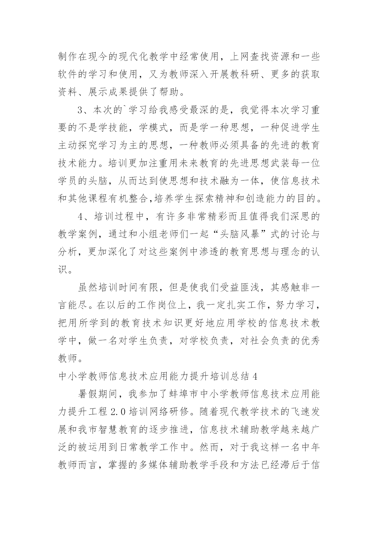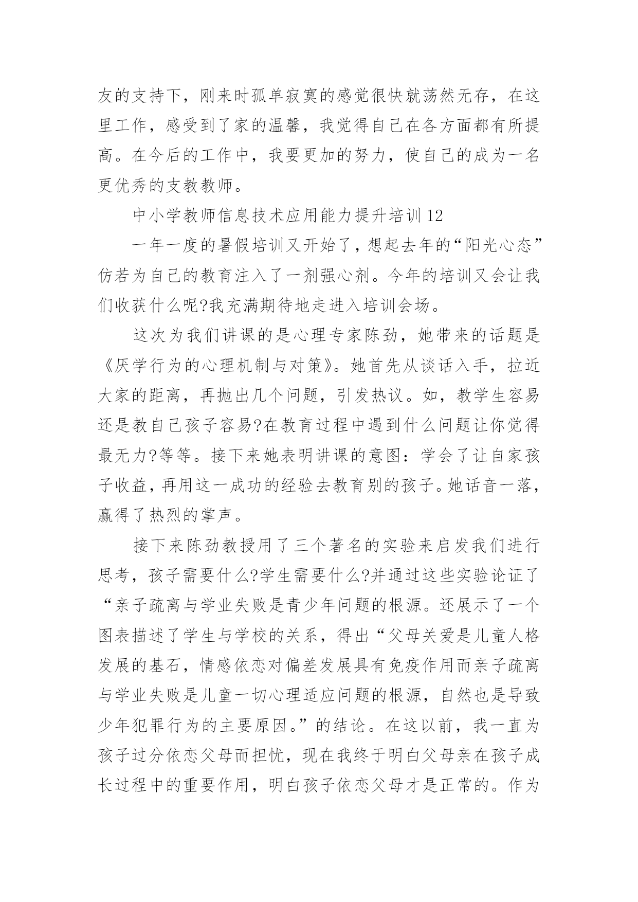 中小学教师信息技术应用能力提升培训总结中小学教师信息技术应用能力提升培训总结总结是对某一特定时间段内的学习和工作生活等表现情况加以回顾和分析的一种书面材料,它在我们的学习、工作中起到呈上启下的作用,让我们抽出时间写写总结吧。我们该怎么去写总结呢?下面是小编精心整理的中小学教师信息技术应用能力提升培训总结,欢迎大家分享。中小学教师信息技术应用能力提升培训总结1转眼间,的支教工作又结束了。在本季度的支教工作中,我没有把自己当作一名“流水教师”,而是把自己当作本校正式老师对待,遵守学校的各项规章制度,不迟到,不早退,努力的完成学校领导交给的各项工作任务,跟同事相处的特别融洽,对学生处于一片爱心。几个月年的支教时间,我工作着,收获着,付出着,感动着,可以说随时随地每时每刻都面对一种挑战,我用行动战胜自我,从容的面对困难,战胜困难,走过这几个月的历程,将在我的工作生涯中写下不平凡的一页,也是对我人生经历的一次极大的丰富,更是我人生道路上浓墨重彩的一笔。有辛苦地付出,就有幸福地收获,我感受着支教赋予我生命的精彩。一、在思想方面做为一名支教老师,首先、我坚持走教育方针的基本路线,根据教育大纲进行教学。其次、端正自己的服务态度,教书育人,为人师表。经常利用课余时间多跟同事和学生进行交流,使自己成为同事们的知己,学生们的良师益友。支教对我们每个支教老师来说,是一次磨练,毕竟它打破了原有的生活规律,要具备吃苦耐劳的精神。因此,当我加入“支教”队伍之前,自己已经做好了充分的准备,不管遇到多大困难,一定要坚持下来,尽自己最大的努力干好自己的本职工作。我严格要求自己,服从领导的各项安排。平时,我能主动的与其他老师沟通交流,传播新的教育教学理念的同时也虚心向他们学习。二、在工作方面努力使自己成为一名合格的志愿者。做一名合格的教师,要从教育、教学、教研三方面进行,这样才能不断的提高自己的水平。1、踏踏实实教书,全心全意育人在教育方面,自己始终坚持换位思考的方法,让学生干事的时候要换位思考,有的学生可能爱告状,有的爱打架,有的有逃学的心态等。而处理这些事情不能强硬,那样会伤害学生的心灵。一有时间,我就跟学生进行交流,了解他们的家庭情况和学生内心的世界,掌握每个学生的情况,使其处于自己的掌控中,从不处理没有把握的事情。通过这一举措,学生有什么事情都愿意和我交流,当学生有什么事情向你寻求帮助时,这是对你的肯定。2、在教学方面,精心设计每堂课程自己在不断学习理论知识的同时,一有时间就走进其他老师的`课堂,学习他们的教学技能,通过对比,自己什么地方不足,或者那种方法能使学生更容易接受。这样能快速的提高自己的教学技能。要上好一堂课,前提是要备好课,不上没有准备的课程。在备课时,在参考教案的同时,多考虑本学校的教学资源,学生的水平等综合考虑,从学生的角度去备课。课堂上改变传统的“填鸭子”的教学方式,采用师生互动,以学生为主体的教学方式。这样,我的课堂气氛特别活跃,带动了那些经常不善言语的学生都开始积极回答问题,这样的课堂会使老师使出百分之百的精力去给学生讲课。3、在教研方面,精心准备教研活动,共同提高。积极参与数学教研组的各种教研活动,促使自己不断研究好的教学方法,还能学到其他老师的优秀之处。通过教育、教学、教研三方面,自己的综合能力得到了提高。三、在生活方面我没有搞什么特殊化,不迟到,不早退,服从学校的统一管理,遵守学校的各项规章制度。积极参加学校组织的各项活动,在学校的队形比赛中,我所训练的班级获得中、高年级组的第一名好的成绩,在校园解说,诗歌朗诵,歌唱比赛中都取得了不同等次的成绩。通过自己的努力,得到学校领导和同事们的认可。在这短短的时间里,在校领导的关心爱护下,在同事朋友的支持下,刚来时孤单寂寞的感觉很快就荡然无存,在这里工作,感受到了家的温馨,我觉得自己在各方面都有所提高。在今后的工作中,我要更加的努力,使自己的成为一名更优秀的支教教师。中小学教师信息技术应用能力提升培训12一年一度的暑假培训又开始了,想起去年的“阳光心态”仿若为自己的教育注入了一剂强心剂。今年的培训又会让我们收获什么呢?我充满期待地走进入培训会场。这次为我们讲课的是心理专家陈劲,她带来的话题是《厌学行为的心理机制与对策》。她首先从谈话入手,拉近大家的距离,再抛出几个问题,引发热议。如,教学生容易还是教自己孩子容易?在教育过程中遇到什么问题让你觉得最无力?等等。接下来她表明讲课的意图:学会了让自家孩子收益,再用这一成功的经验去教育别的孩子。她话音一落,赢得了热烈的掌声。接下来陈劲教授用了三个著名的实验来启发我们进行思考,孩子需要什么?学生需要什么?并通过这些实验论证了“亲子疏离与学业失败是青少年问题的根源。还展示了一个图表描述了学生与学校的关系,得出“父母关爱是儿童人格发展的基石,情感依恋