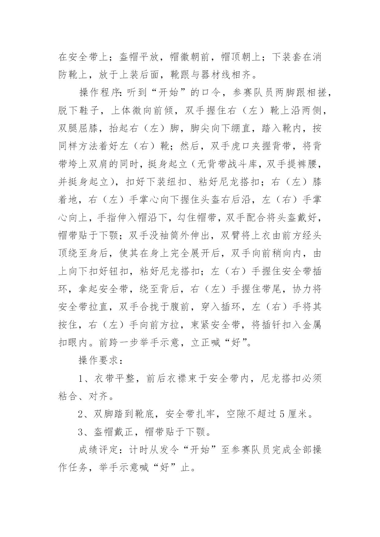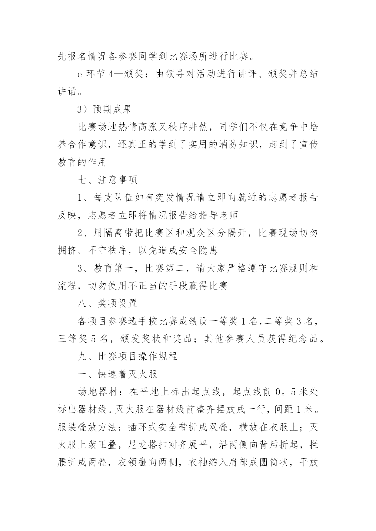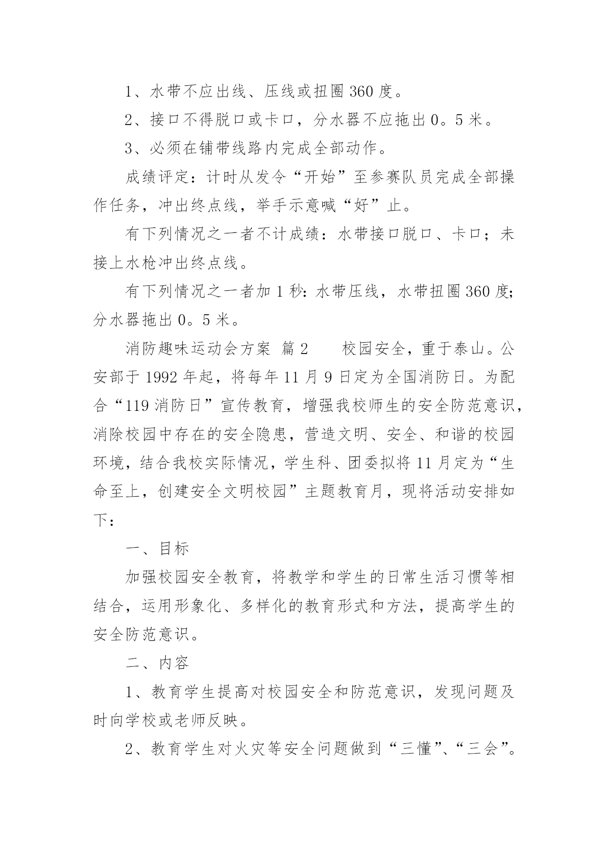 消防趣味运动会方案消防趣味运动会方案(通用12篇)为确保事情或工作顺利开展,就常常需要事先准备方案,方案是综合考量事情或问题相关的因素后所制定的书面计划。那么制定方案需要注意哪些问题呢?以下是小编精心整理的消防趣味运动会方案,仅供参考,大家一起来看看吧。消防趣味运动会方案篇1一、活动背景11月9日是国家法定的消防宣传日,为进一布推动“119”宣传教育工作,贯彻落实公安部消防局《全民消防安全宣传教育纲要》精神,在全校范围内普及消防安全知识,提高全体师生员工的消防安全意识和素质,拟在11月9日举行xx省暨济南市“119消防宣传日”活动启动仪式并于当天举办消防趣味运动会。二、活动目的及意义1)大力推动“119”宣传教育工作2)筑牢消防安全“防火墙”工程3)寓教于乐,有效提高师生对于消防安全的关注度三、活动时间20xx年11月9日上午9:00四、活动地点xx大学中心校区知新楼南侧广场五、参加人员1、省市各级领导3、群众代表:约20人4、其他:高校在校大学生和消防志愿者约200人5、新闻媒体六、趣味运动会报名及活动流程1)前期准备:由学工部、研工部等在校级网站上下发活动通知,以学院为单位报名组成运动队,每队3名本科生、3名研究生。报名格式为含学院、姓名、学号、参赛项目(快速着灭火服每队2人,安全绳打结2人;消防水带连接2人;)的EXCEL表格,报名请于11月3日前发送至安管会公邮,管会负责招募及安排此次活动的志愿者30名,并且协助公处布置现场、维护现场秩序。每个学院要有序站在指定区域。2)具体流程:a开始前由相关领导讲话(10min)b环节1—观摩:消防宣传车各项功能及消防车辆、消防车随车器材的展示(消防支队携带器材并展示,1人进行讲解答疑);消防缓降器逃生体验(消防支队准备2套装备,战士表演从5层通过缓降器逃生)c环节2—体验:消防举高车升空体验,现场选取自愿参加的同学10人,每组1—2人参加,共5次,由消防战士保护。d环节3—比赛:首先由消防战士展示各项比赛内容的正确方法。按照事先报名情况各参赛同学到比赛场所进行比赛。e环节4—颁奖:由领导对活动进行讲评、颁奖并总结讲话。3)预期成果比赛场地热情高涨又秩序井然,同学们不仅在竞争中培养合作意识,还真正的学到了实用的消防知识,起到了宣传教育的作用七、注意事项1、每支队伍如有突发情况请立即向就近的志愿者报告反映,志愿者立即将情况报告给指导老师2、用隔离带把比赛区和观众区分隔开,比赛现场切勿拥挤、不守秩序,以免造成安全隐患3、教育第一,比赛第二,请大家严格遵守比赛规则和流程,切勿使用不正当的手段赢得比赛八、奖项设置各项目参赛选手按比赛成绩设一等奖1名,二等奖3名,三等奖5名,颁发奖状和奖品;其他参赛人员获得纪念品。九、比赛项目操作规程一、快速着灭火服场地器材:在平地上标出起点线,起点线前0。5米处标出器材线。灭火服在器材线前整齐摆放成一行,间距1米。服装叠放方法:插环式安全带折成双叠,横放在衣服上;灭火服上装正叠,尼龙搭扣对齐展平,沿两侧向背后折起,拦腰折成两叠,衣领翻向两侧,衣袖缩入肩部成圆筒状,平放在安全带上;盔帽平放,帽徽朝前,帽顶朝上;下装套在消防靴上,放于上装后面,靴跟与器材线相齐。操作程序:听到“开始”的口令,参赛队员两脚跟相搓,脱下鞋子,上体微向前倾,双手握住右(左)靴上沿两侧,双腿屈膝,抬起右(左)脚,脚尖向下绷直,踏入靴内,按同样方法着好左(右)靴;然后,双手虎口夹握背带,将背带垮上双肩的同时,挺身起立(无背带战斗库,双手提裤腰,并挺身起立),扣好下装纽扣、粘好尼龙搭扣;右(左)膝着地,右(左)手掌心向下握住头盔右后沿,左(右)手掌心向上,手指伸入帽沿下,勾住帽带,双手配合将头盔戴好,帽带贴于下颚;双手没袖筒外伸出,双臂将上衣由前方经头顶绕至身后,使其在身上完全展开后,双手向前稍向内,由上向下扣好钮扣,粘好尼龙搭扣;左(右)手握住安全带插环,拿起安全带,绕至背后,右(左)手握住带尾,协力将安全带拉直,双手合拢于腹前,穿入插环,左(右)手将其按住,右(左)手向前方拉,束紧安全带,将插钎扣入金属扣眼内。前跨一步举手示意,立正喊“好”。操作要求:1、衣带平整,前后衣襟束于安全带内,尼龙搭扣必须粘合、对齐。2、双脚踏到靴底,安全带扎牢,空隙不超过5厘米。3、盔帽戴正,帽带贴于下颚。成绩评定:计时从发令“开始”至参赛队员完成全部操作任务,举手示意喊“好”止。有下列情况之一者不计成绩:安全带插钎未扣入眼内;尼龙搭扣未扣或粘合长度不到2/3;上装或下装钮扣未扣。有下列情况之一者加1秒:帽带未贴于下颚;腰带未系紧;脚未踏入靴底。二、安全绳打逃生结场地器材:在平地上放置安全绳3根。操作程序:听到“开始”的口令,参赛队员迅速向前,提起绳索依次打结,完成后举手示意喊“好”。操作要求:动作正确