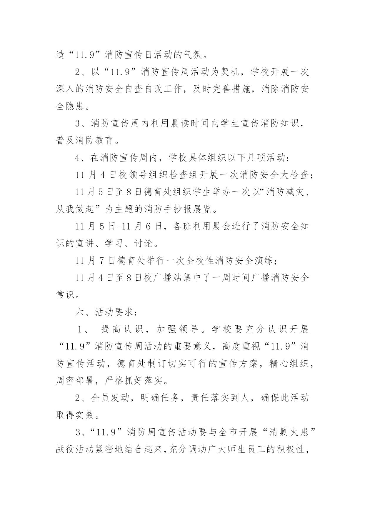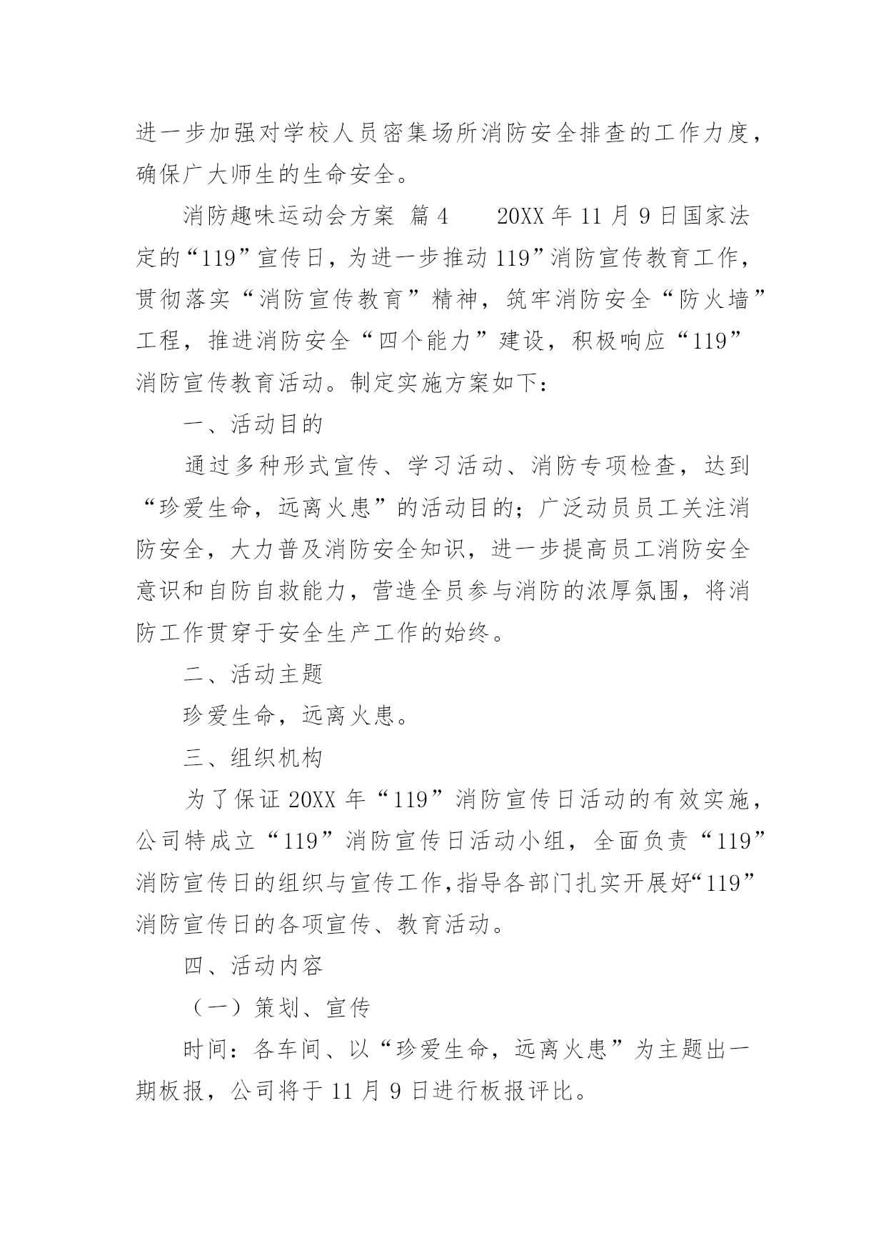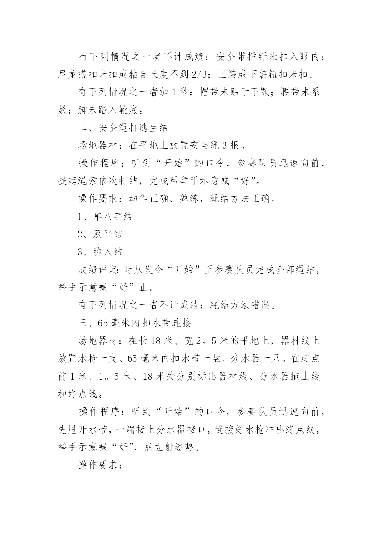 消防趣味运动会方案消防趣味运动会方案(通用12篇)为确保事情或工作顺利开展,就常常需要事先准备方案,方案是综合考量事情或问题相关的因素后所制定的书面计划。那么制定方案需要注意哪些问题呢?以下是小编精心整理的消防趣味运动会方案,仅供参考,大家一起来看看吧。消防趣味运动会方案篇1一、活动背景11月9日是国家法定的消防宣传日,为进一布推动“119”宣传教育工作,贯彻落实公安部消防局《全民消防安全宣传教育纲要》精神,在全校范围内普及消防安全知识,提高全体师生员工的消防安全意识和素质,拟在11月9日举行xx省暨济南市“119消防宣传日”活动启动仪式并于当天举办消防趣味运动会。二、活动目的及意义1)大力推动“119”宣传教育工作2)筑牢消防安全“防火墙”工程3)寓教于乐,有效提高师生对于消防安全的关注度三、活动时间20xx年11月9日上午9:00四、活动地点xx大学中心校区知新楼南侧广场五、参加人员1、省市各级领导3、群众代表:约20人4、其他:高校在校大学生和消防志愿者约200人5、新闻媒体六、趣味运动会报名及活动流程1)前期准备:由学工部、研工部等在校级网站上下发活动通知,以学院为单位报名组成运动队,每队3名本科生、3名研究生。报名格式为含学院、姓名、学号、参赛项目(快速着灭火服每队2人,安全绳打结2人;消防水带连接2人;)的EXCEL表格,报名请于11月3日前发送至安管会公邮,管会负责招募及安排此次活动的志愿者30名,并且协助公处布置现场、维护现场秩序。每个学院要有序站在指定区域。2)具体流程:a开始前由相关领导讲话(10min)b环节1—观摩:消防宣传车各项功能及消防车辆、消防车随车器材的展示(消防支队携带器材并展示,1人进行讲解答疑);消防缓降器逃生体验(消防支队准备2套装备,战士表演从5层通过缓降器逃生)c环节2—体验:消防举高车升空体验,现场选取自愿参加的同学10人,每组1—2人参加,共5次,由消防战士保护。d环节3—比赛:首先由消防战士展示各项比赛内容的正确方法。按照事先报名情况各参赛同学到比赛场所进行比赛。e环节4—颁奖:由领导对活动进行讲评、颁奖并总结讲话。3)预期成果比赛场地热情高涨又秩序井然,同学们不仅在竞争中培养合作意识,还真正的学到了实用的消防知识,起到了宣传教育的作用七、注意事项1、每支队伍如有突发情况请立即向就近的志愿者报告反映,志愿者立即将情况报告给指导老师2、用隔离带把比赛区和观众区分隔开,比赛现场切勿拥挤、不守秩序,以免造成安全隐患3、教育第一,比赛第二,请大家严格遵守比赛规则和流程,切勿使用不正当的手段赢得比赛八、奖项设置各项目参赛选手按比赛成绩设一等奖1名,二等奖3名,三等奖5名,颁发奖状和奖品;其他参赛人员获得纪念品。九、比赛项目操作规程一、快速着灭火服场地器材:在平地上标出起点线,起点线前0。5米处标出器材线。灭火服在器材线前整齐摆放成一行,间距1米。服装叠放方法:插环式安全带折成双叠,横放在衣服上;灭火服上装正叠,尼龙搭扣对齐展平,沿两侧向背后折起,拦腰折成两叠,衣领翻向两侧,衣袖缩入肩部成圆筒状,平放在安全带上;盔帽平放,帽徽朝前,帽顶朝上;下装套在消防靴上,放于上装后面,靴跟与器材线相齐。操作程序:听到“开始”的口令,参赛队员两脚跟相搓,脱下鞋子,上体微向前倾,双手握住右(左)靴上沿两侧,双腿屈膝,抬起右(左)脚,脚尖向下绷直,踏入靴内,按同样方法着好左(右)靴;然后,双手虎口夹握背带,将背带垮上双肩的同时,挺身起立(无背带战斗库,双手提裤腰,并挺身起立),扣好下装纽扣、粘好尼龙搭扣;右(左)膝着地,右(左)手掌心向下握住头盔右后沿,左(右)手掌心向上,手指伸入帽沿下,勾住帽带,双手配合将头盔戴好,帽带贴于下颚;双手没袖筒外伸出,双臂将上衣由前方经头顶绕至身后,使其在身上完全展开后,双手向前稍向内,由上向下扣好钮扣,粘好尼龙搭扣;左(右)手握住安全带插环,拿起安全带,绕至背后,右(左)手握住带尾,协力将安全带拉直,双手合拢于腹前,穿入插环,左(右)手将其按住,右(左)手向前方拉,束紧安全带,将插钎扣入金属扣眼内。前跨一步举手示意,立正喊“好”。操作要求:1、衣带平整,前后衣襟束于安全带内,尼龙搭扣必须粘合、对齐。2、双脚踏到靴底,安全带扎牢,空隙不超过5厘米。3、盔帽戴正,帽带贴于下颚。成绩评定:计时从发令“开始”至参赛队员完成全部操作任务,举手示意喊“好”止。有下列情况之一者不计成绩:安全带插钎未扣入眼内;尼龙搭扣未扣或粘合长度不到2/3;上装或下装钮扣未扣。有下列情况之一者加1秒:帽带未贴于下颚;腰带未系紧;脚未踏入靴底。二、安全绳打逃生结场地器材:在平地上放置安全绳3根。操作程序:听到“开始”的口令,参赛队员迅速向前,提起绳索依次打结,完成后举手示意喊“好”。操作要求:动作正确
